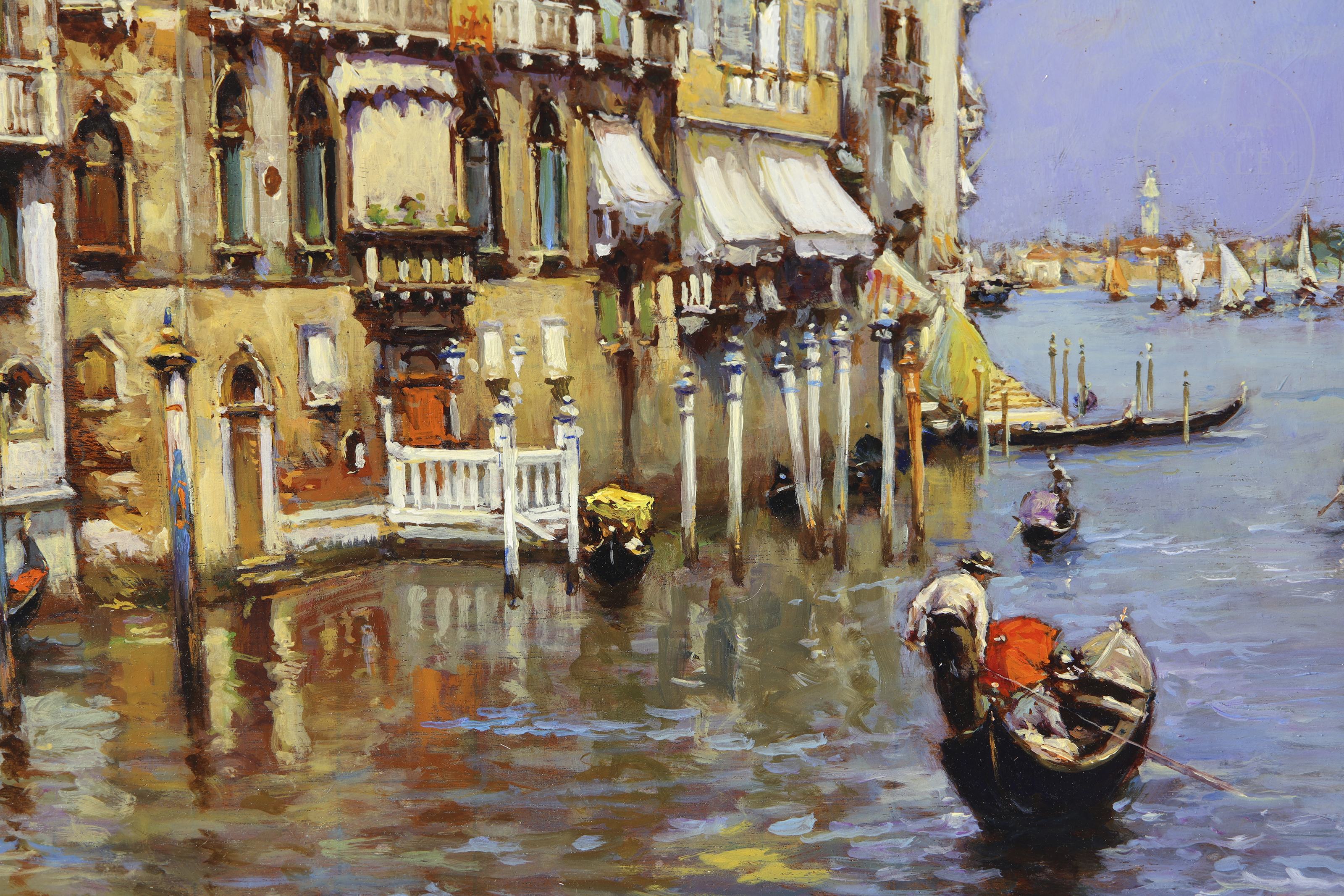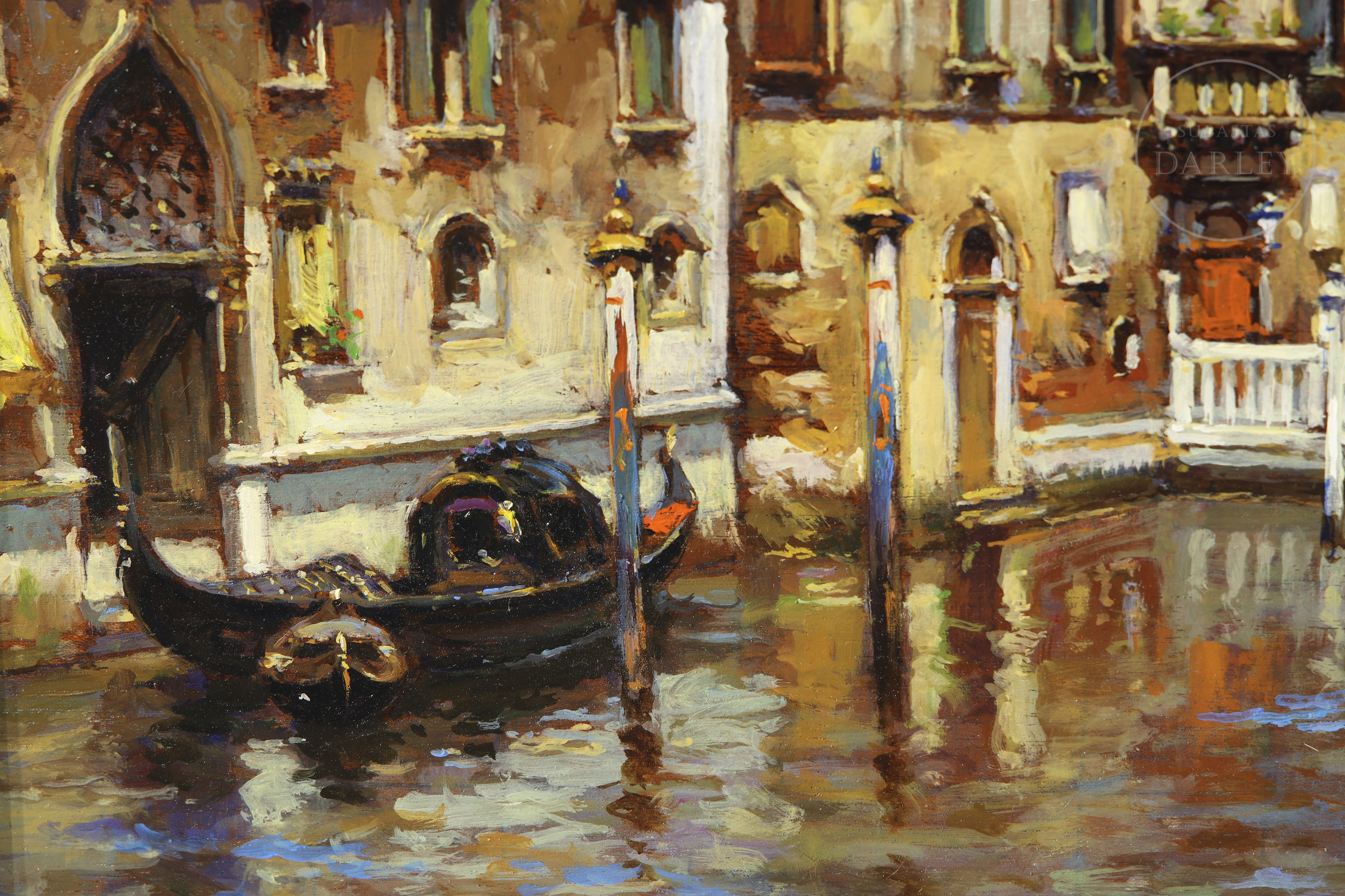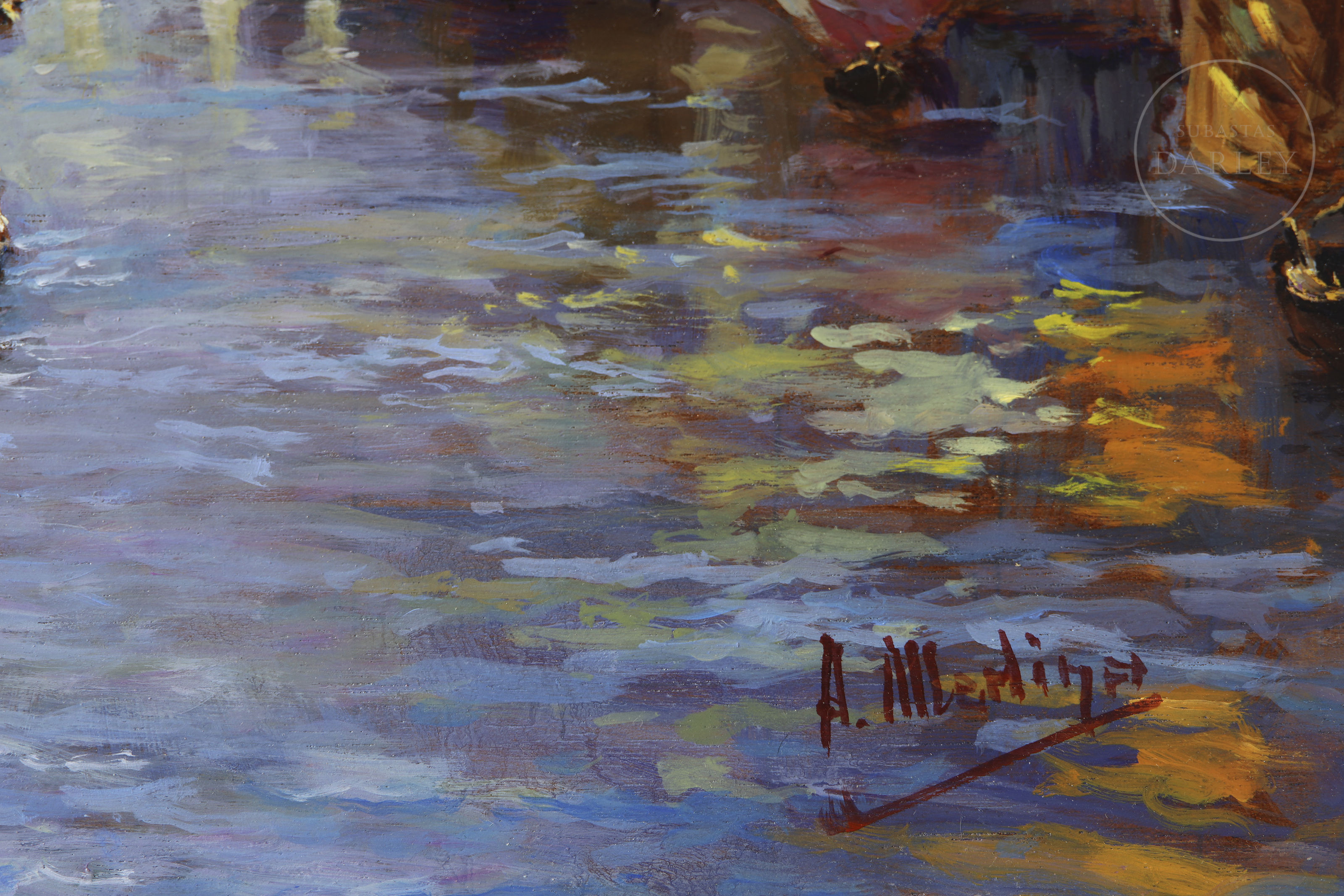 Urban landscape of the Venice Canal painted with loose, impasto brushstrokes. The composition highlights the light reflected on the water and the colourful façades of the buildings. Gondolas add interest to the foreground. Signed in the lower right corner: ‘A. Medina’.