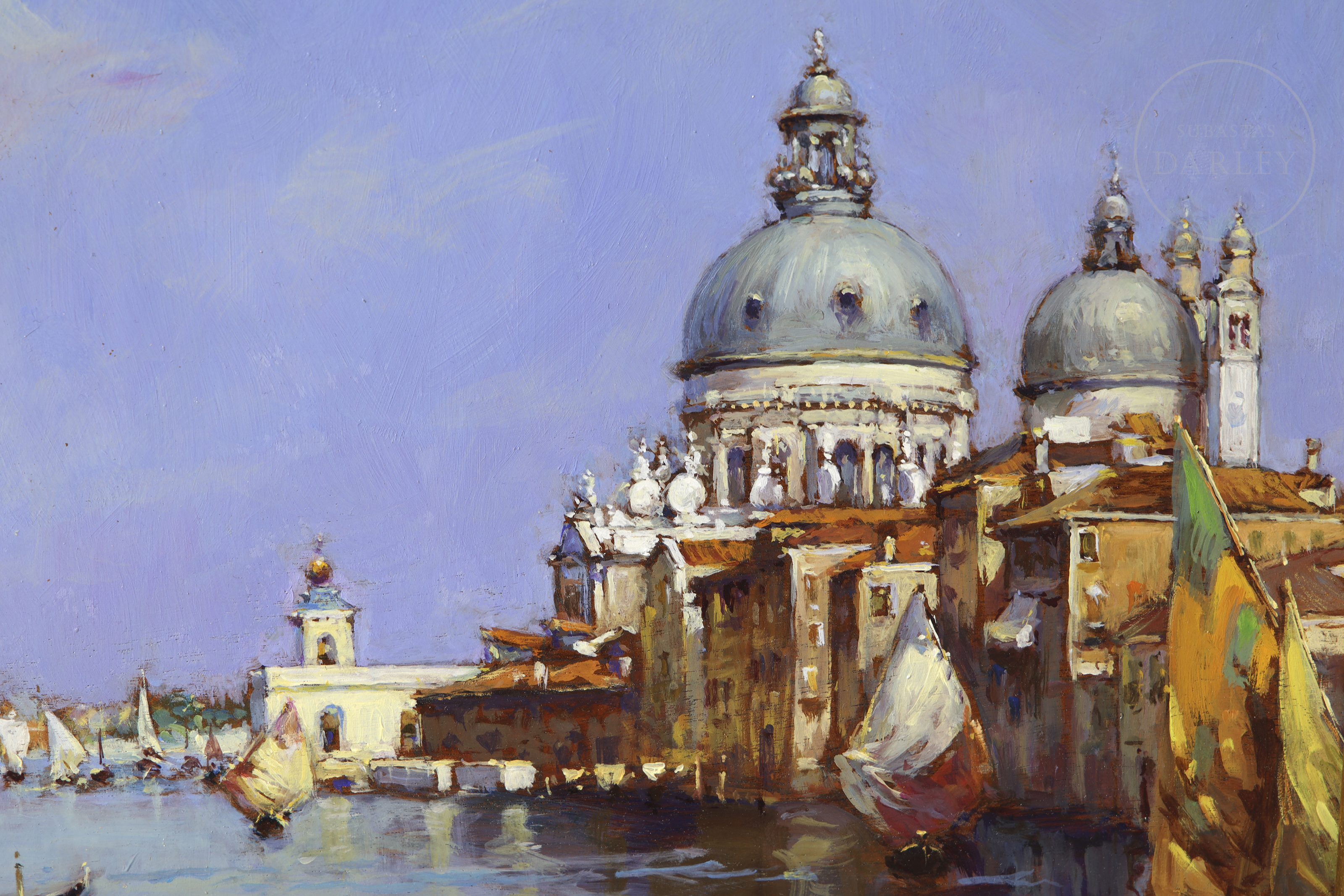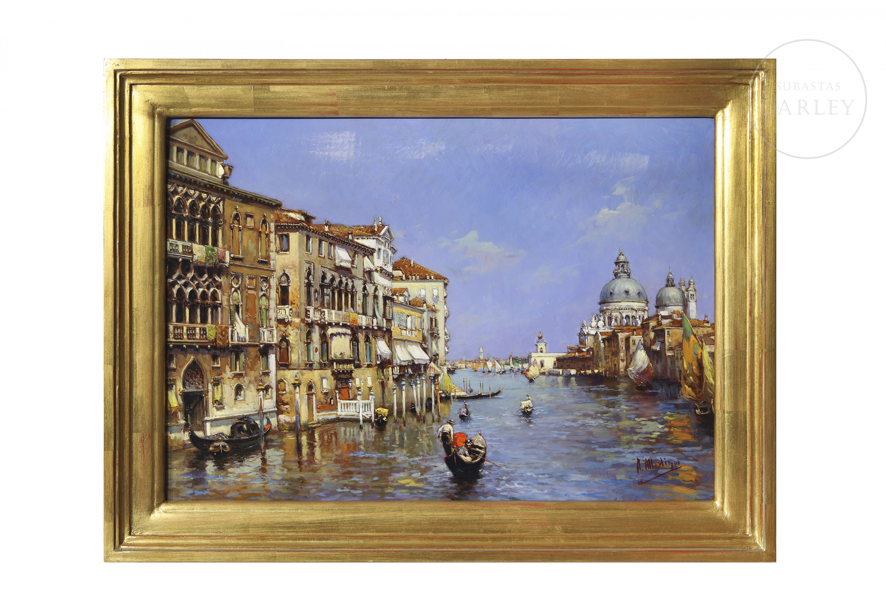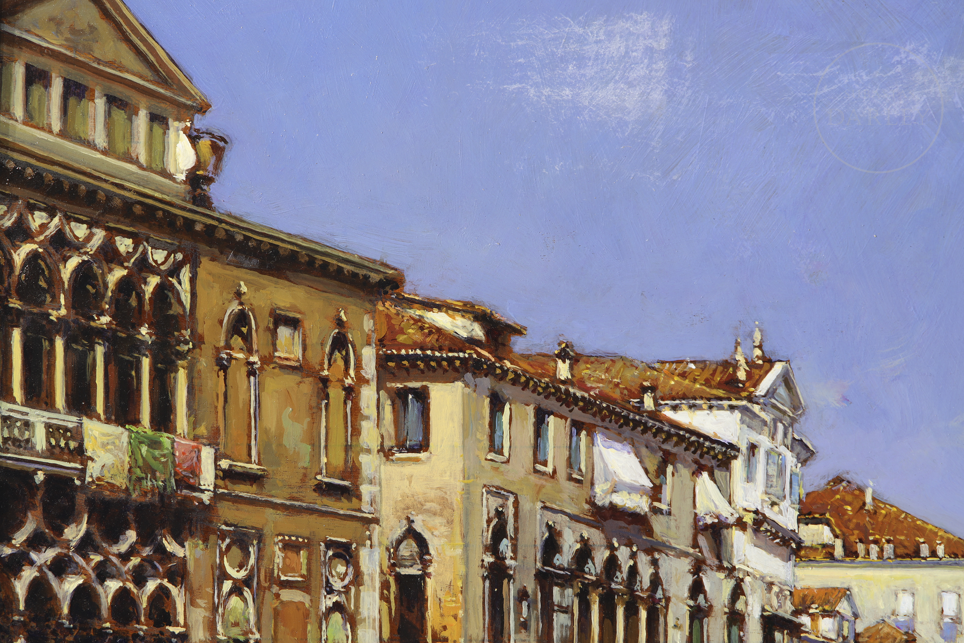 Urban landscape of the Venice Canal painted with loose, impasto brushstrokes. The composition highlights the light reflected on the water and the colourful façades of the buildings. Gondolas add interest to the foreground. Signed in the lower right corner: ‘A. Medina’.