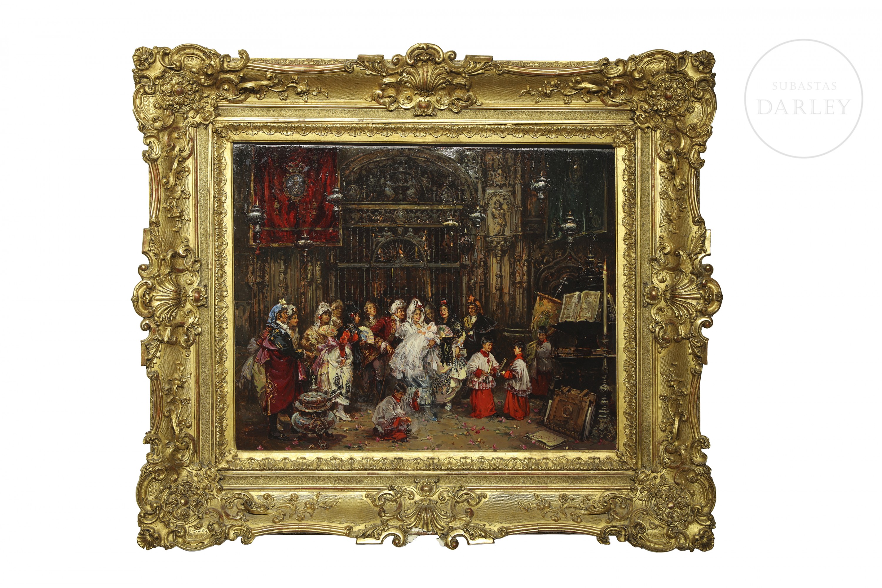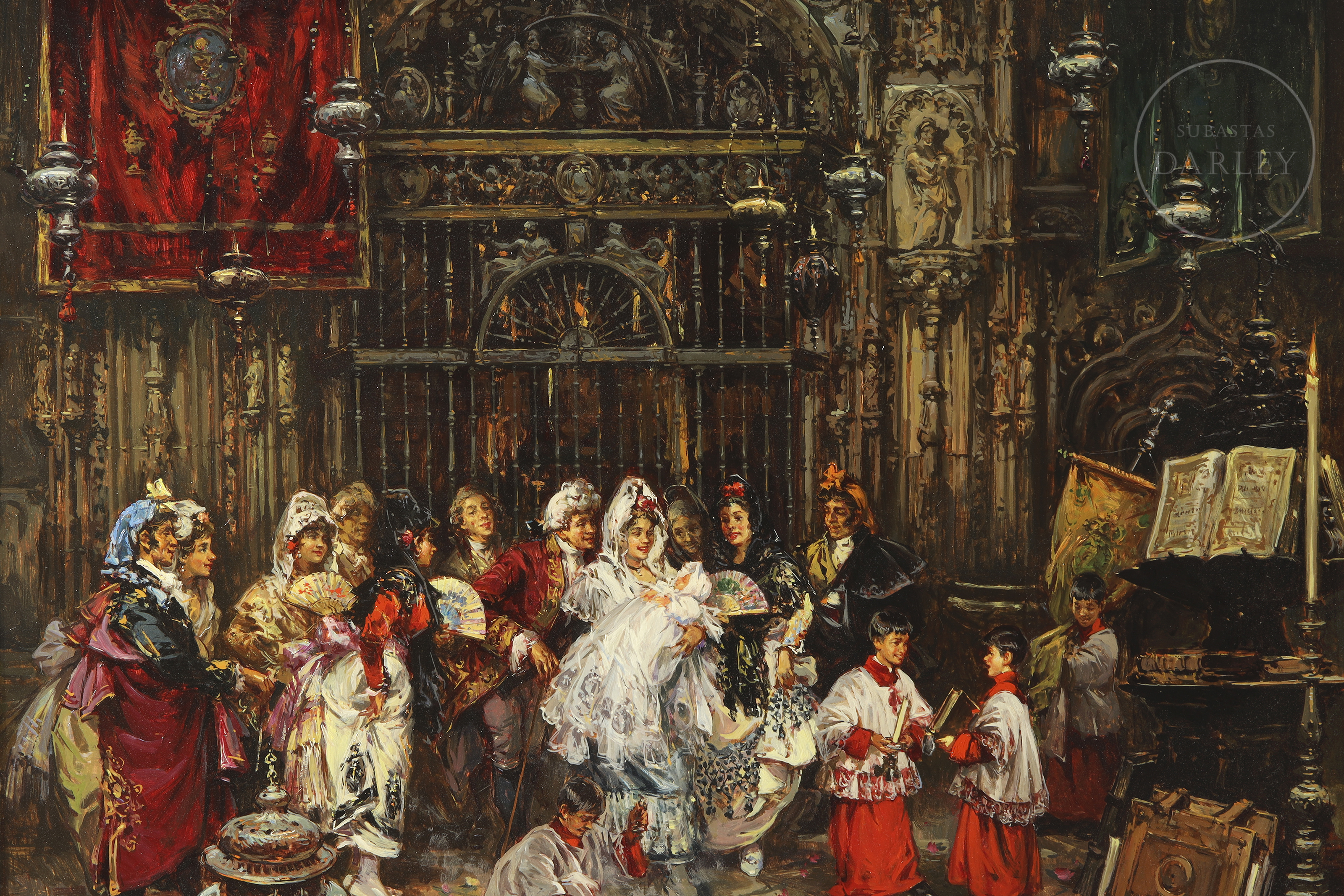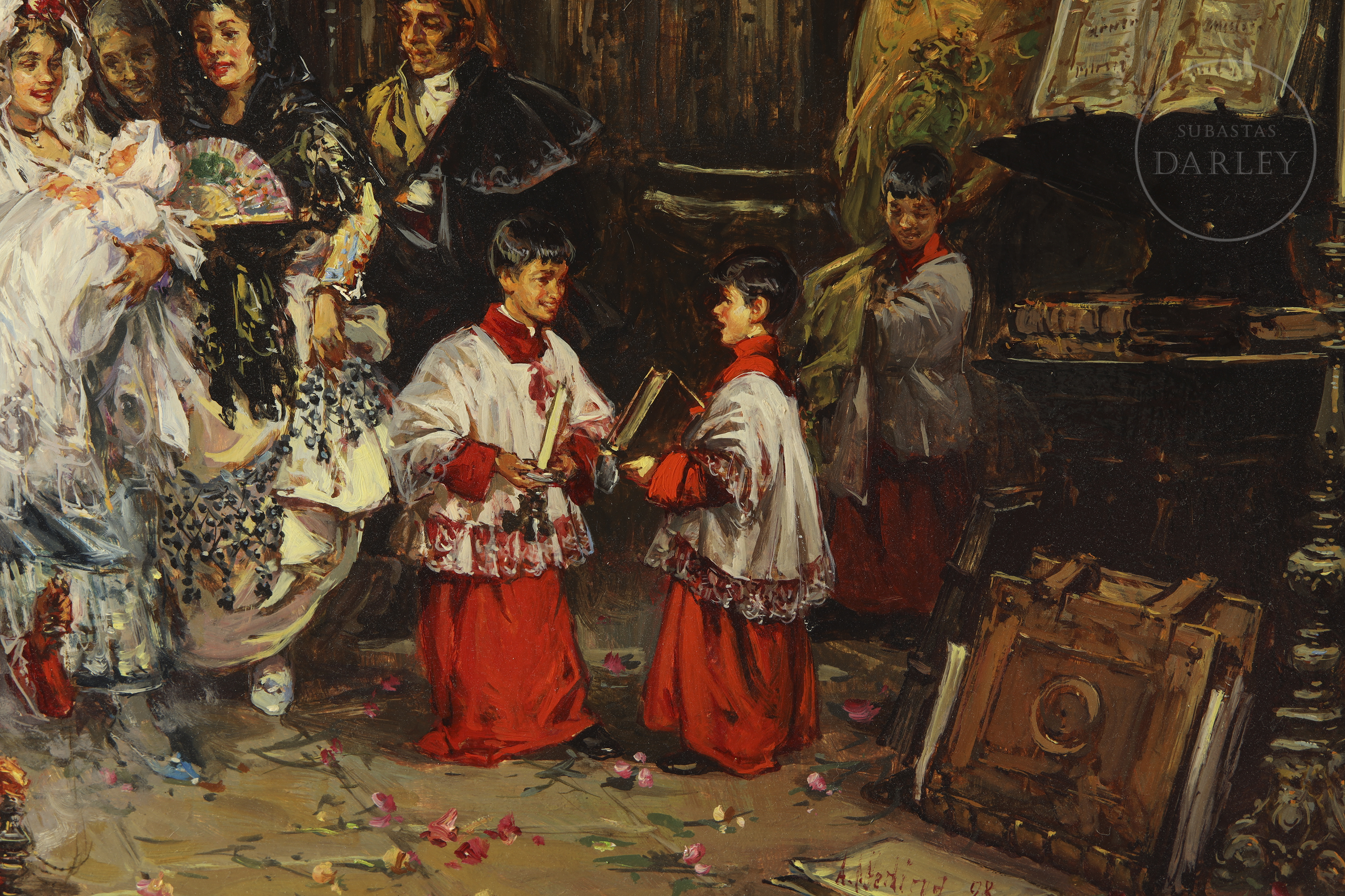 Oil on panel. Traditional scene of a christening being celebrated inside the monumental interior of Seville Cathedral. The composition brings together numerous attendees, flanked by two altar boys in red tunics in the foreground. Signed and dated in the lower right corner ‘A. Medina.98’