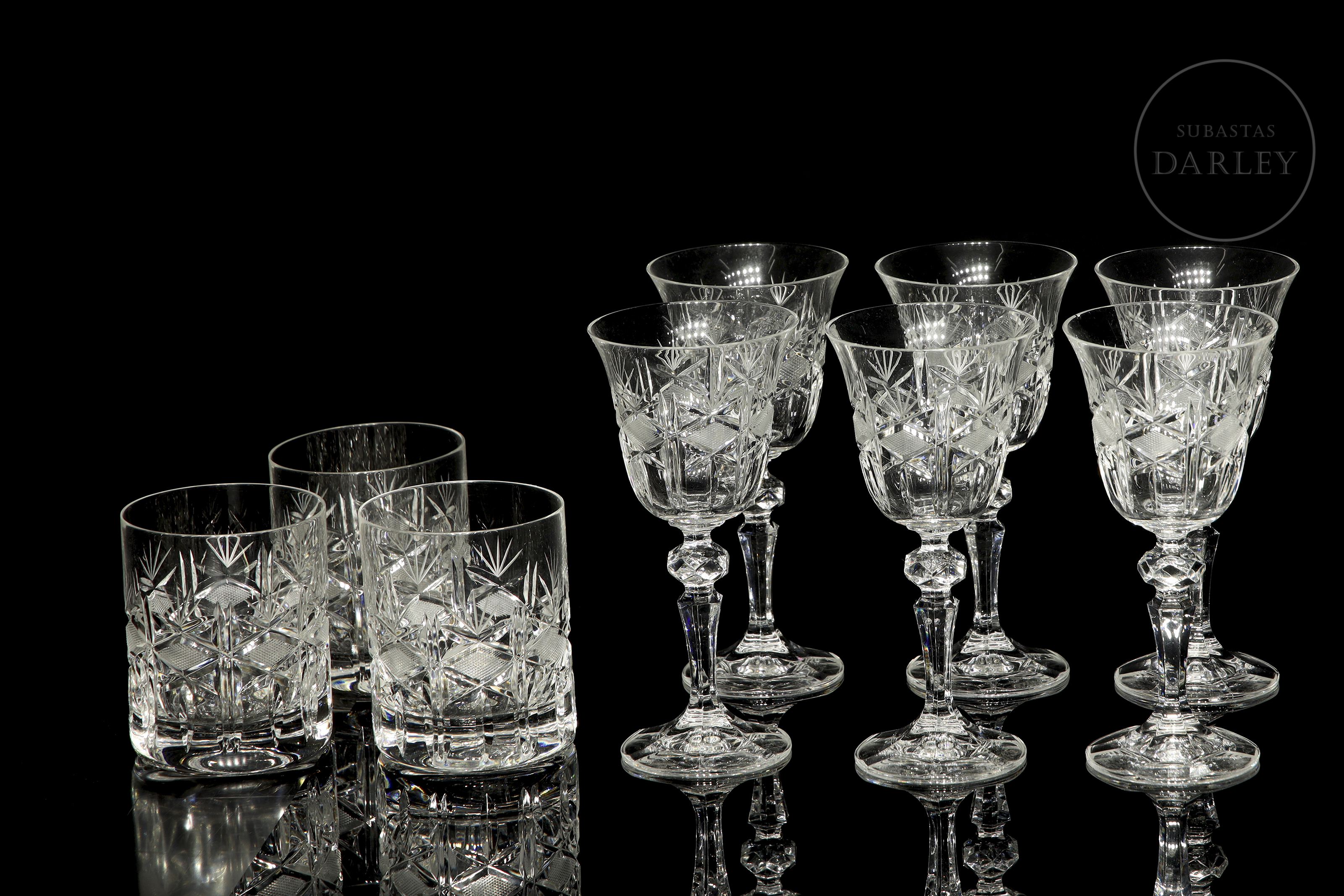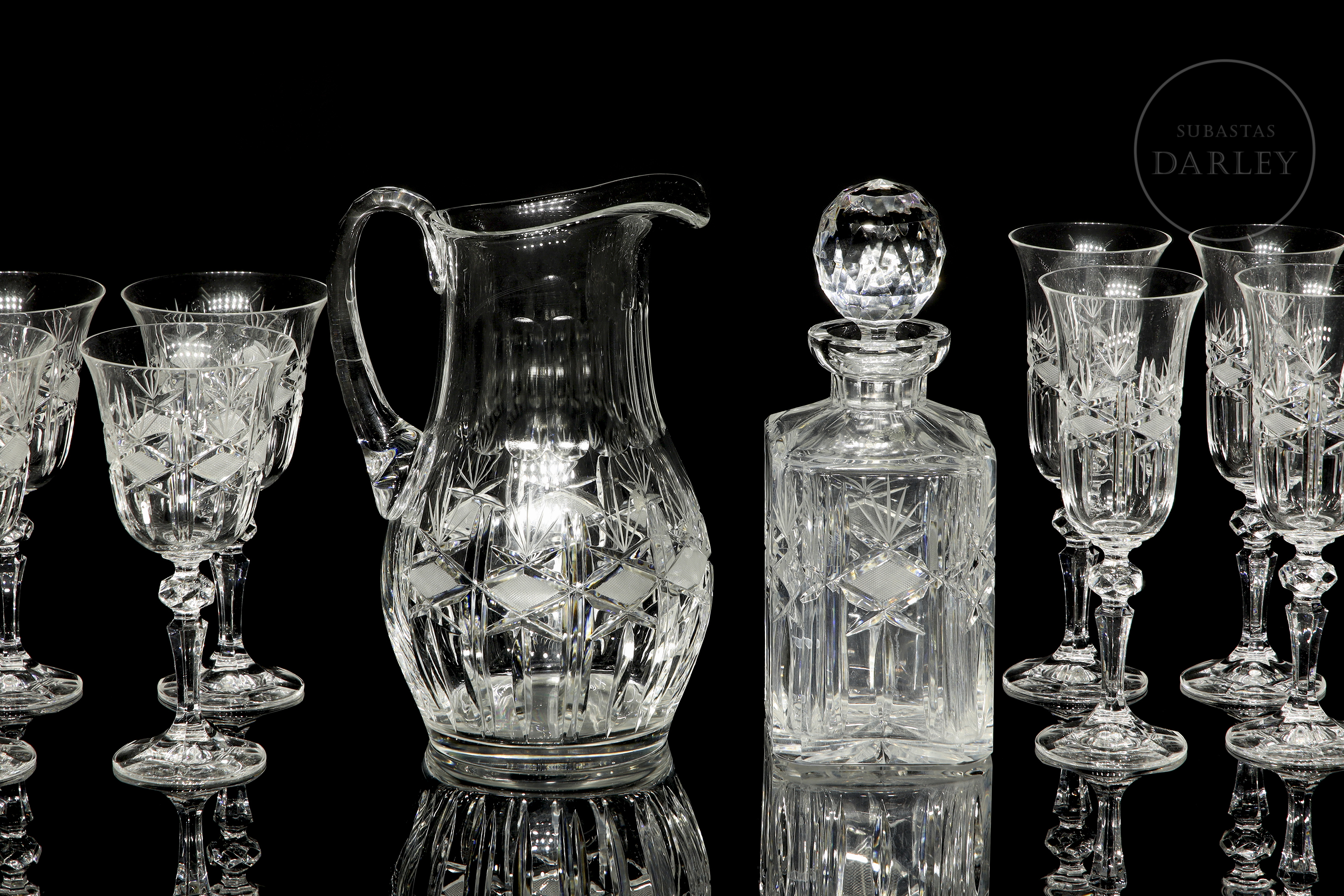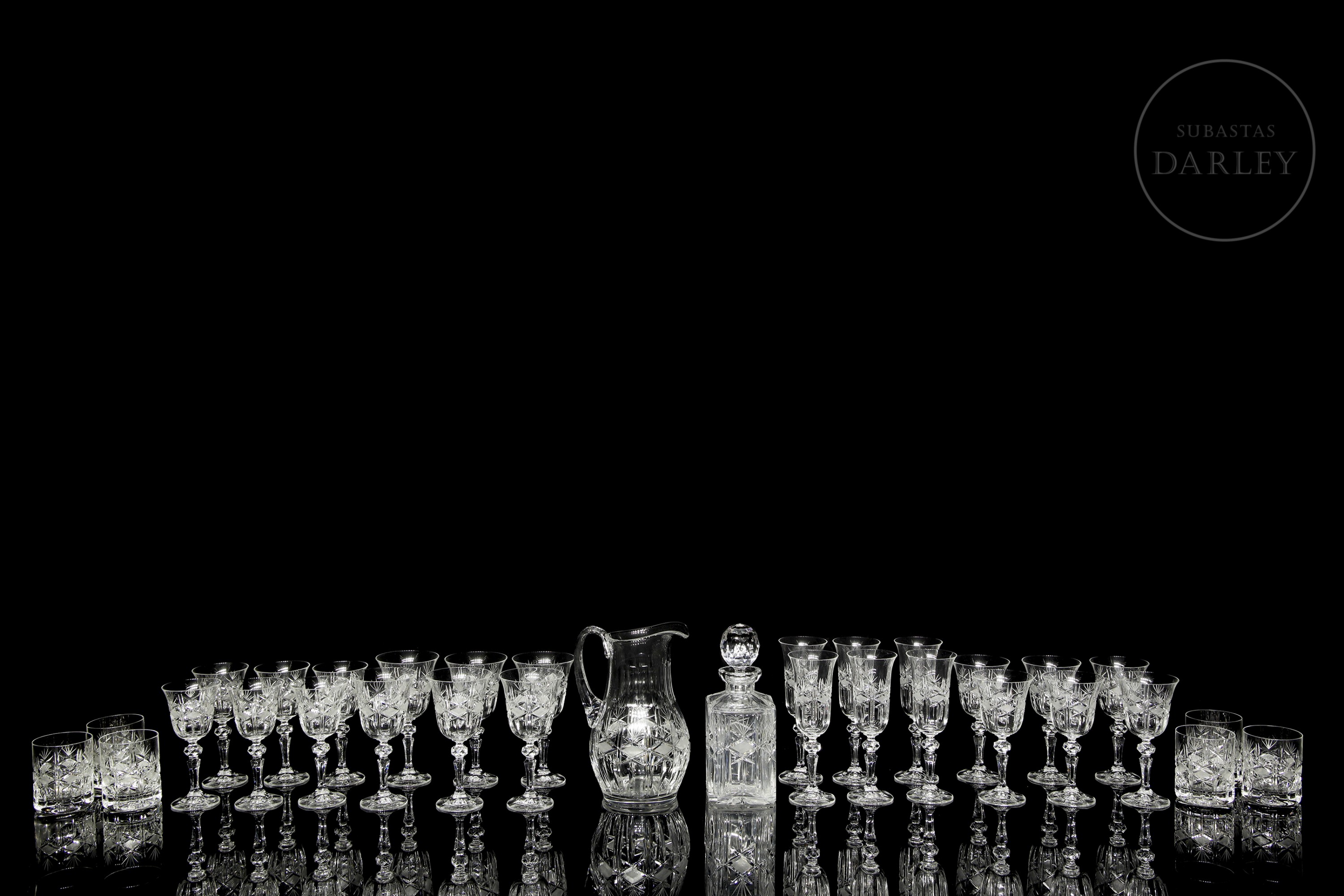 Cut glass set with diamond and star motifs. Includes cognac glasses (6), water glasses (6), wine glasses (6), liqueur glasses (6), champagne glasses (6), jug (1), and decanter (1).