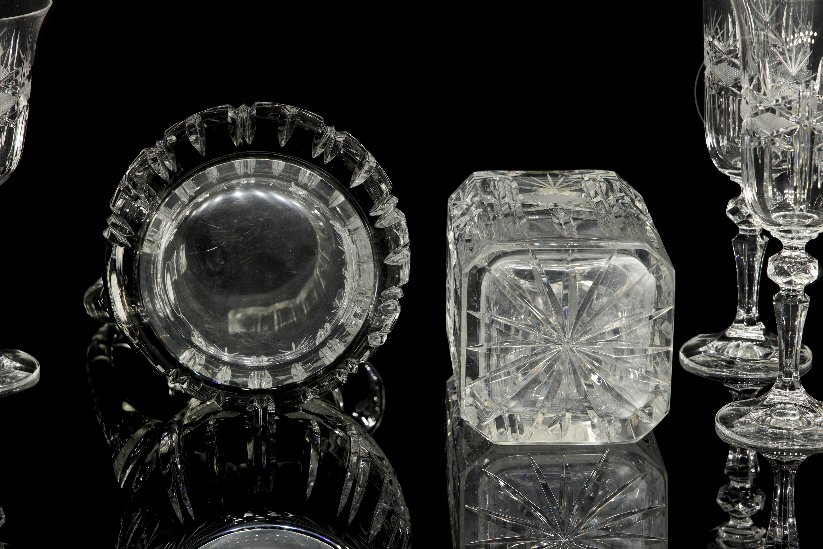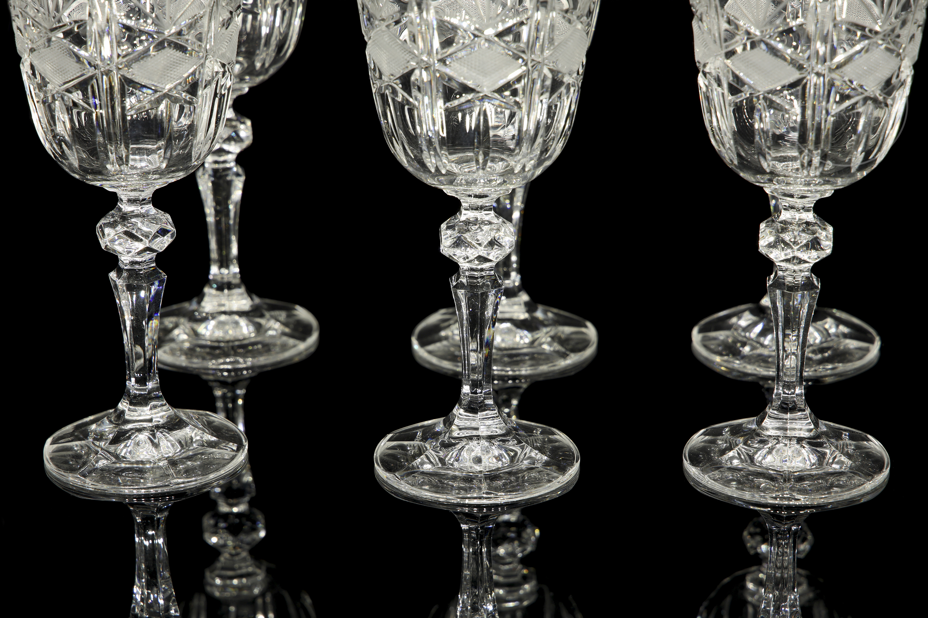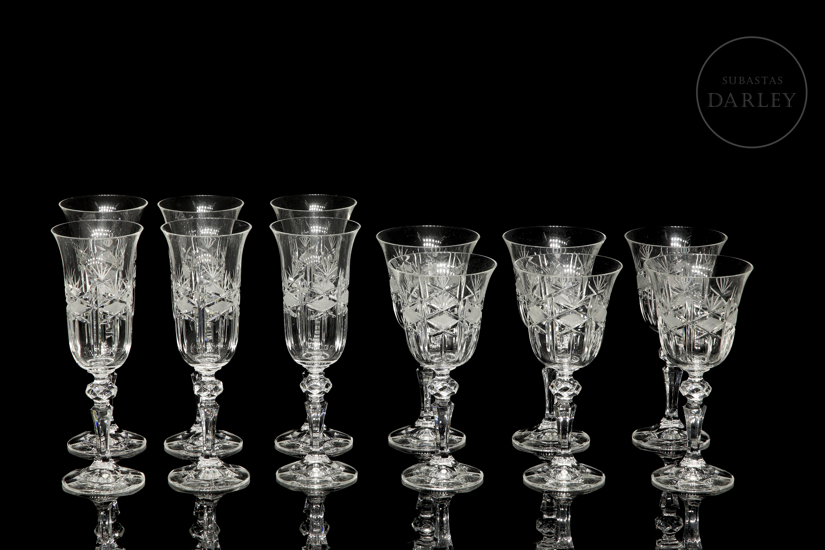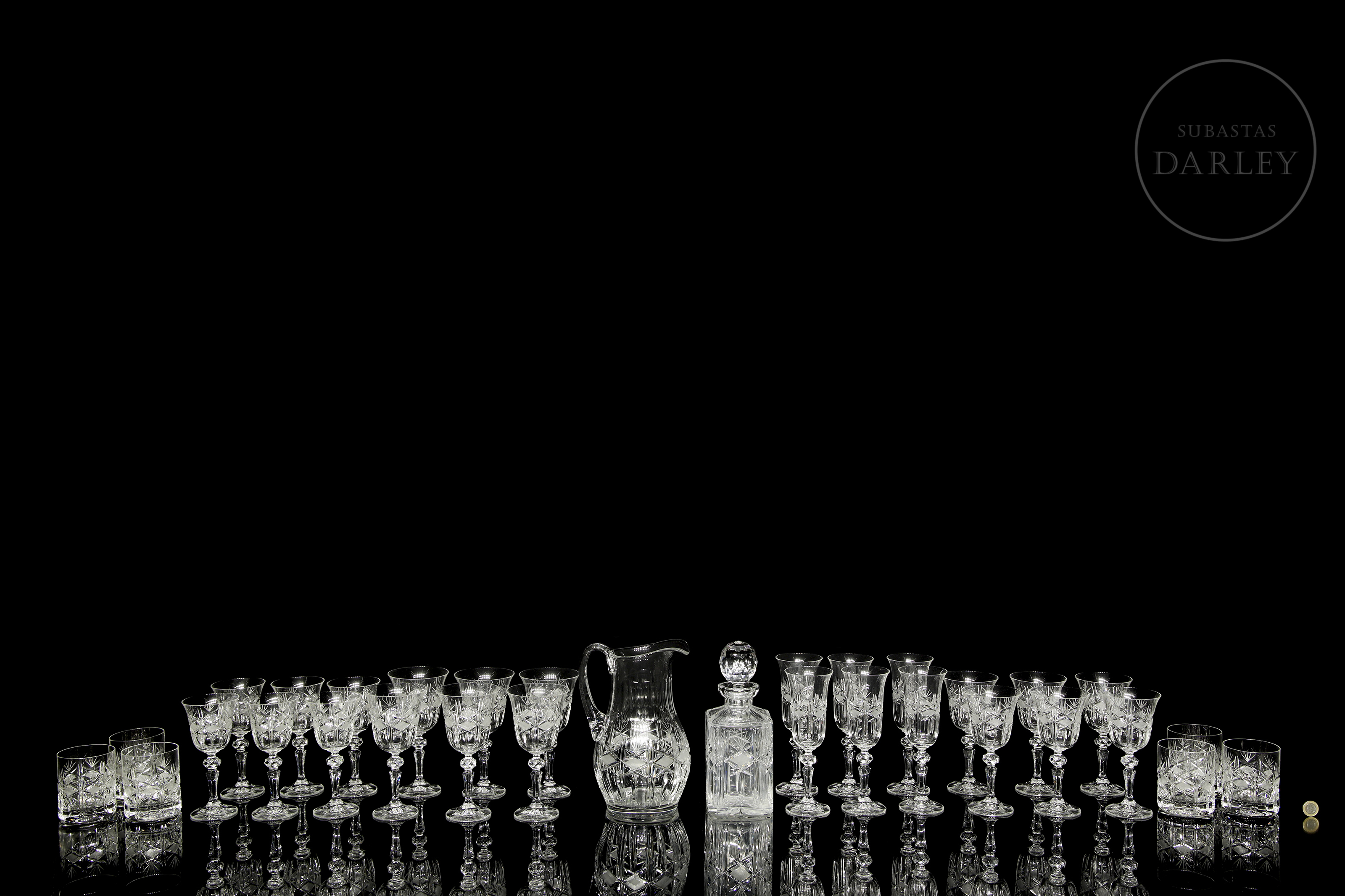 Cut glass set with diamond and star motifs. Includes cognac glasses (6), water glasses (6), wine glasses (6), liqueur glasses (6), champagne glasses (6), jug (1), and decanter (1).