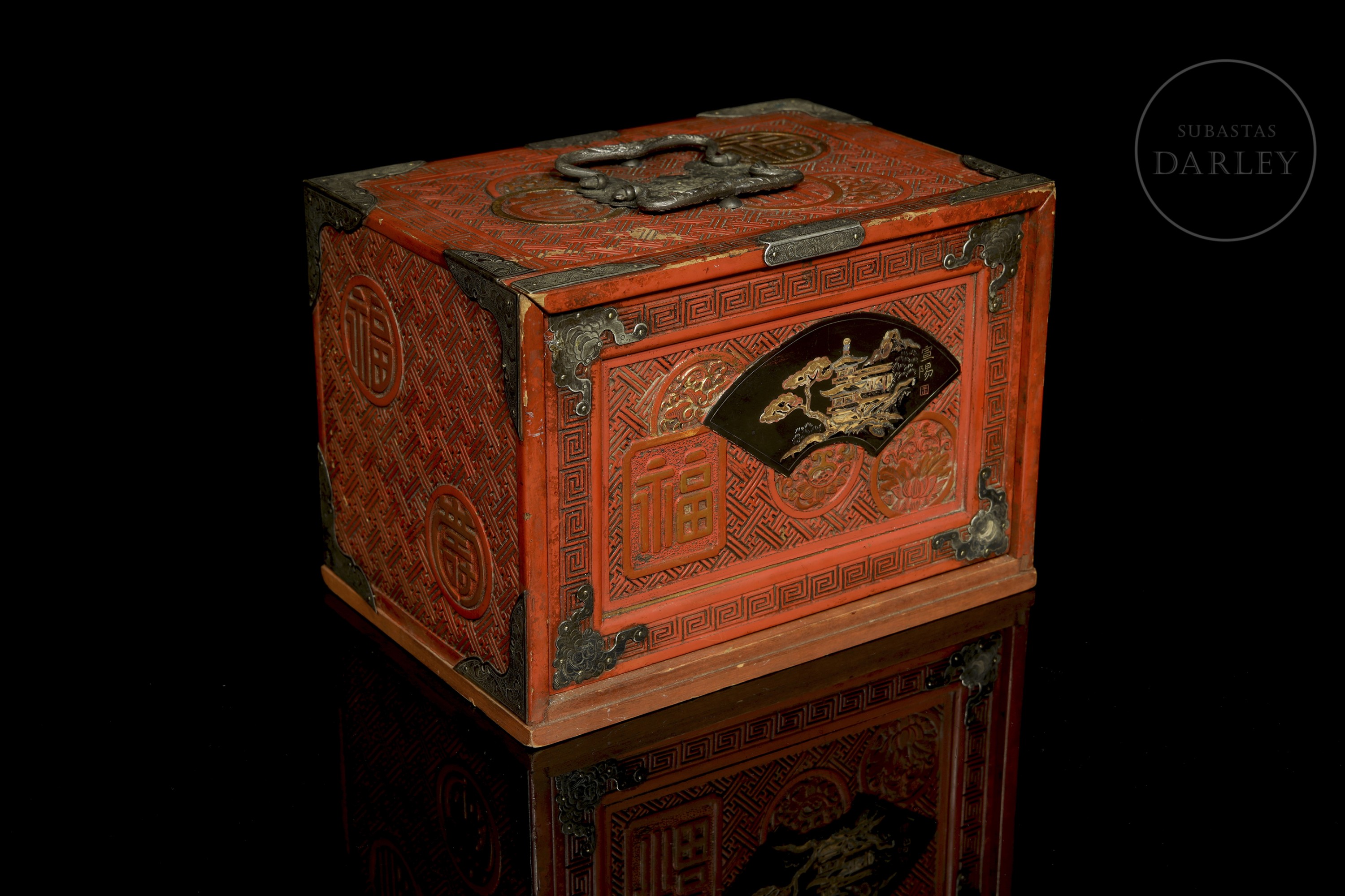 Lacquered and carved wooden box with metal fittings, rectangular. The interior structure reveals five front drawers. The dominant colour is bright red on a black background. The decoration is a combination of techniques: the front panel features a cartouche with a black fan with gold decoration. The sides and lid are covered with geometric fretwork patterns, which frame carved circular characters. Qing dynasty (1644–1912).