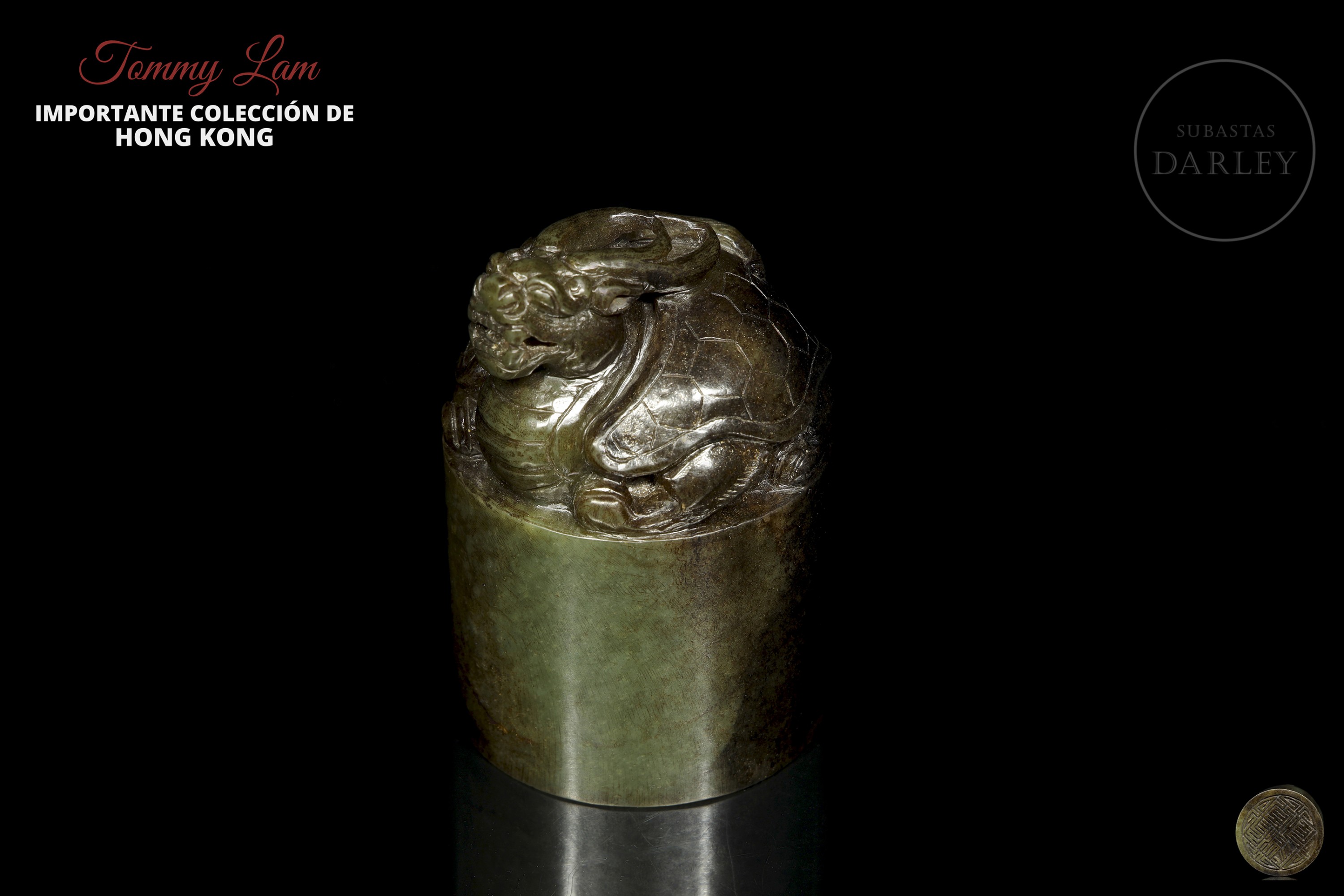 Deep green carved jade with black and dark brown patina. It depicts a Bixi, a mythological creature with the body of a turtle and the head of a dragon, on a cylindrical base. The figure stands out for the detailed carving of the face, with a fierce expression, musculature and hexagonal patterned shell. With incised characters on the base. Han Dynasty (206 BC – 220 AD) or later.