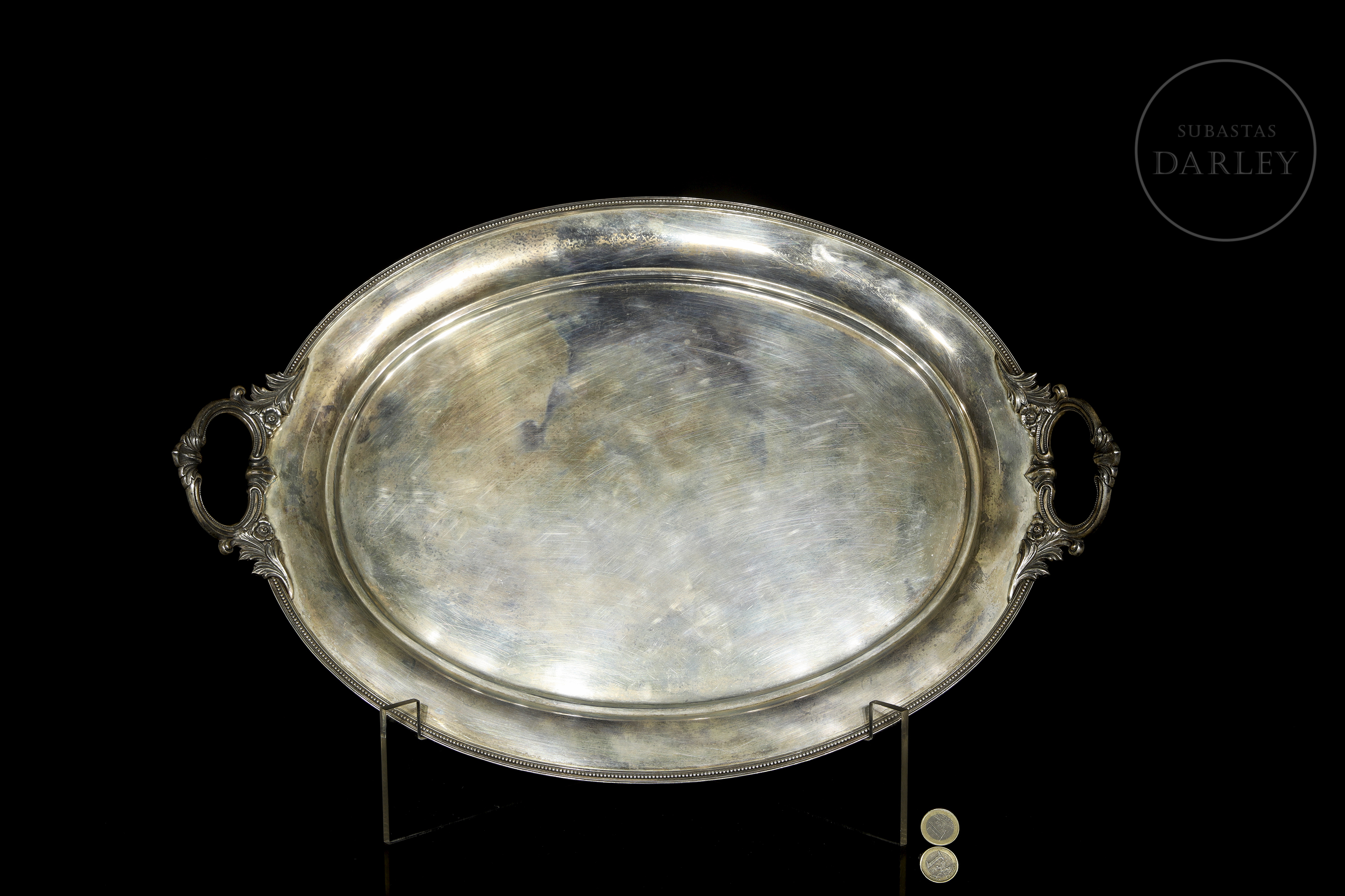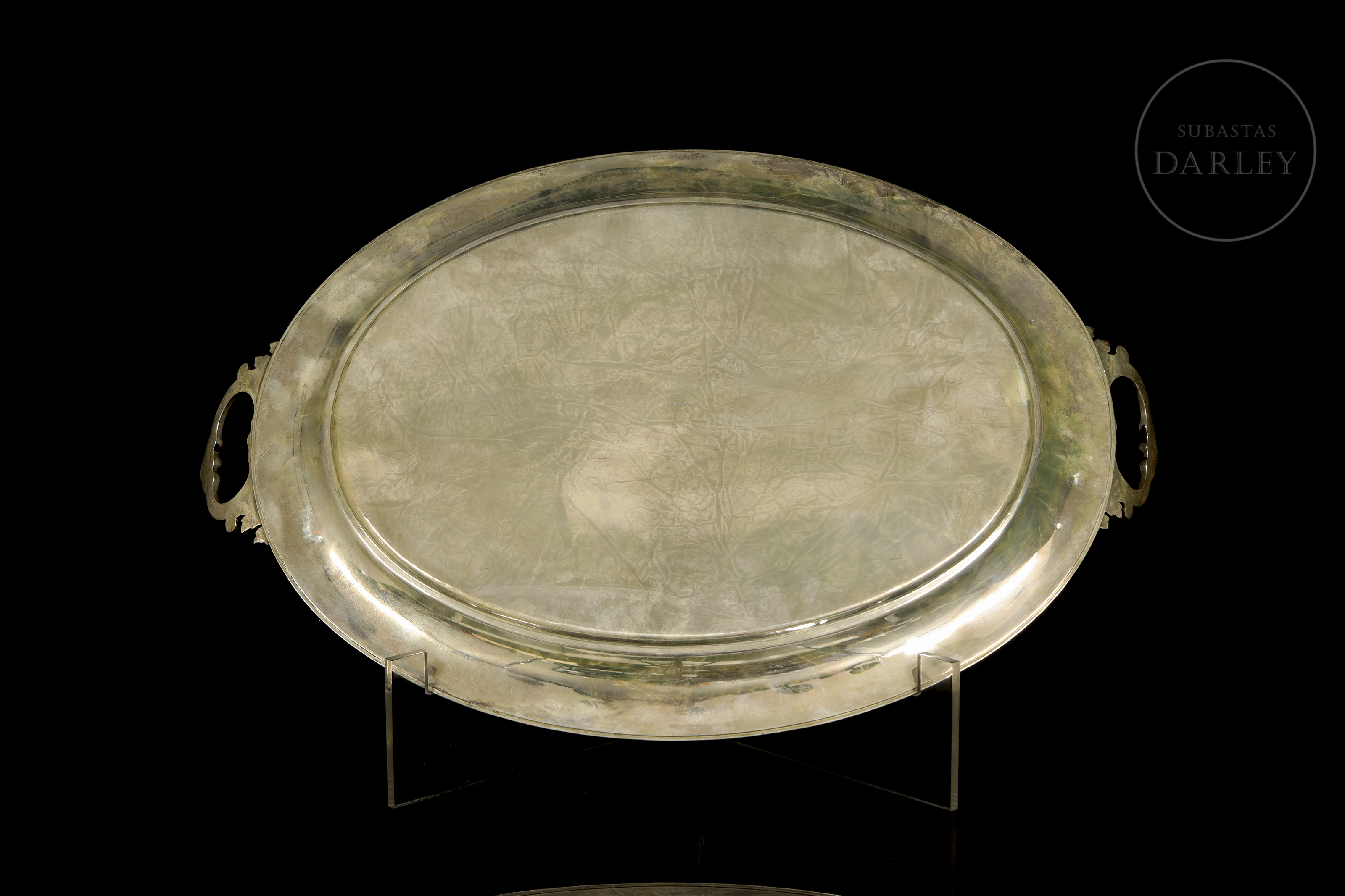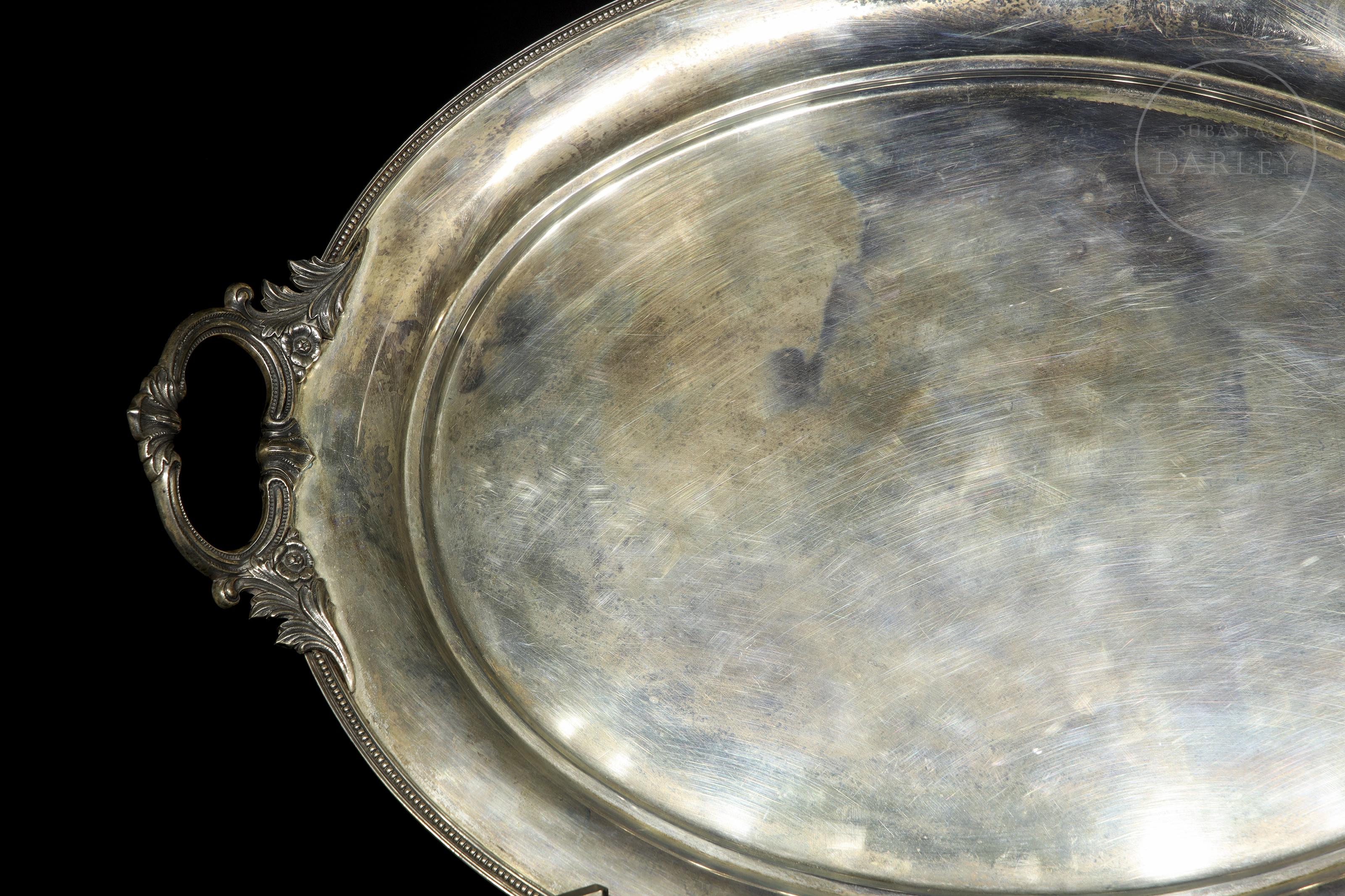 Oval silver tray with a decorative rope-style rim and two handles decorated with flowers and scrolls. Marked ‘Dickhoff en Salm’ on the base.