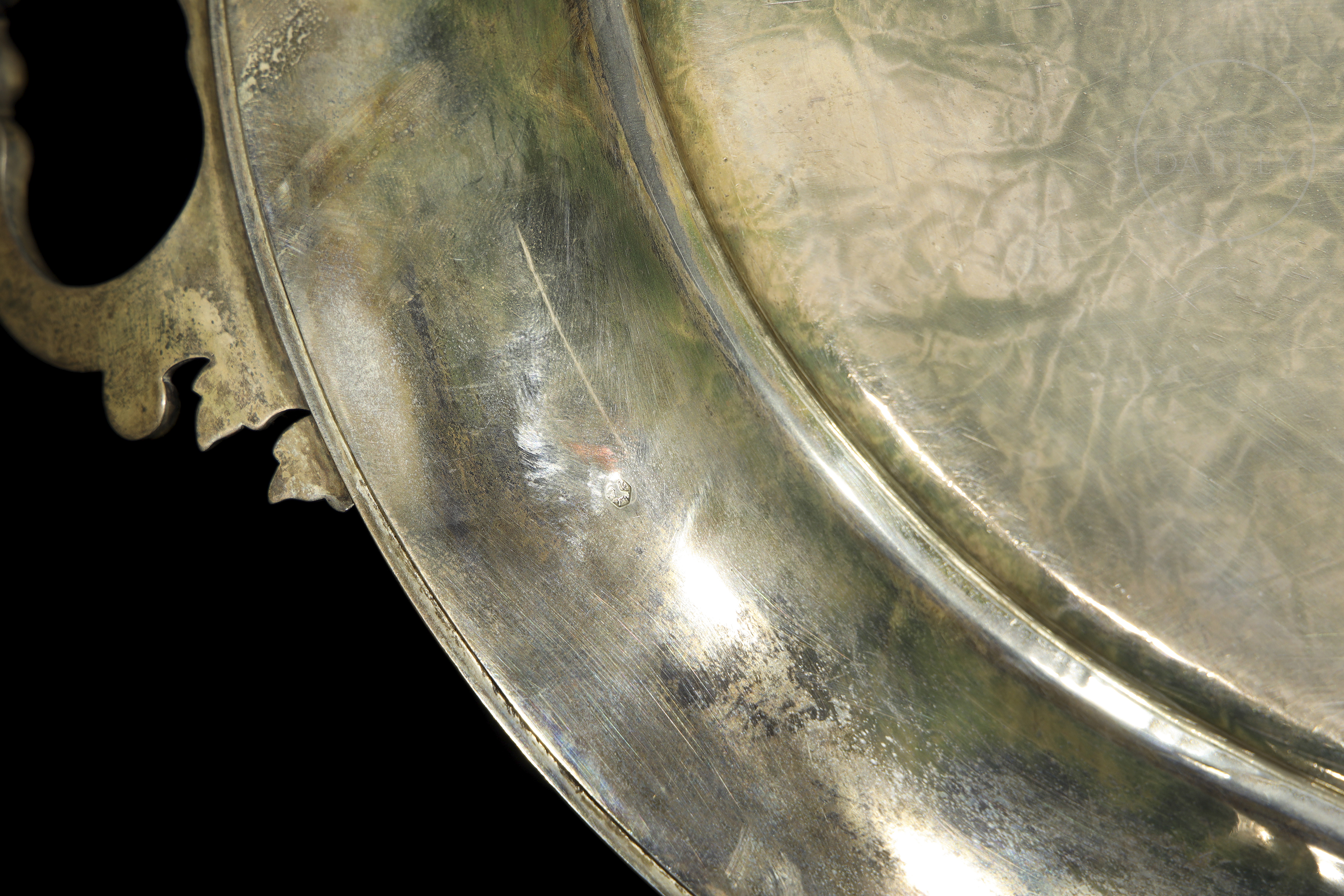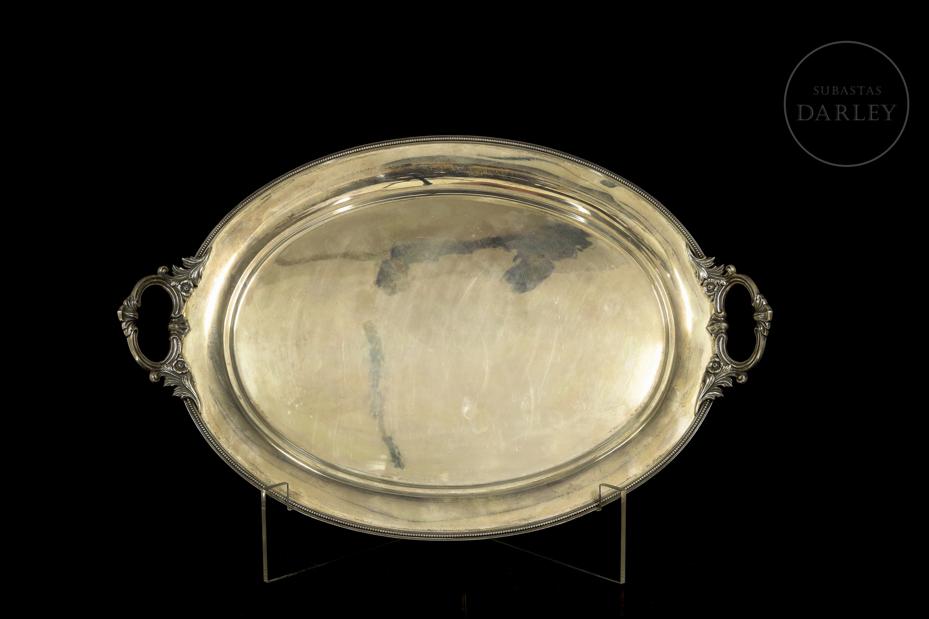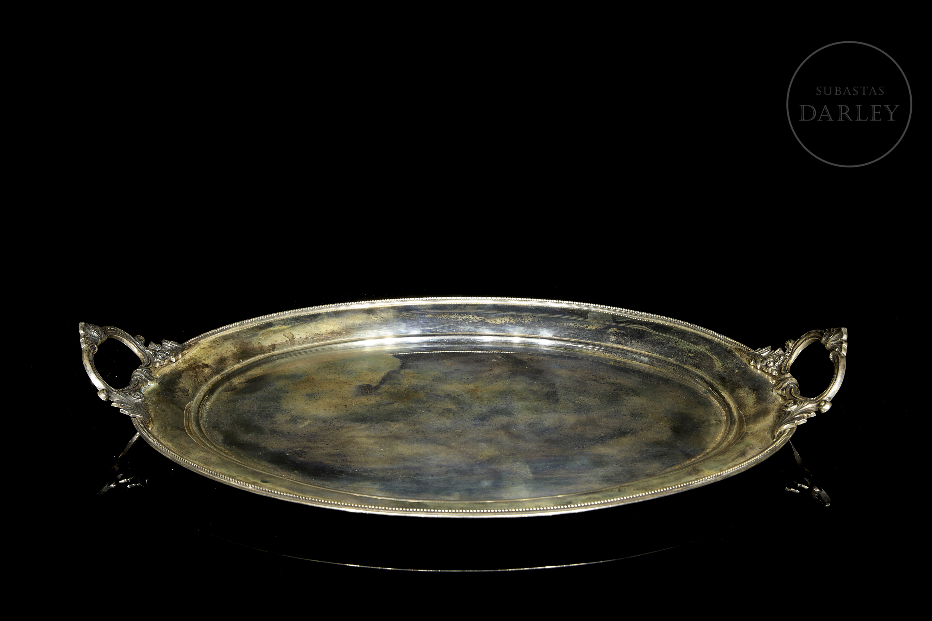 Oval silver tray with a decorative rope-style rim and two handles decorated with flowers and scrolls. Marked ‘Dickhoff en Salm’ on the base.