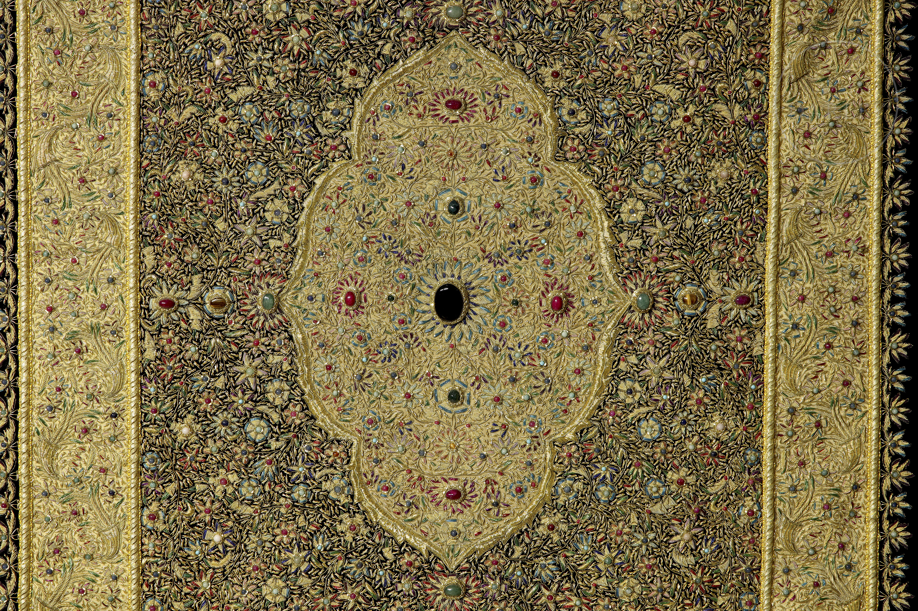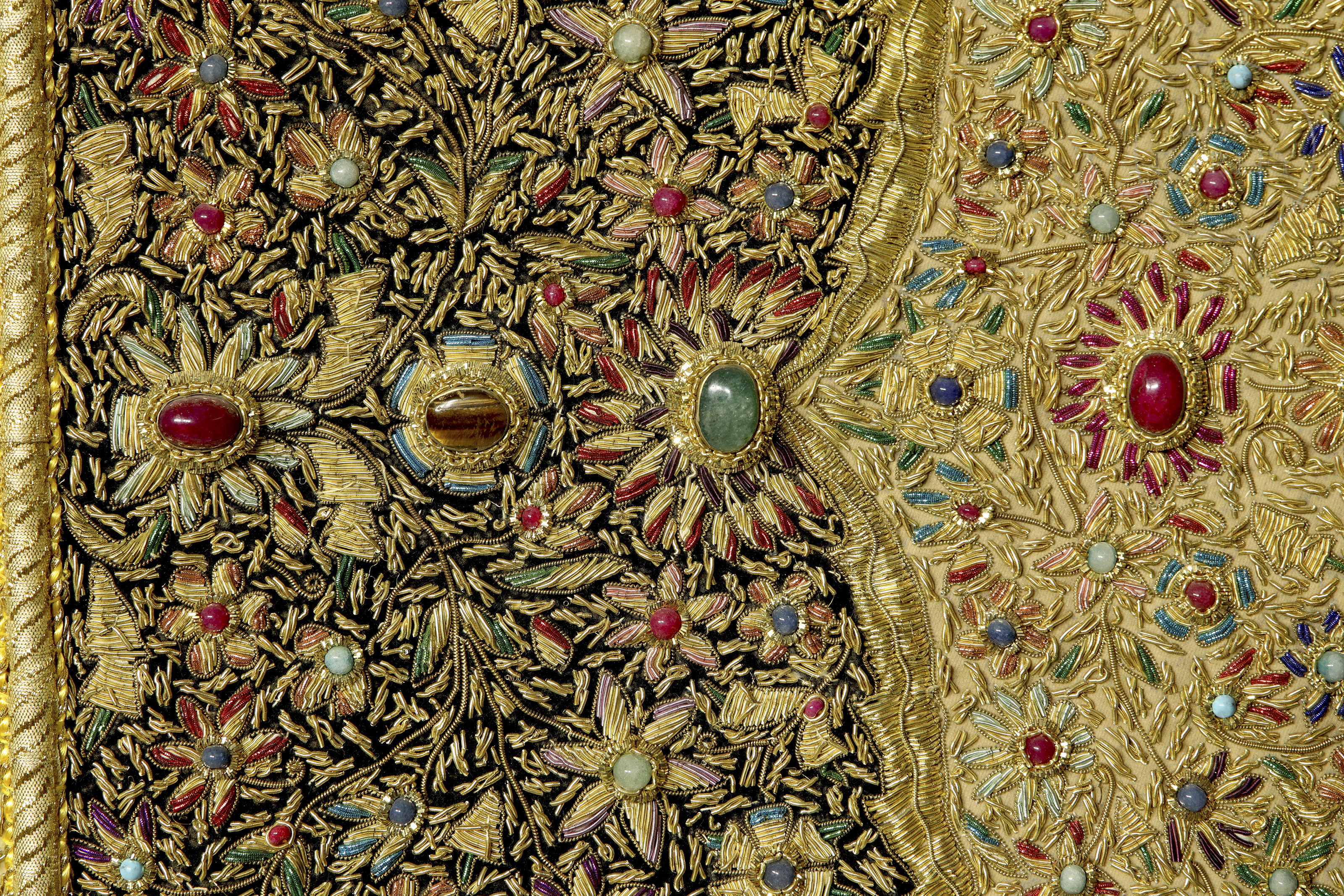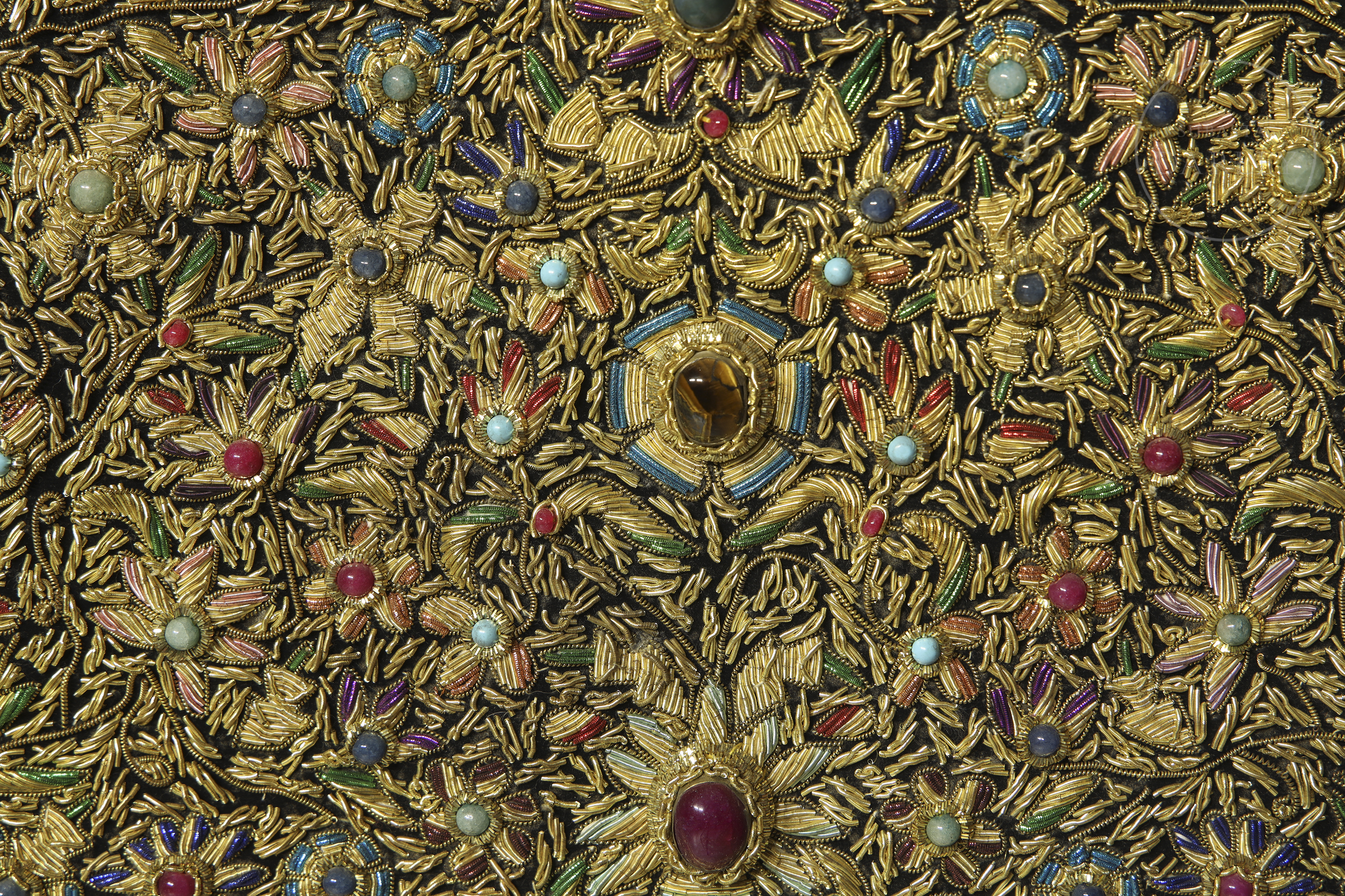 Wall tapestry embroidered using the zardozi technique, an art form known for its intricate work with metallic threads and inlaid semi-precious stones. In this case, it is inlaid with rubies, sapphires, jade, turquoise, tiger's eye and onyx. Precious and semi-precious stones of slightly lower quality but still gems.