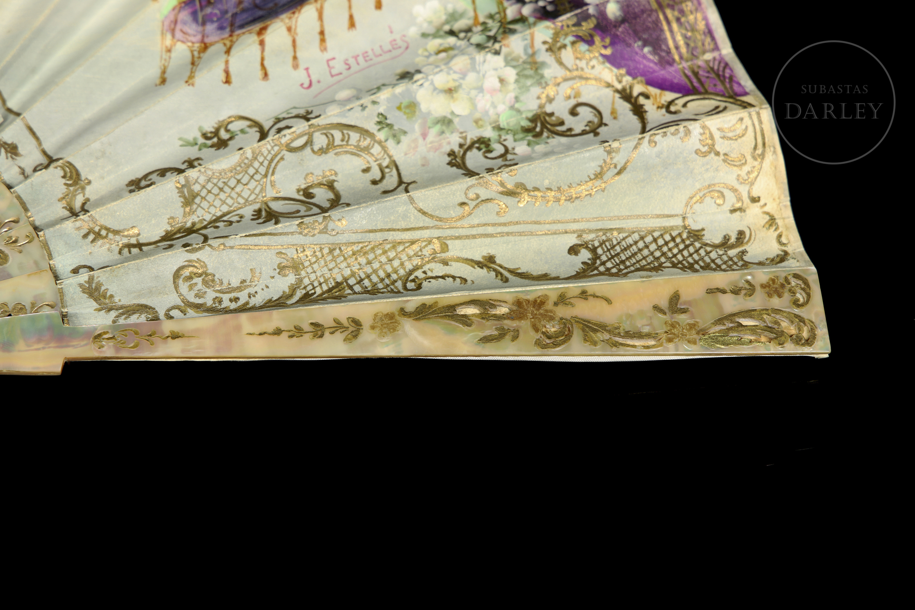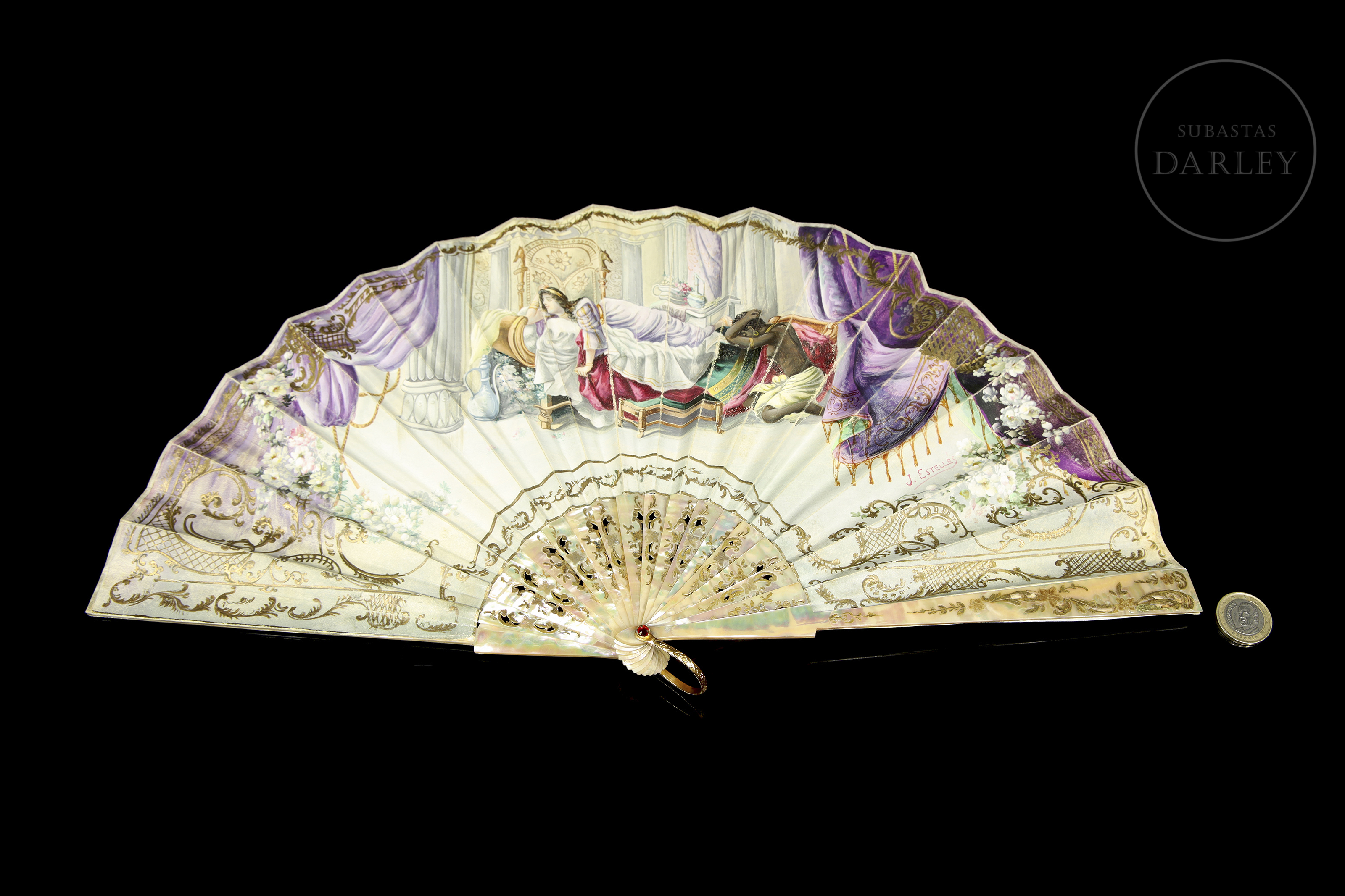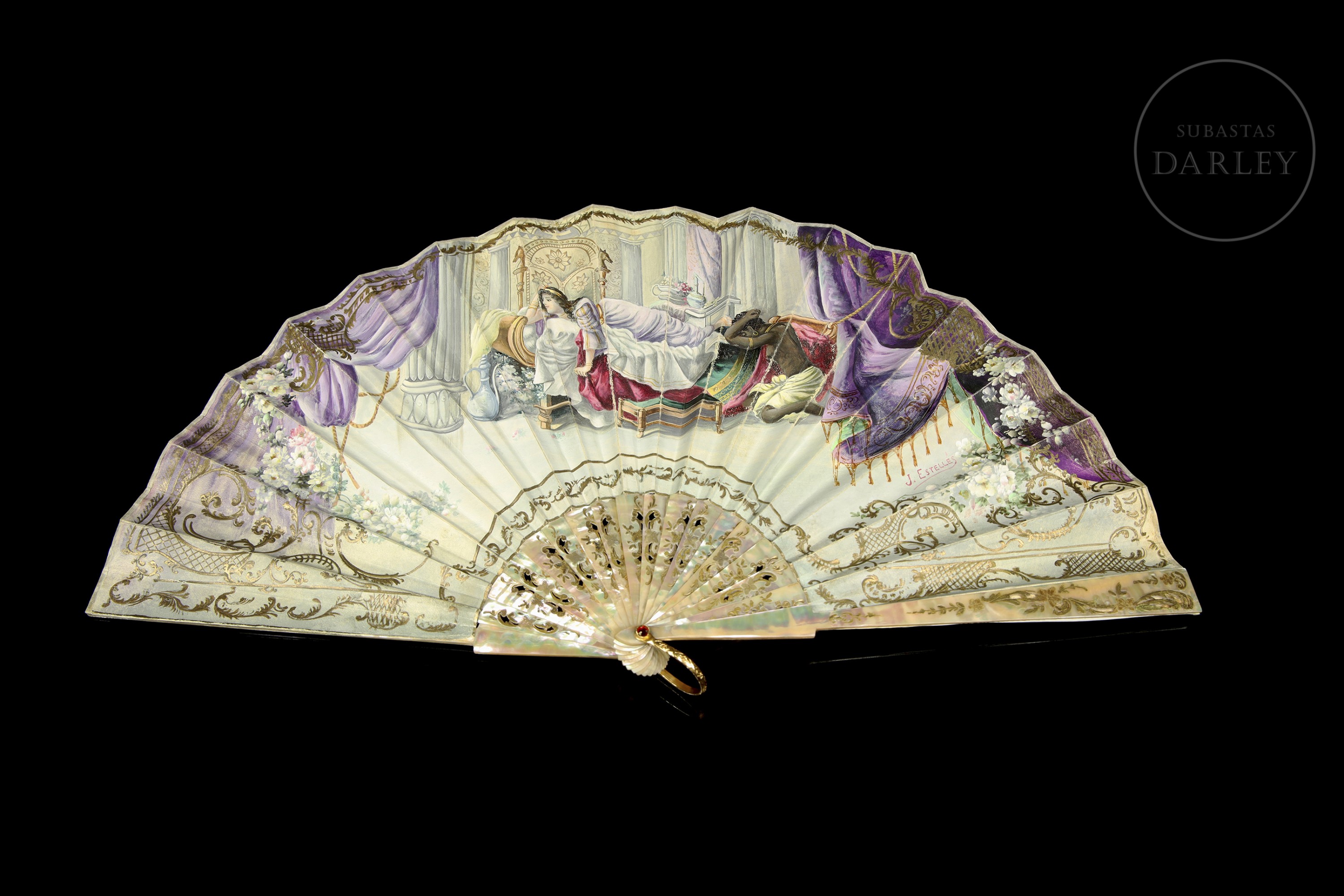Beautiful hand-painted fan by L. Estellés, featuring a painted scene that falls within the Orientalist or erotic art style of the Victorian era. The fan has a mother-of-pearl stick frame, openwork and painted with gold details.