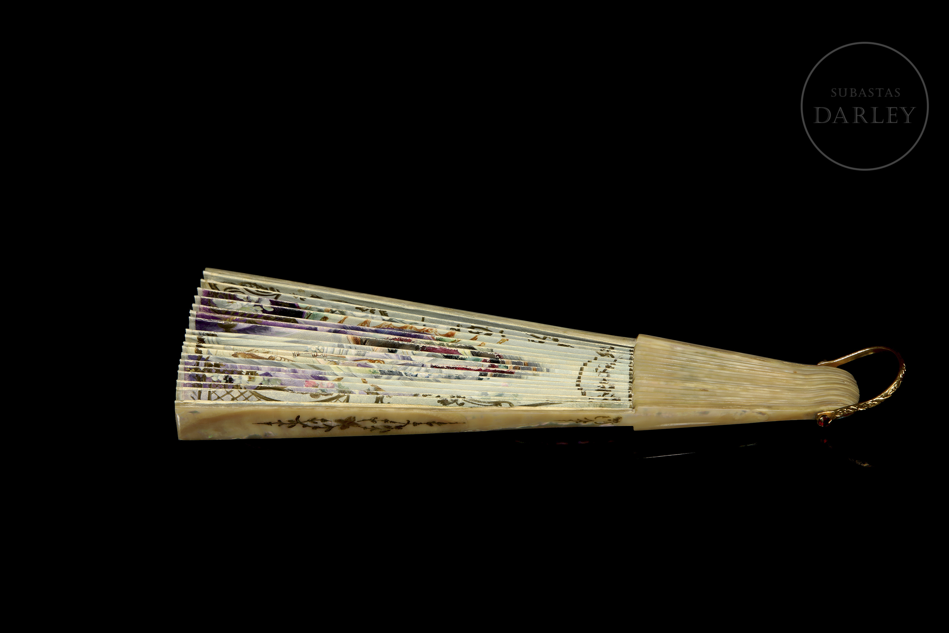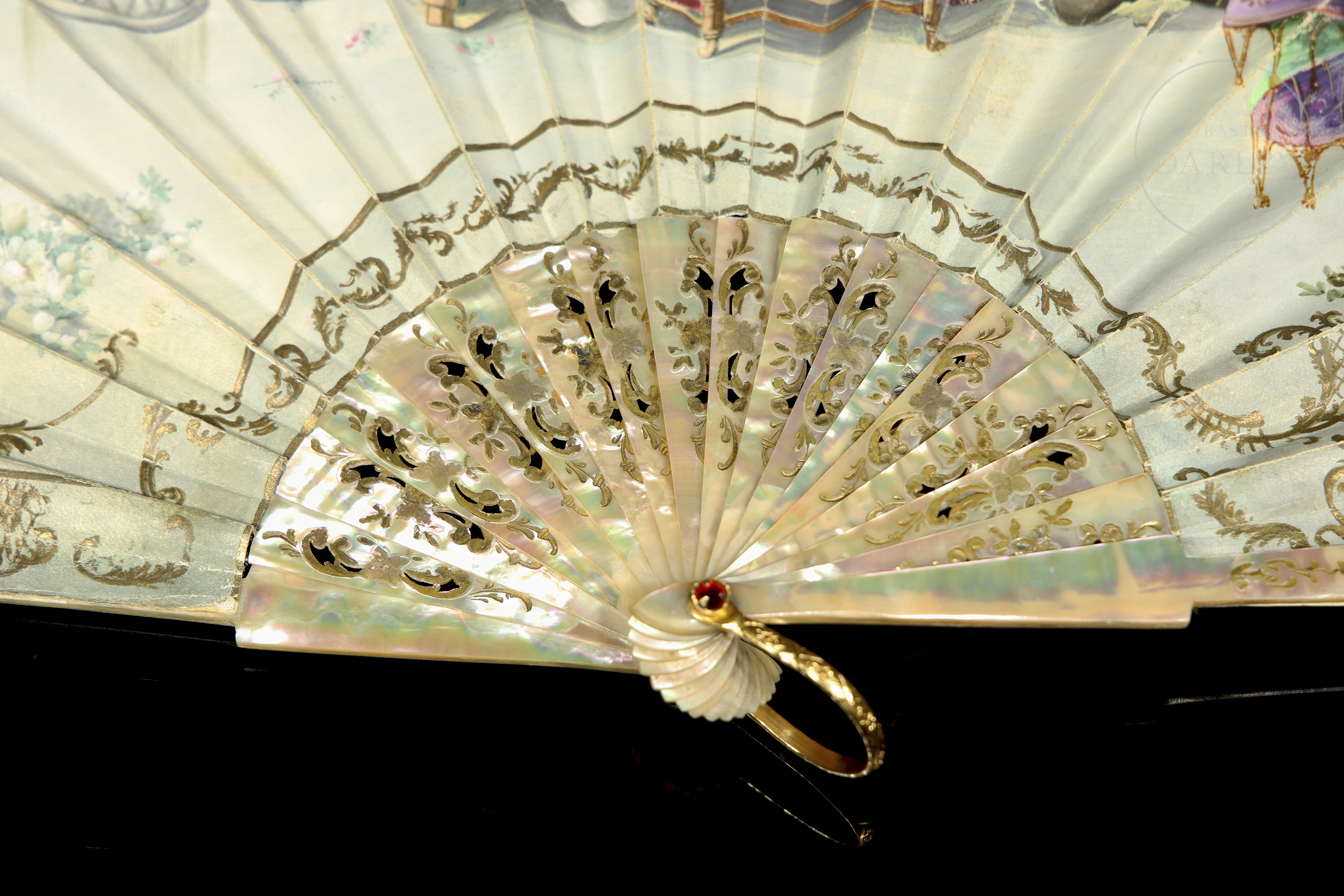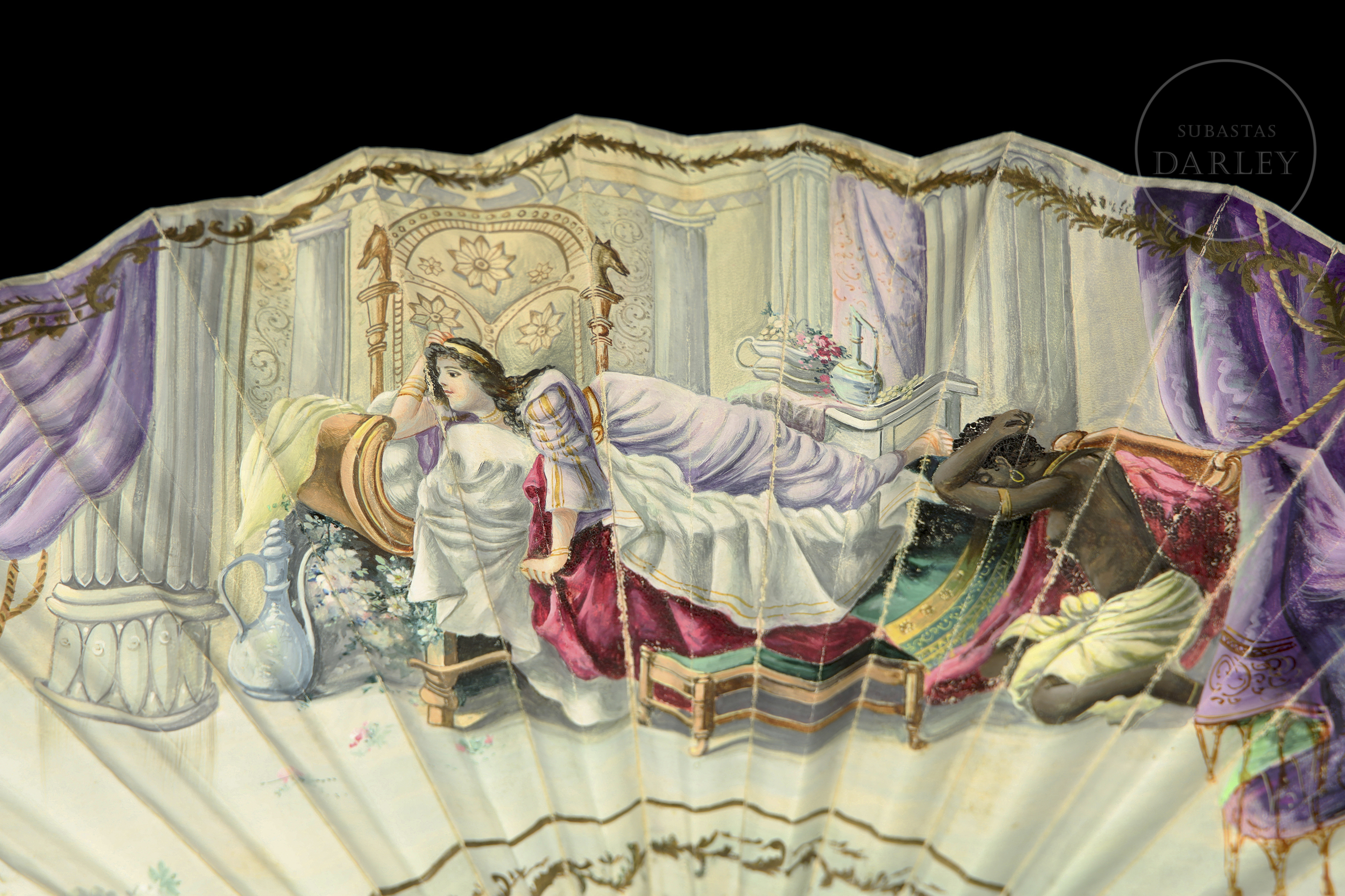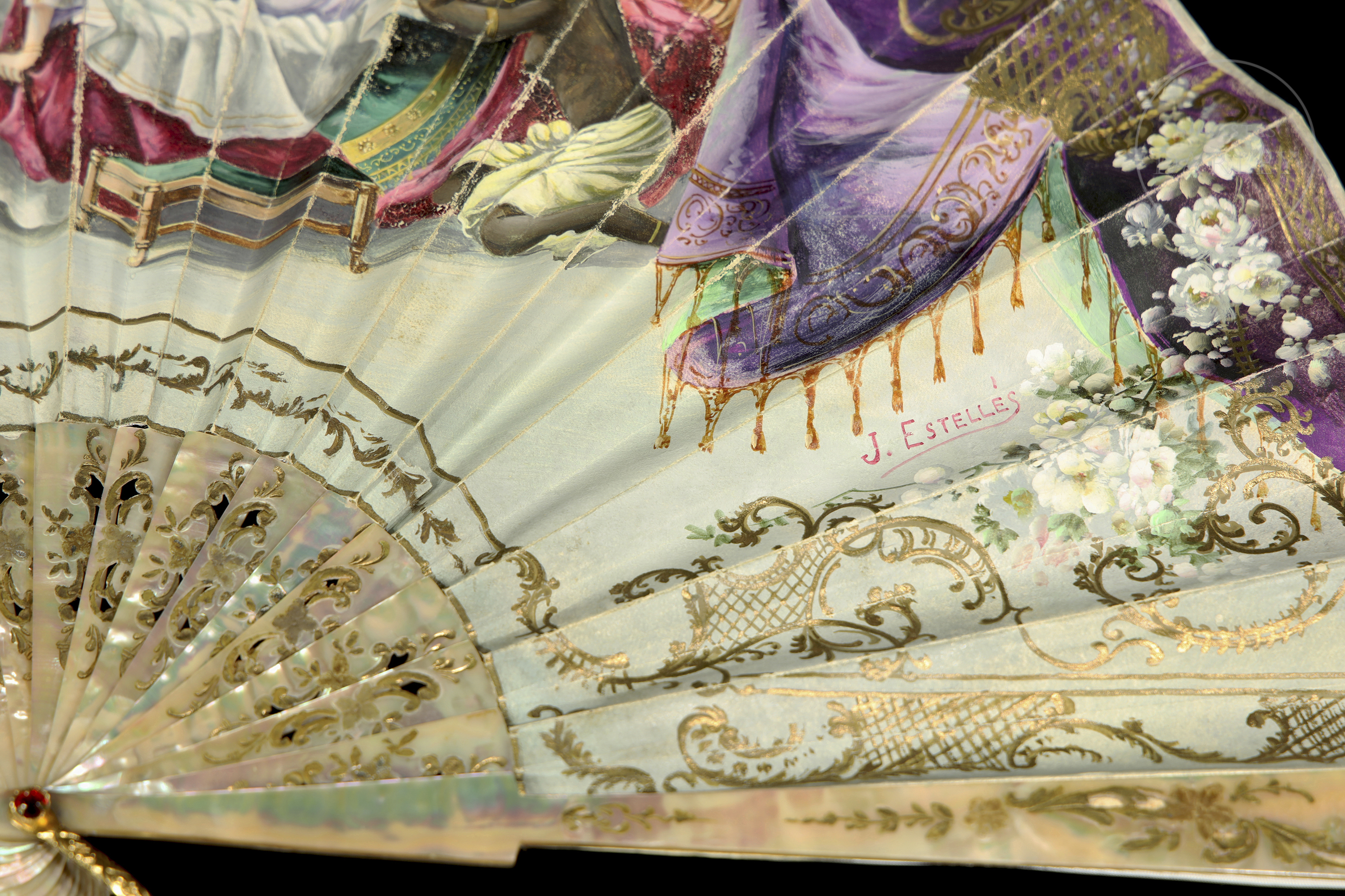 Beautiful hand-painted fan by L. Estellés, featuring a painted scene that falls within the Orientalist or erotic art style of the Victorian era. The fan has a mother-of-pearl stick frame, openwork and painted with gold details.