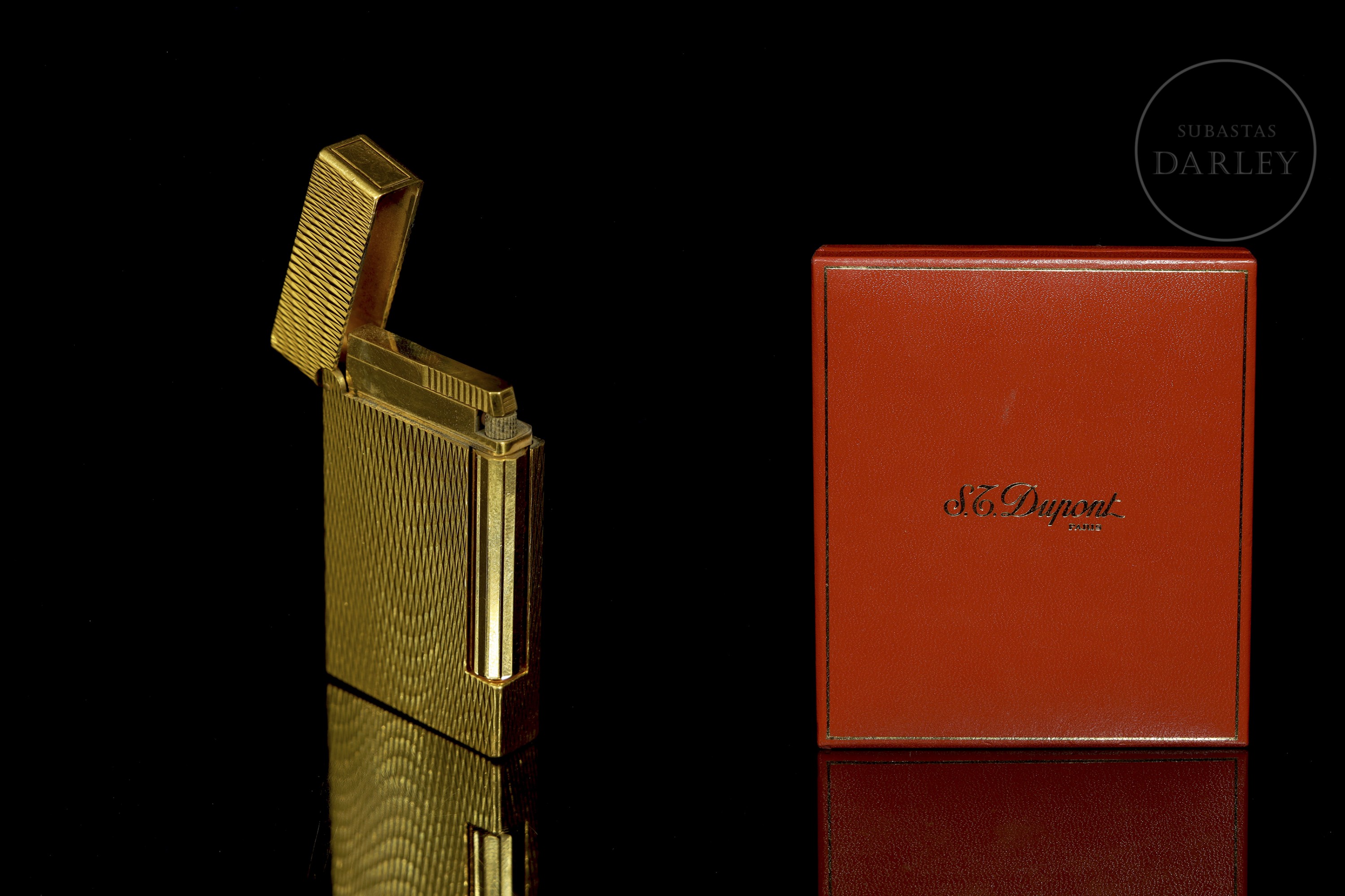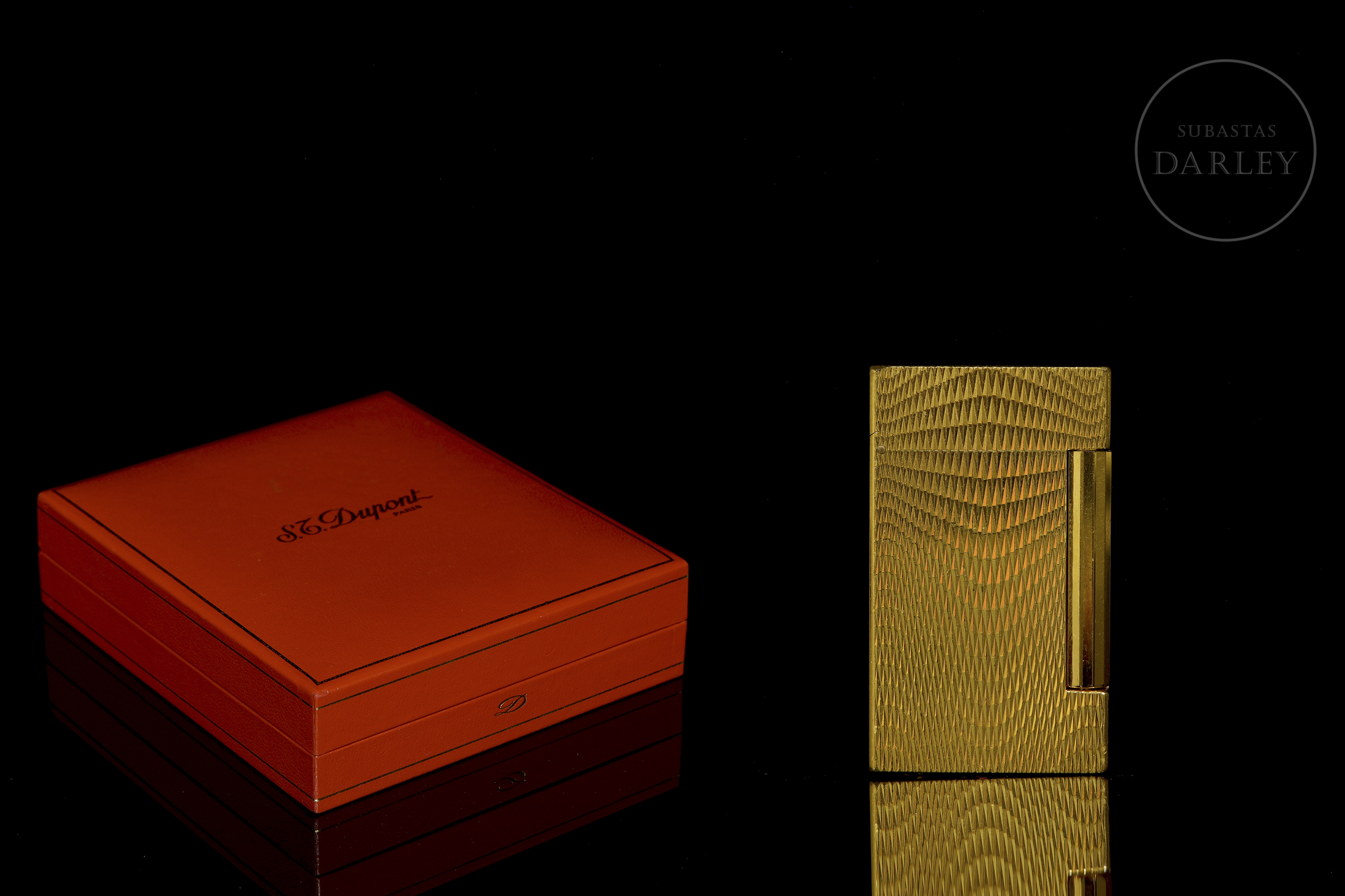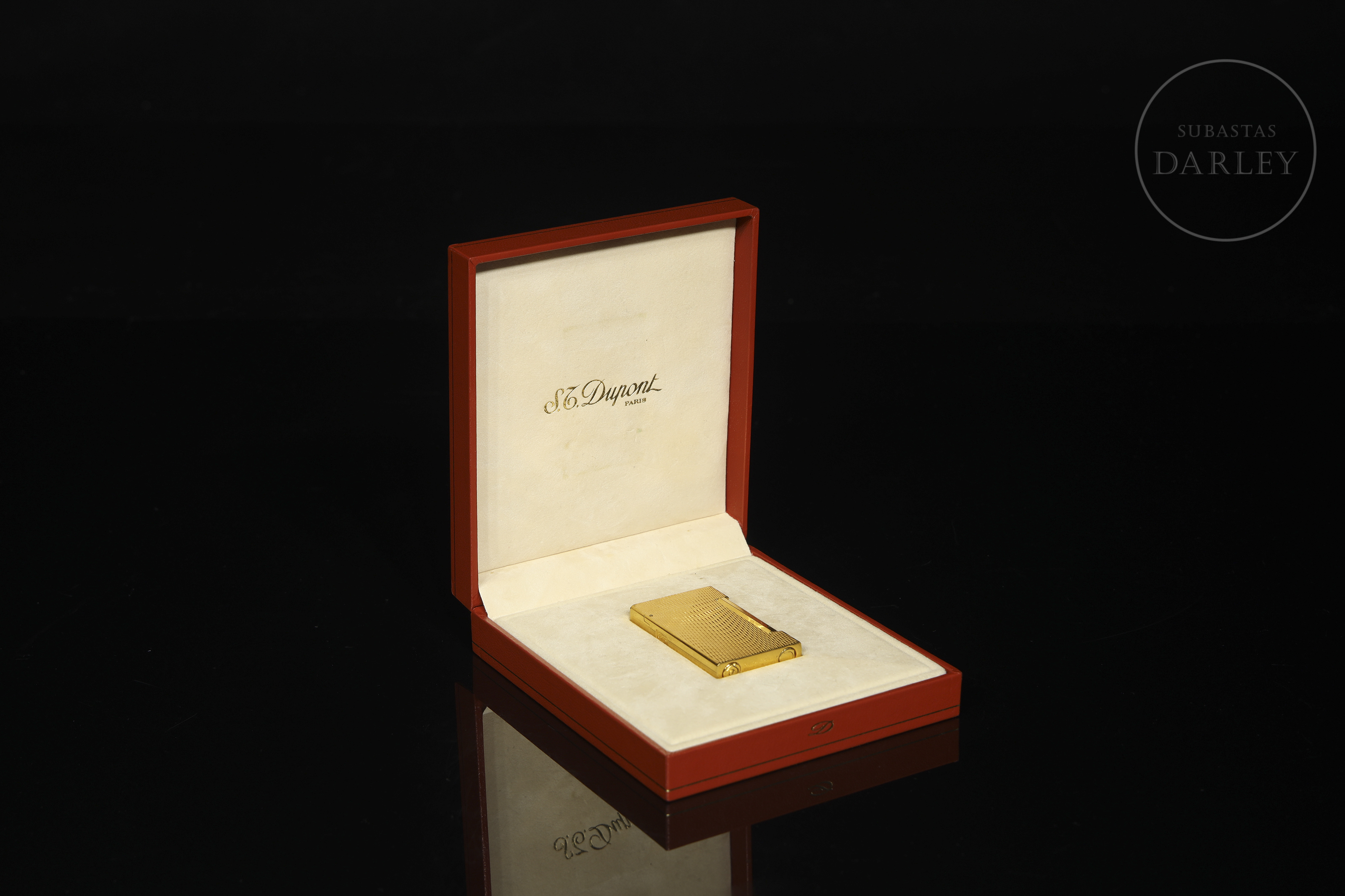 S.T. Dupont lighter capped in yellow gold with a textured guilloché pattern. Presented in its original case. French brand, renowned for its high-quality craftsmanship in luxury items since the 19th century.