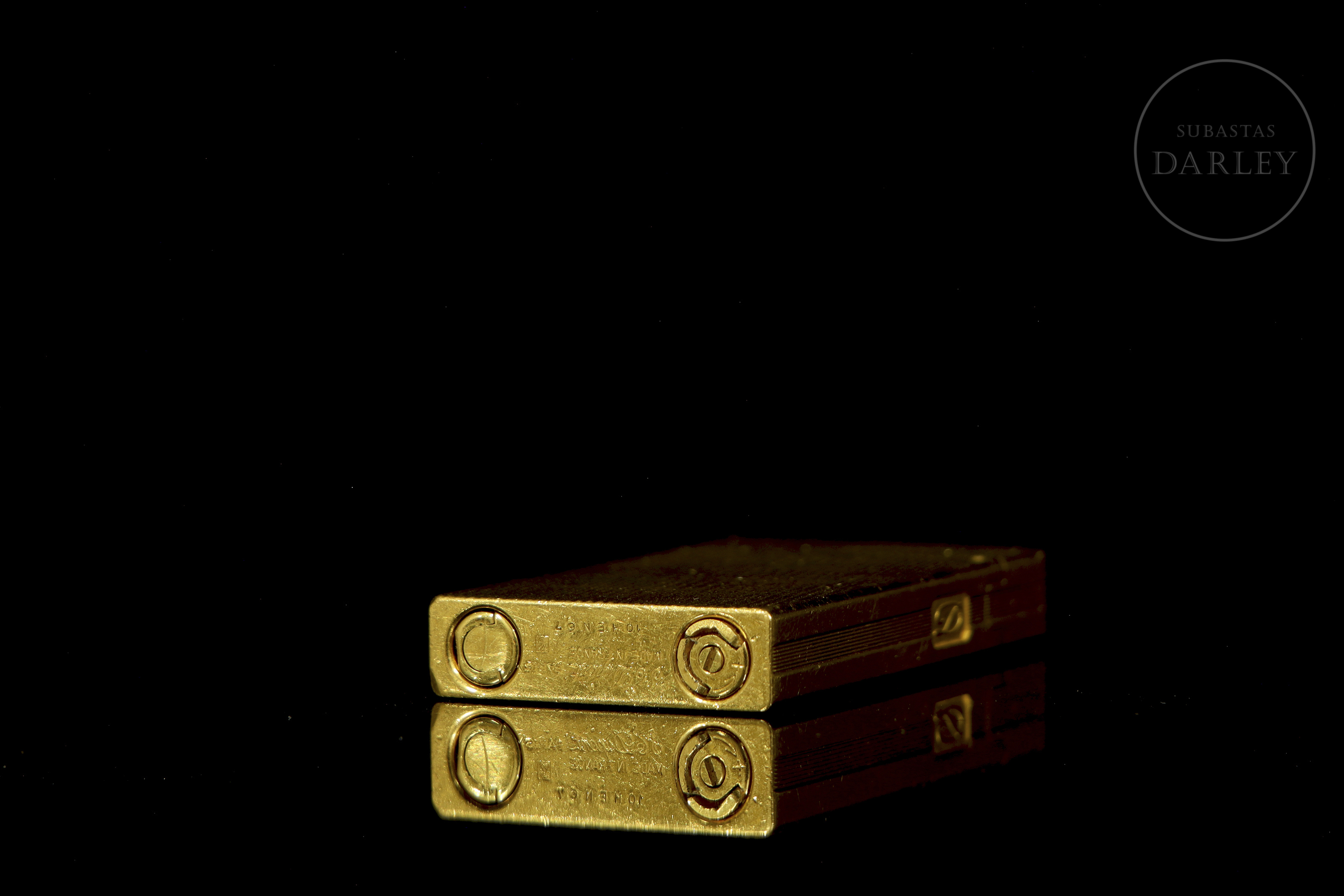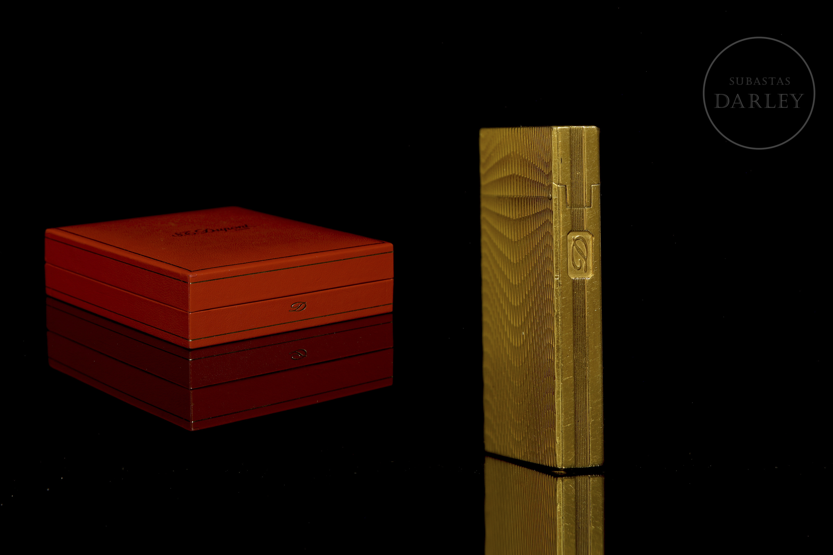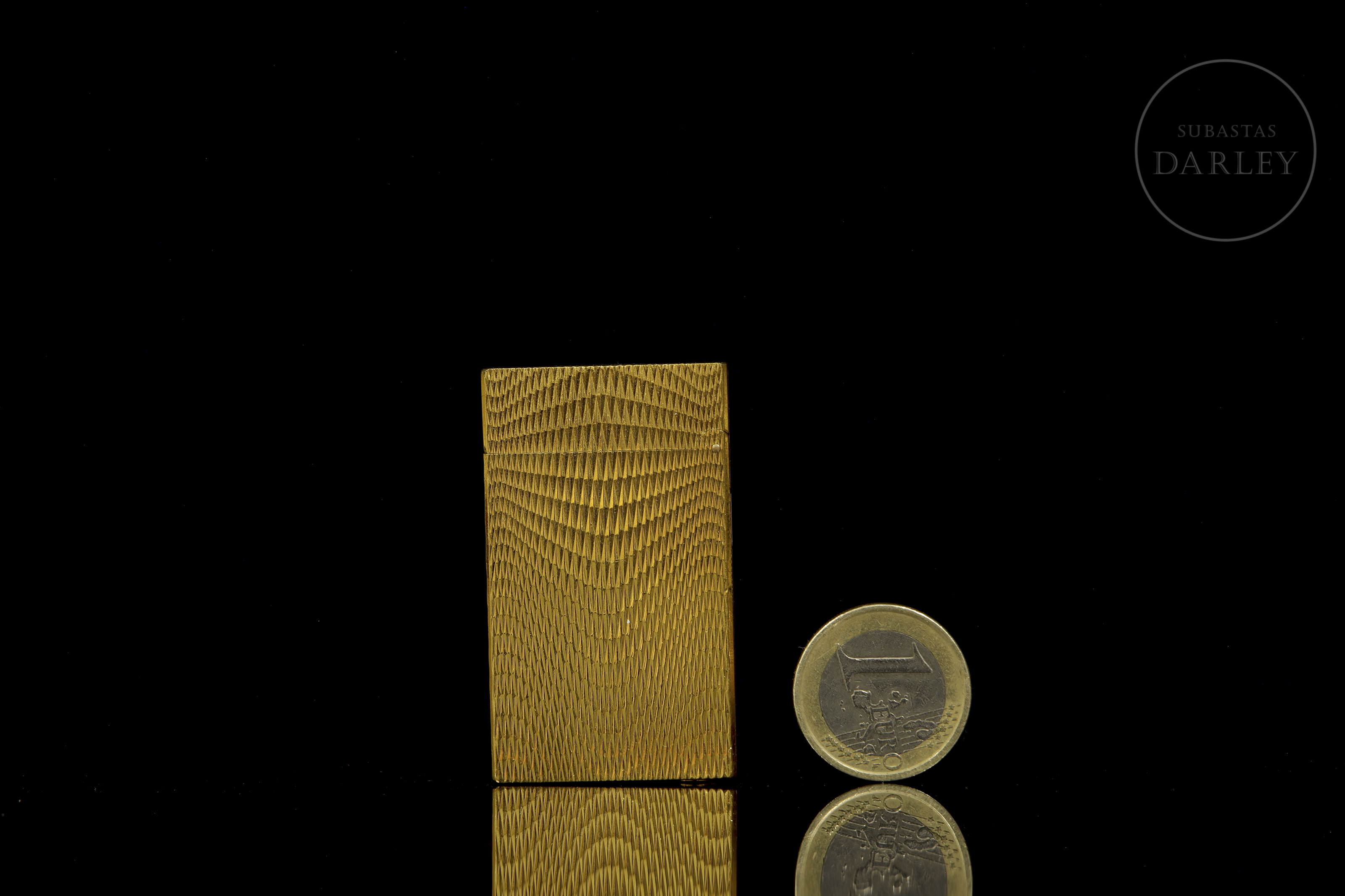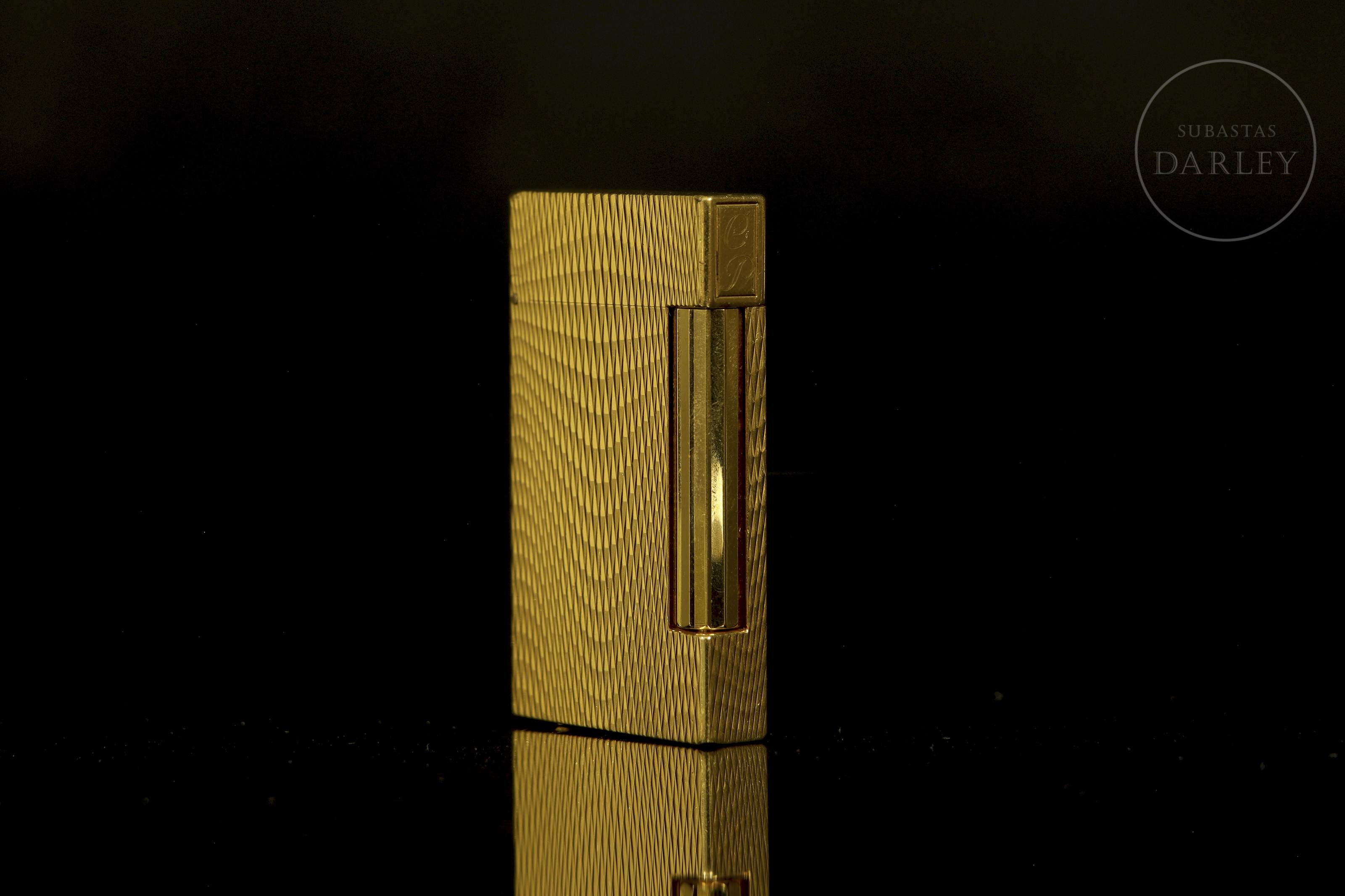 S.T. Dupont lighter capped in yellow gold with a textured guilloché pattern. Presented in its original case. French brand, renowned for its high-quality craftsmanship in luxury items since the 19th century.