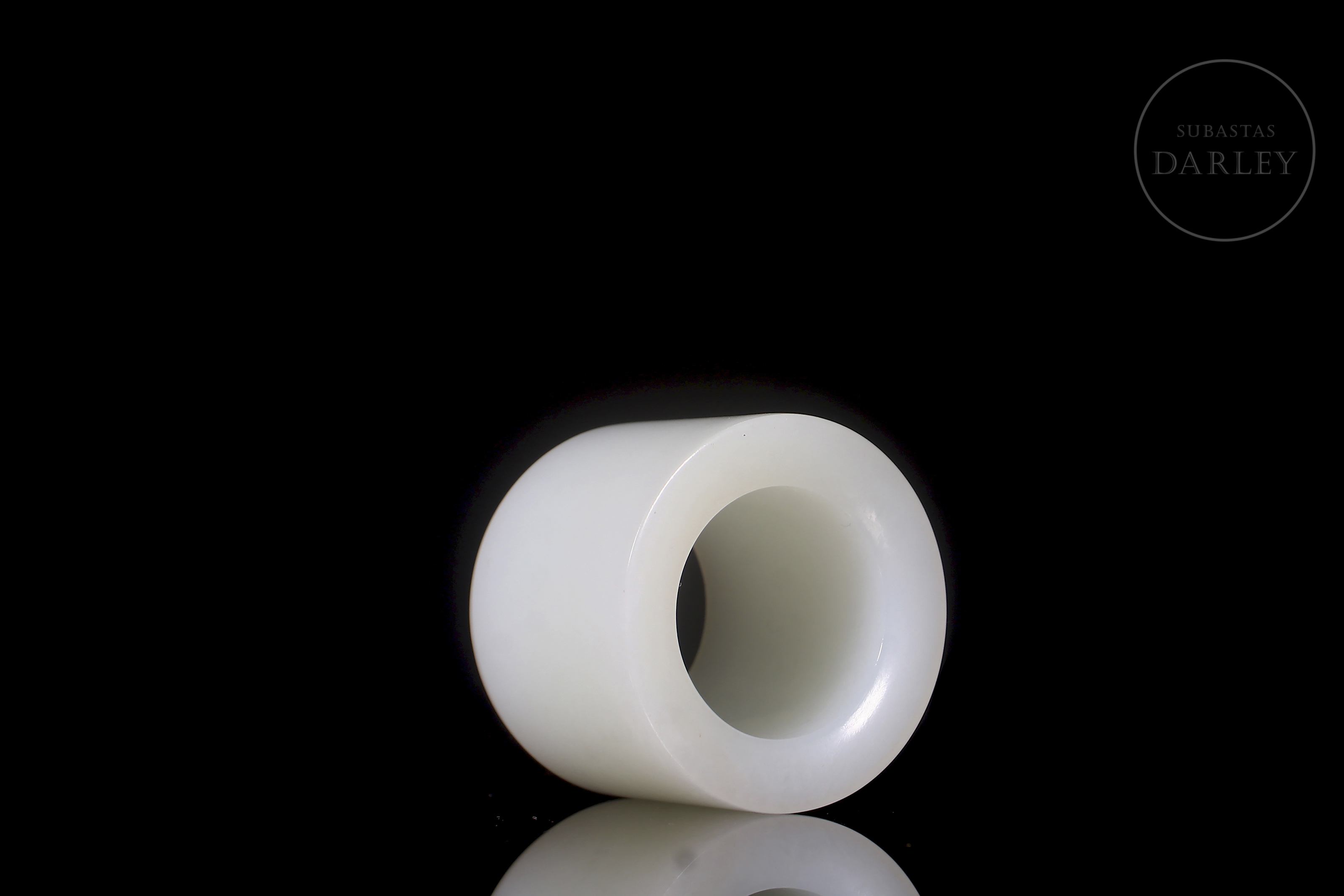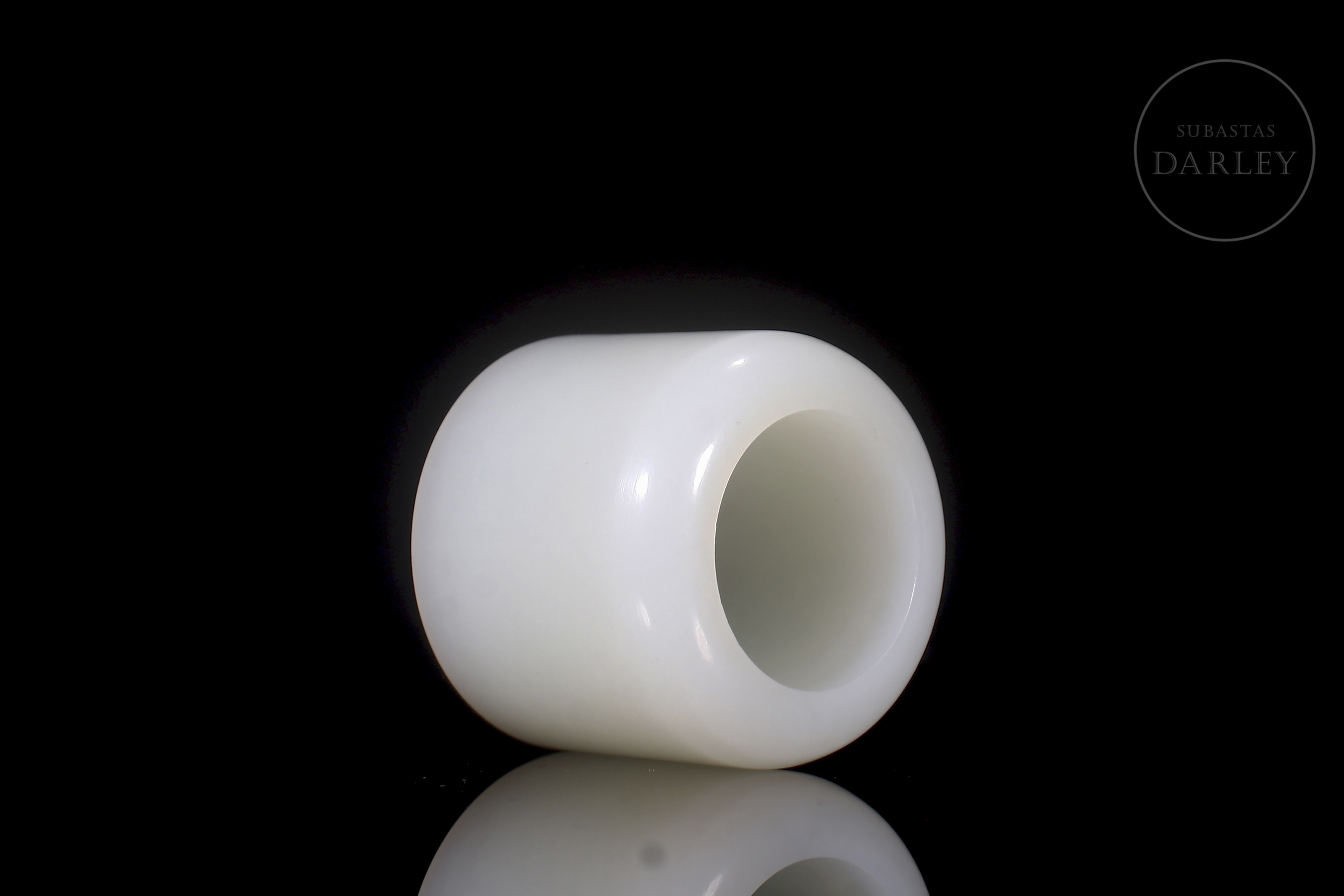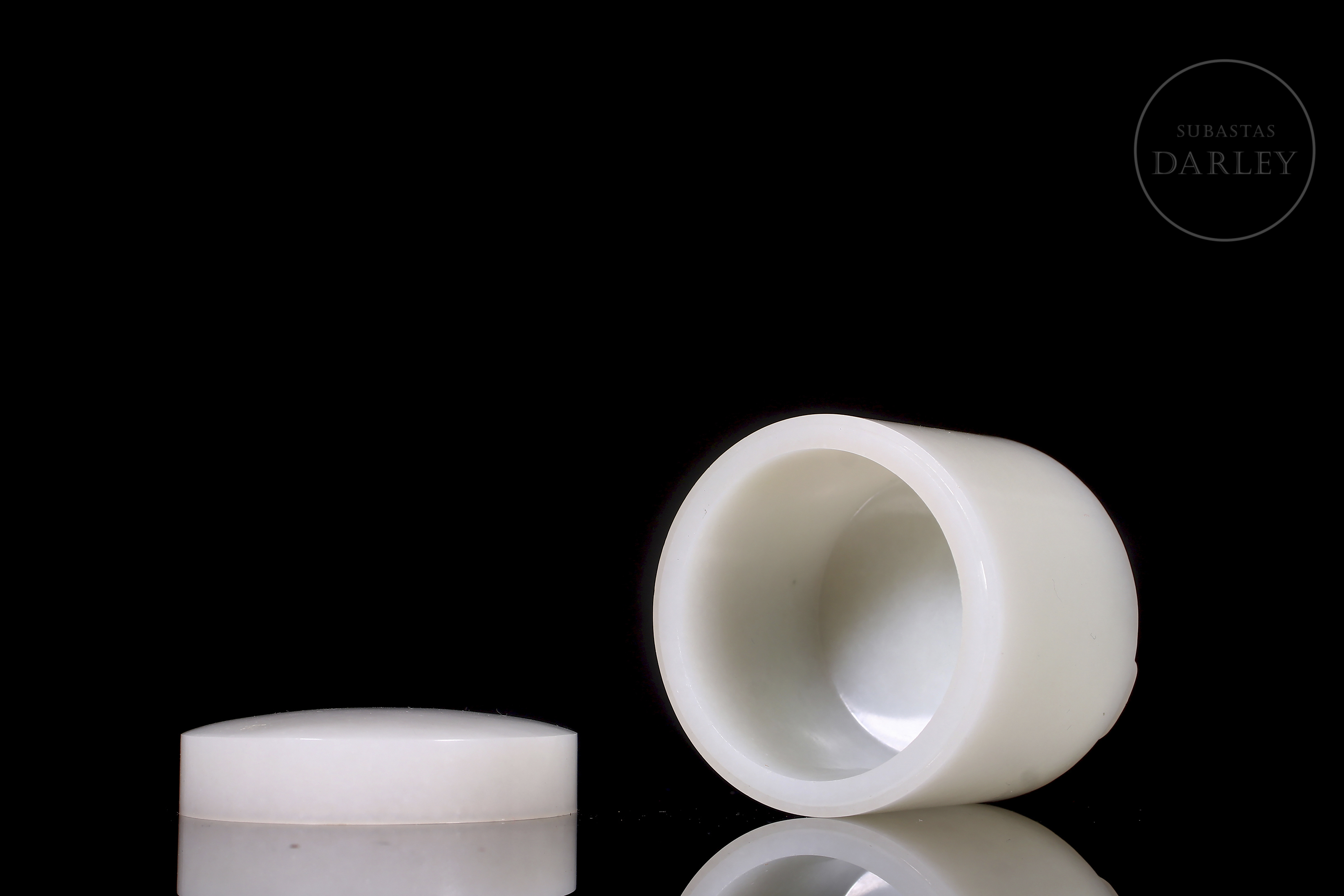 Box set with lid and archer's ring, carved from white Hetian jade. The box is cylindrical with a rounded top lid and rests on three small feet. The lid and body fit together very precisely, and the design is minimalist. The archer's ring is tubular, wide and polished. The jade is pure white and uniform, with excellent translucency. Qing dynasty (1644–1912).