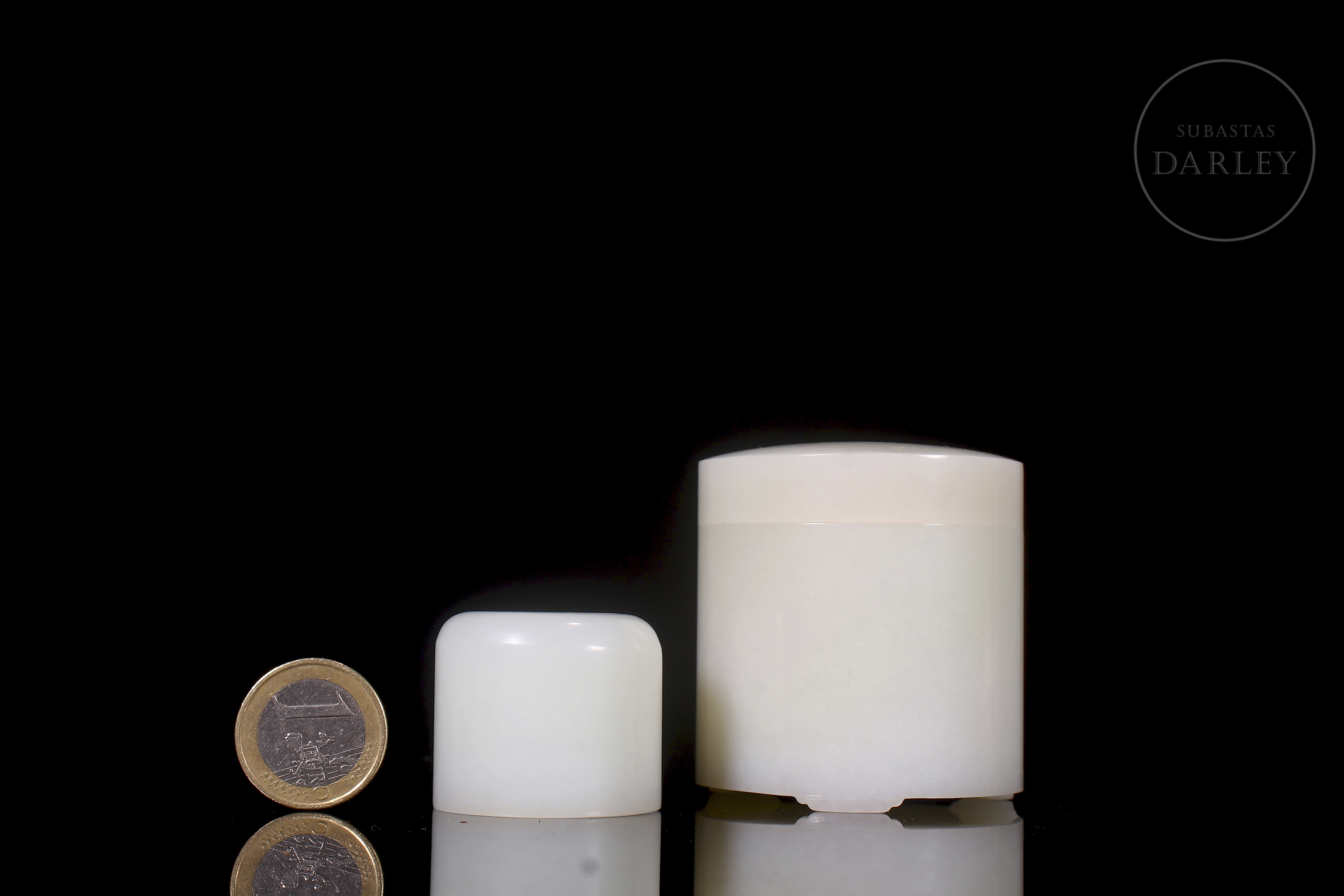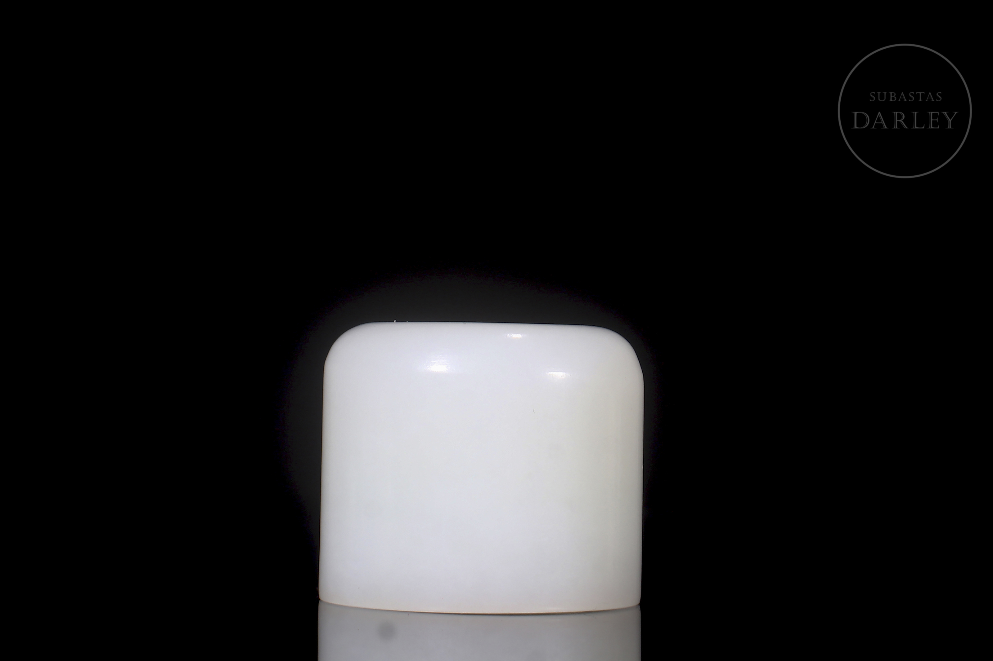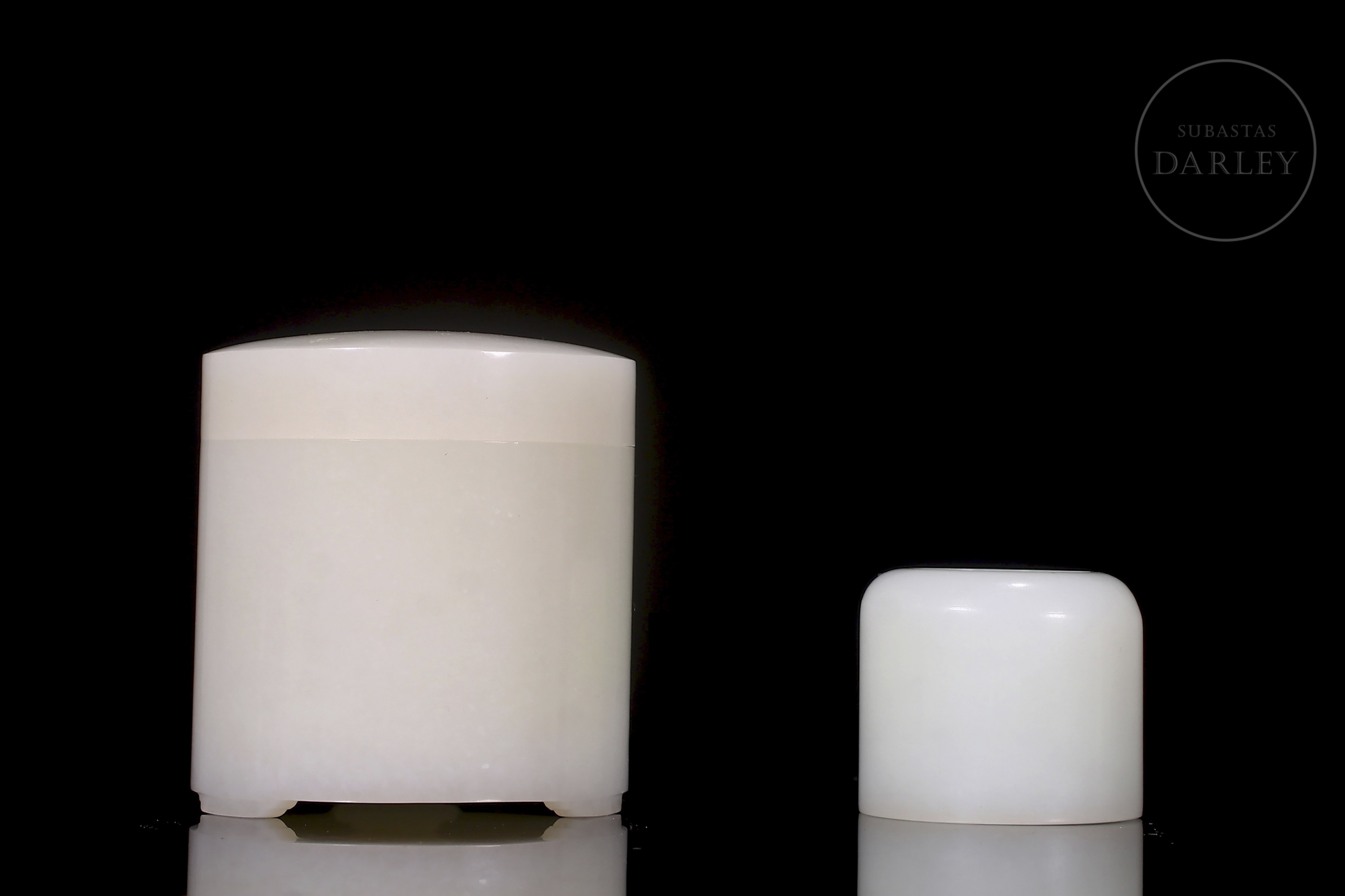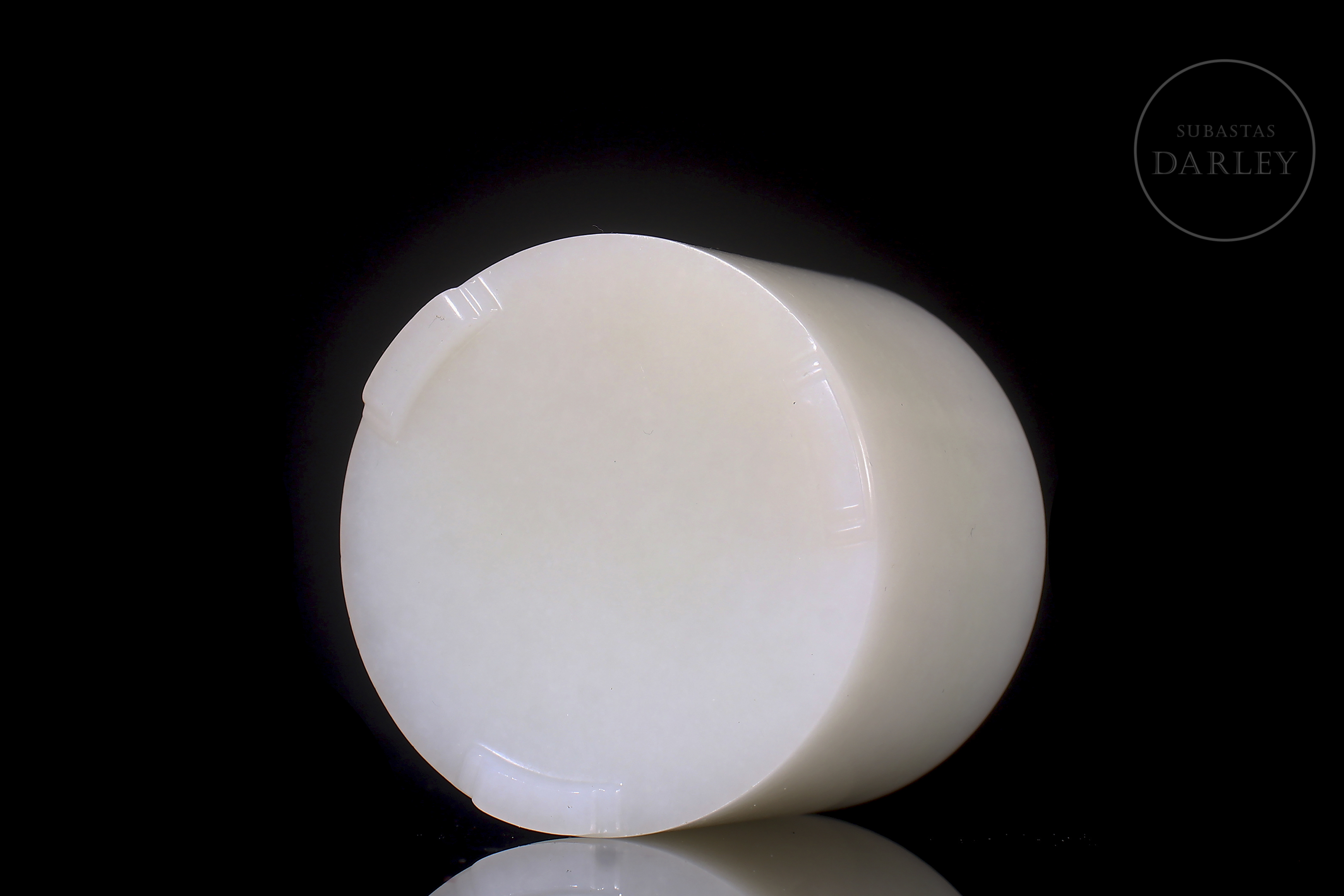 Box set with lid and archer's ring, carved from white Hetian jade. The box is cylindrical with a rounded top lid and rests on three small feet. The lid and body fit together very precisely, and the design is minimalist. The archer's ring is tubular, wide and polished. The jade is pure white and uniform, with excellent translucency. Qing dynasty (1644–1912).