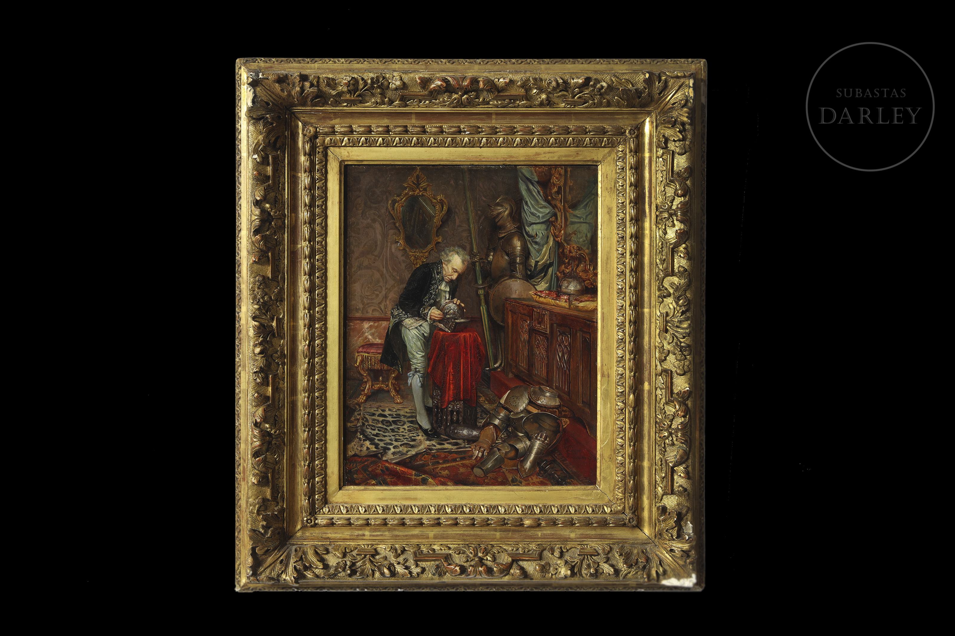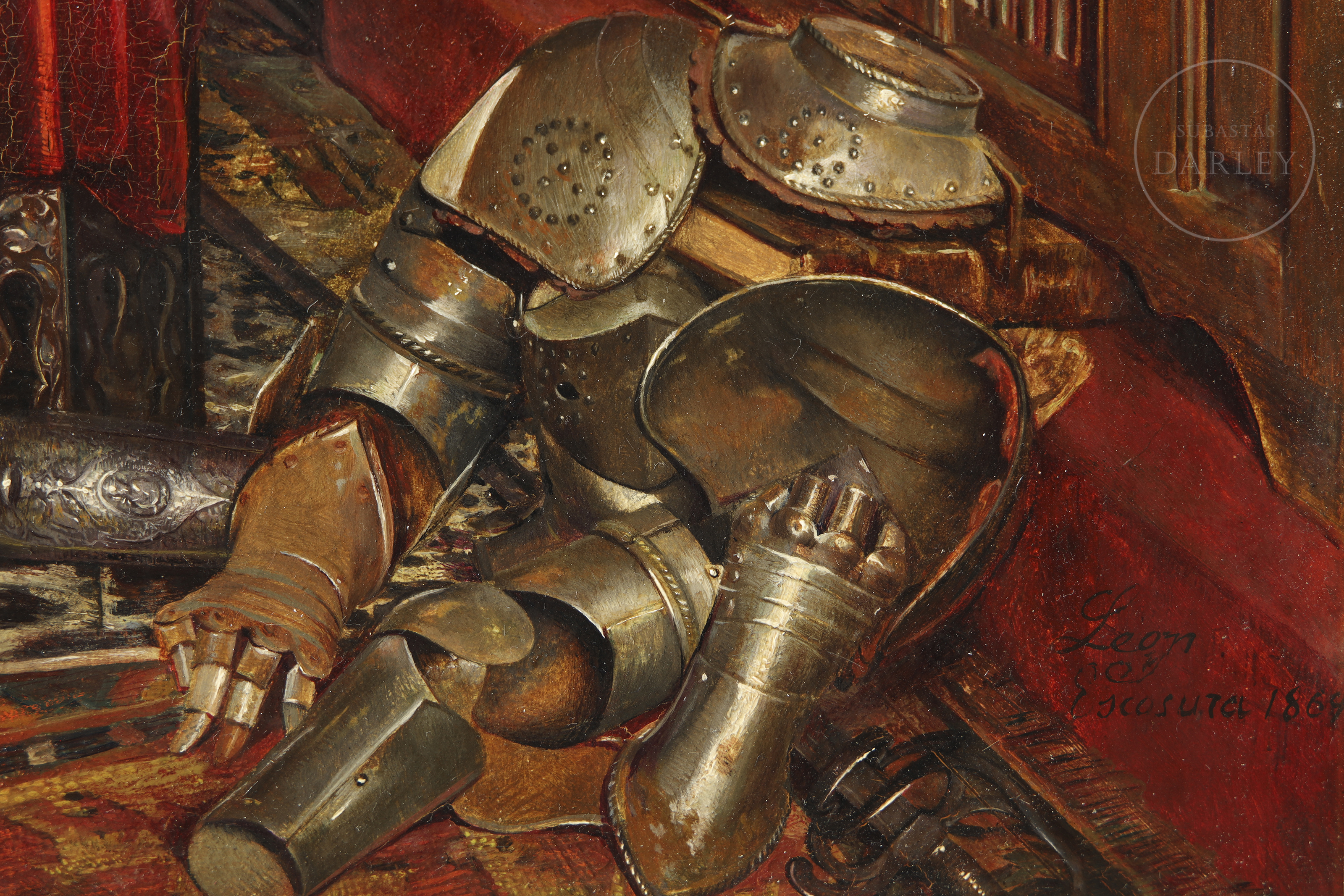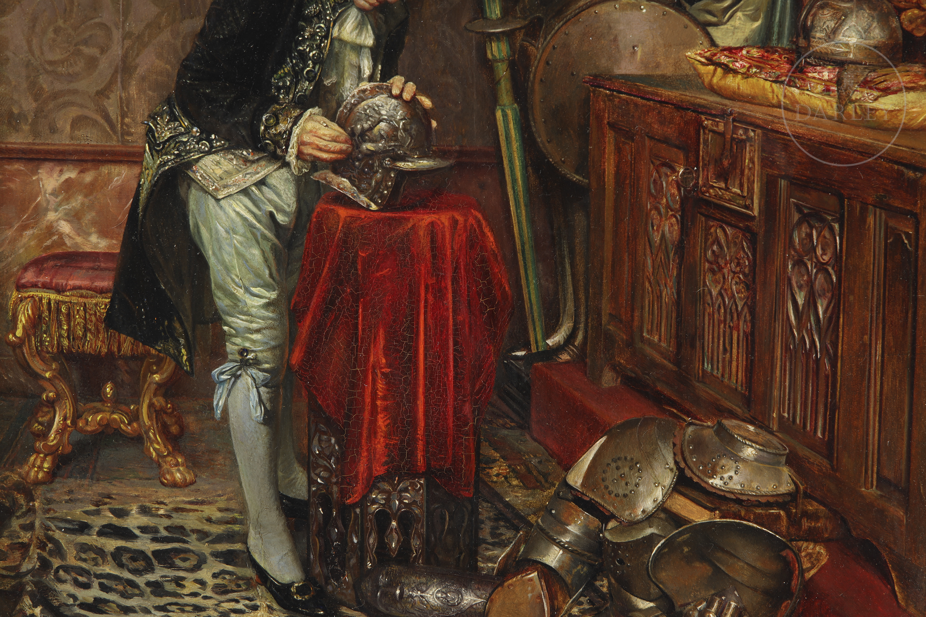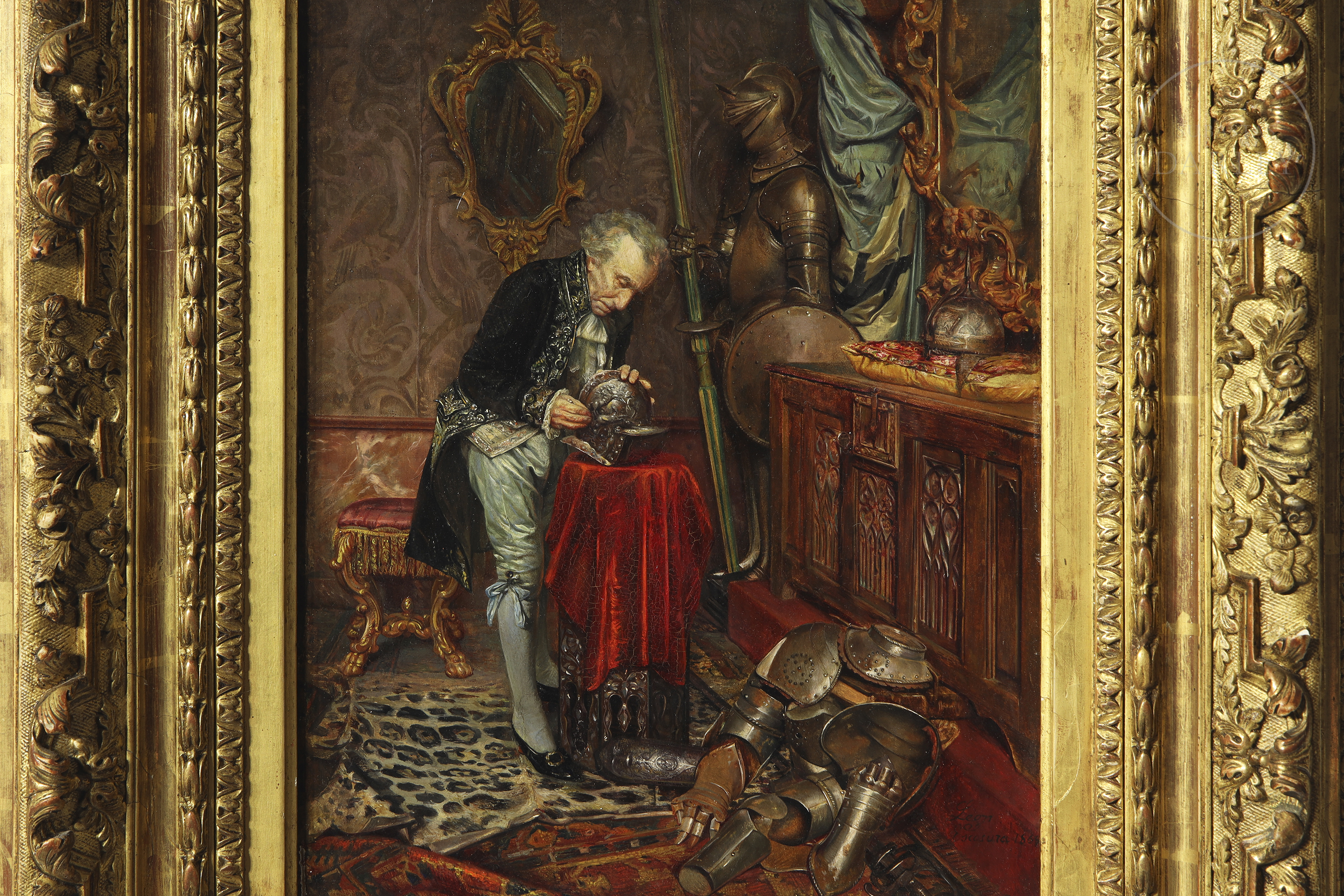 Oil on panel. Genre scene depicting a gentleman in a sumptuous interior, examining a medieval helmet on a red cloth. The figure is surrounded by armour, war trophies and richly decorated furniture. Signed and dated in the lower right corner ‘León I Escosura. 1865’.