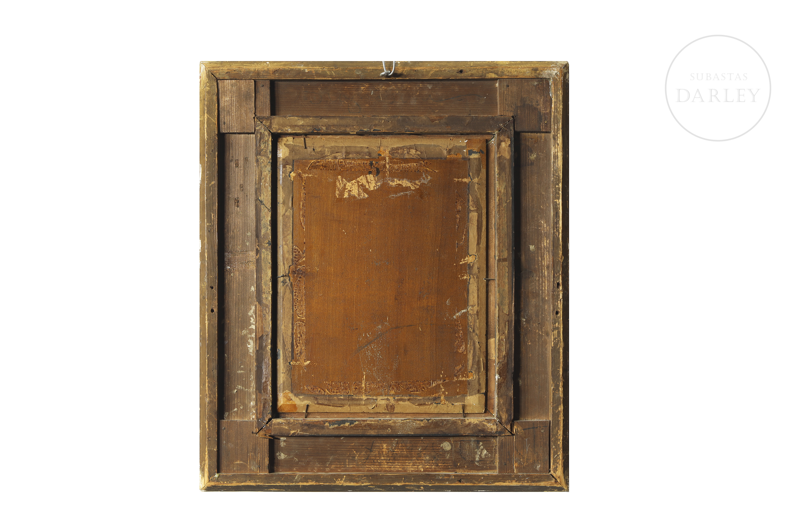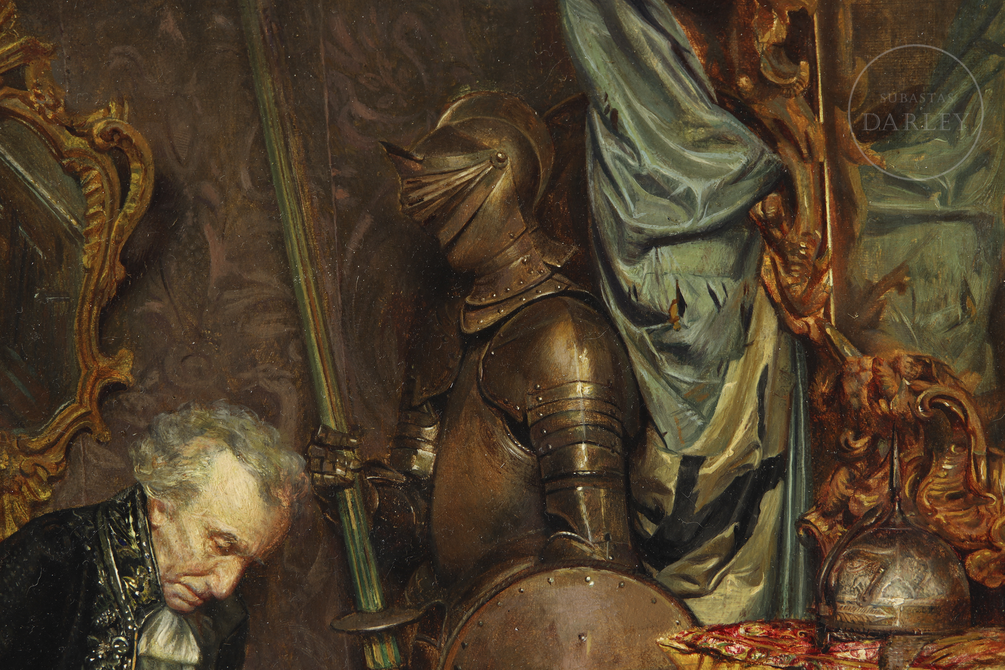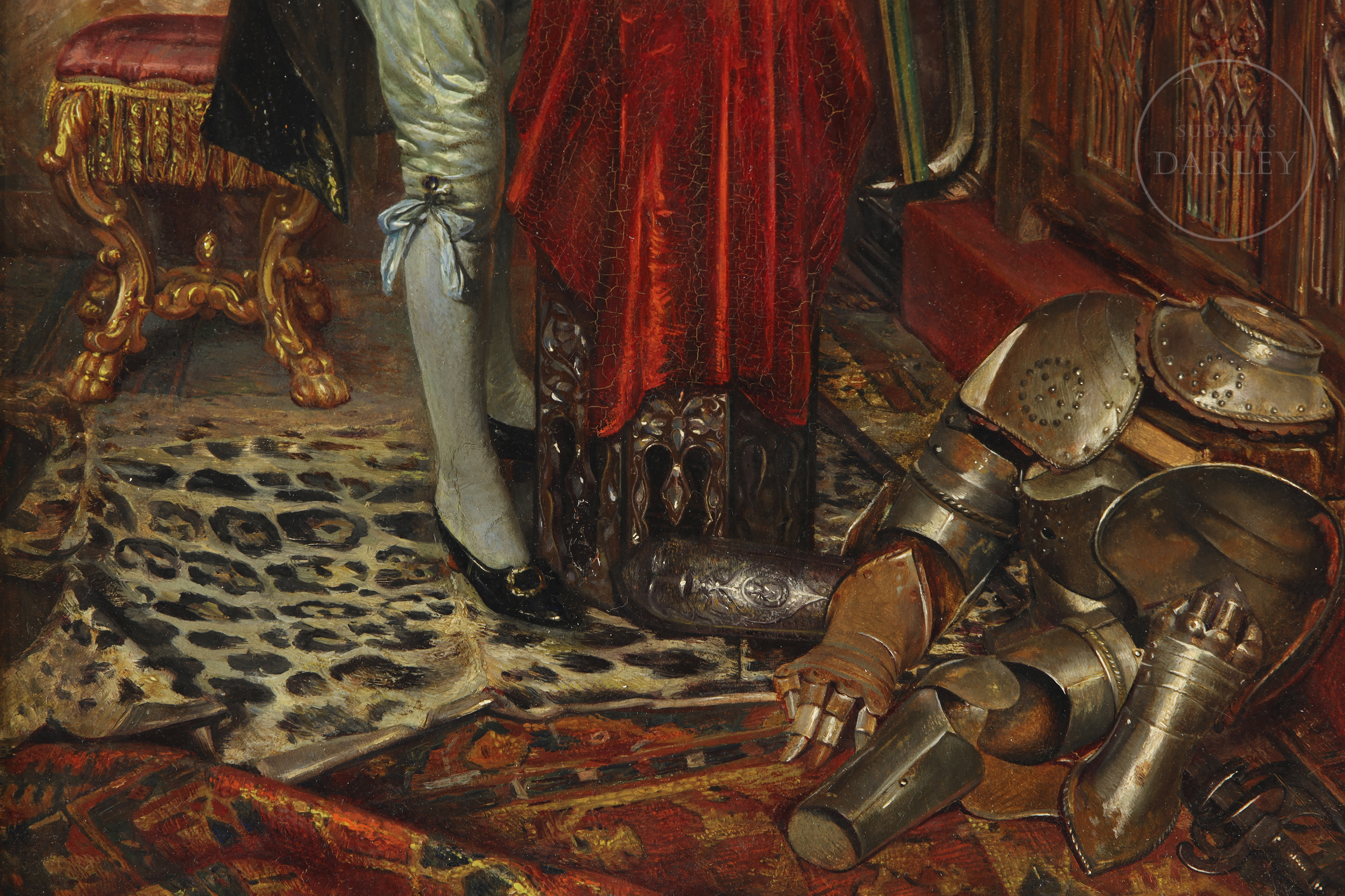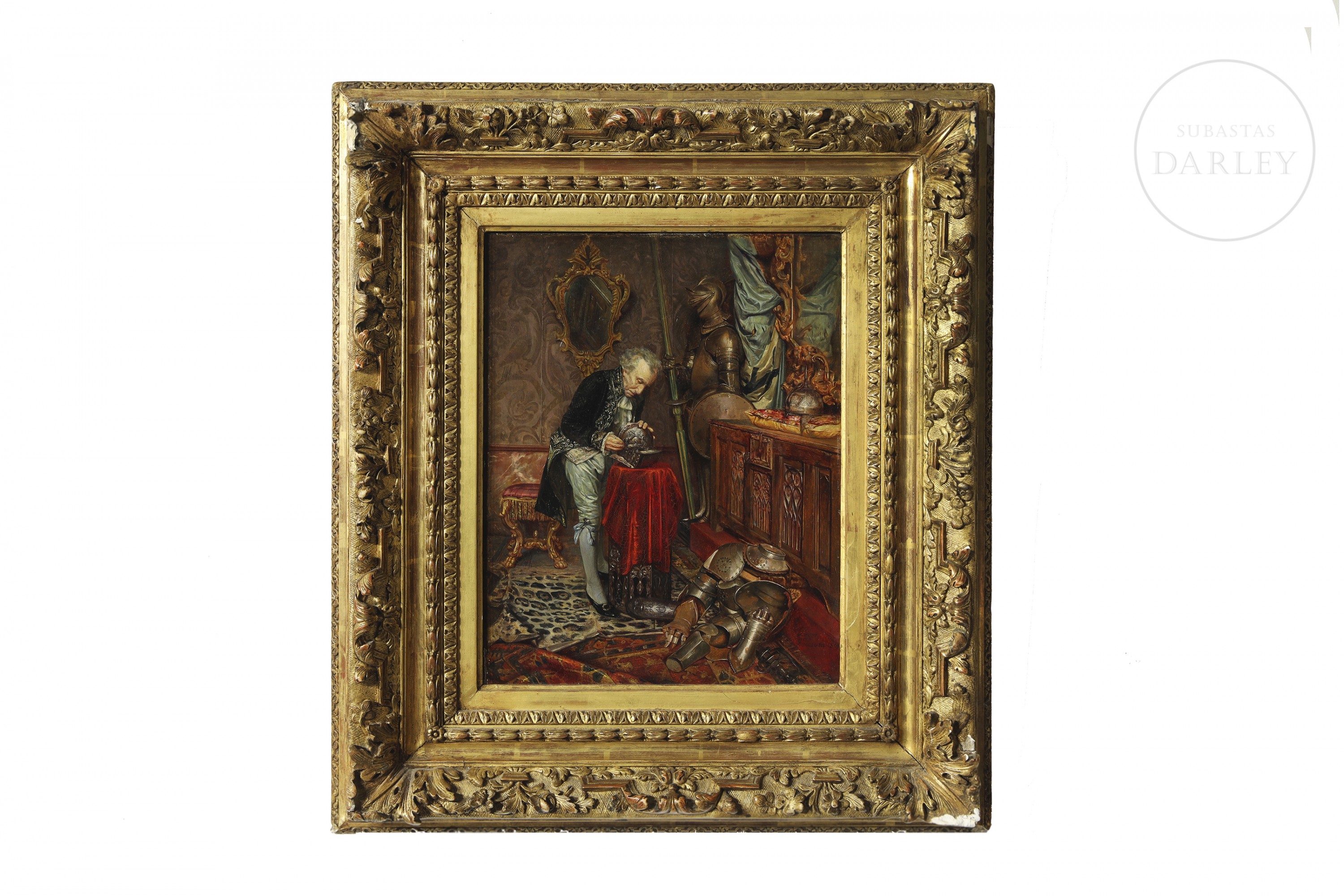 Oil on panel. Genre scene depicting a gentleman in a sumptuous interior, examining a medieval helmet on a red cloth. The figure is surrounded by armour, war trophies and richly decorated furniture. Signed and dated in the lower right corner ‘León I Escosura. 1865’.