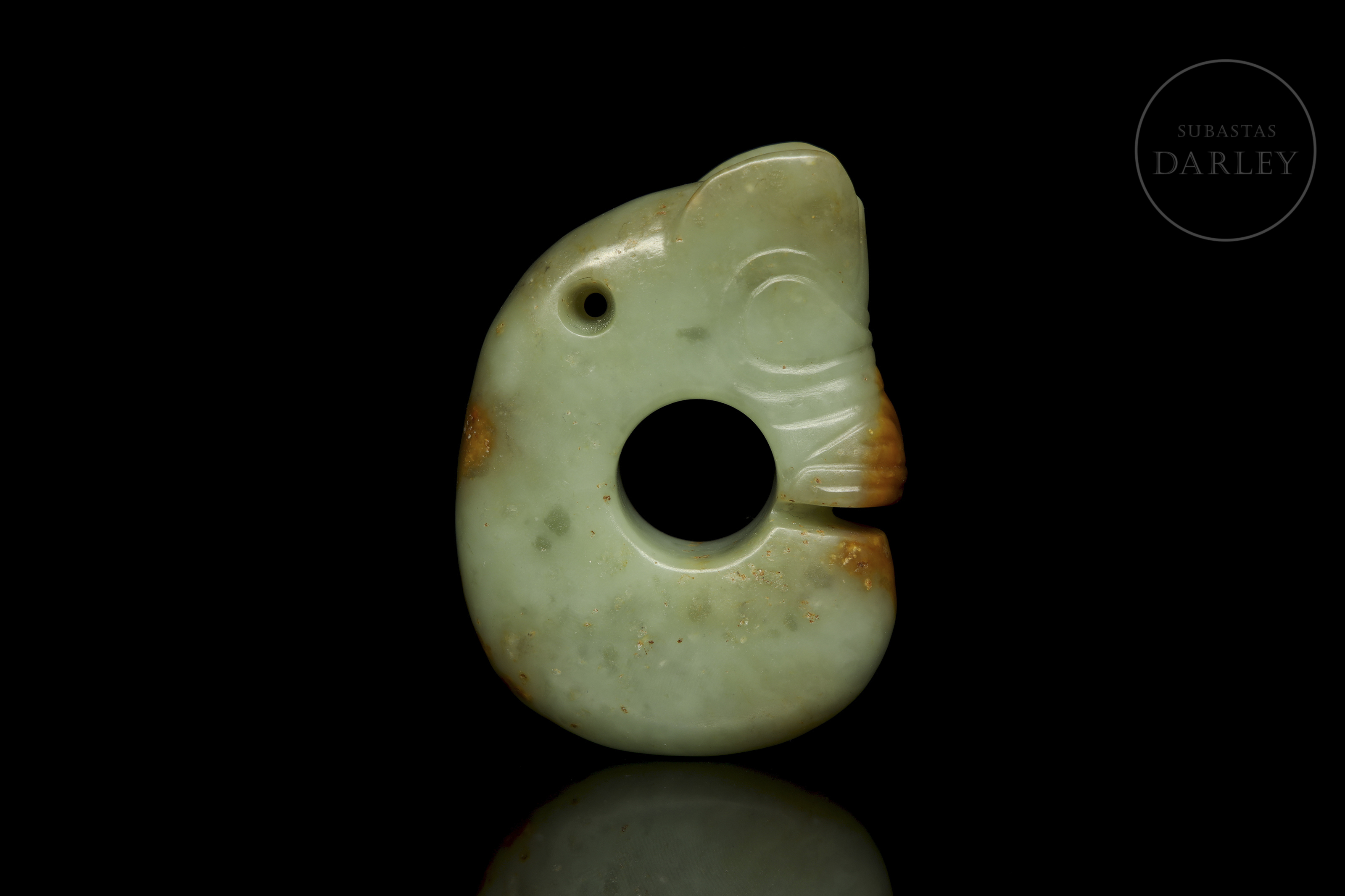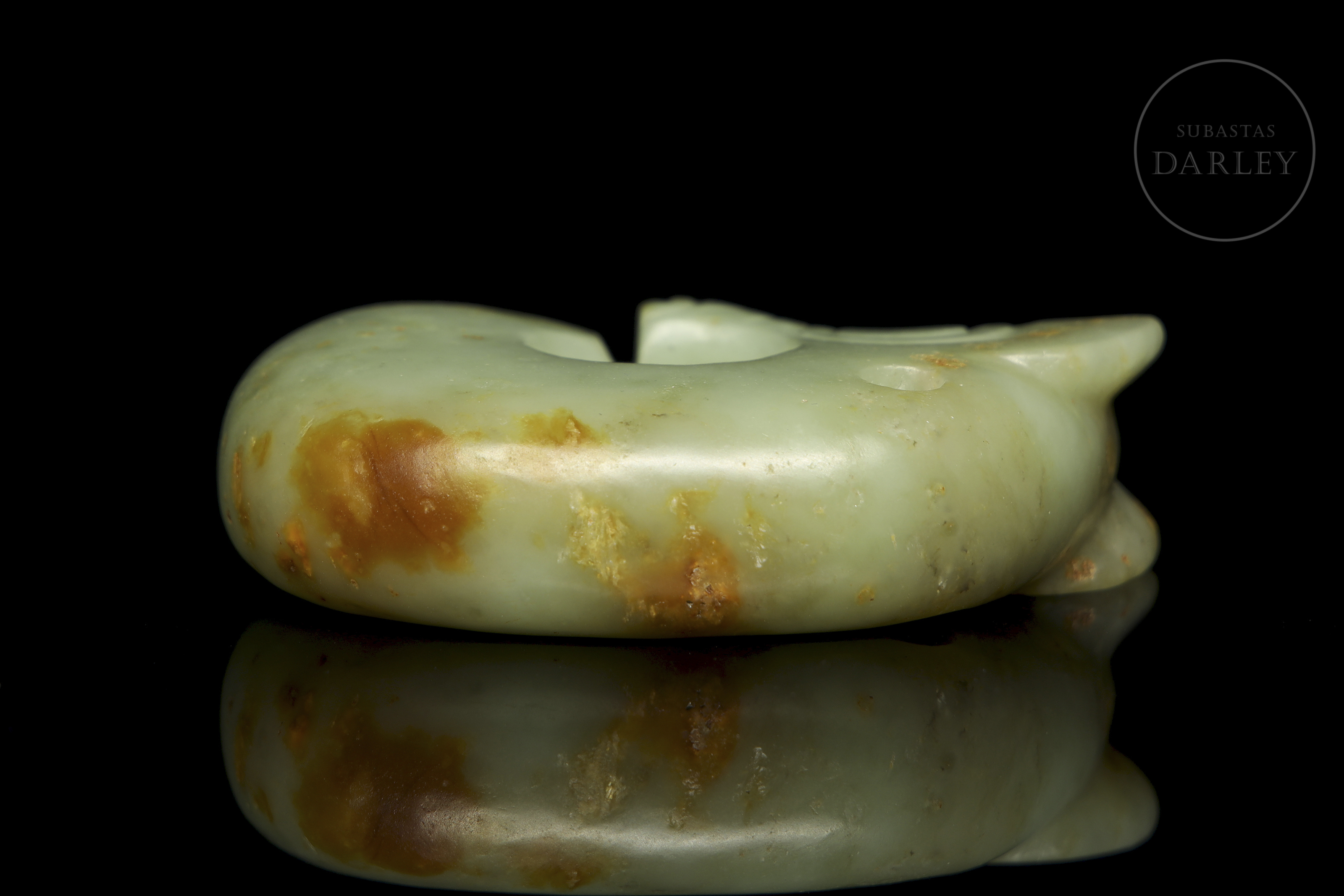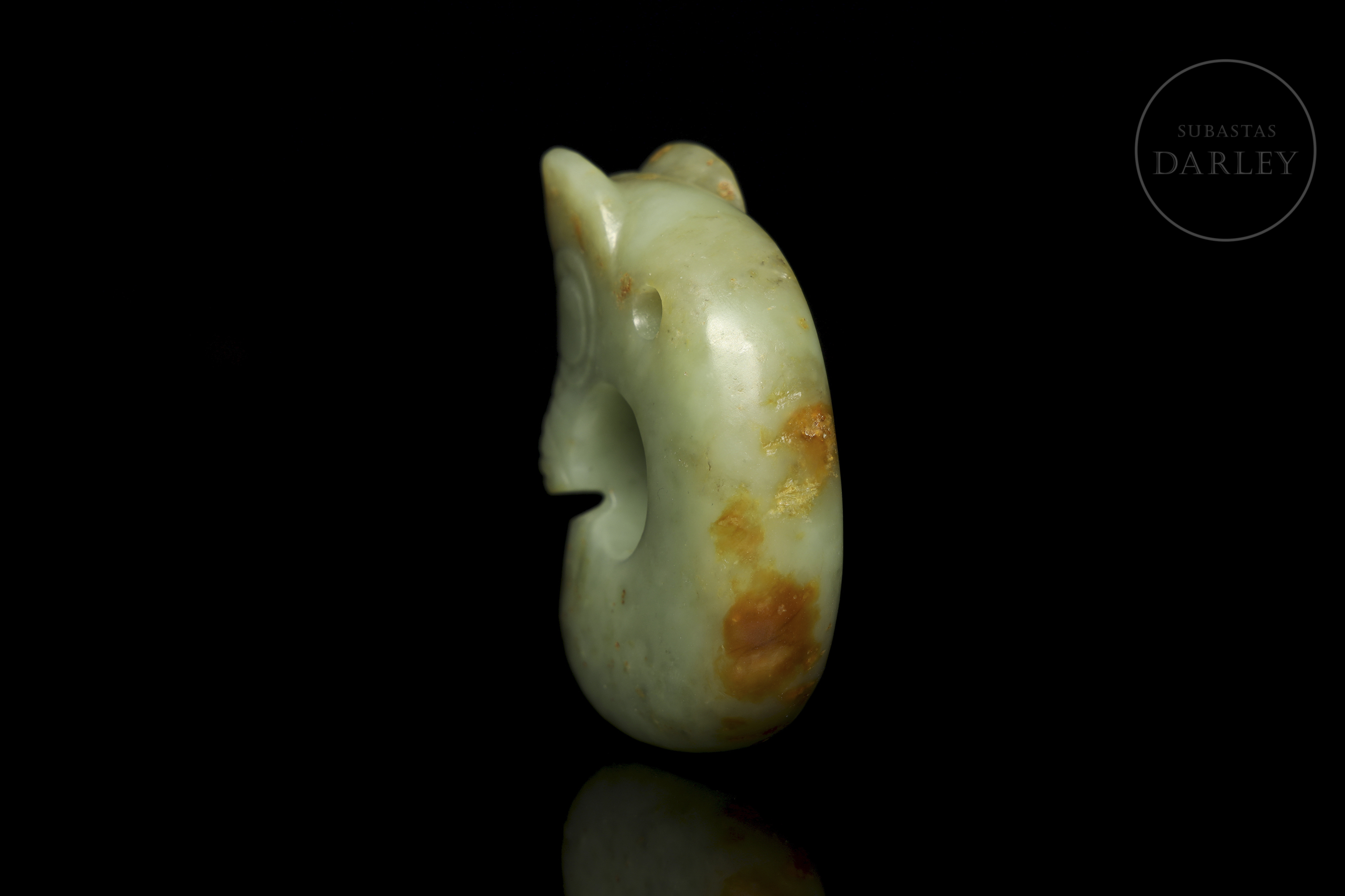 Pale green jade pendant with a natural reddish-brown patina, semicircular and featuring a dragon profile. The carving is concentrated at the ends to form the dragon's head and tail. The head is schematic, with perforated or low-relief carved eyes and a prominent snout, following the archaic style. Hongshan culture (c. 4700–2900 BC).