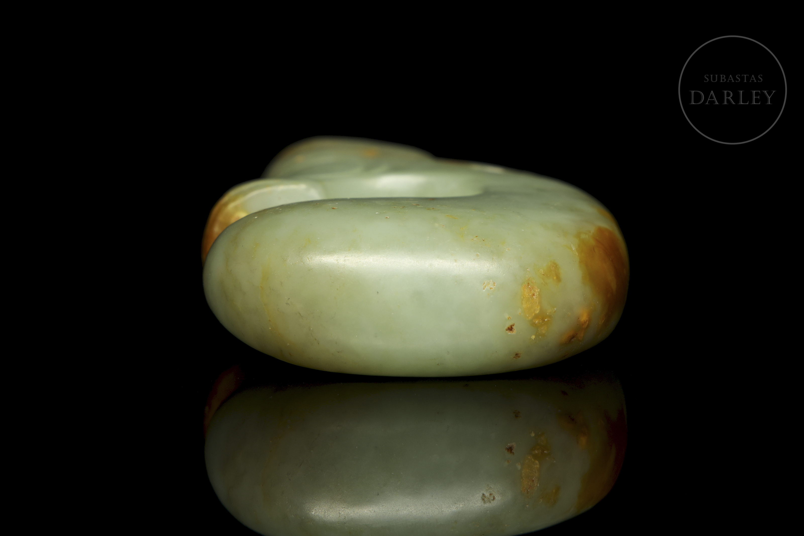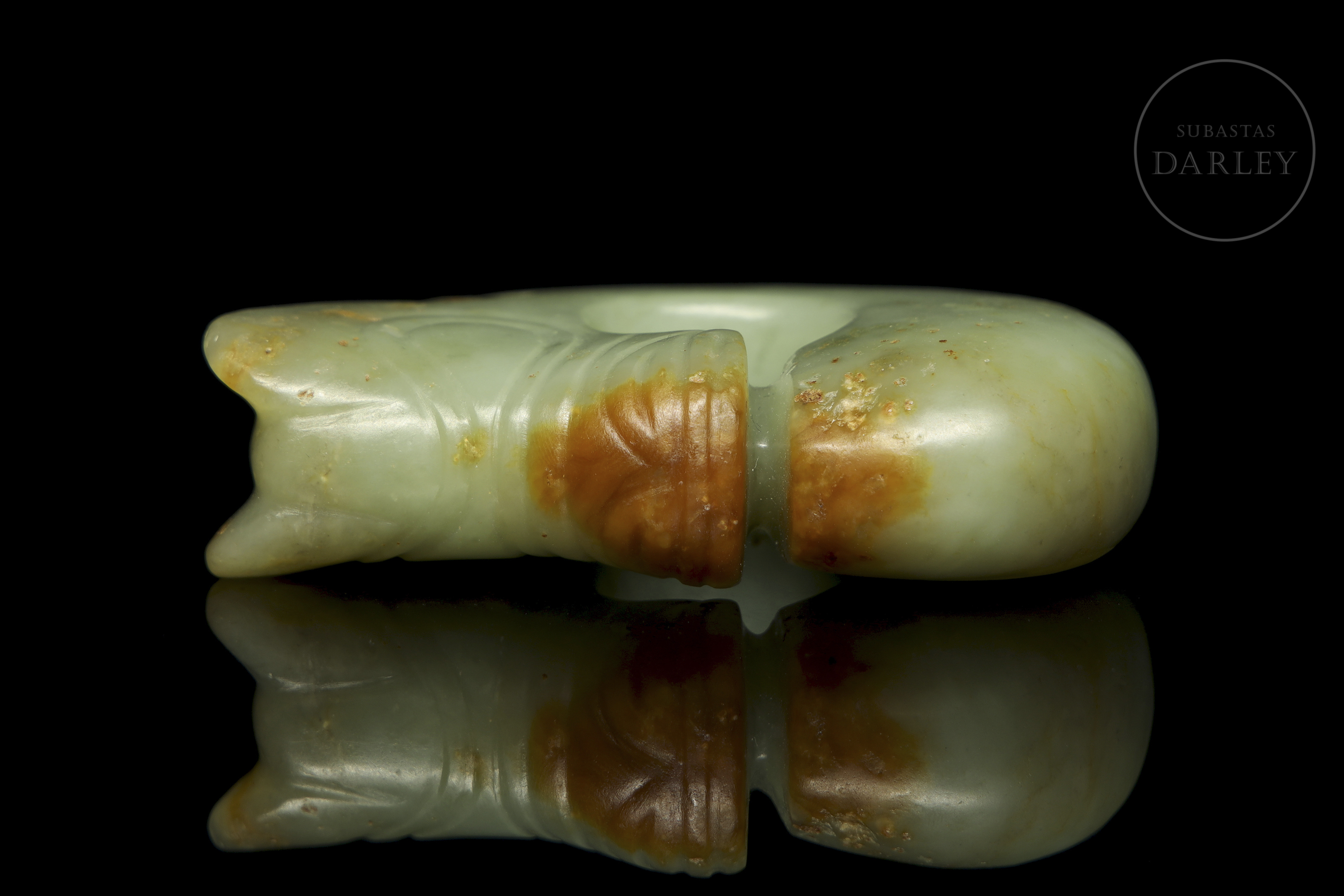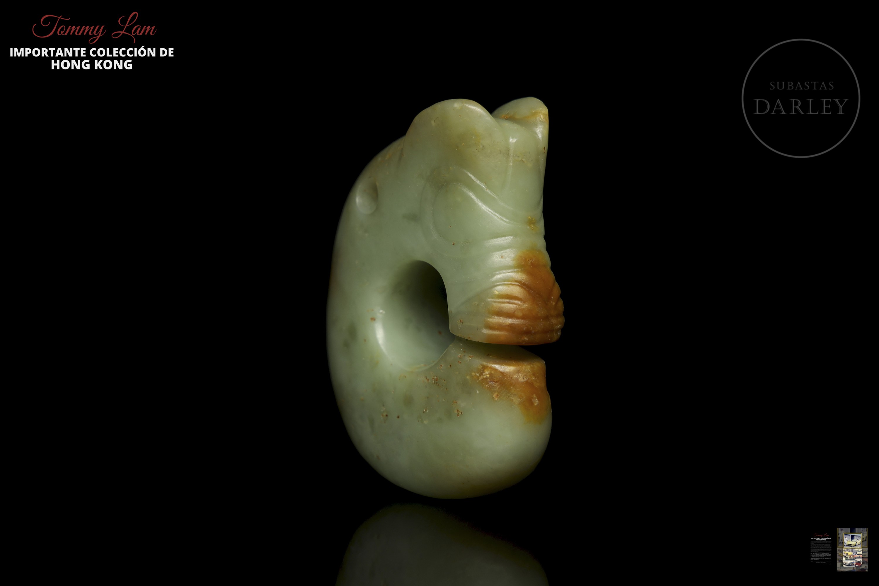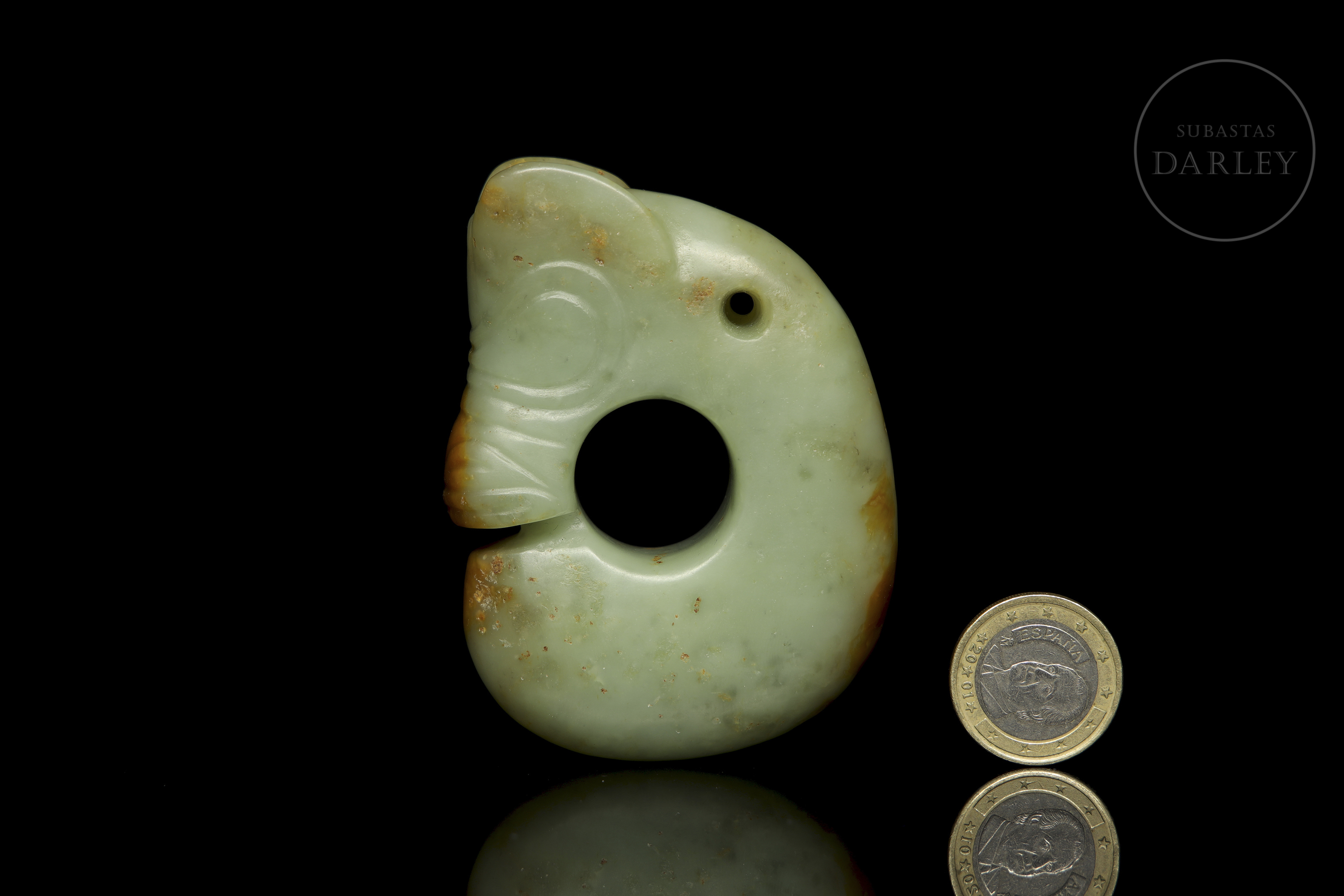 Pale green jade pendant with a natural reddish-brown patina, semicircular and featuring a dragon profile. The carving is concentrated at the ends to form the dragon's head and tail. The head is schematic, with perforated or low-relief carved eyes and a prominent snout, following the archaic style. Hongshan culture (c. 4700–2900 BC).
