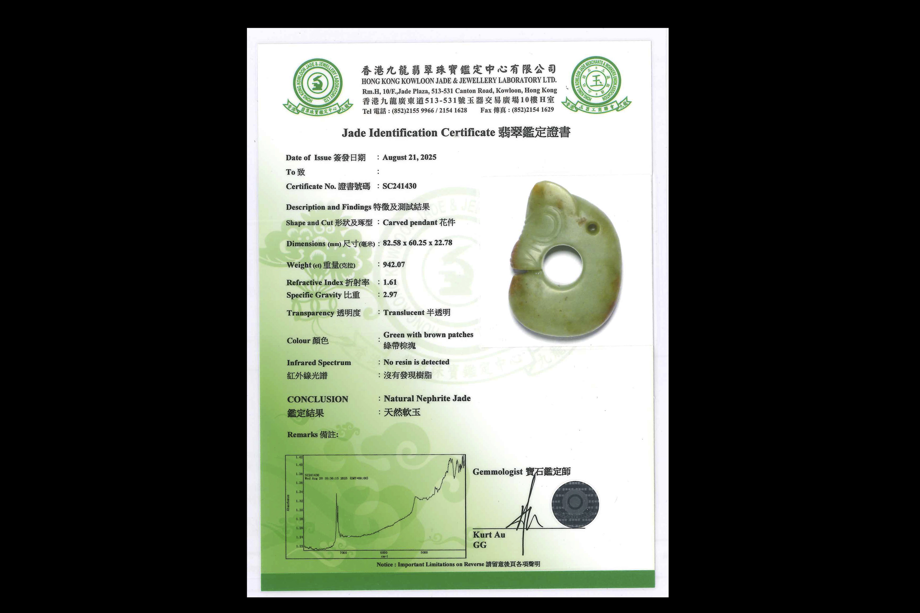 The piece is accompanied by a gemological certificate issued by Hong Kong Kowloon Jade & Jewellery Laboratory LTD in 2025. SC241430.