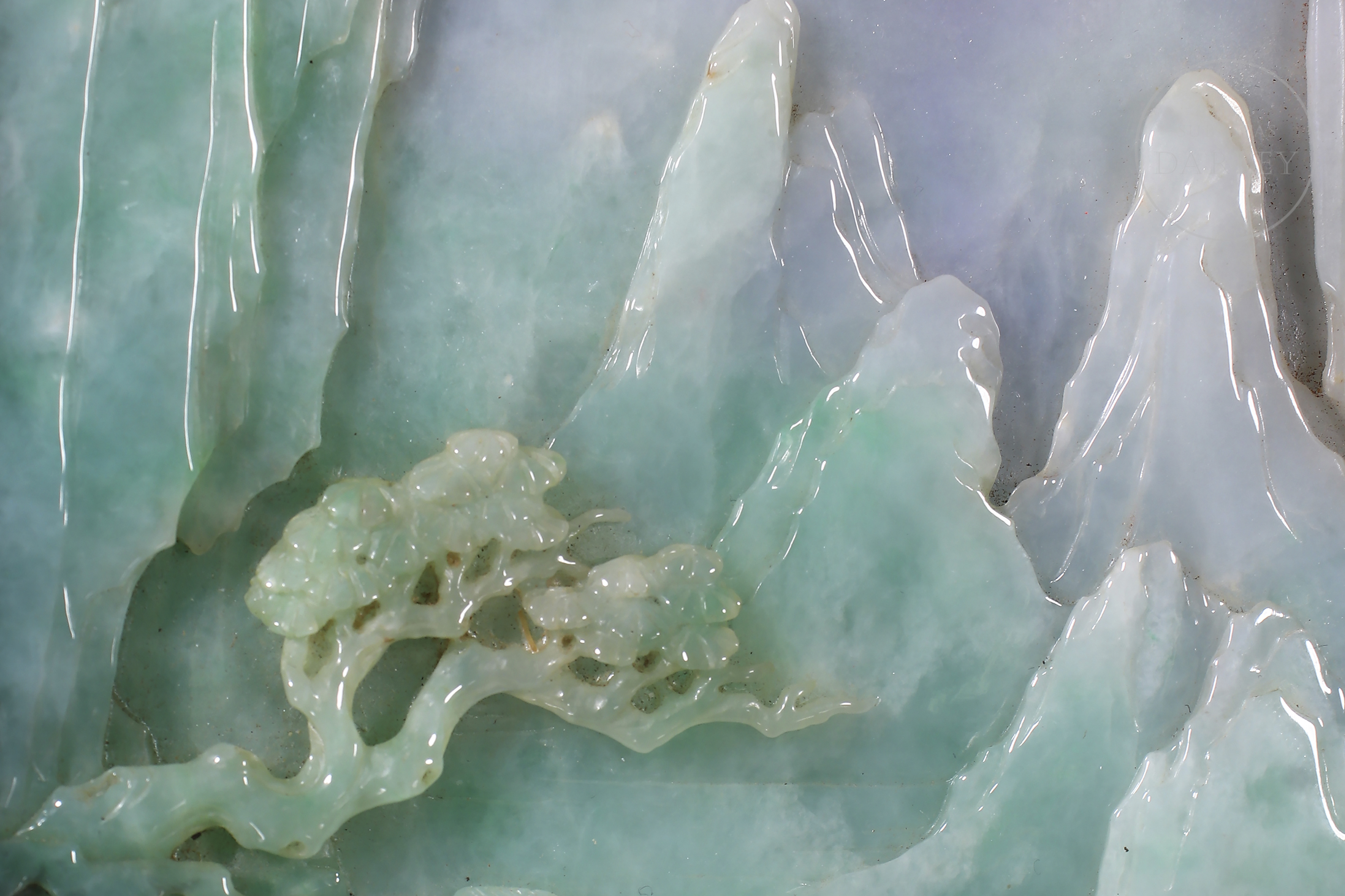 Carved jadeite panel, rectangular and flat in shape, framed in a carved wooden support (possibly zitan) with a geometric pattern design. The colour of the jadeite is exceptionally varied, with a milky white base that transitions to intense shades of sea green and pale celadon, using the superior white colour and a lavender inclusion to simulate the sky and sun. The decoration is carved in low and medium relief, depicting a deep mountainous landscape with rugged peaks, leafy trees, and two scholars at the bottom. Qing dynasty (1644–1912).