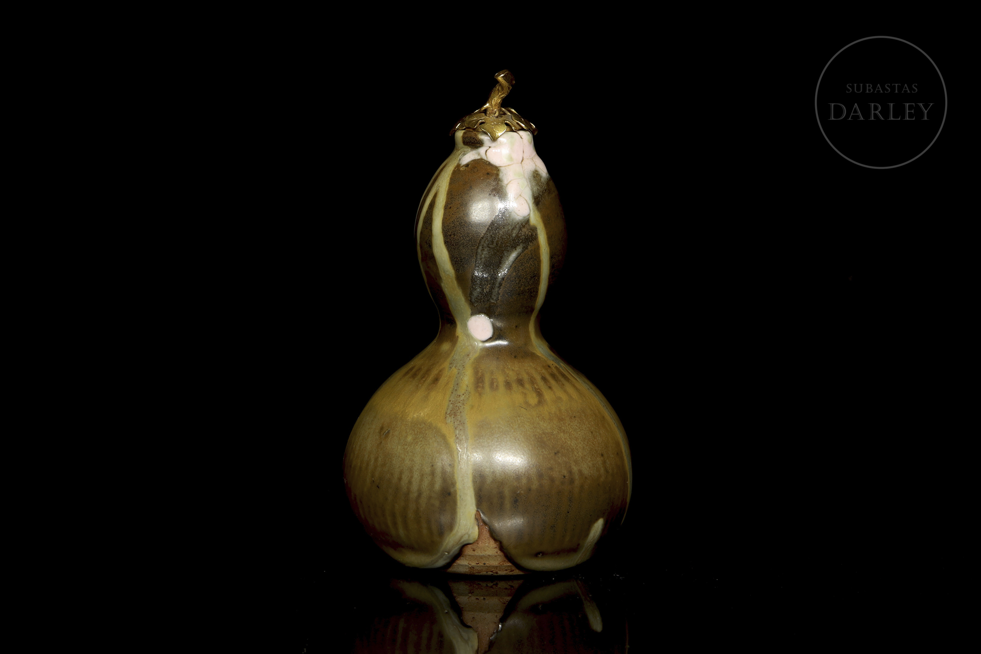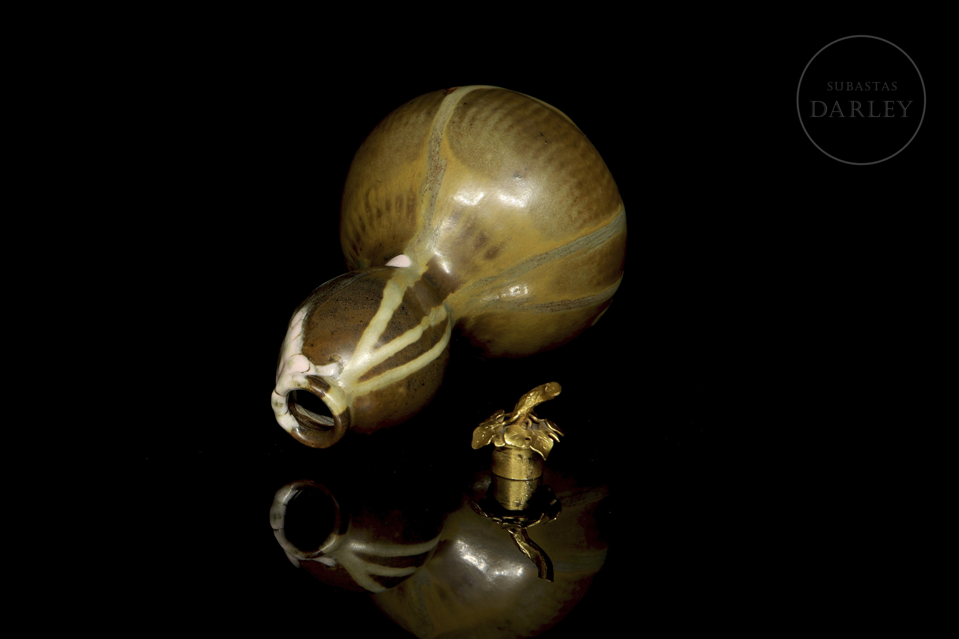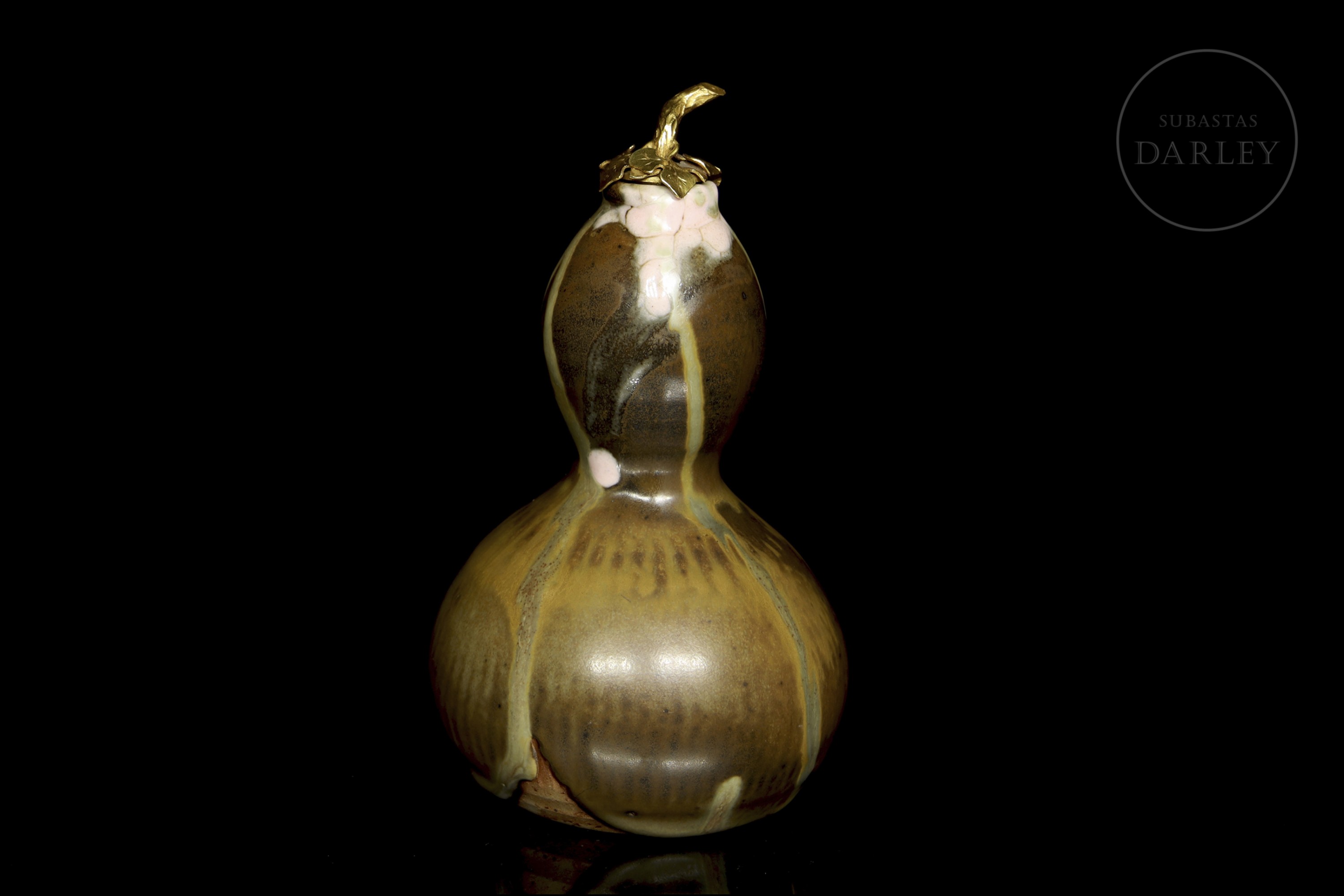 Glazed stoneware with gold metal stopper. Container, modelled in the organic shape of a double-bulb pumpkin. Covered with a high-temperature glaze, characteristic of the artist. The mouth is topped with a small gold metal stopper, simulating a leaf with its stem. Signed and numbered ‘26’ on the base.