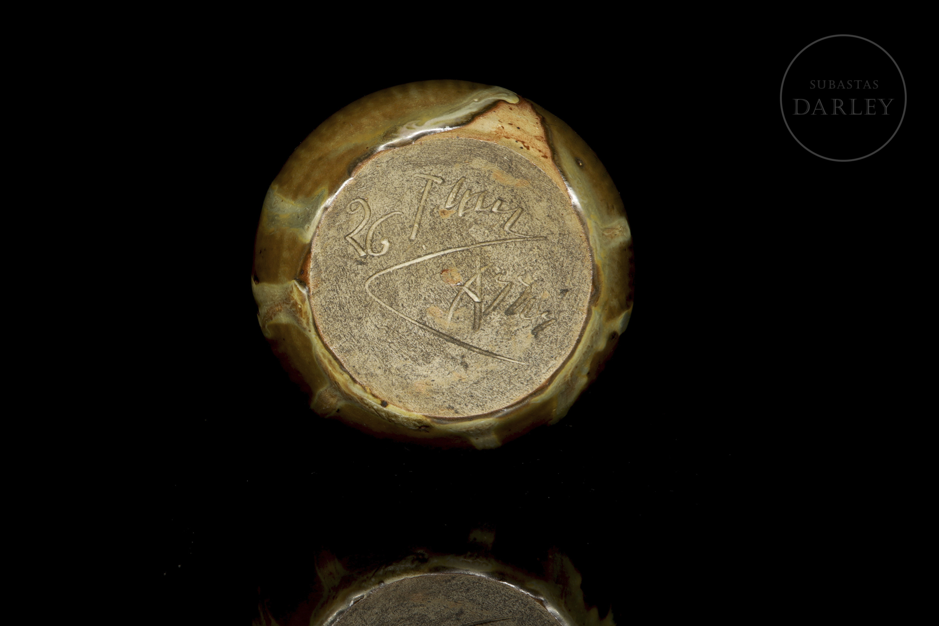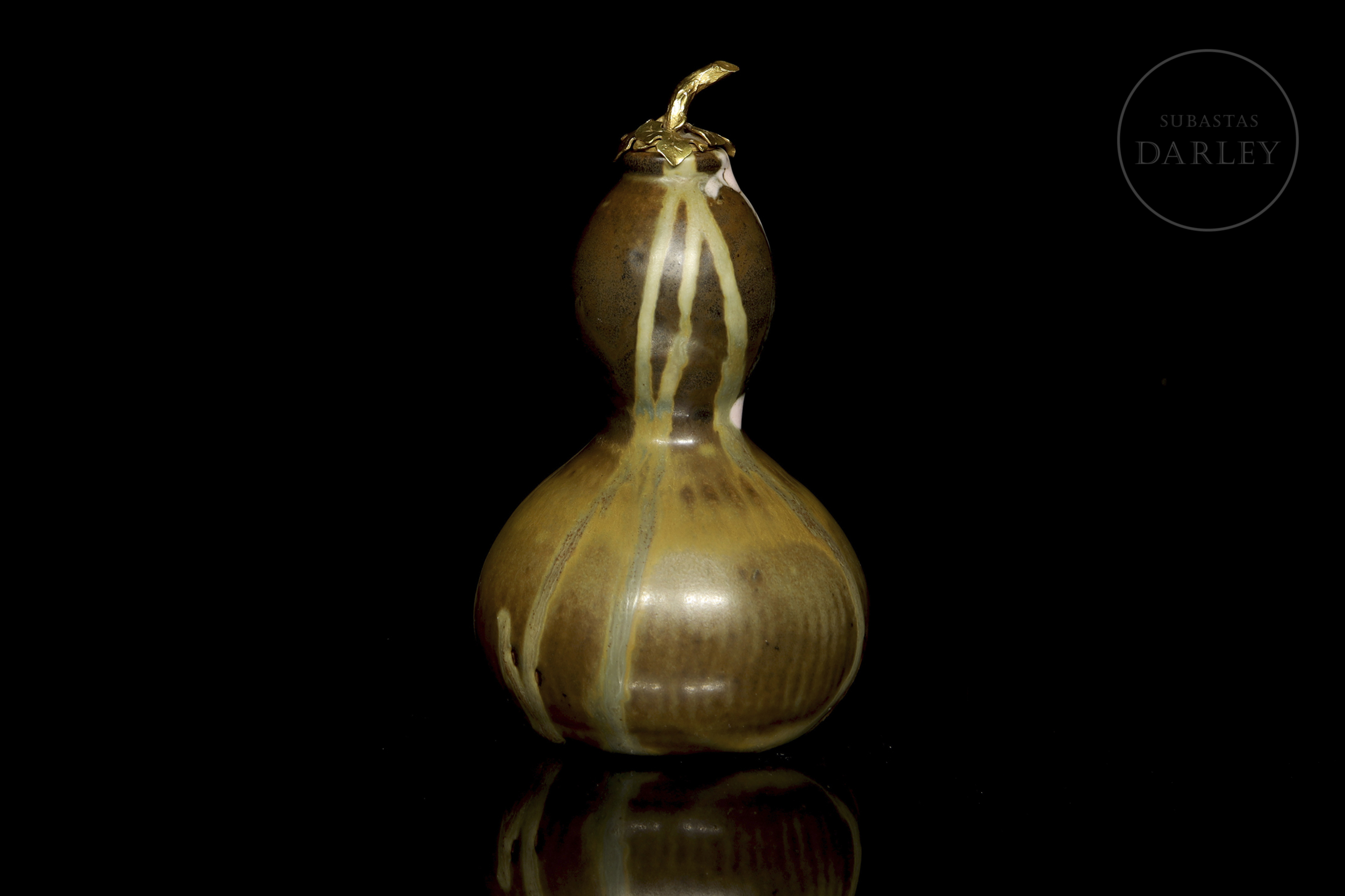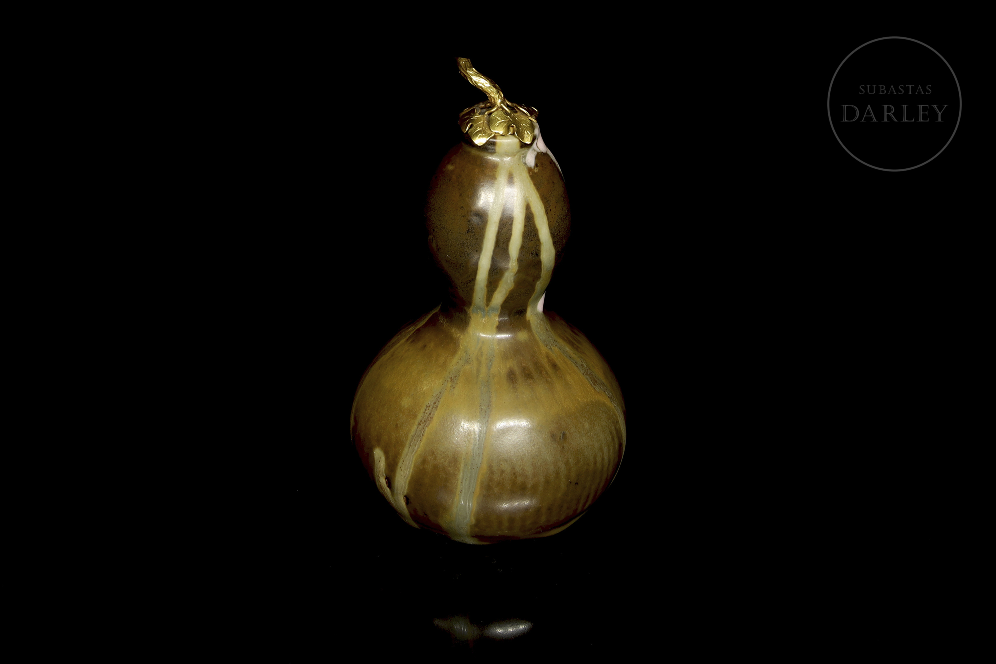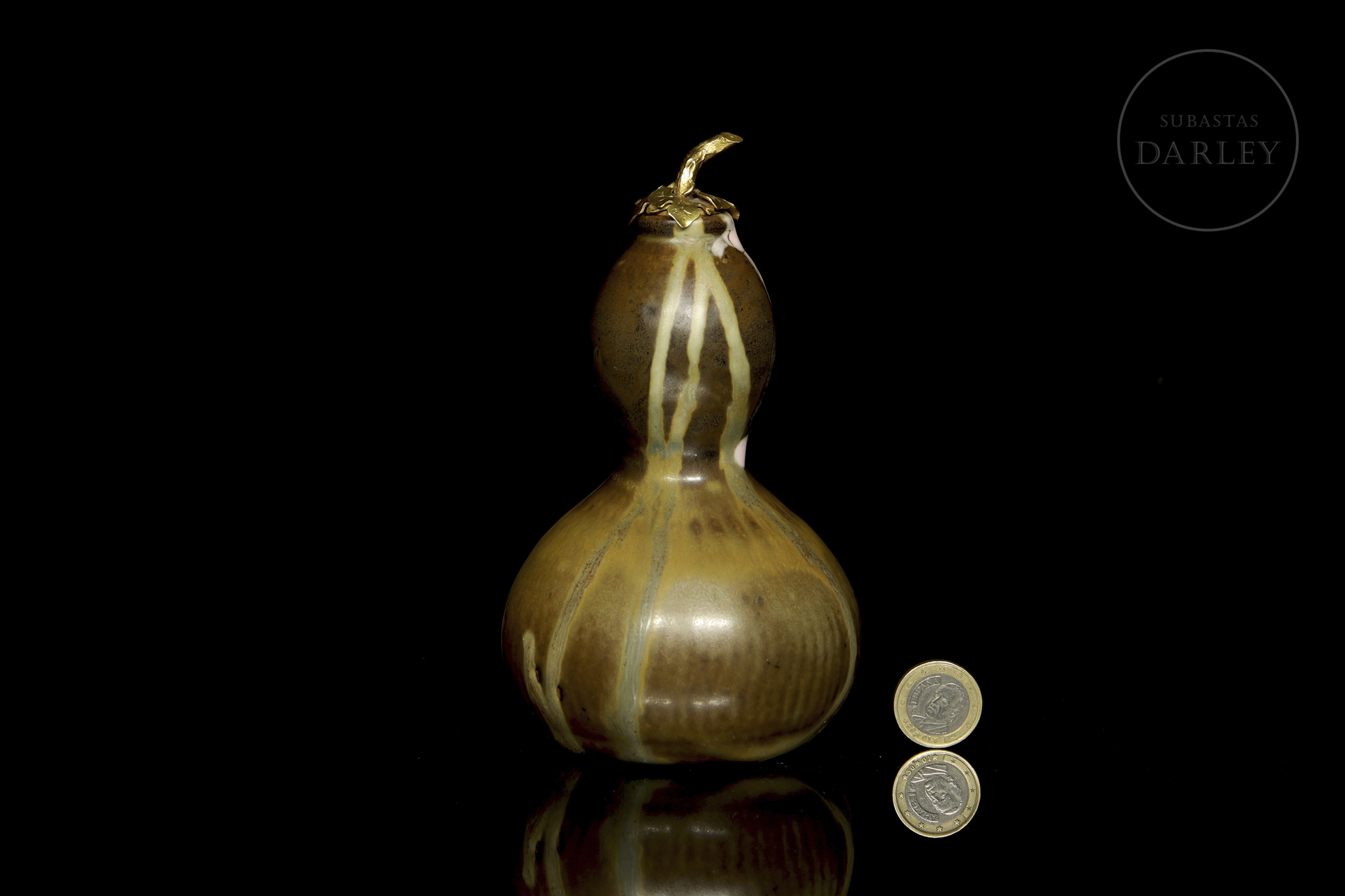 Glazed stoneware with gold metal stopper. Container, modelled in the organic shape of a double-bulb pumpkin. Covered with a high-temperature glaze, characteristic of the artist. The mouth is topped with a small gold metal stopper, simulating a leaf with its stem. Signed and numbered ‘26’ on the base.