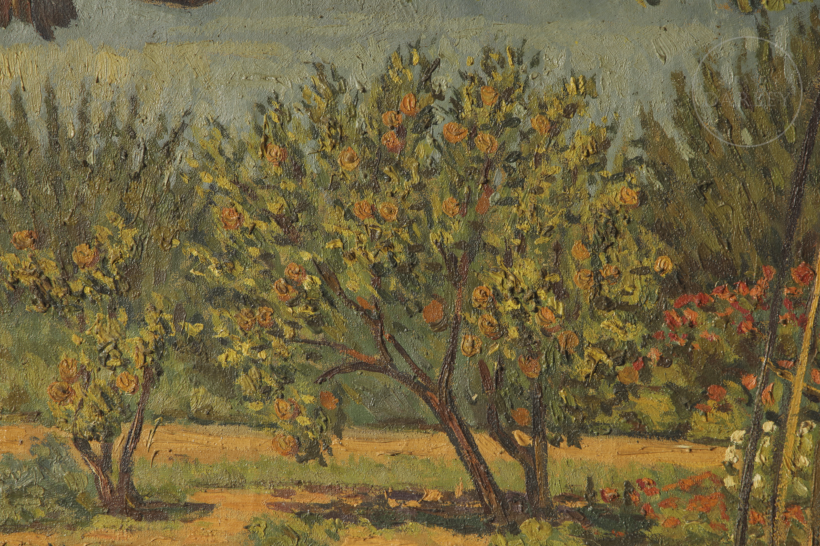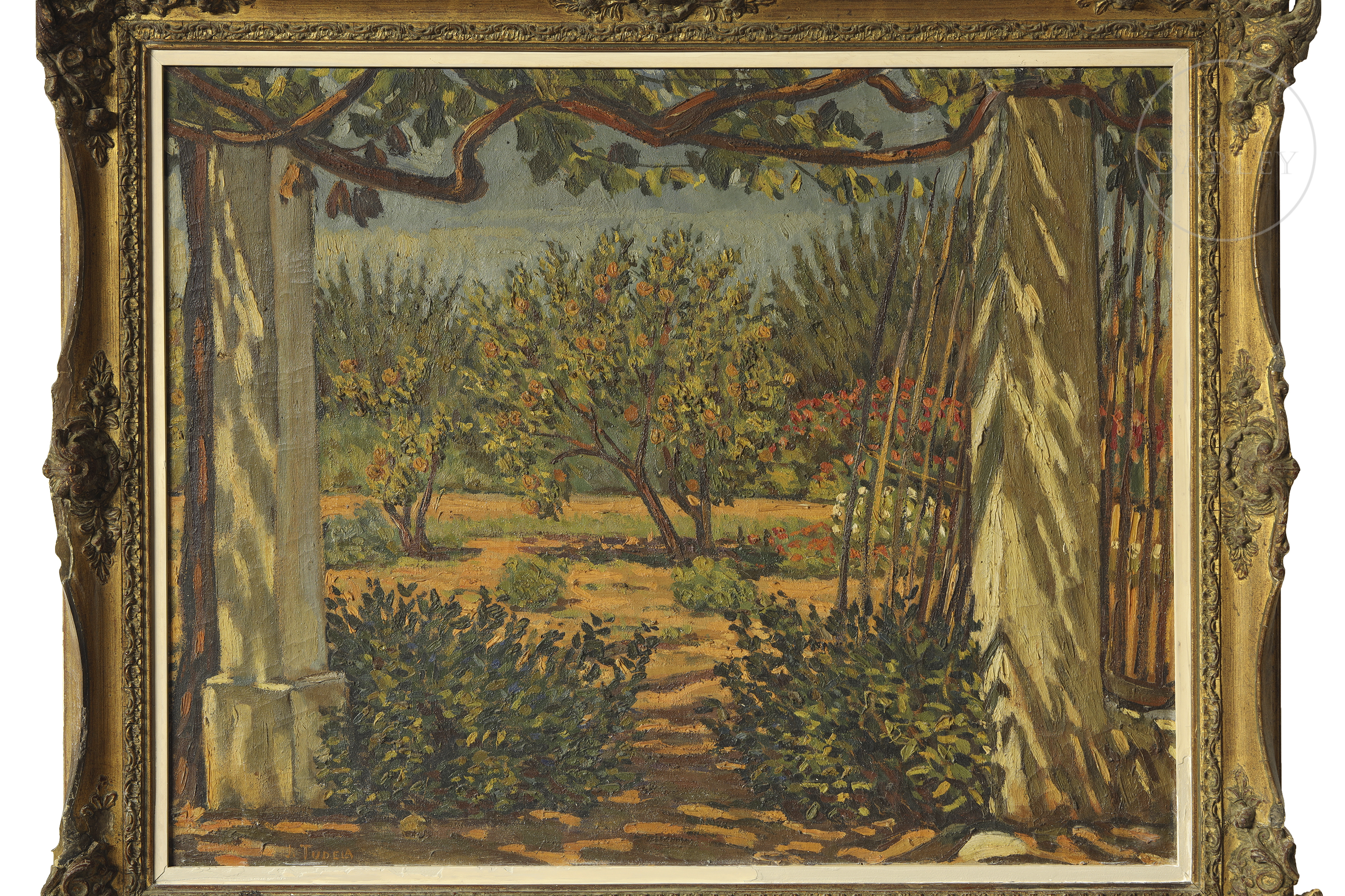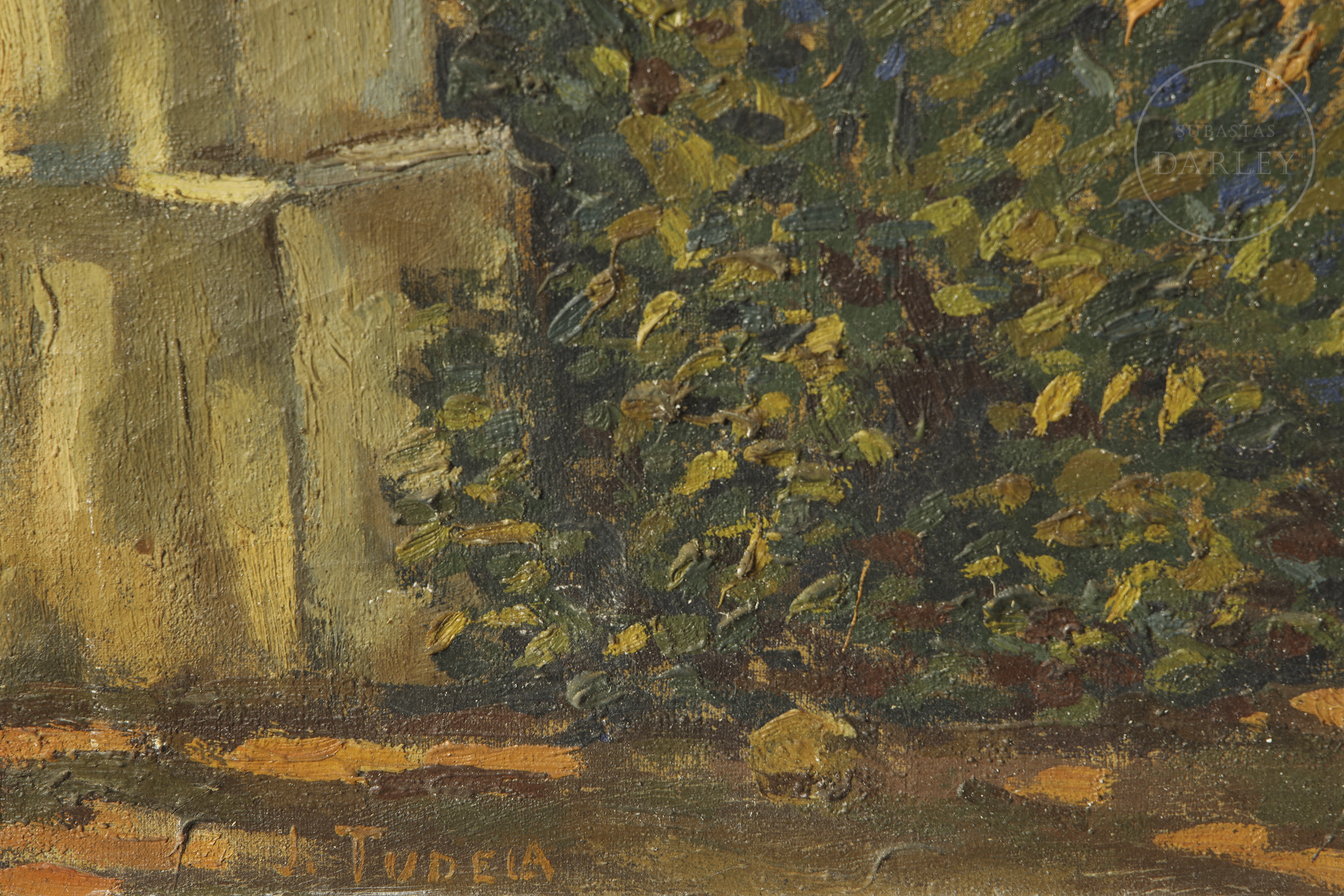 Oil on canvas. Garden landscape framed by the pillars of a porch with a vine at the top. Signed ‘J. Tudela’ in the lower left corner.