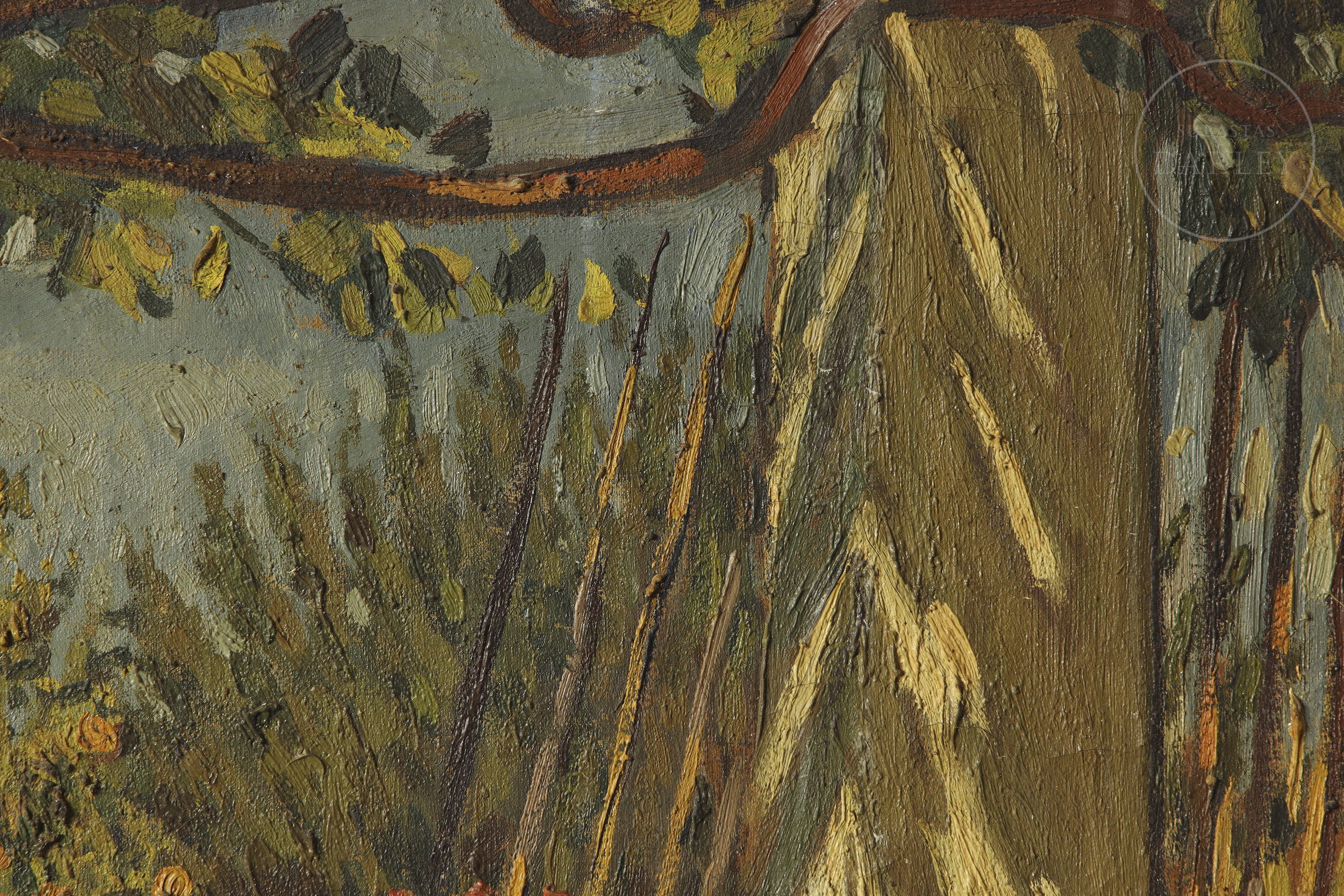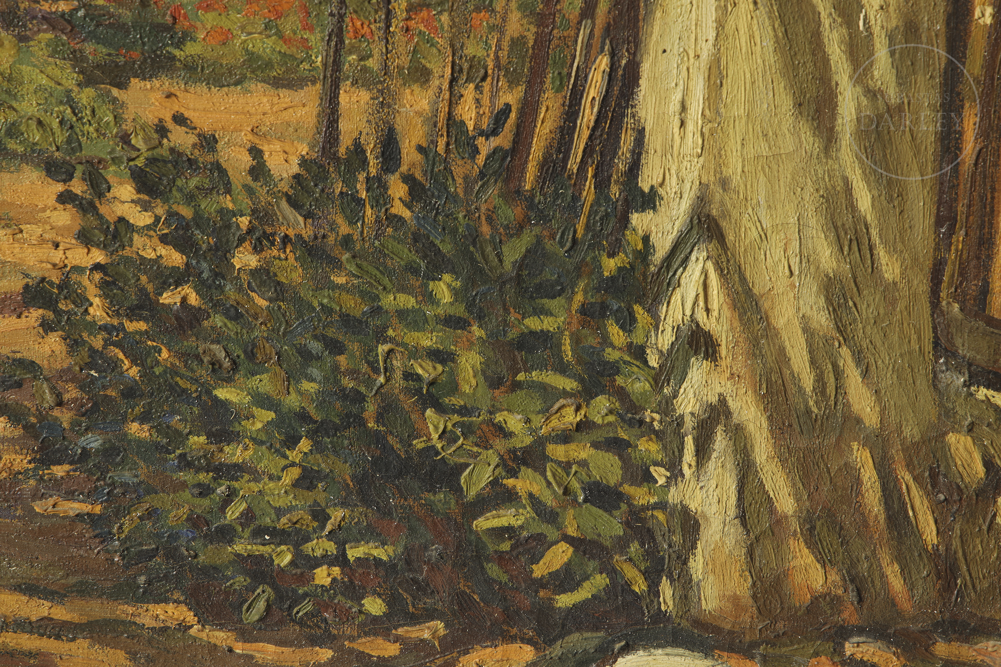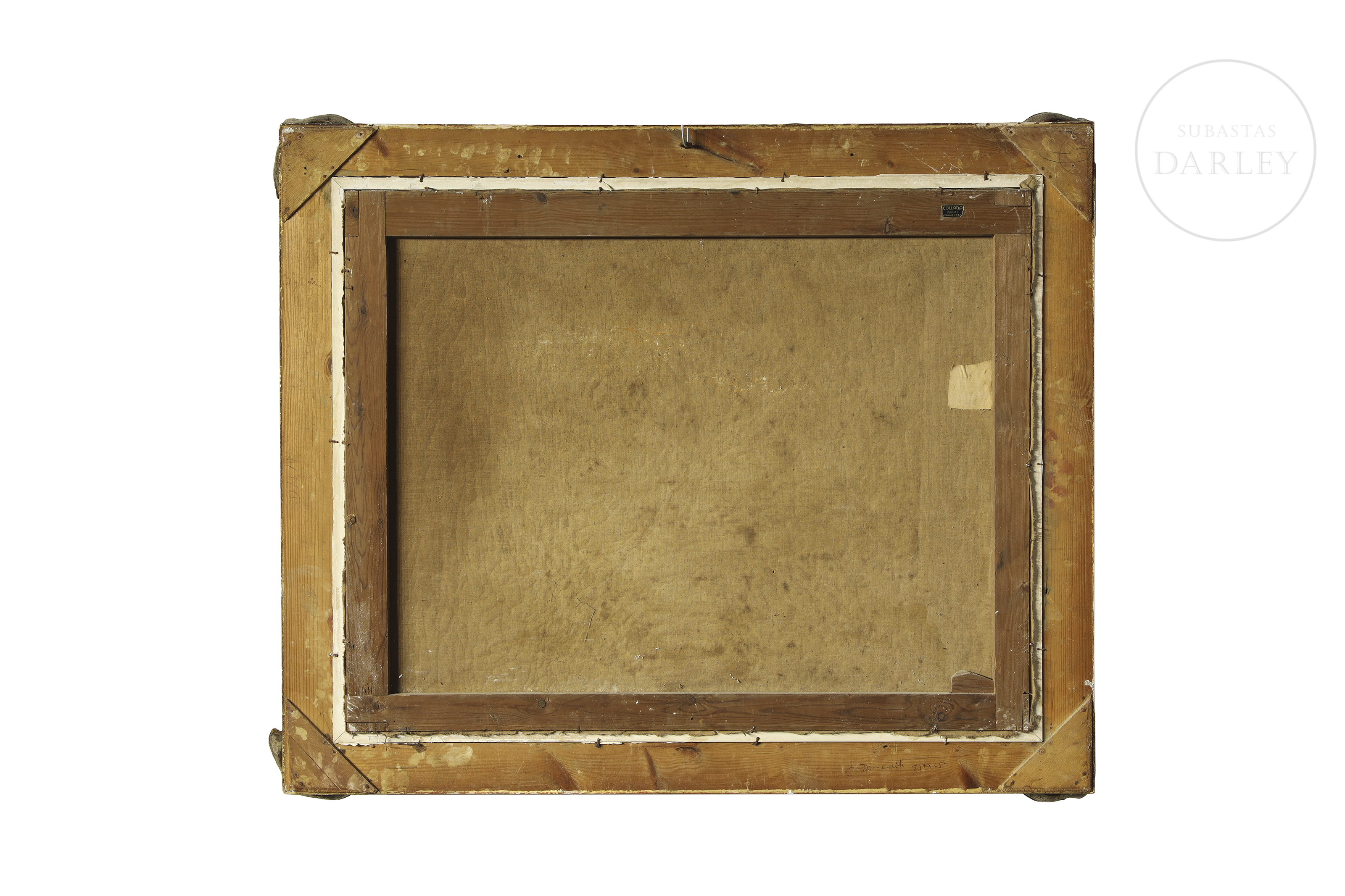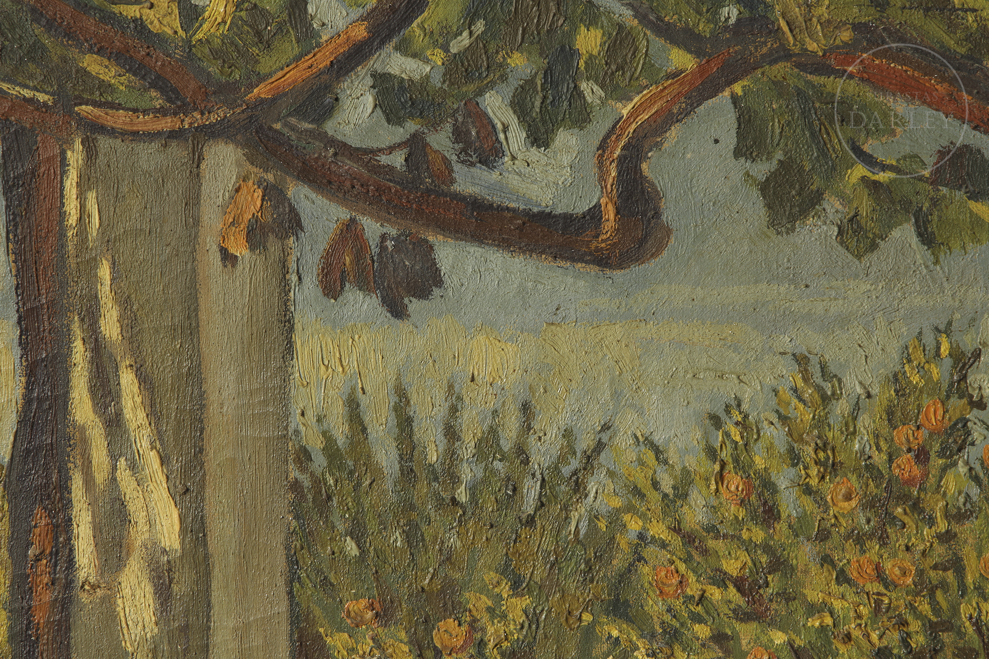 Oil on canvas. Garden landscape framed by the pillars of a porch with a vine at the top. Signed ‘J. Tudela’ in the lower left corner.