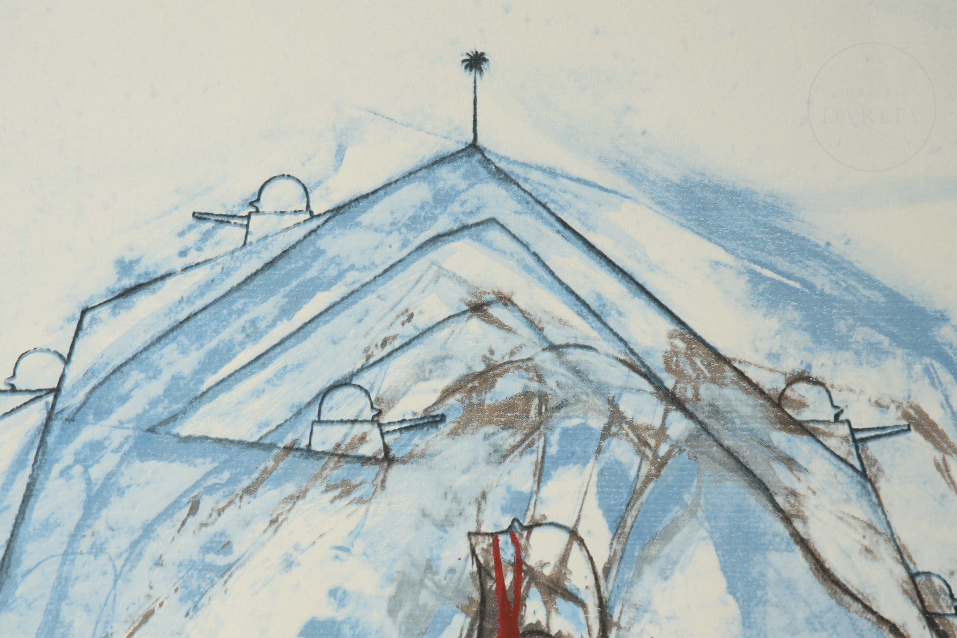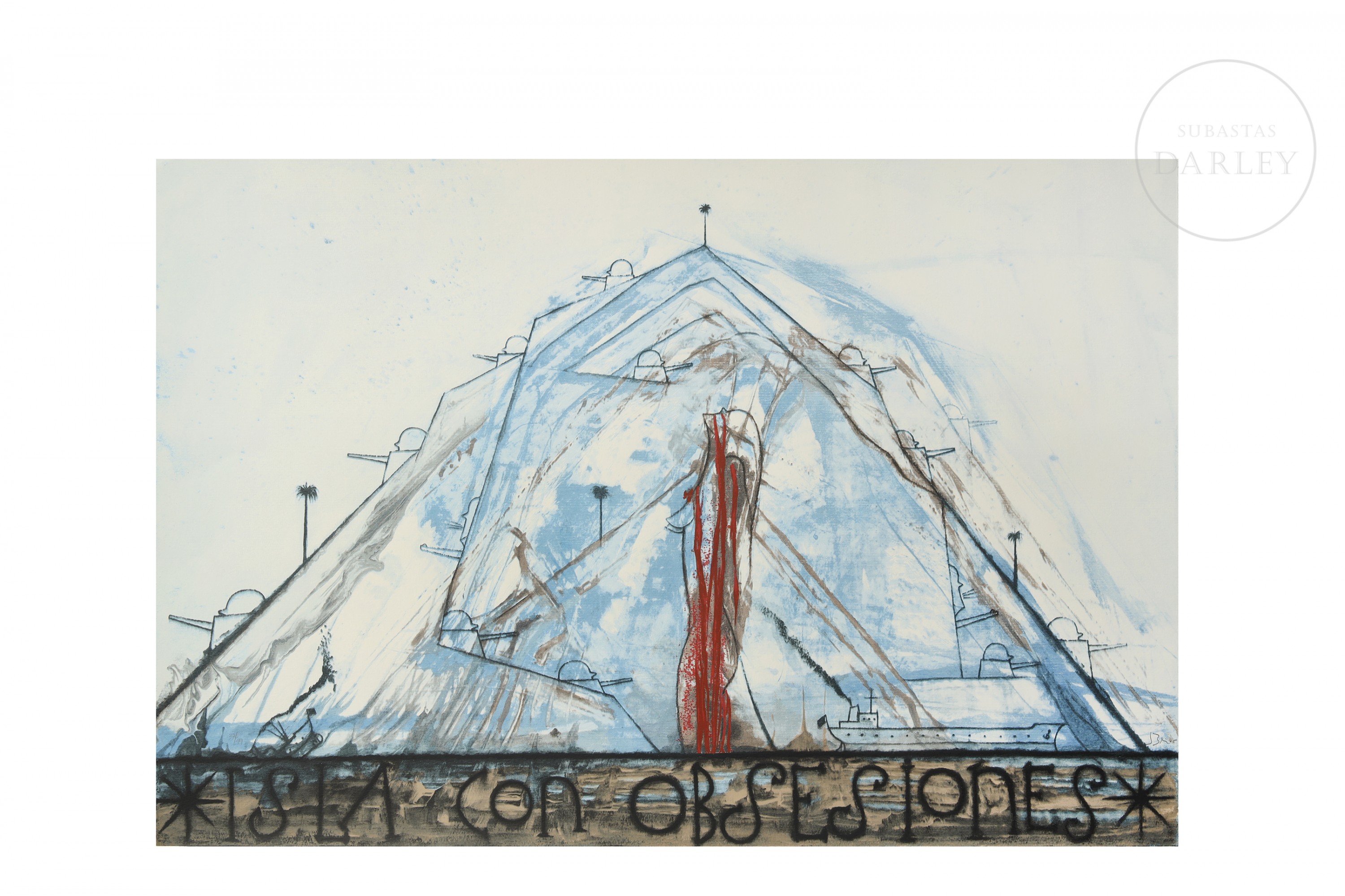 Mixed media on paper. Depiction of an island composed of multiple elements. Signed and dated “J. Bedia 05” in the lower right corner and numbered in pencil “37/99” in the lower left corner.