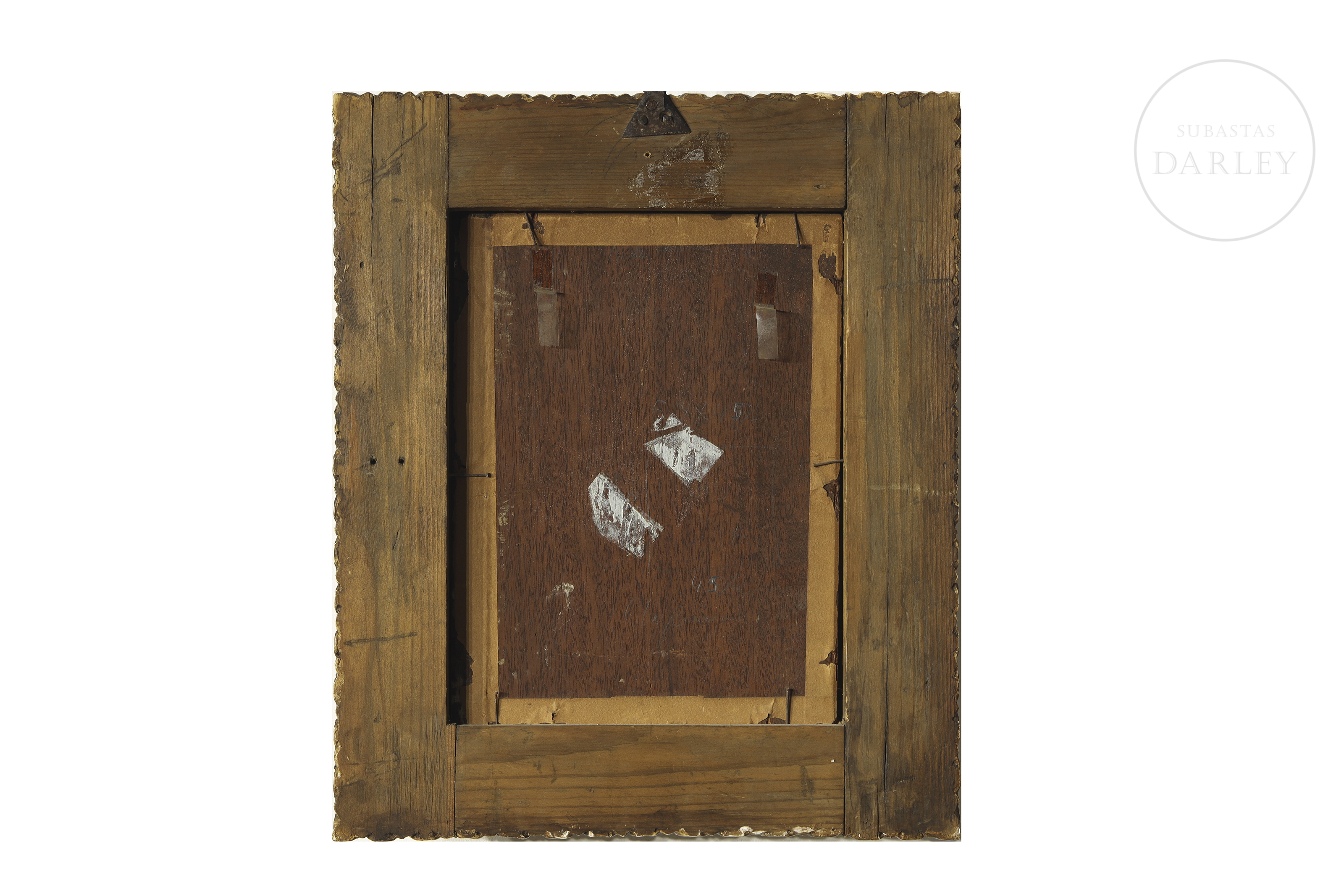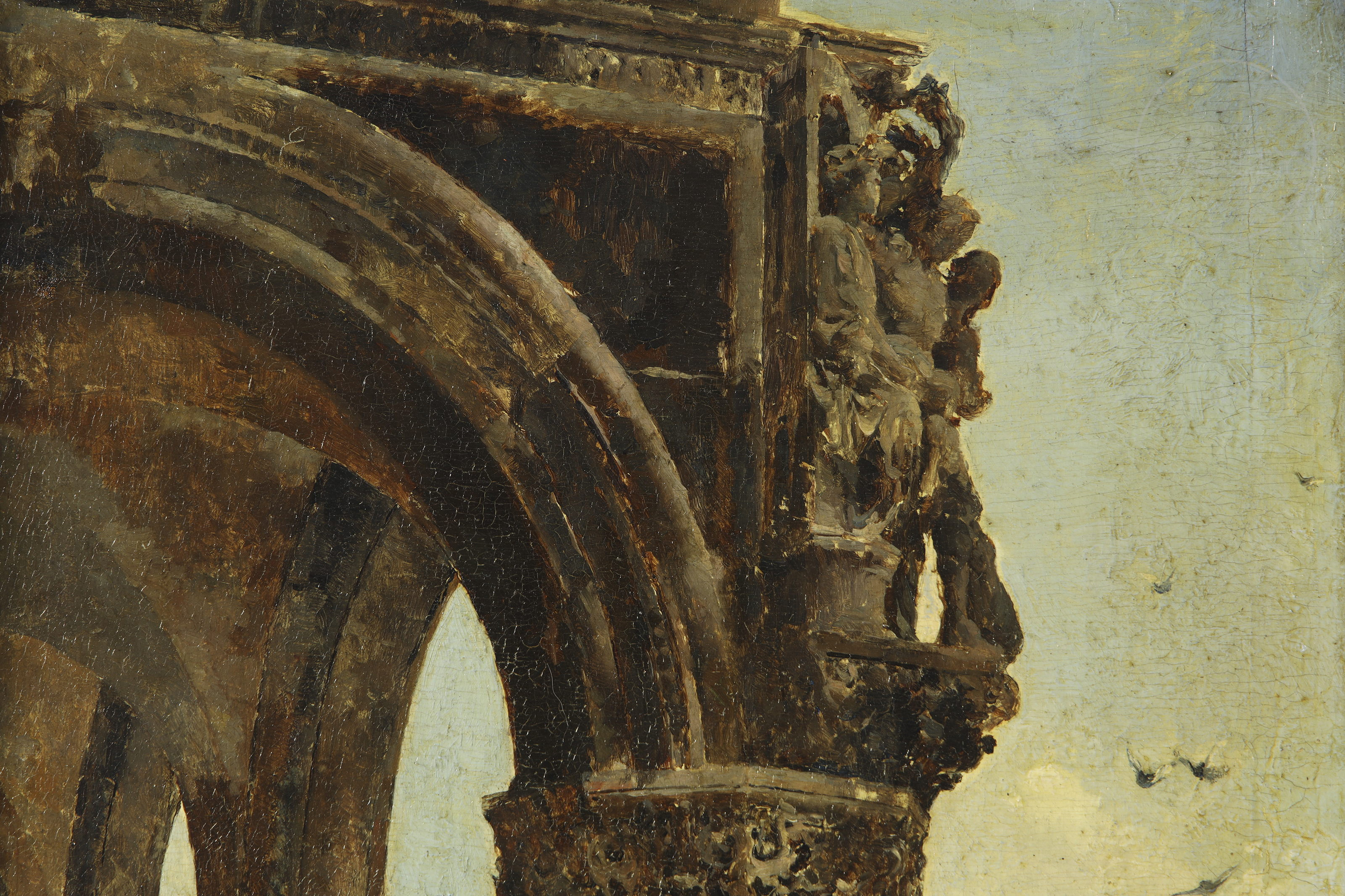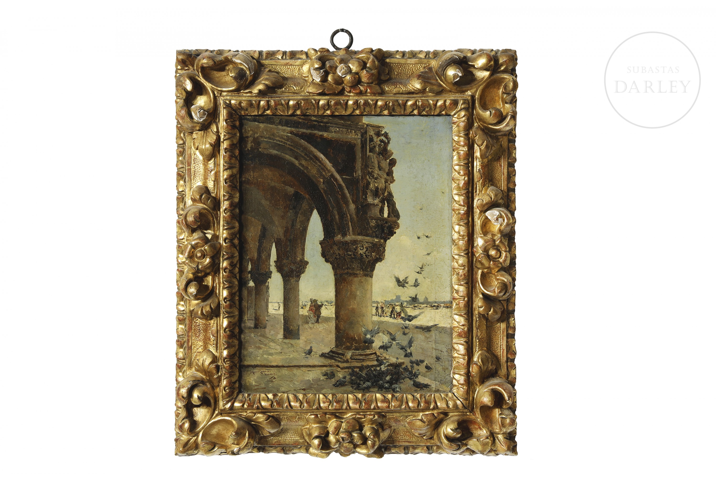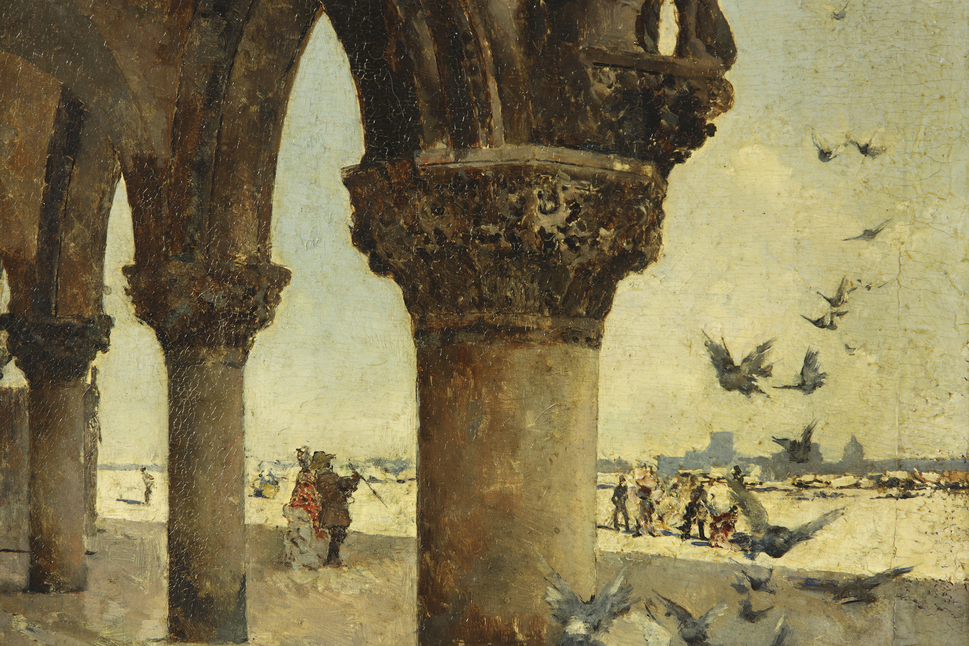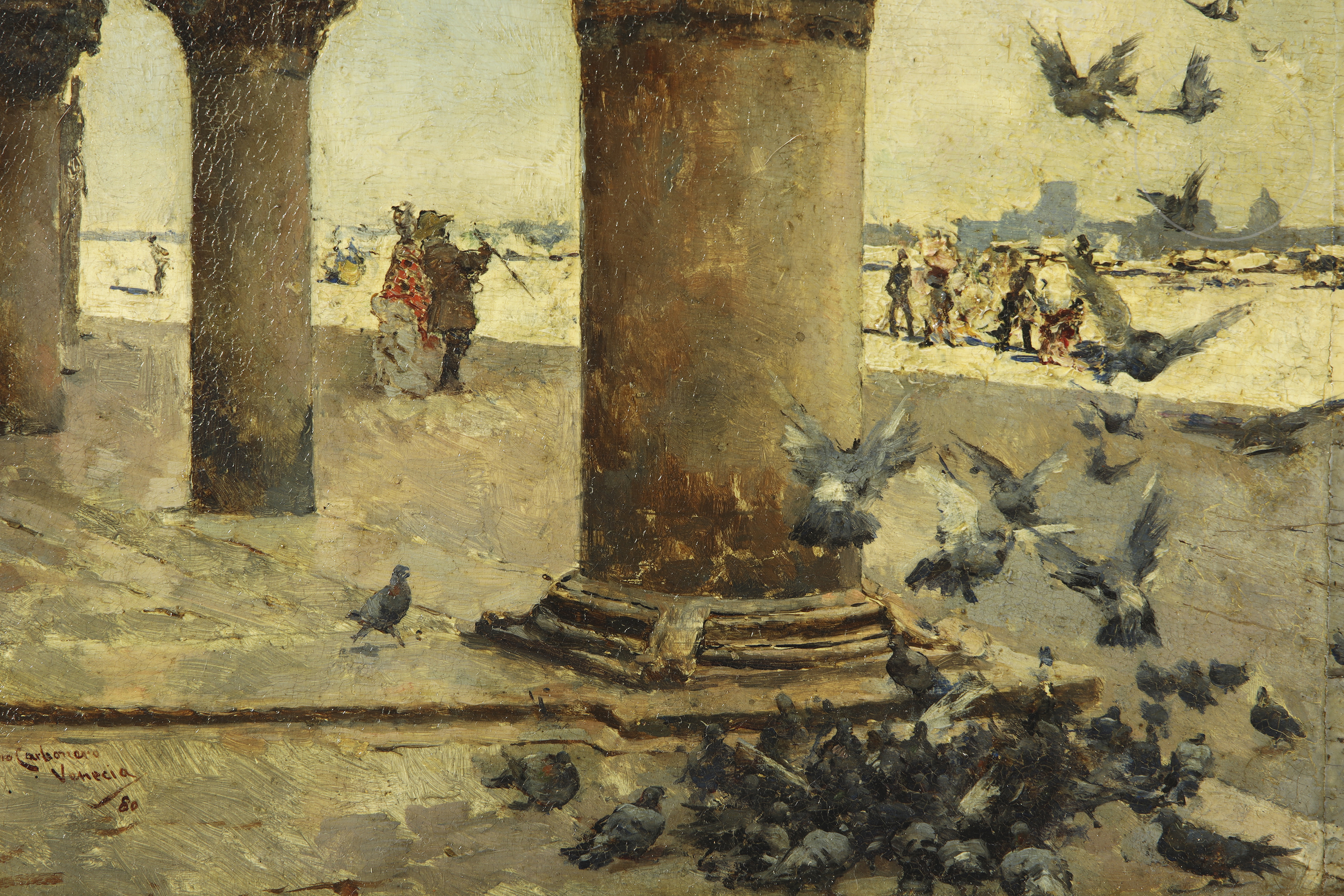 Oil on panel. Painting depicting a view through the arcades of the Doge's Palace in Venice. The foreground is occupied by columns and a group of pigeons, with human figures in the background. Signed, located and dated in the lower left corner: ‘J. Moreno Carbonero. Venice/80’.