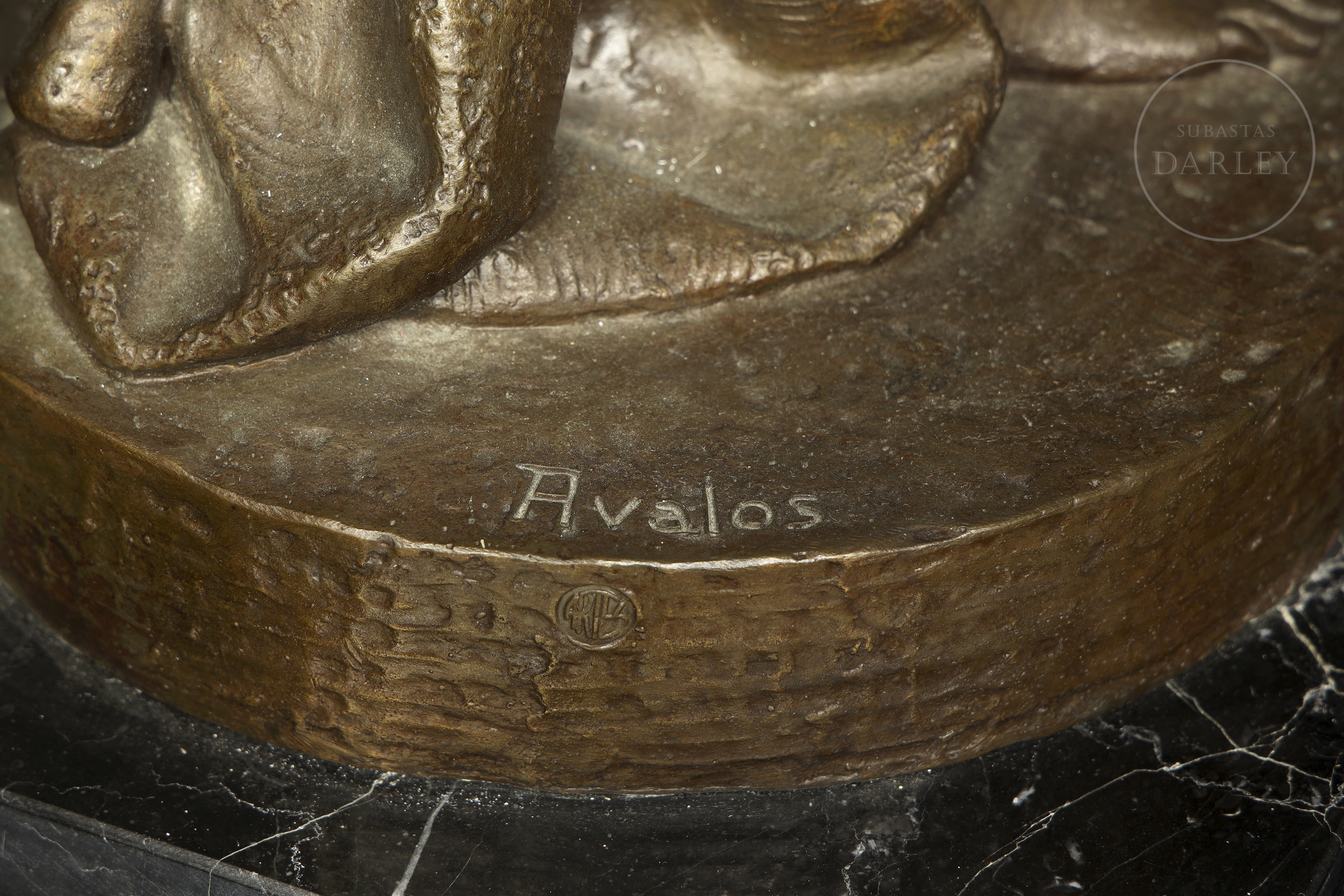 Bronze sculpture on a marble pedestal. Signed “Avalos” on the base of the figure. There is visible damage and restoration work on the base.