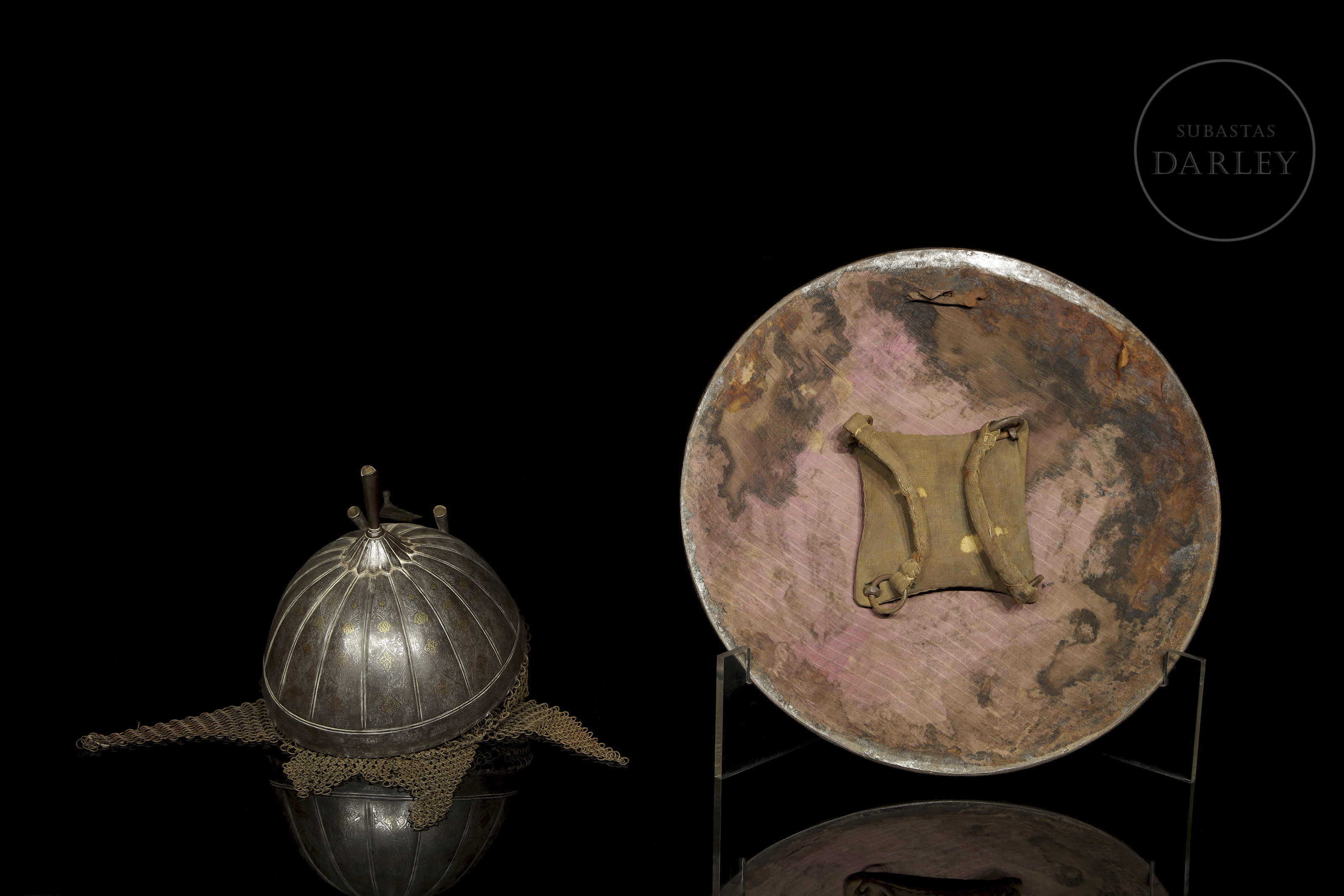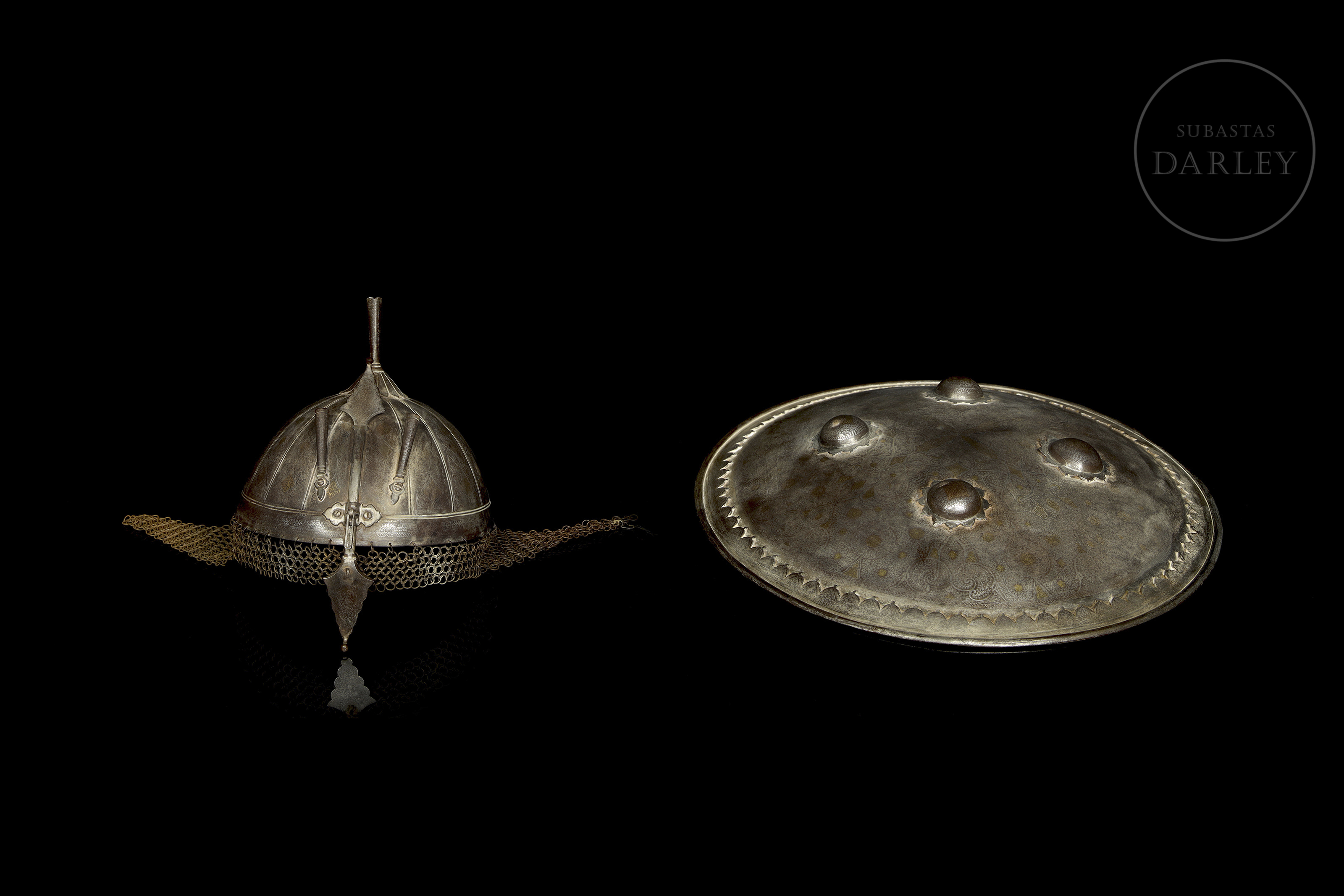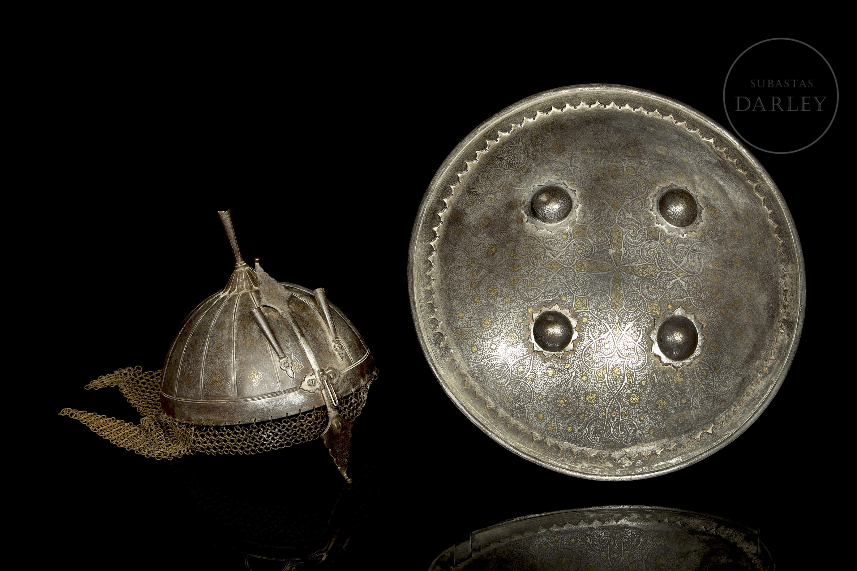 Classic battle set from the Indo-Persian region. Both are decorated with intricate arabesques made using the koftgari technique, possibly using a fine gold and silver inlay colloquially known as ‘Ganga Jamuna’. The khula-hud helmet has a support at the top for inserting feathers, generally used in military parades. The interior of the Sipar shield still retains traces of the padded fabric armour.