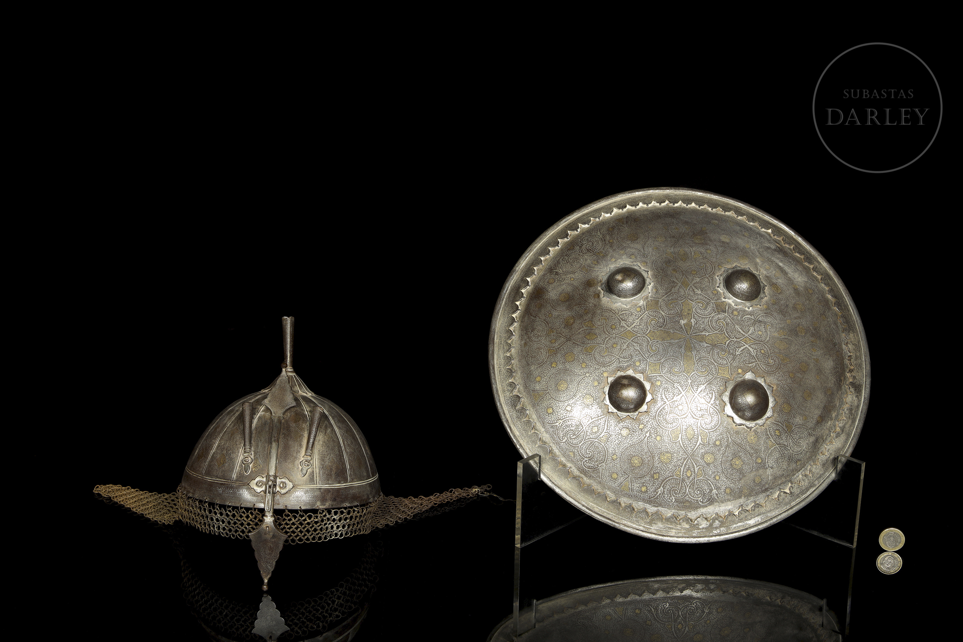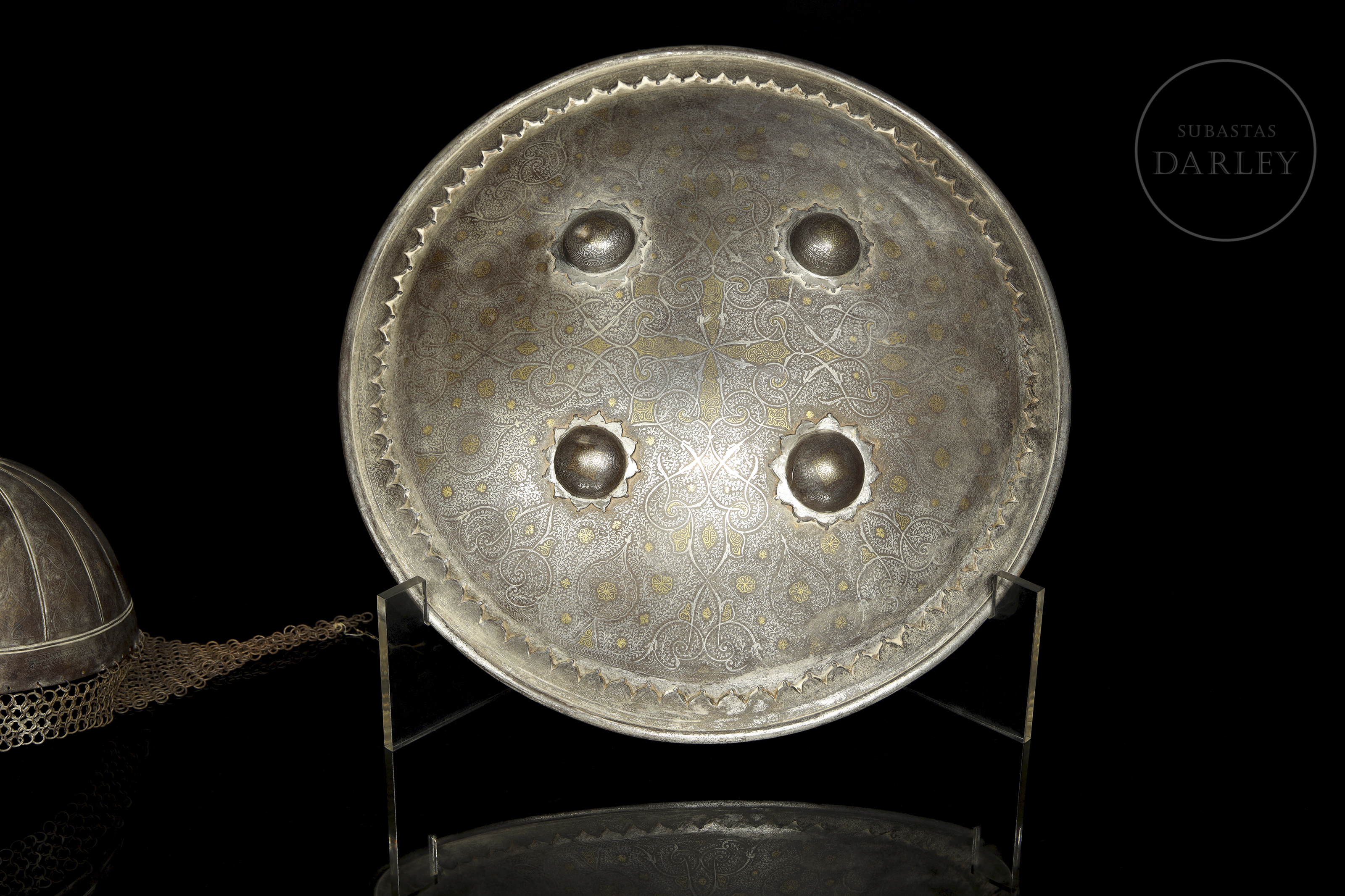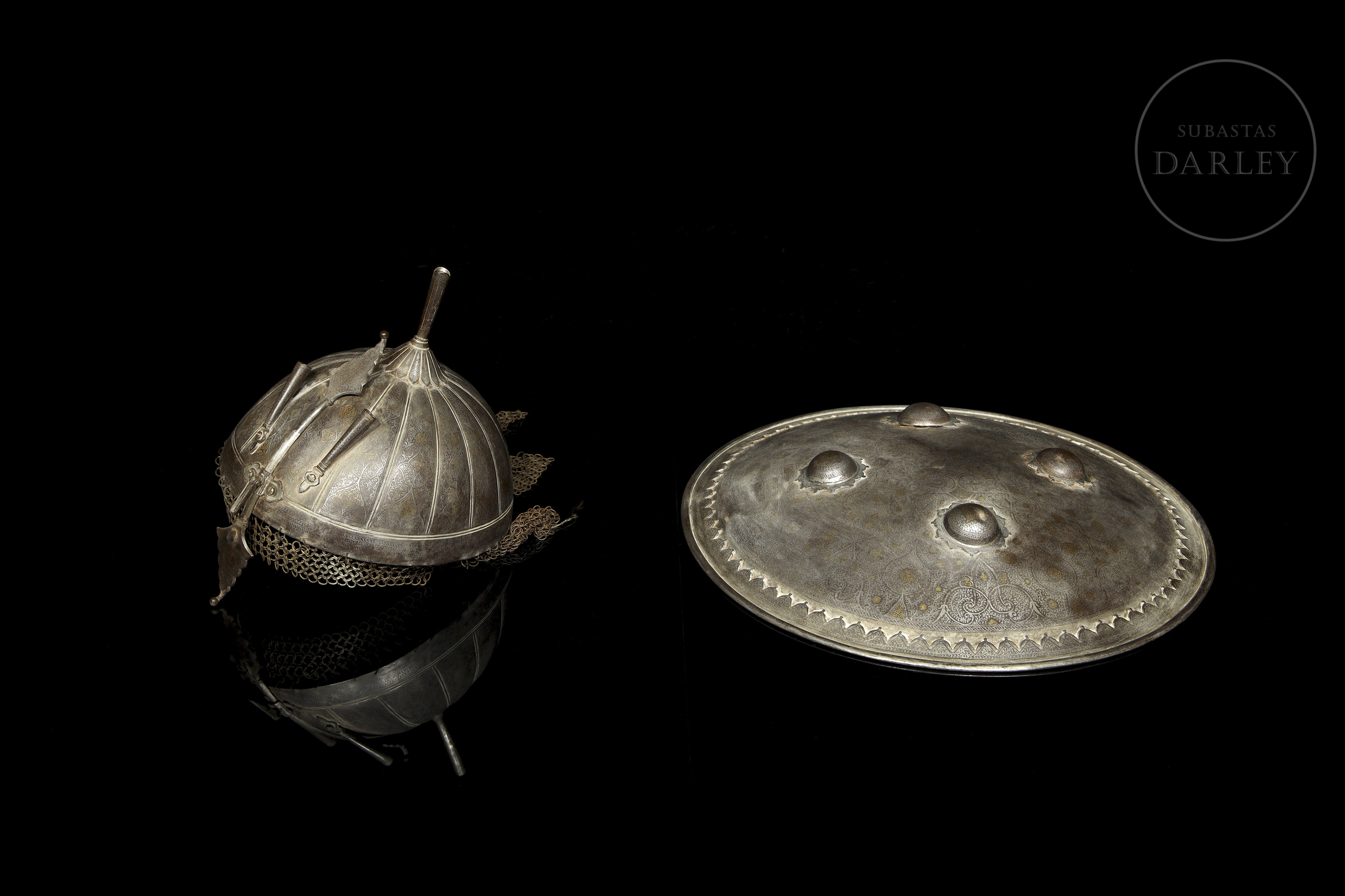 Classic battle set from the Indo-Persian region. Both are decorated with intricate arabesques made using the koftgari technique, possibly using a fine gold and silver inlay colloquially known as ‘Ganga Jamuna’. The khula-hud helmet has a support at the top for inserting feathers, generally used in military parades. The interior of the Sipar shield still retains traces of the padded fabric armour.