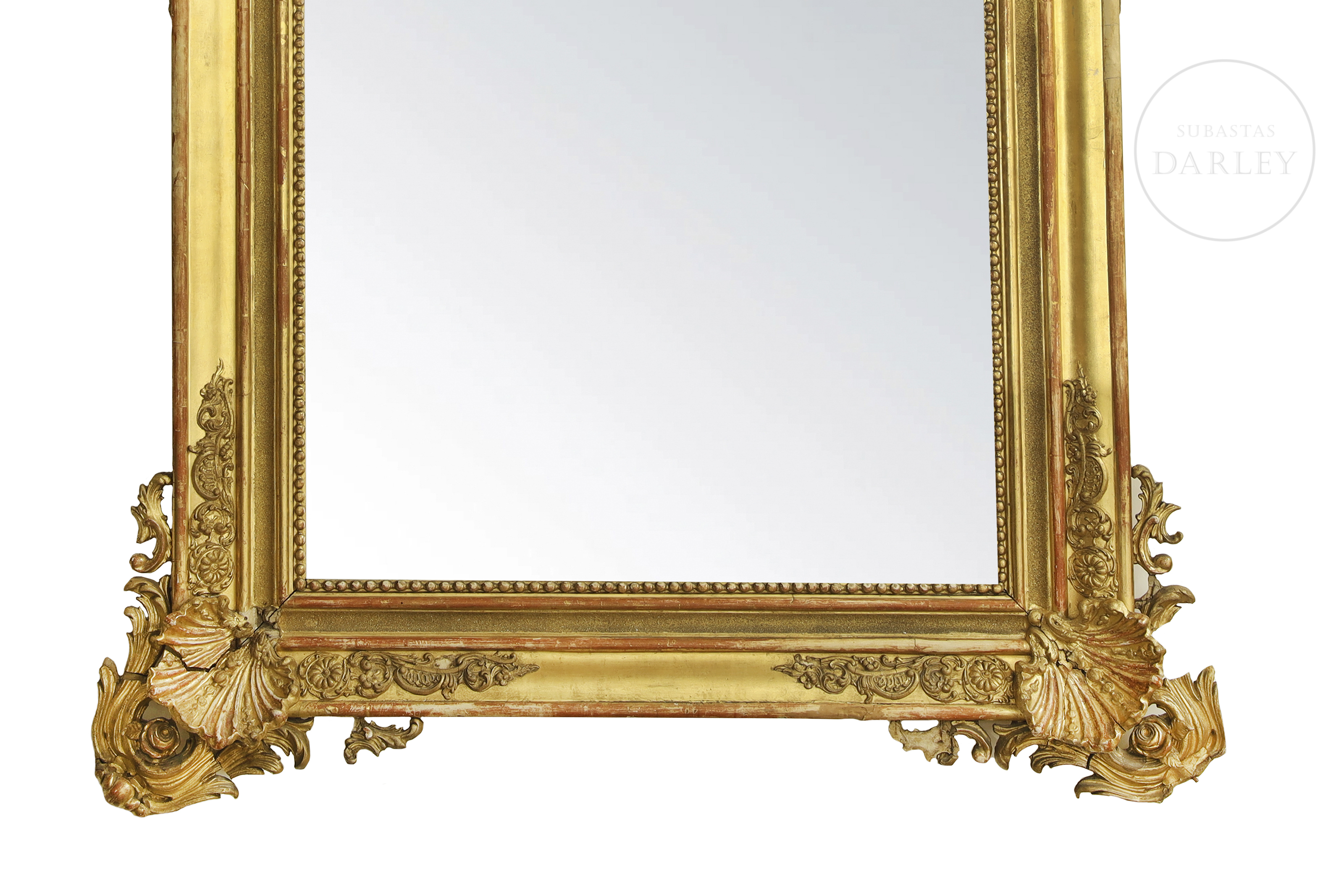 Gilded wooden mirror in the Louis XVI style, adorned with ornate carvings and neoclassical design elements. It features a central motif of a classical urn at the top, flanked by undulating foliage and cascading garlands of flowers or leaves, with shell-shaped finials and an eagle in the center of the top.
