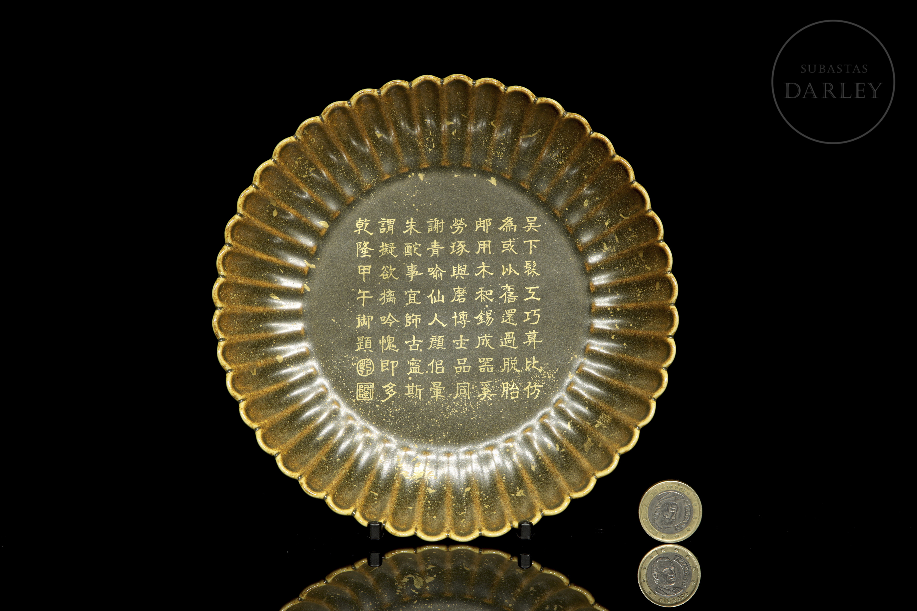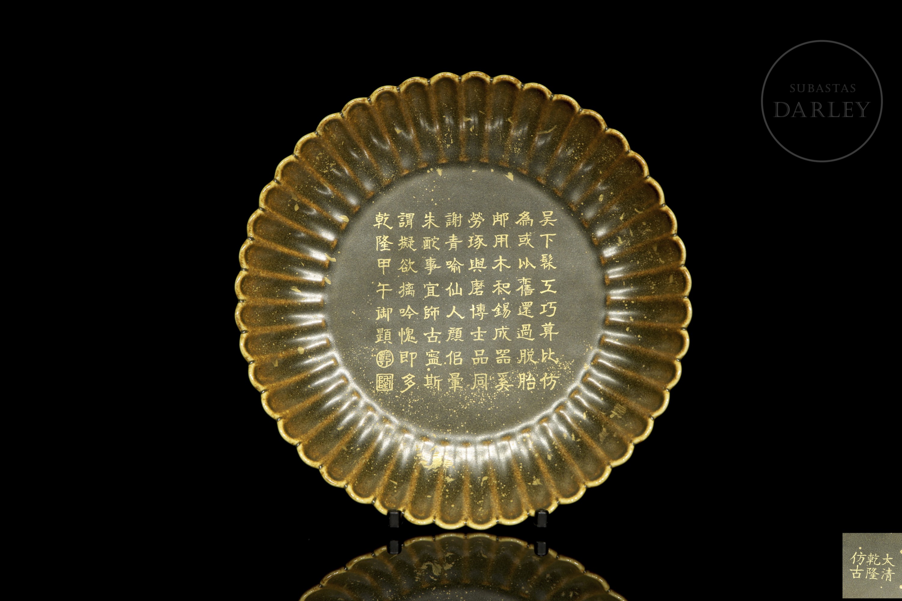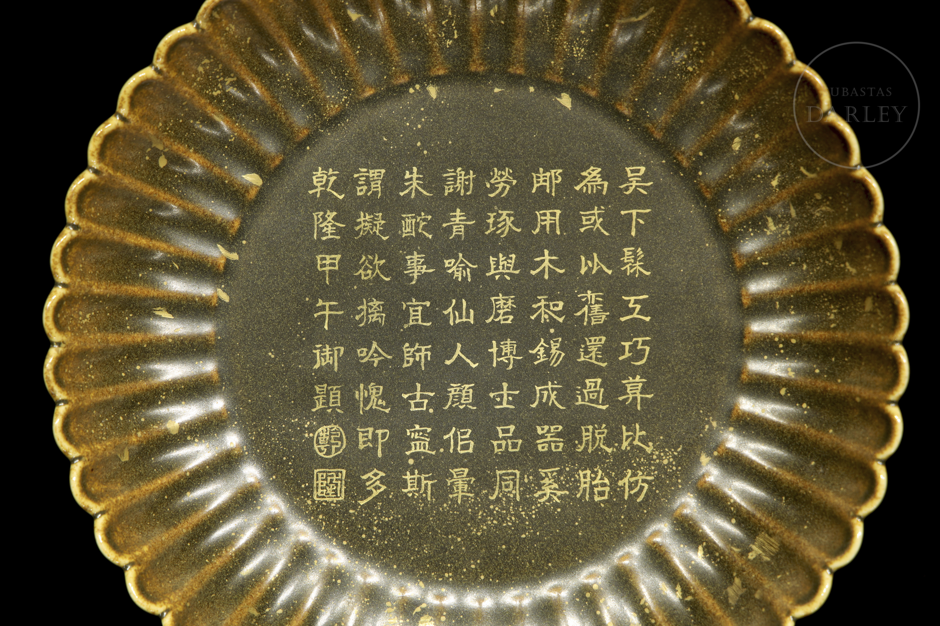 Ceramic plate with a circular base and scalloped rim and sides imitating flower petals. It is covered with a monochrome olive green or brown glaze with golden flecks, on which a calligraphic poem has been inscribed in the centre in gold glaze, accompanied by two seals. The base bears a four-character seal in gold: ‘大清乾隆仿古’.