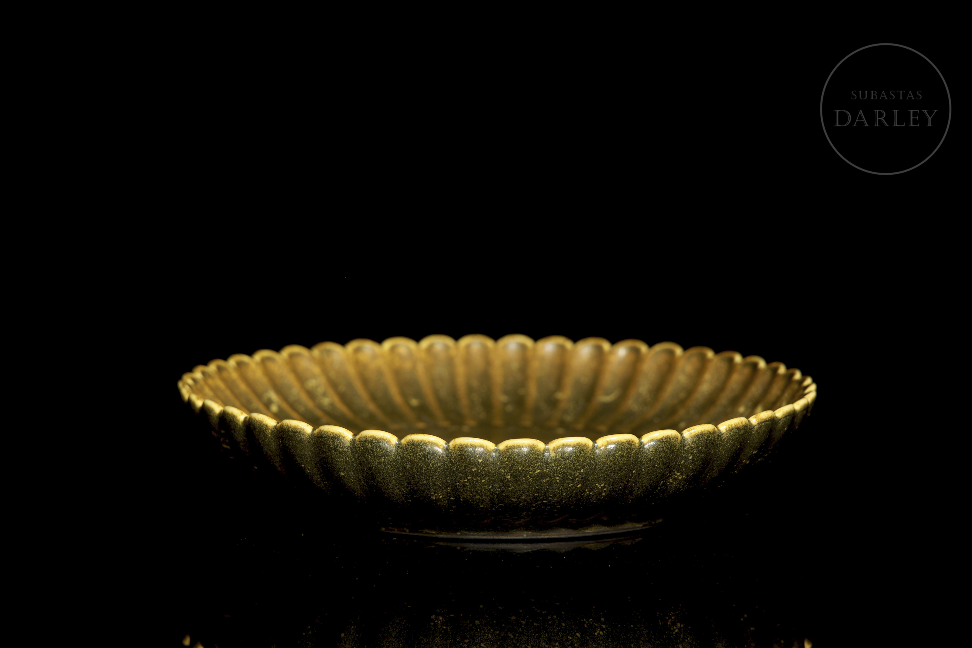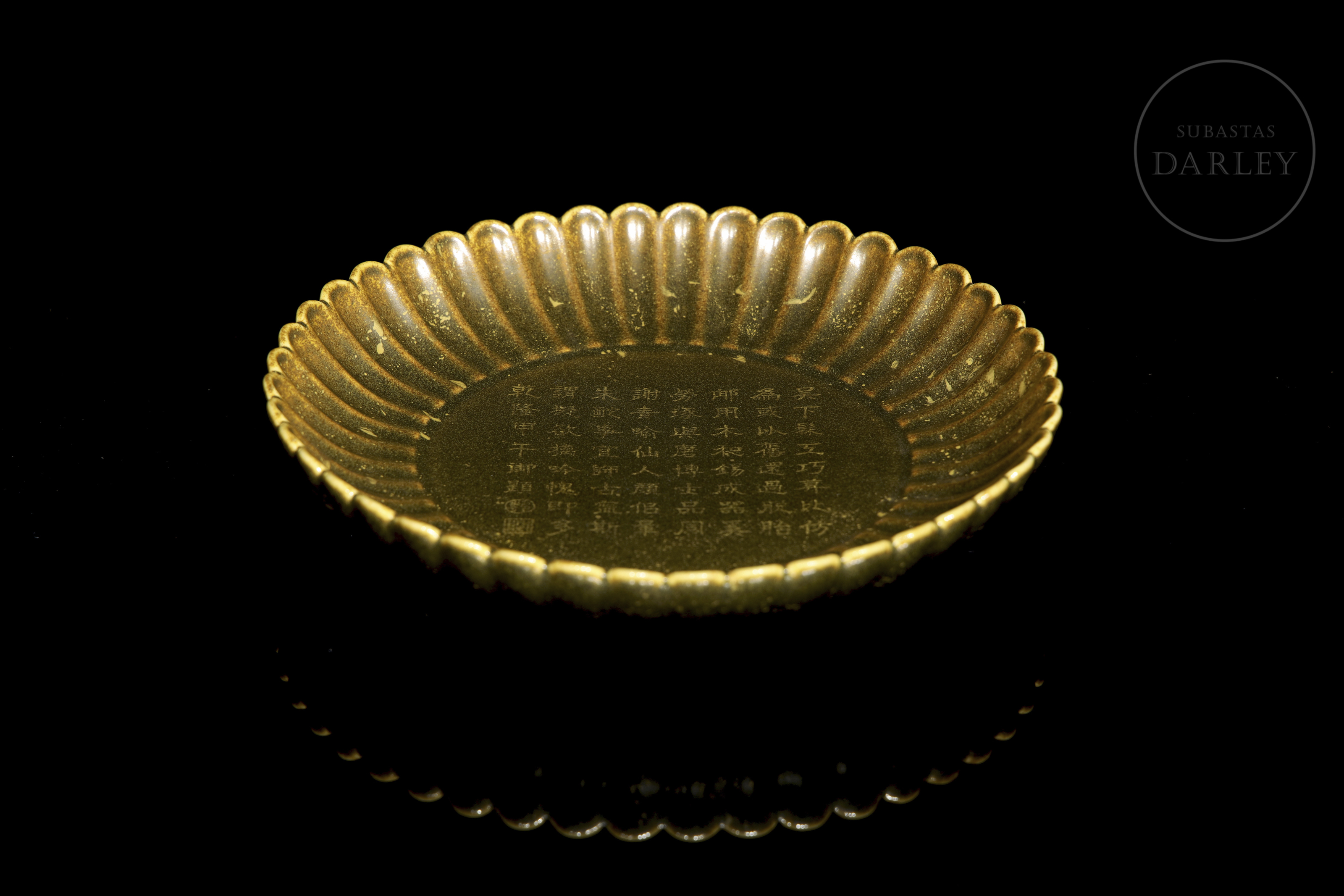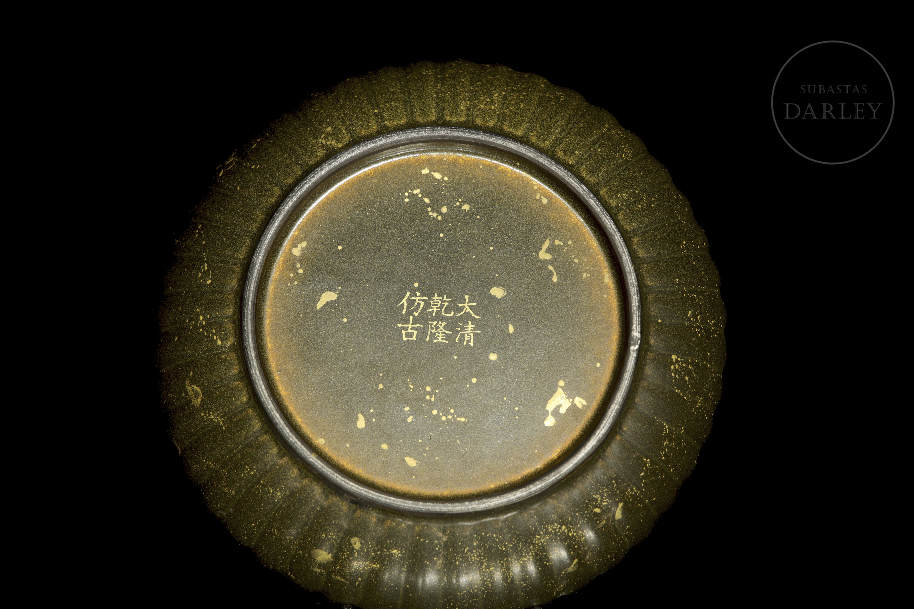 Ceramic plate with a circular base and scalloped rim and sides imitating flower petals. It is covered with a monochrome olive green or brown glaze with golden flecks, on which a calligraphic poem has been inscribed in the centre in gold glaze, accompanied by two seals. The base bears a four-character seal in gold: ‘大清乾隆仿古’.