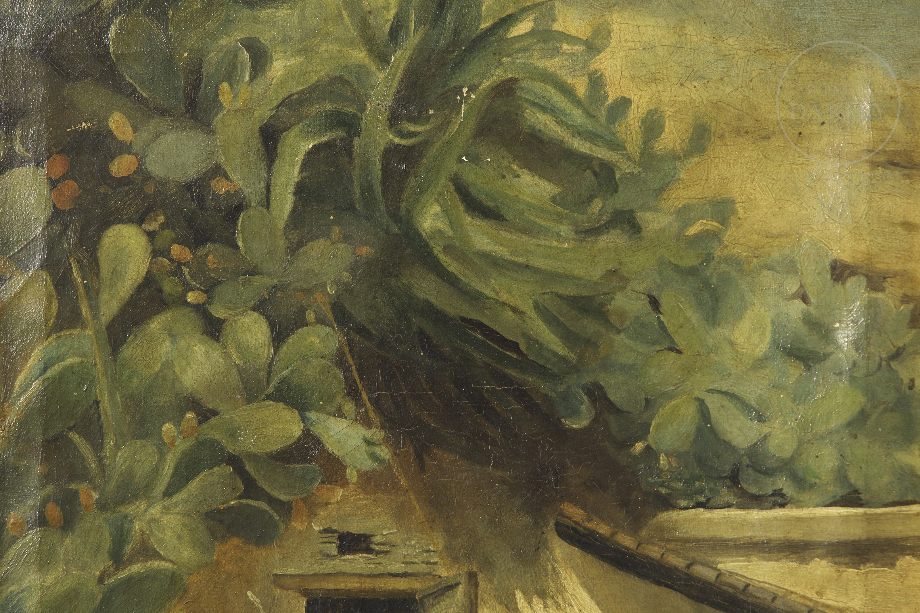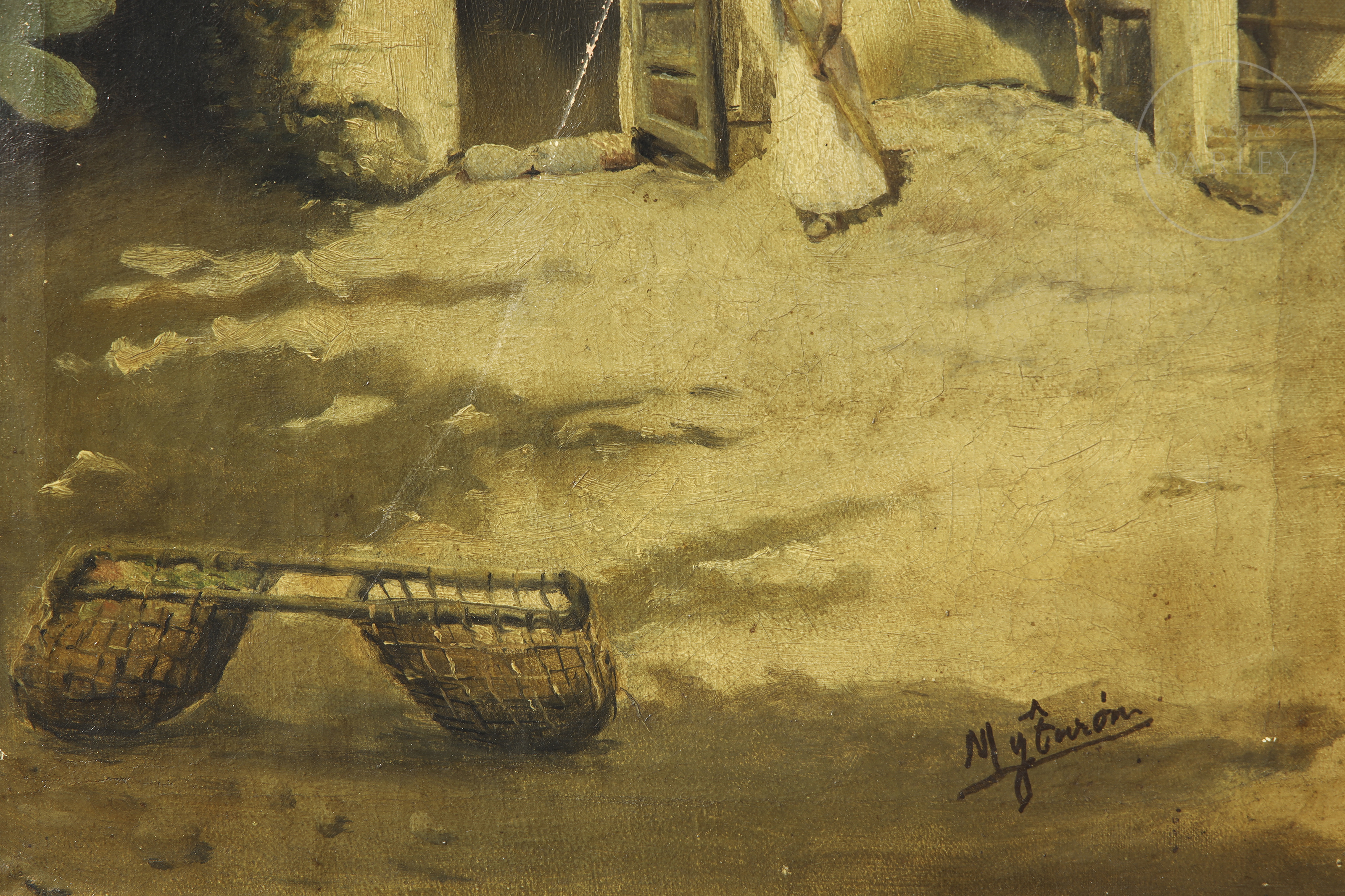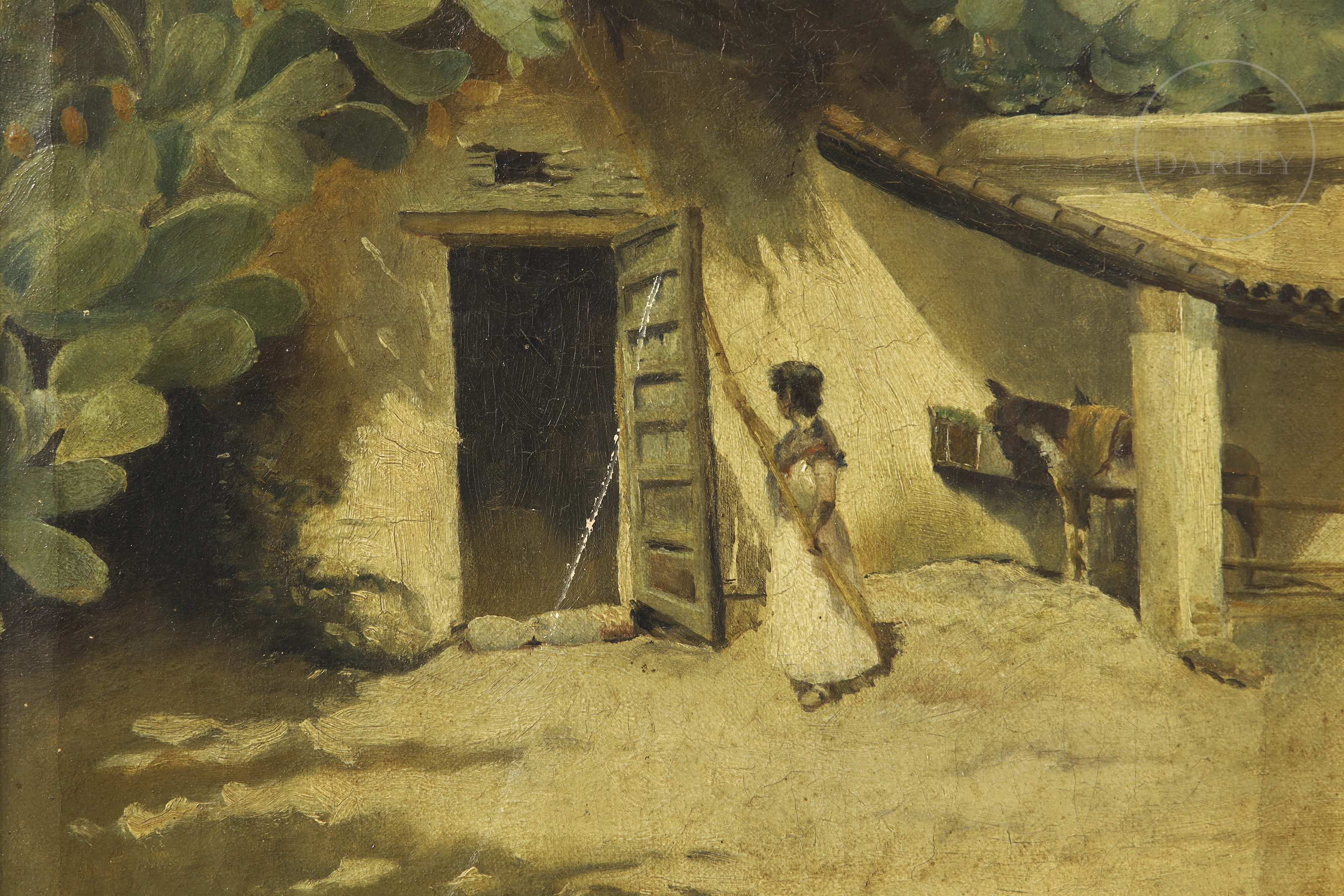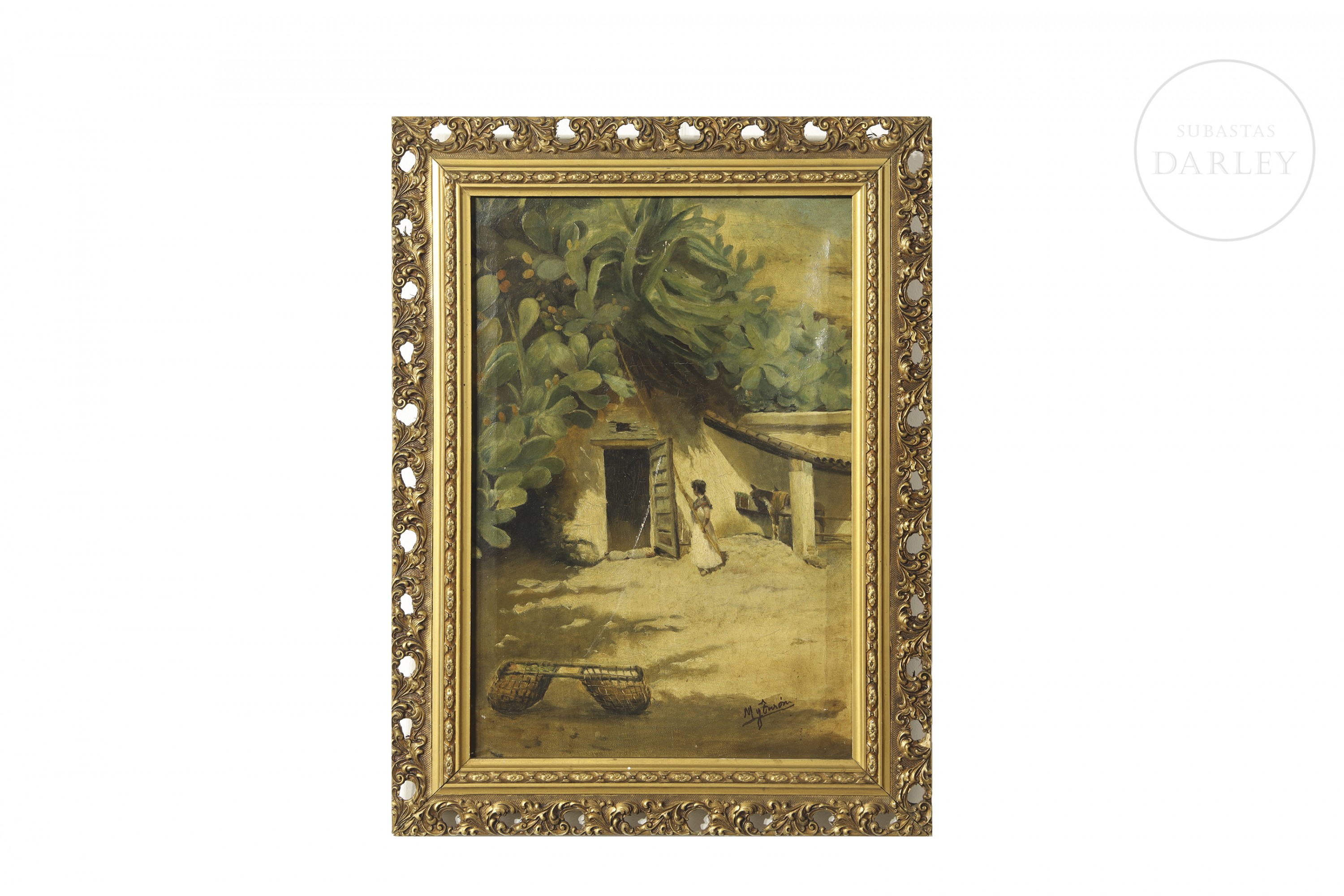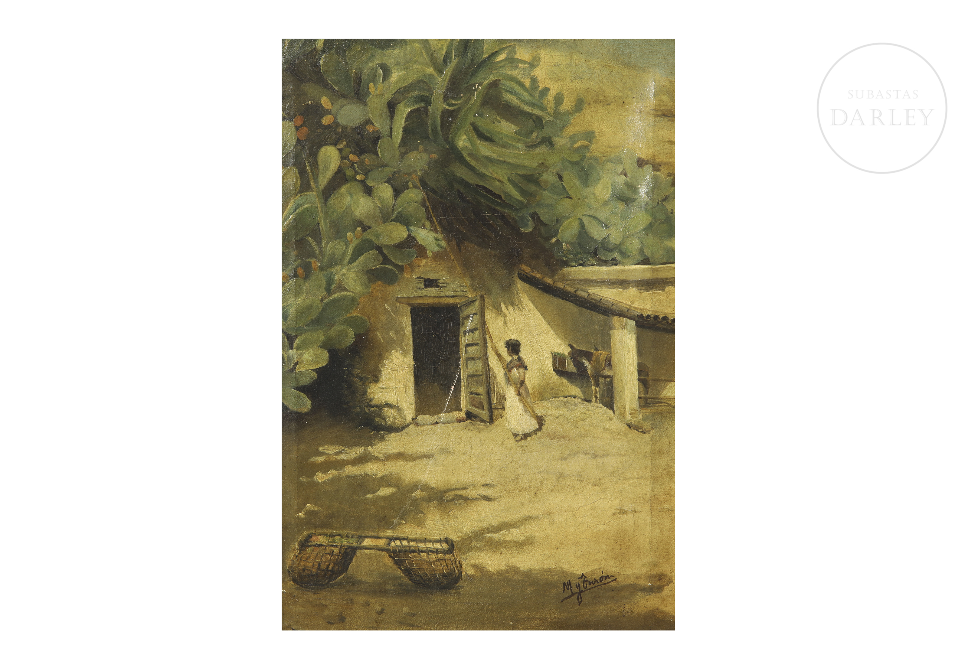 Oil on canvas. Traditional rural scene depicting a house with a shed and prickly pears in the foreground. Signed ‘M y Turón’ in the lower right corner.
