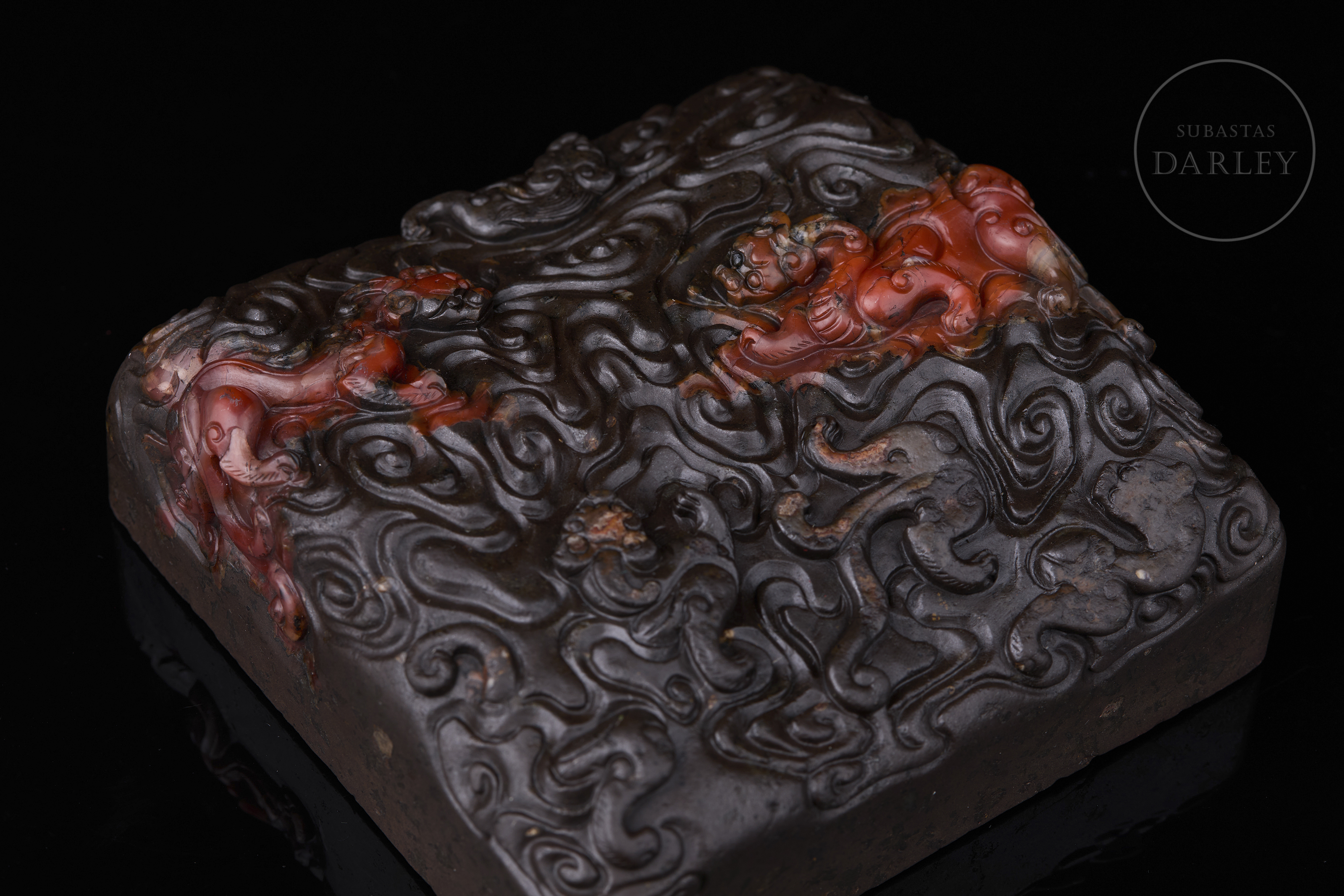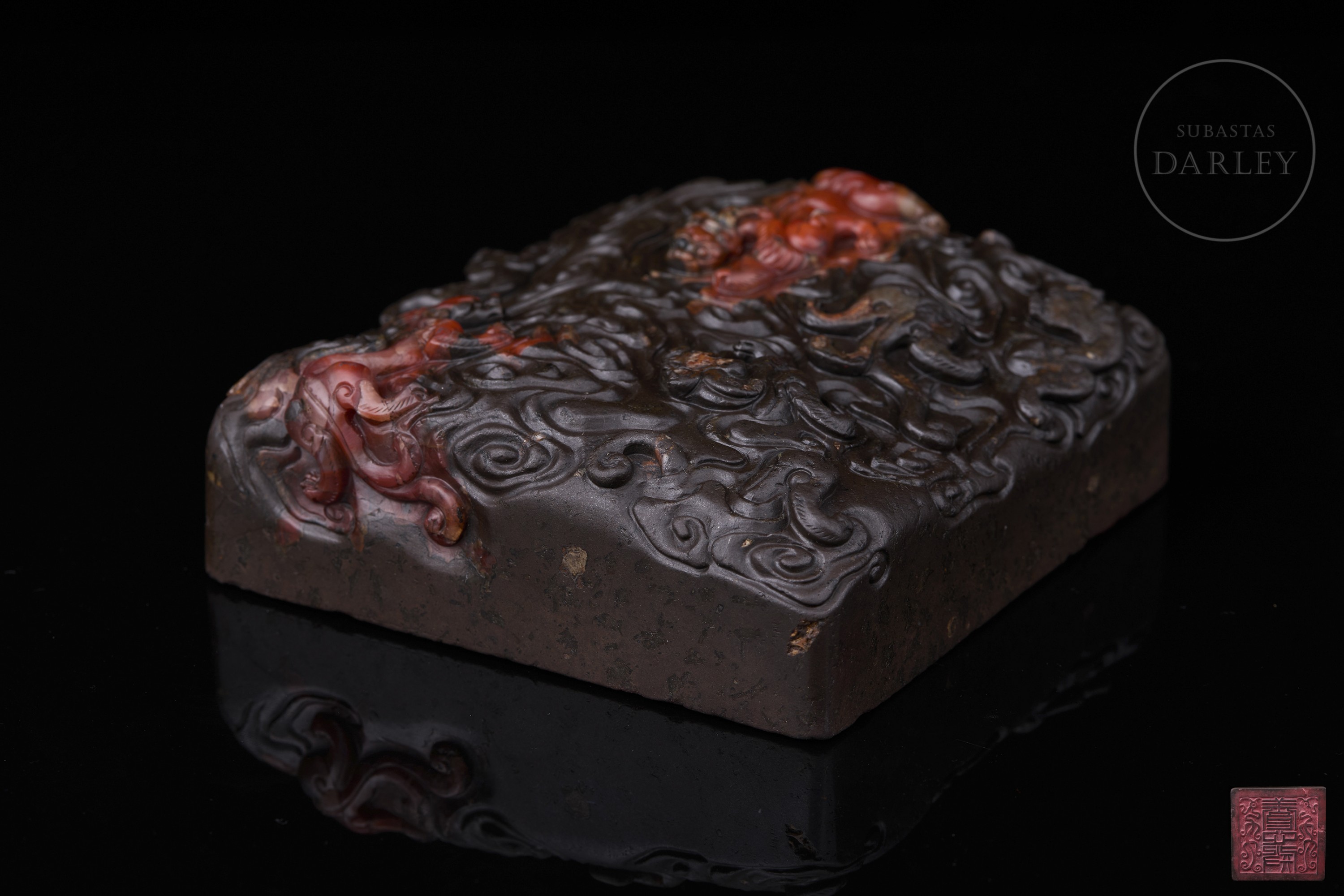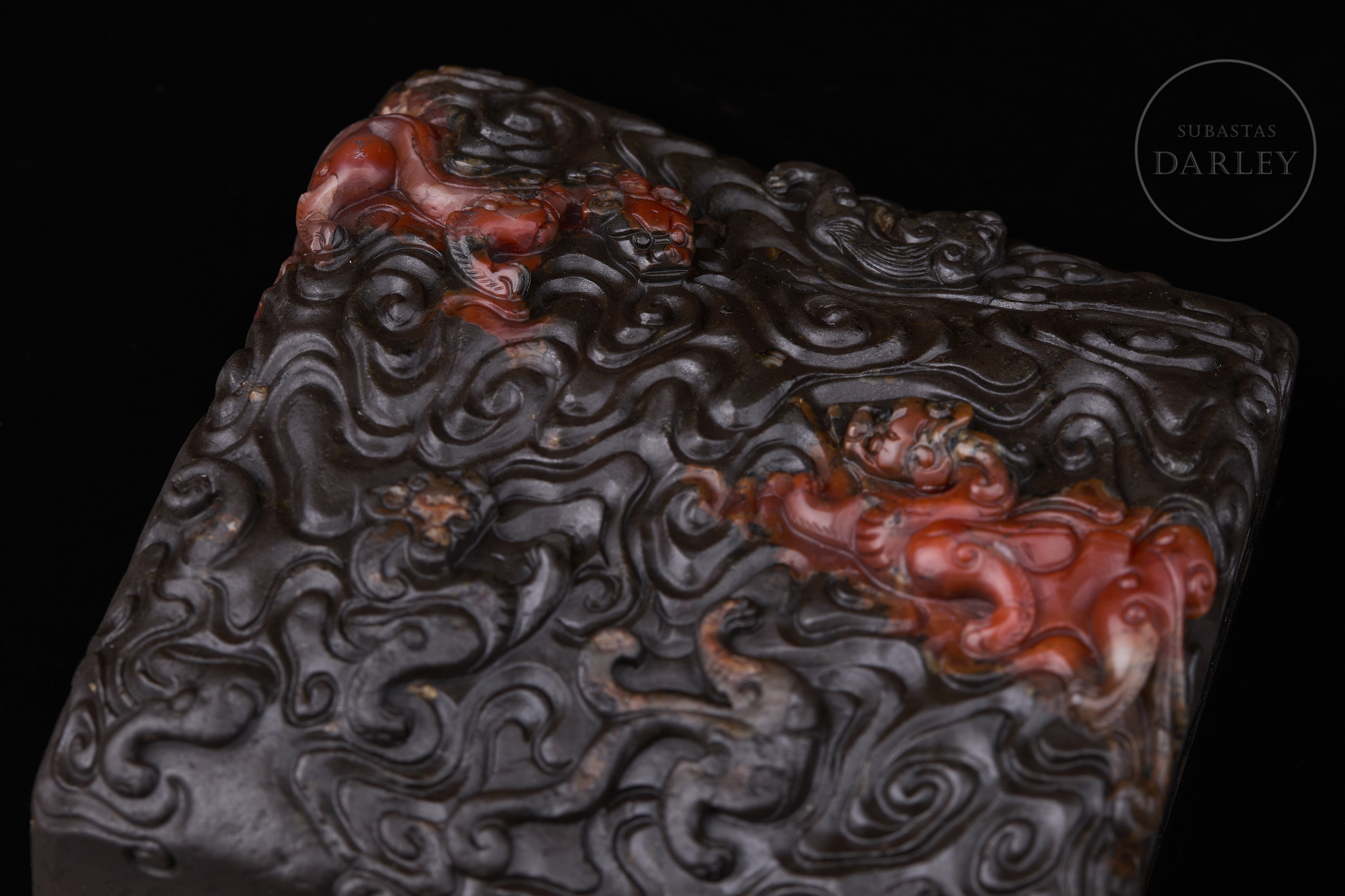 Carved seal made of Nanhong agate, very dark brown in colour, almost black, with crimson red and orange intrusions. It has a square base, decorated with a complex relief of stylised dragons among sinuous cloud scrolls covering the entire surface. The matrix shows engraved characters and traces of red sealing wax, with the inscription “養心殿”. Qing dynasty (1644–1912).