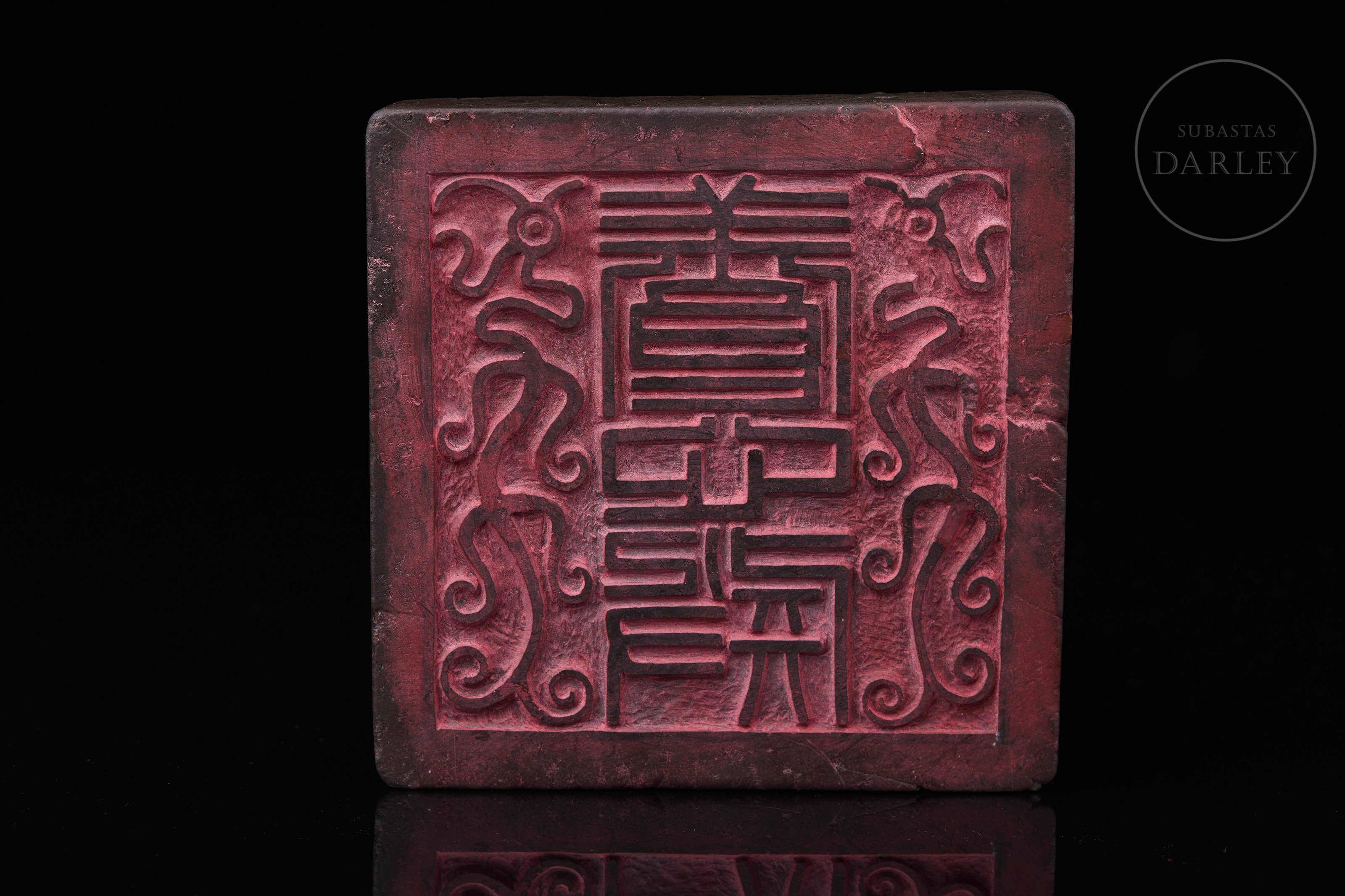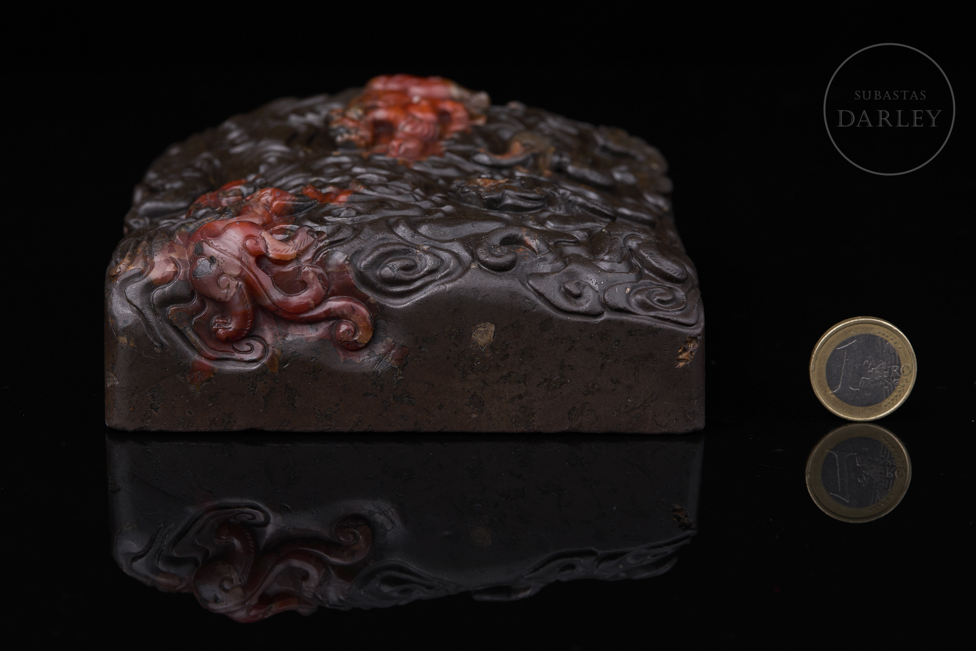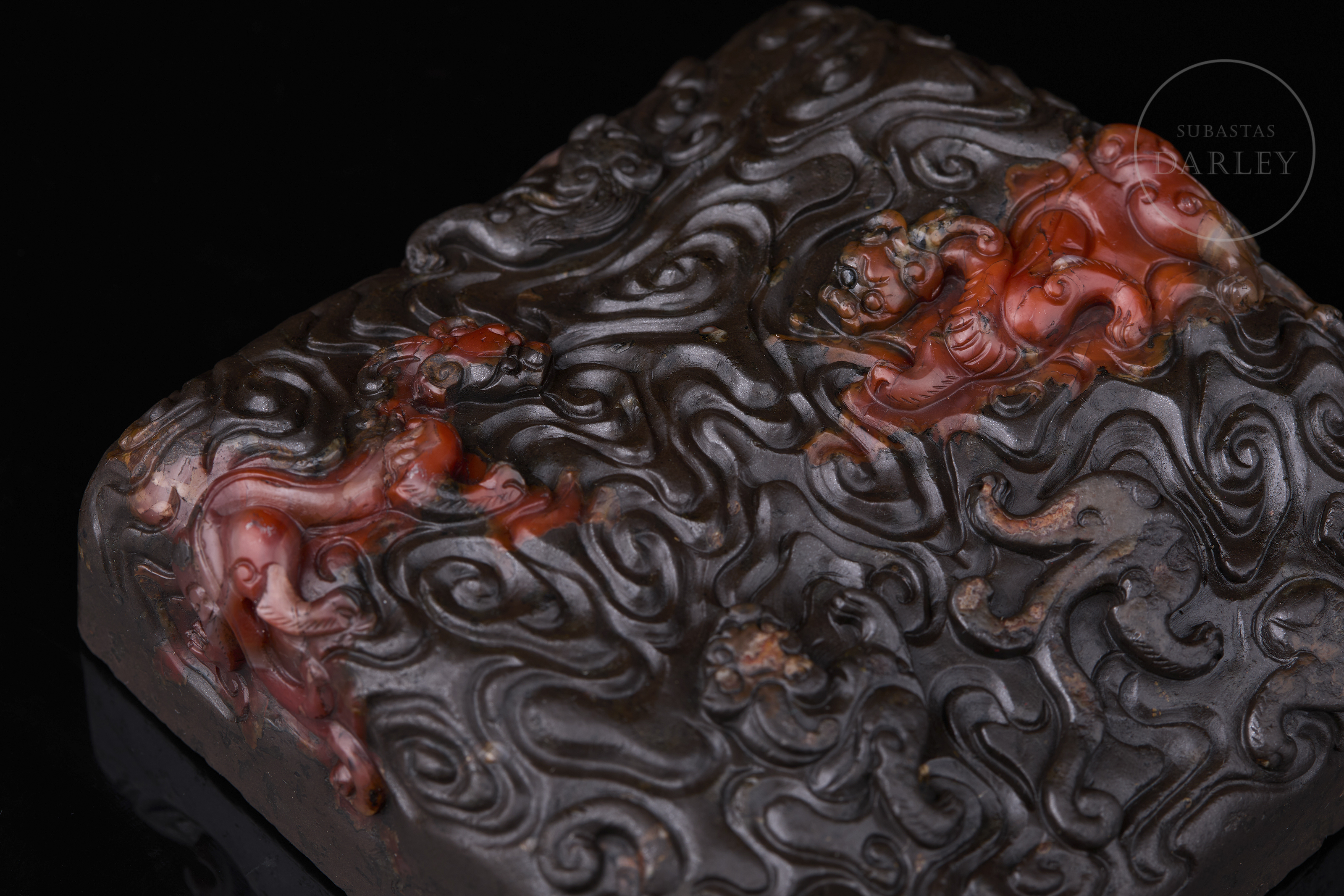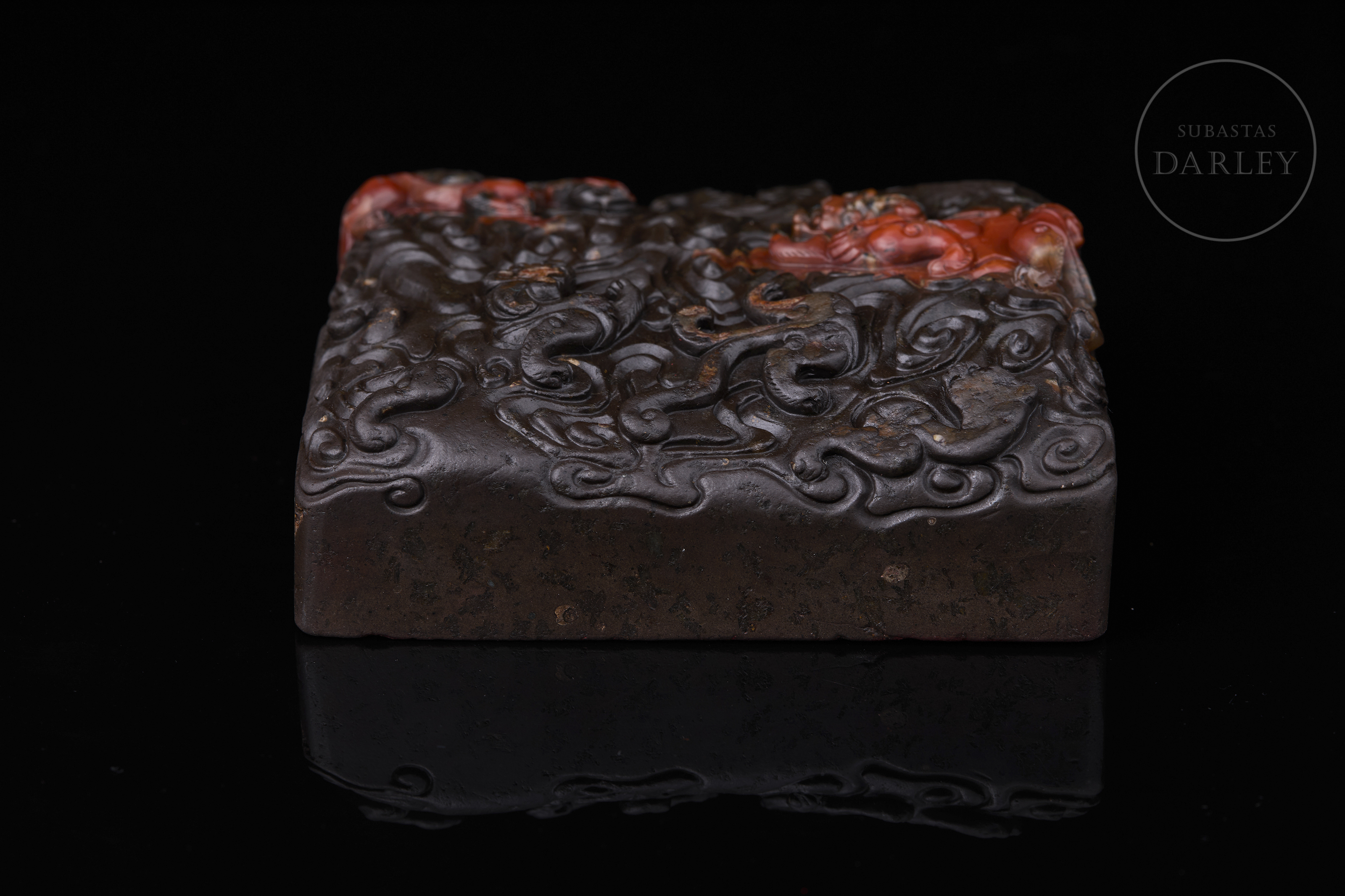 Carved seal made of Nanhong agate, very dark brown in colour, almost black, with crimson red and orange intrusions. It has a square base, decorated with a complex relief of stylised dragons among sinuous cloud scrolls covering the entire surface. The matrix shows engraved characters and traces of red sealing wax, with the inscription “養心殿”. Qing dynasty (1644–1912).