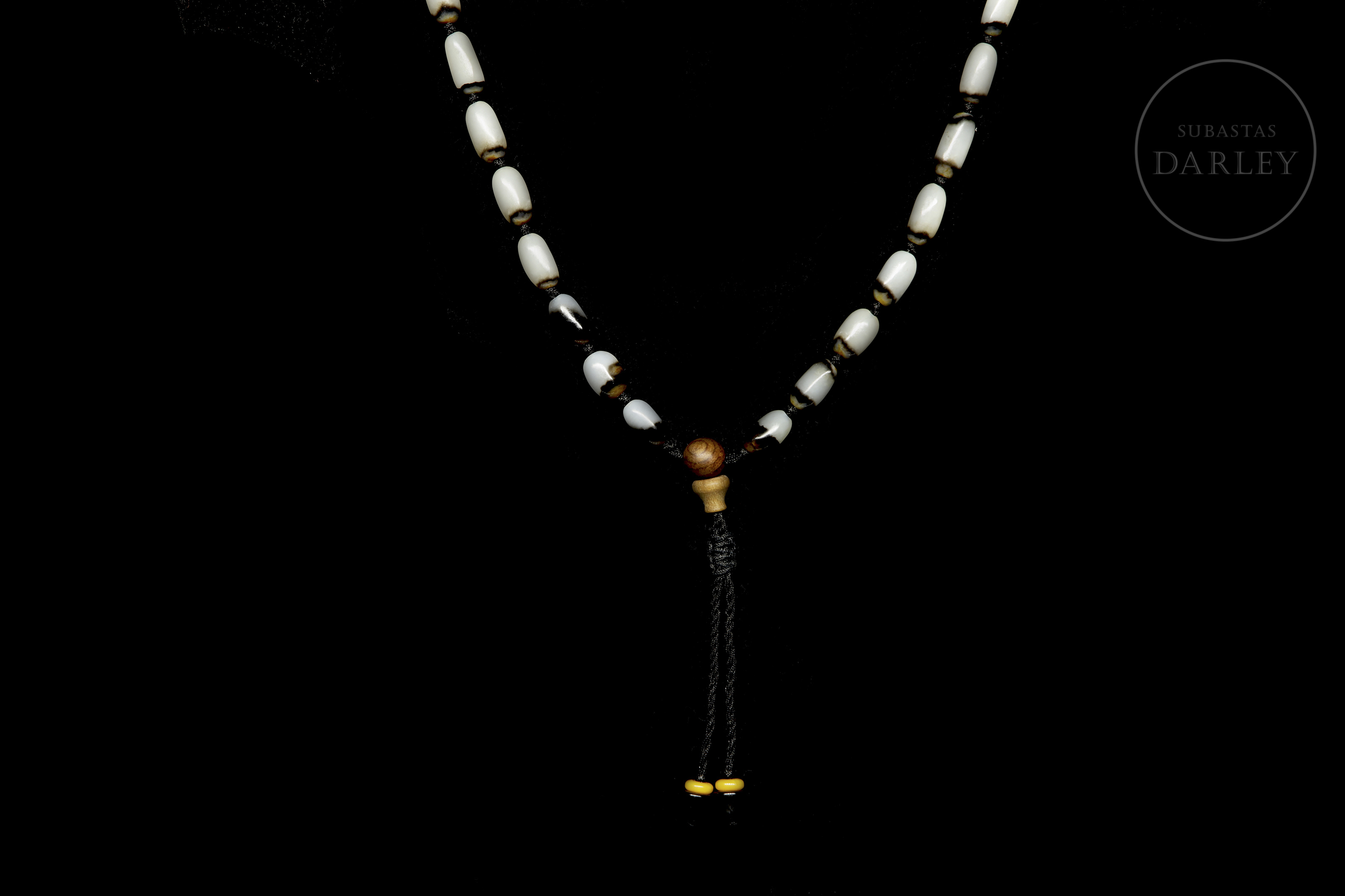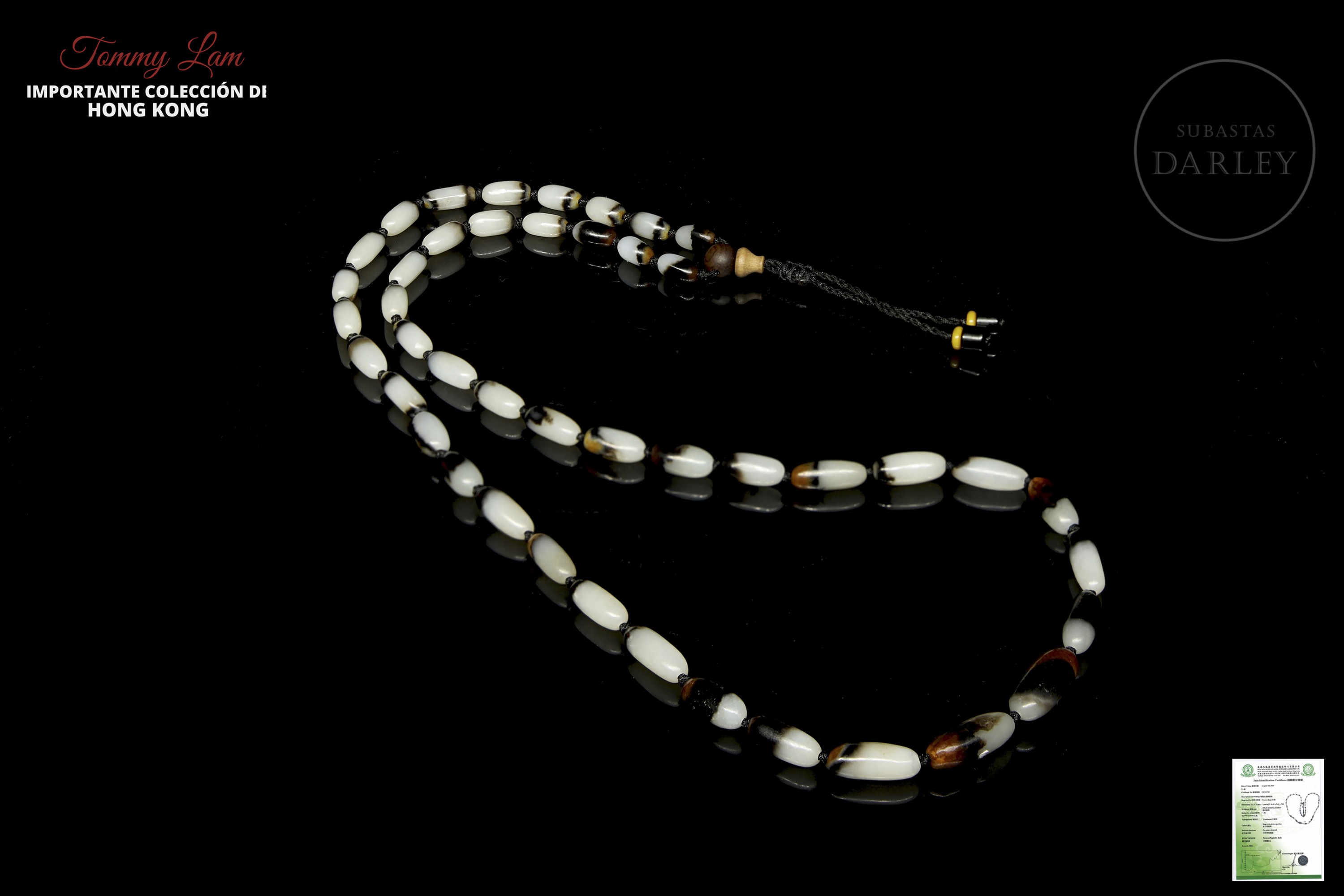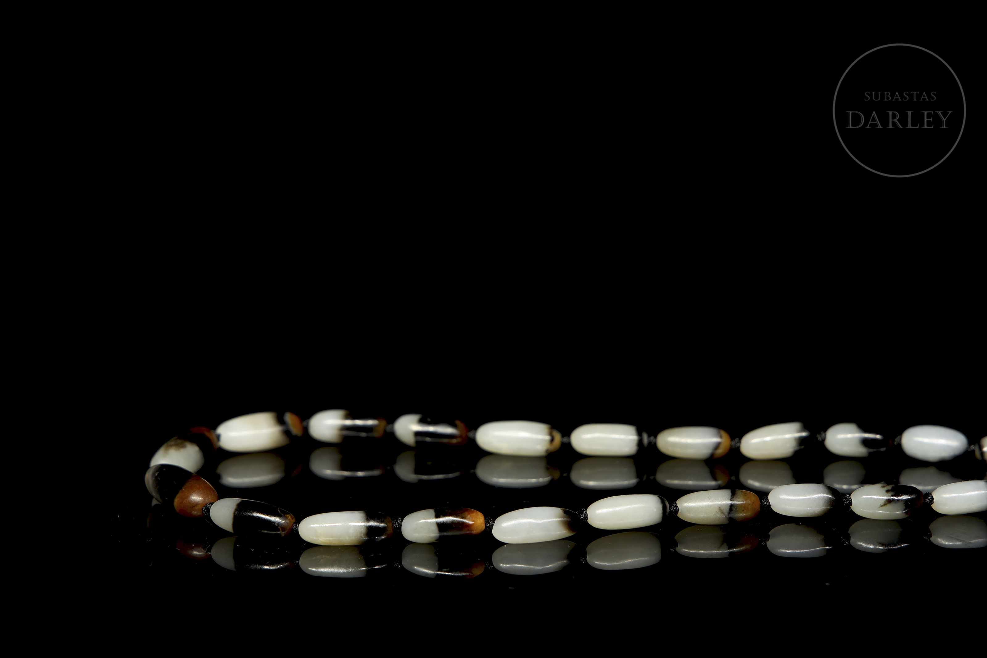 Necklace consisting of a string of 44 tubular jade beads. The material is notable for its intense black inclusions, which create a natural pattern of white, black, and brown bands. The beads have a smooth polish and are mounted on a knotted black cord, finished with a wooden bead and an adjustable bow clasp. Qing Dynasty (1644-1912).