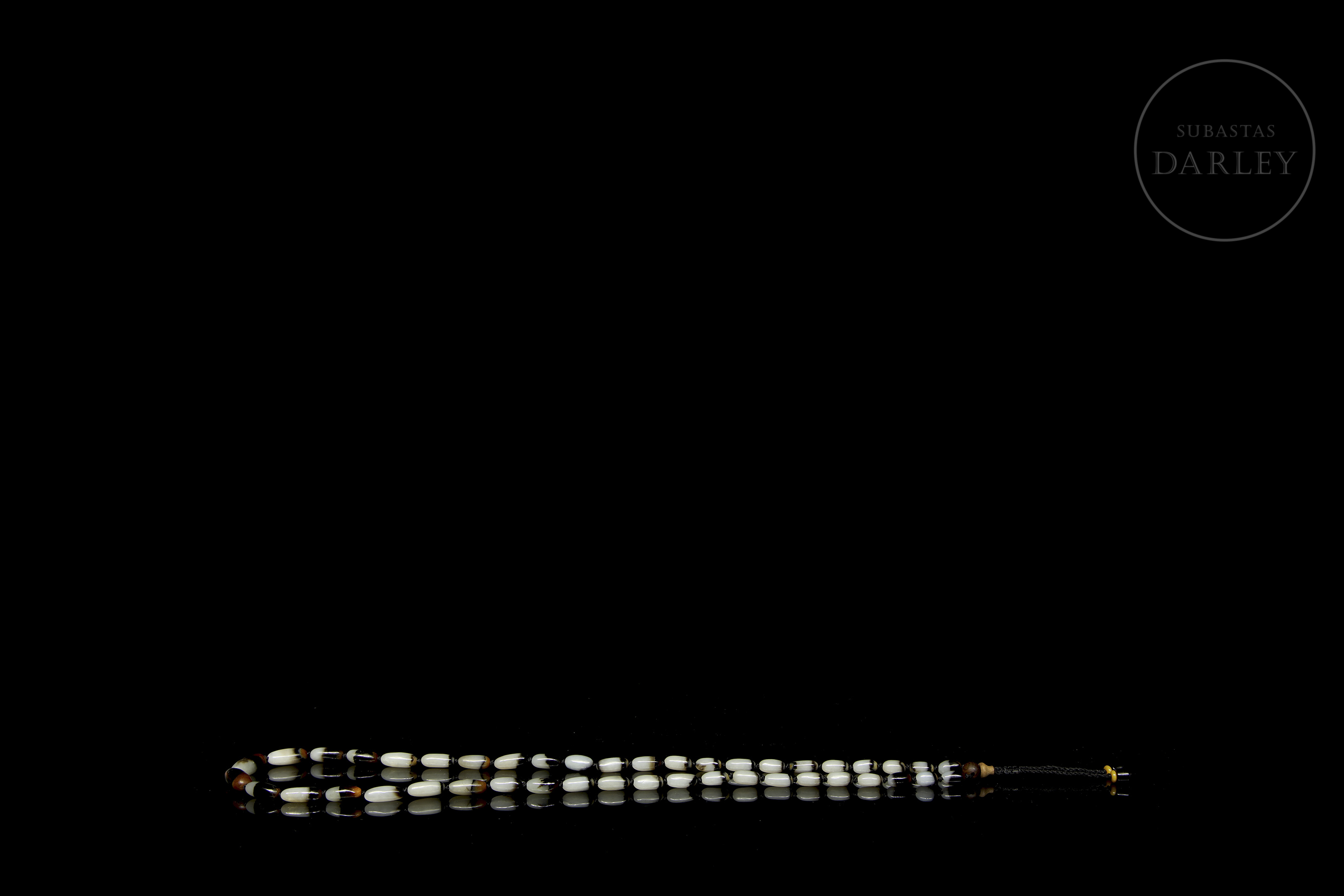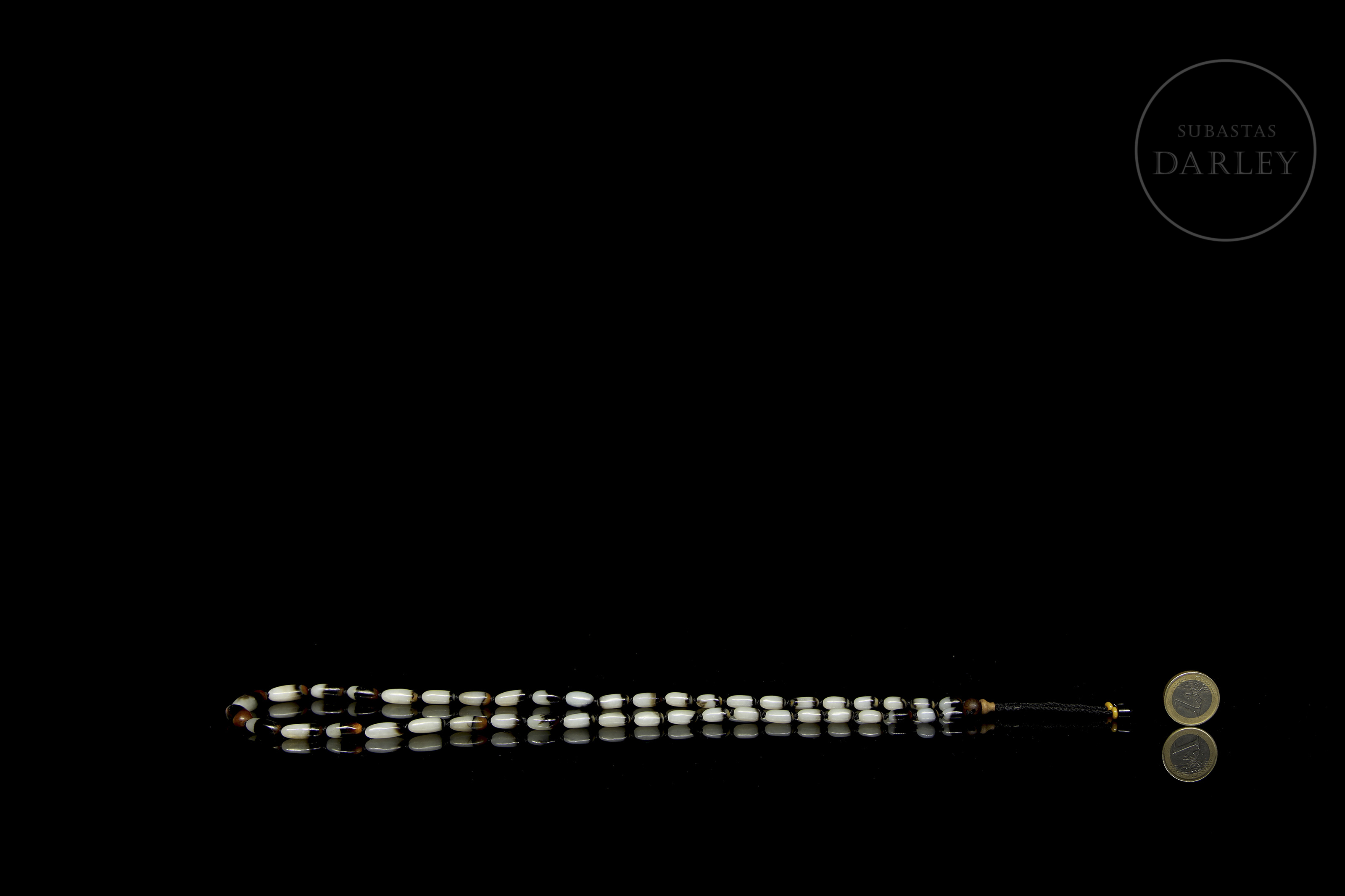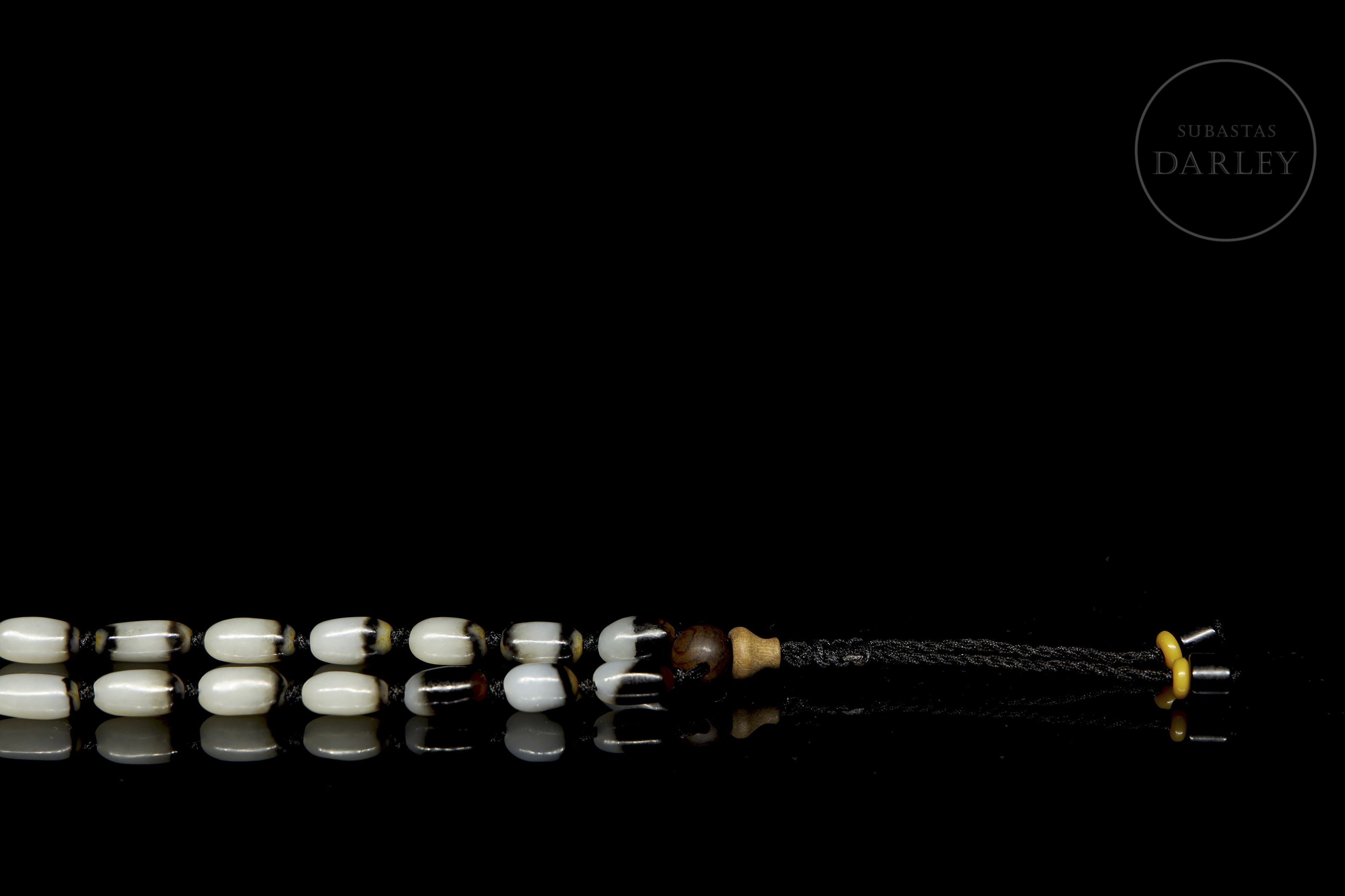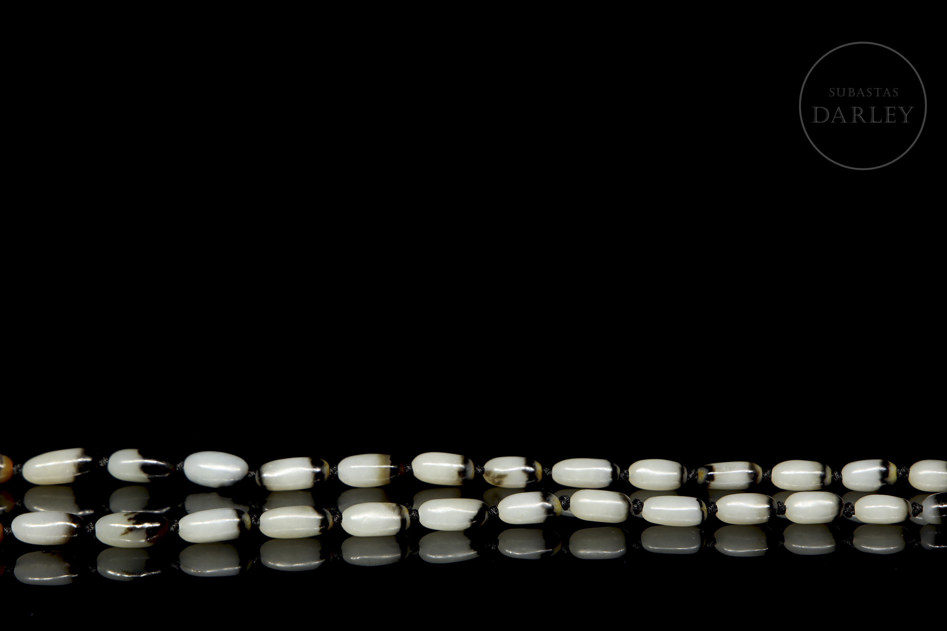 Necklace consisting of a string of 44 tubular jade beads. The material is notable for its intense black inclusions, which create a natural pattern of white, black, and brown bands. The beads have a smooth polish and are mounted on a knotted black cord, finished with a wooden bead and an adjustable bow clasp. Qing Dynasty (1644-1912).
