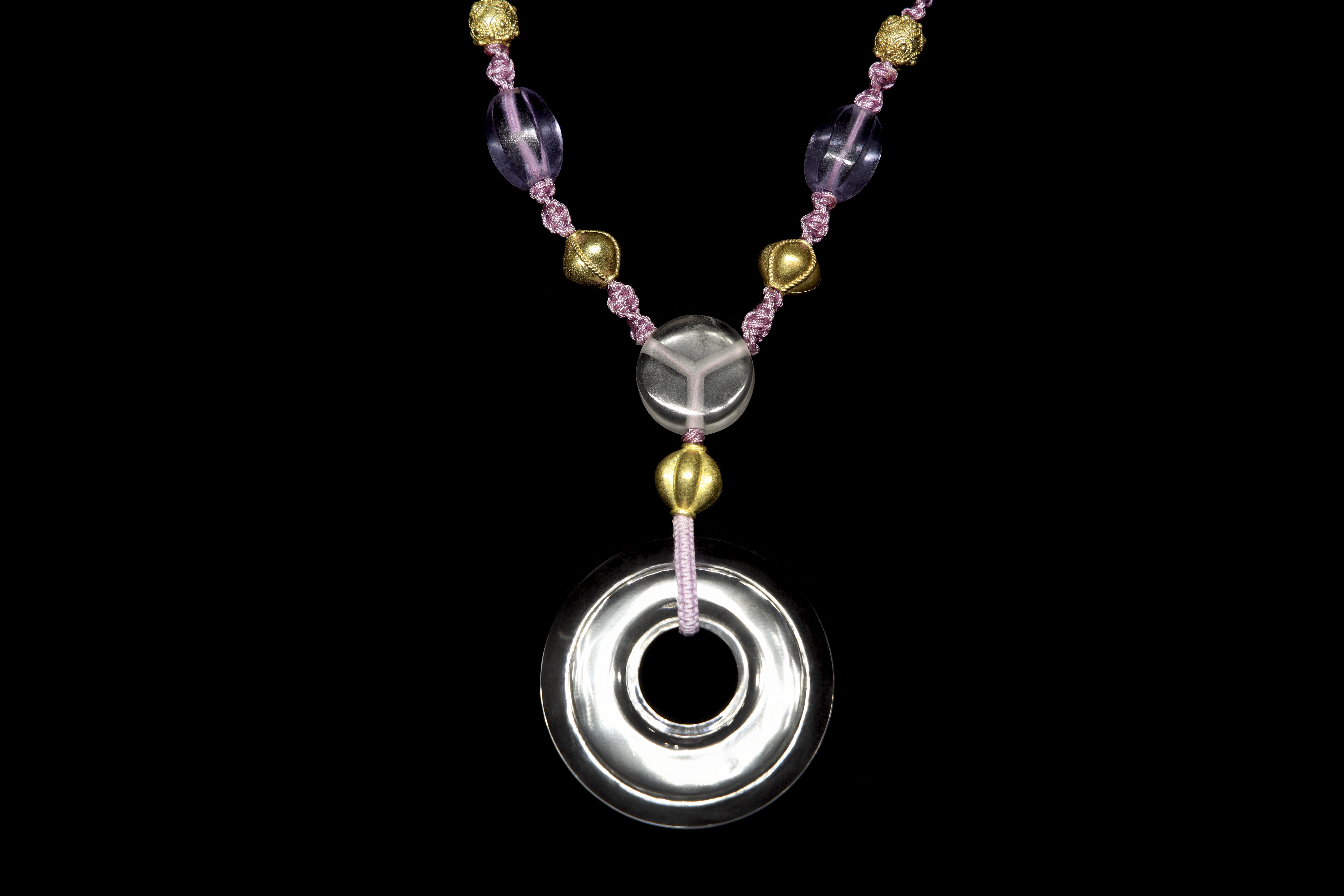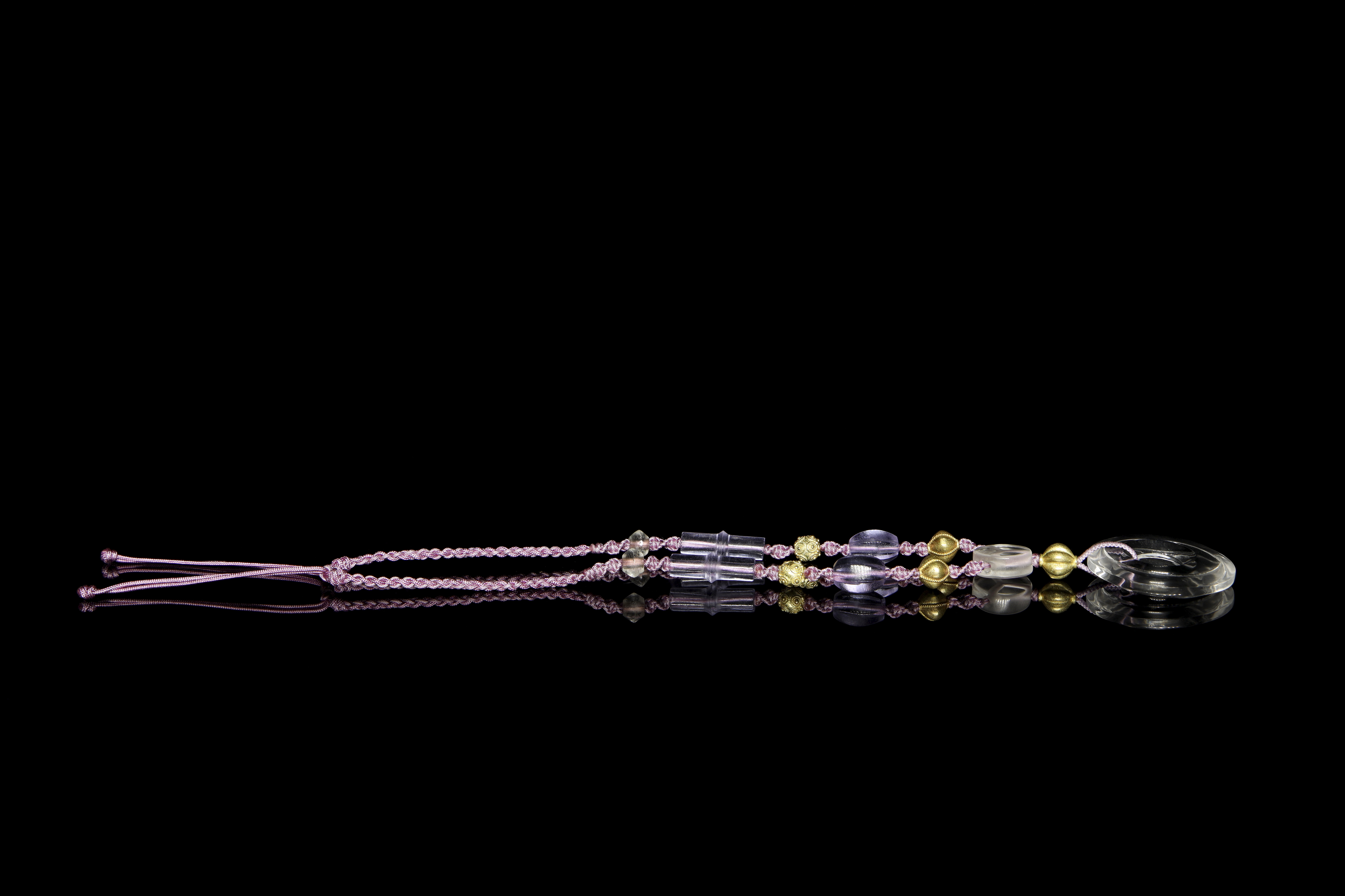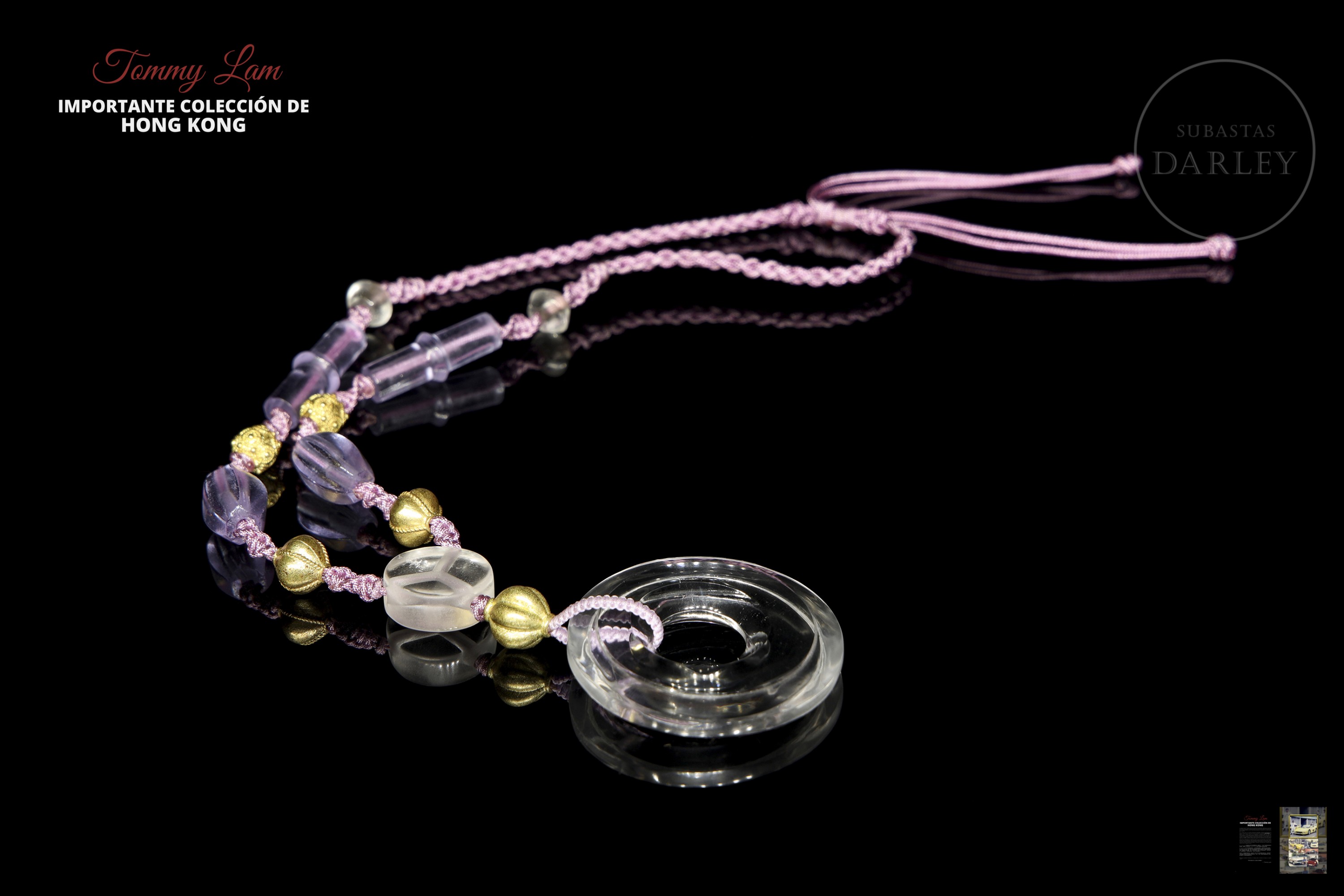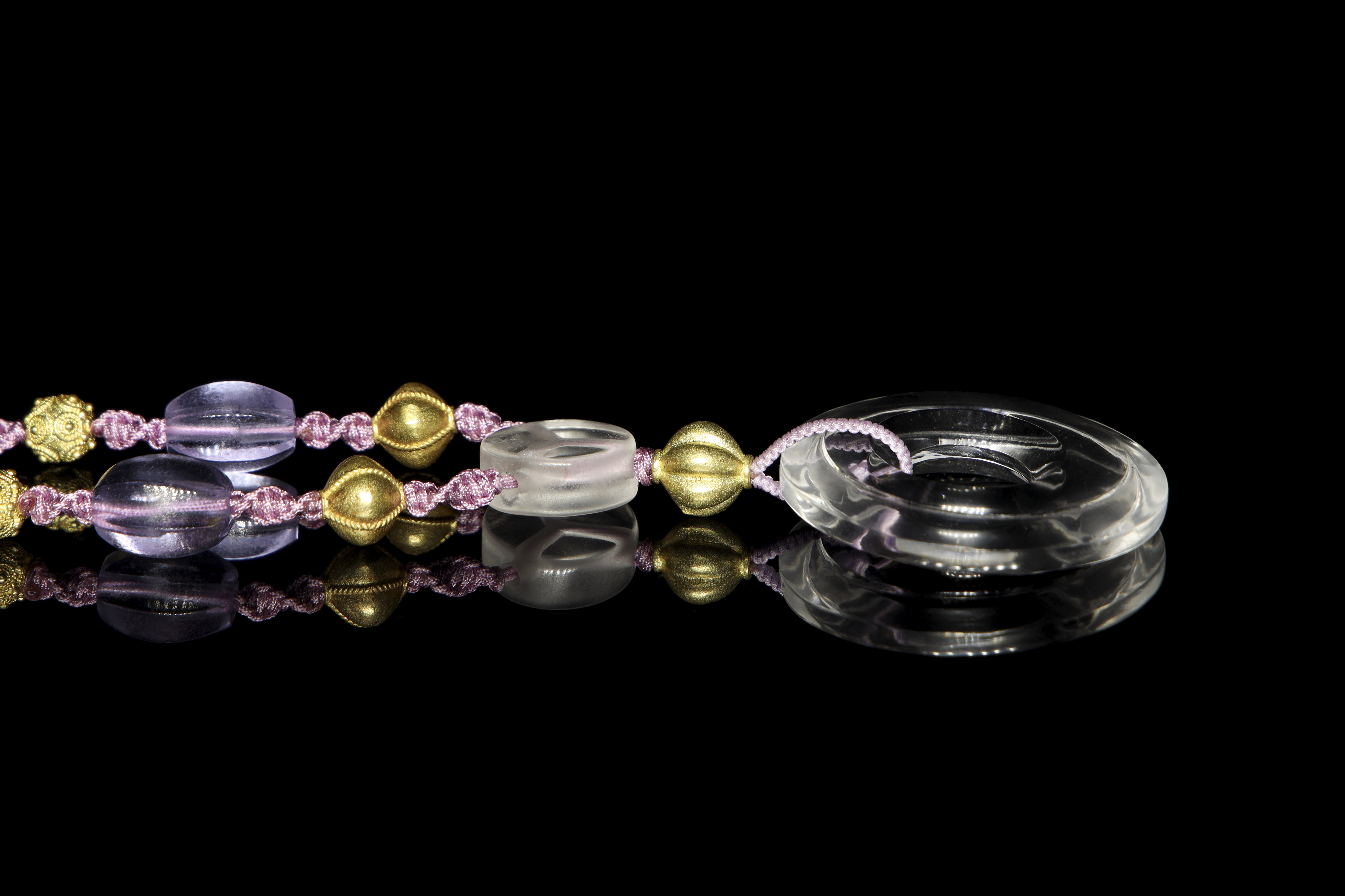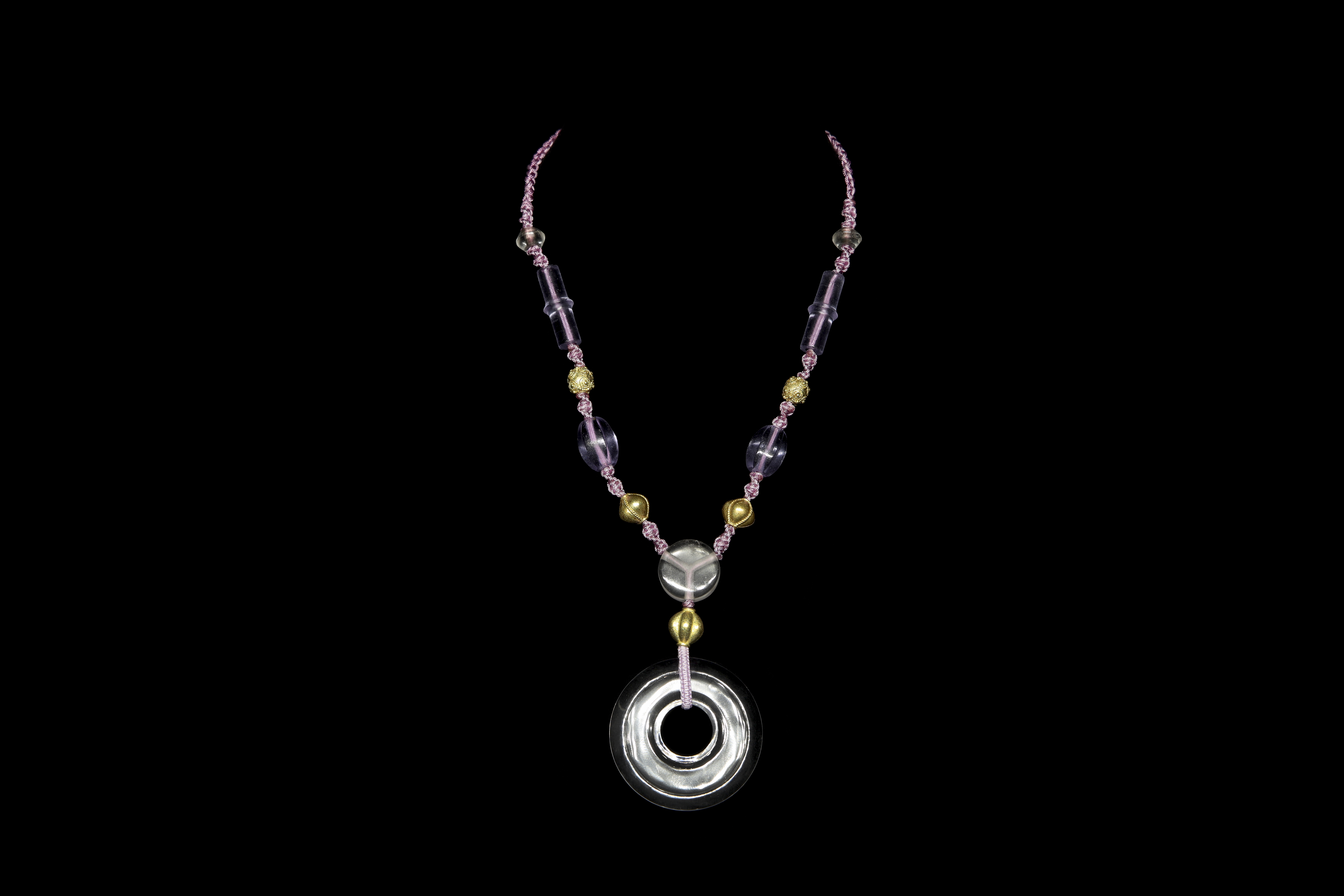 Elegant necklace mounted on a knotted pink braided cord. The piece features a central pendant in the shape of a bi (璧) disc made of translucent quartz, and a symmetrical composition with five spherical golden bronze beads interspersed between seven quartz beads of multiple colours and shapes. It is finished with an adjustable bow clasp. Warring States period (475–221 BC).
