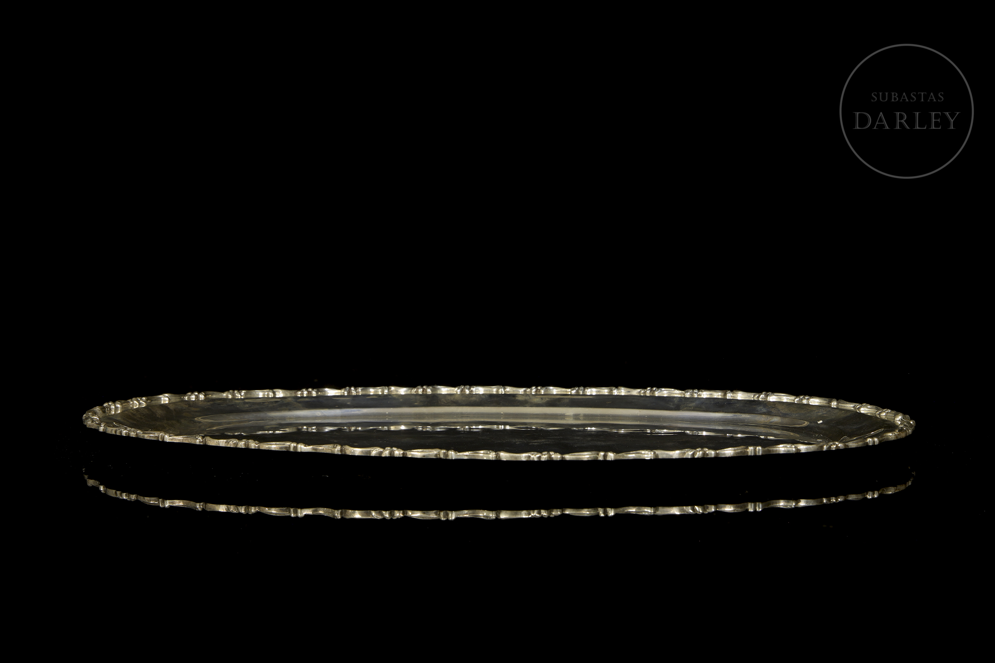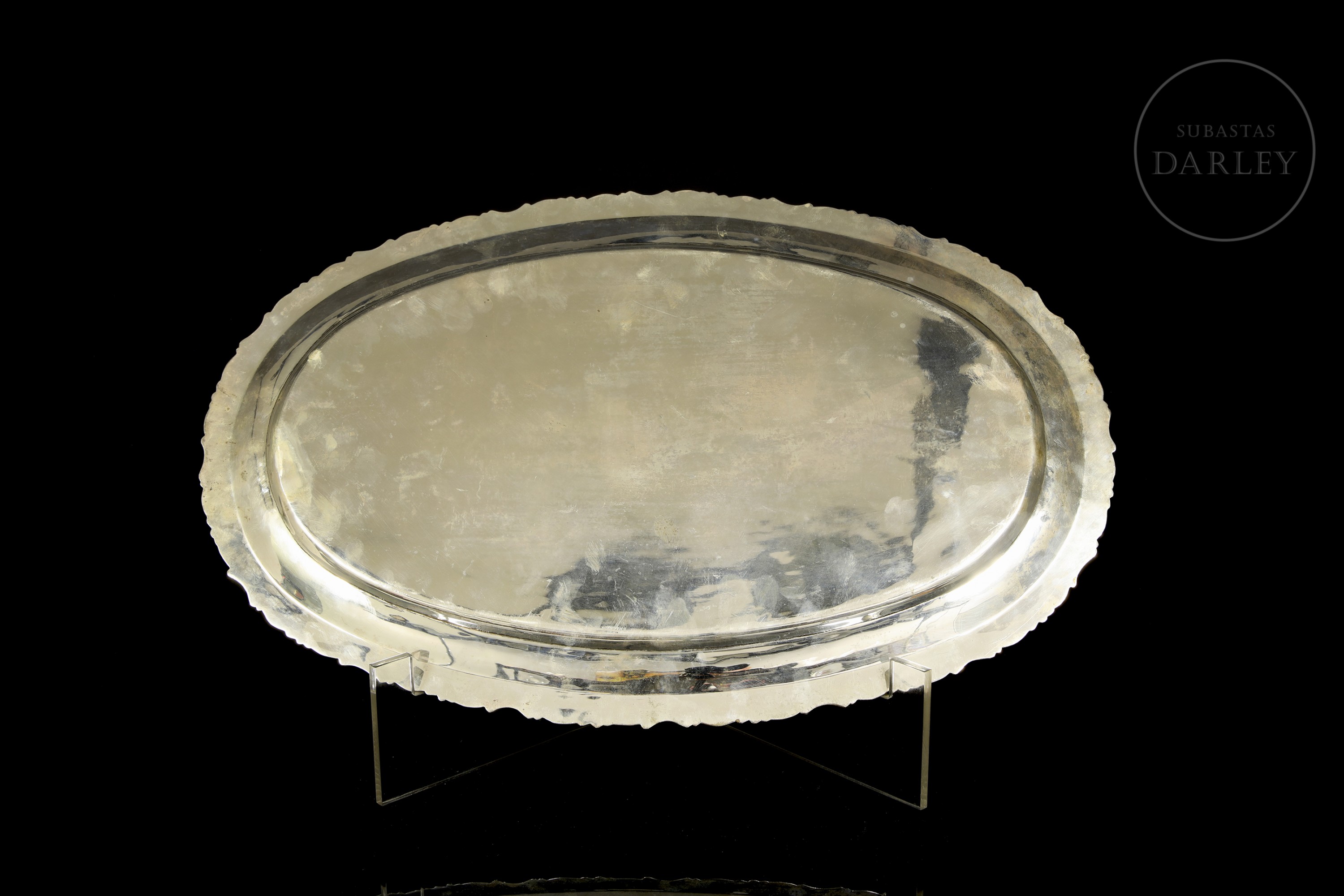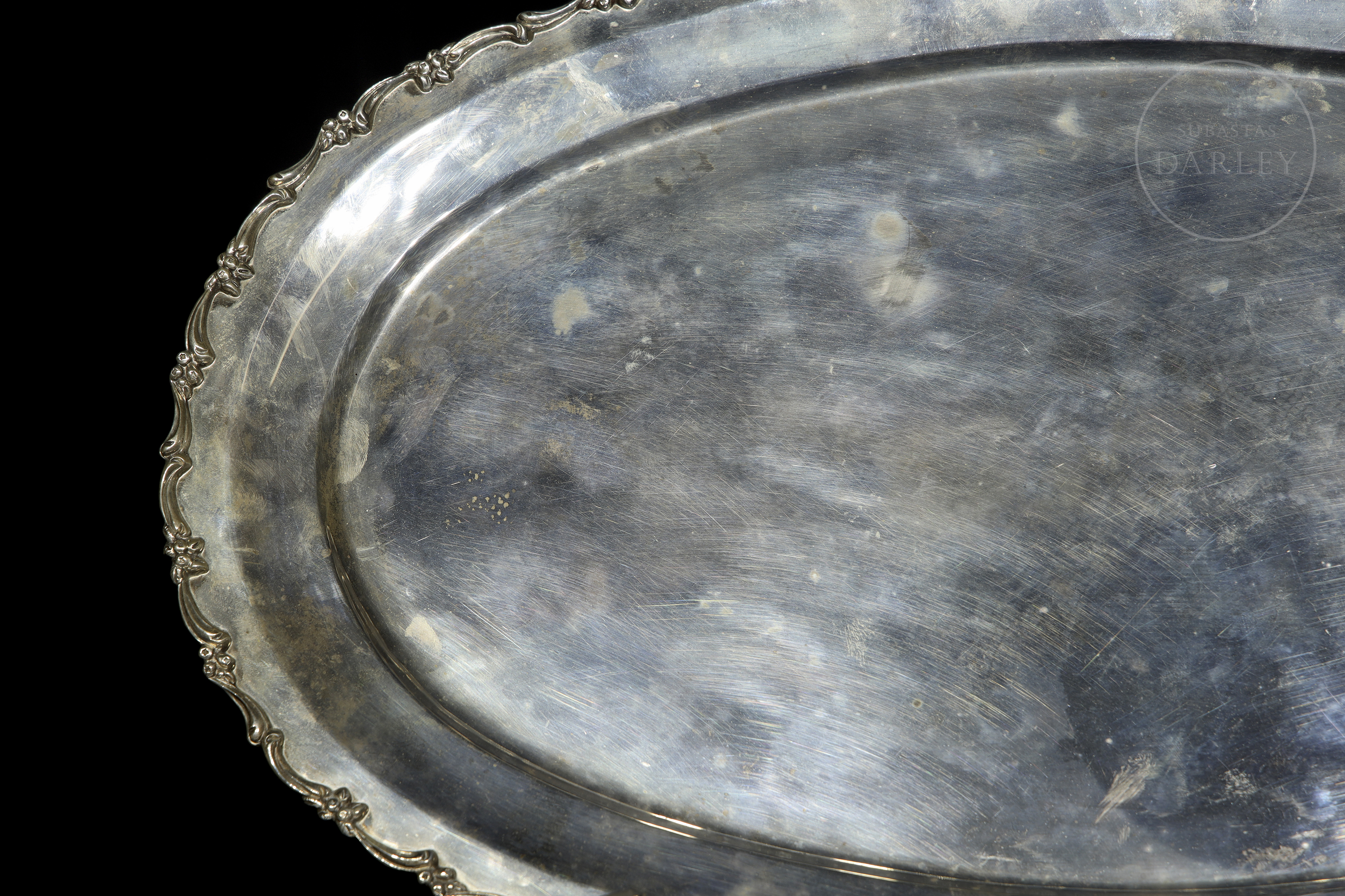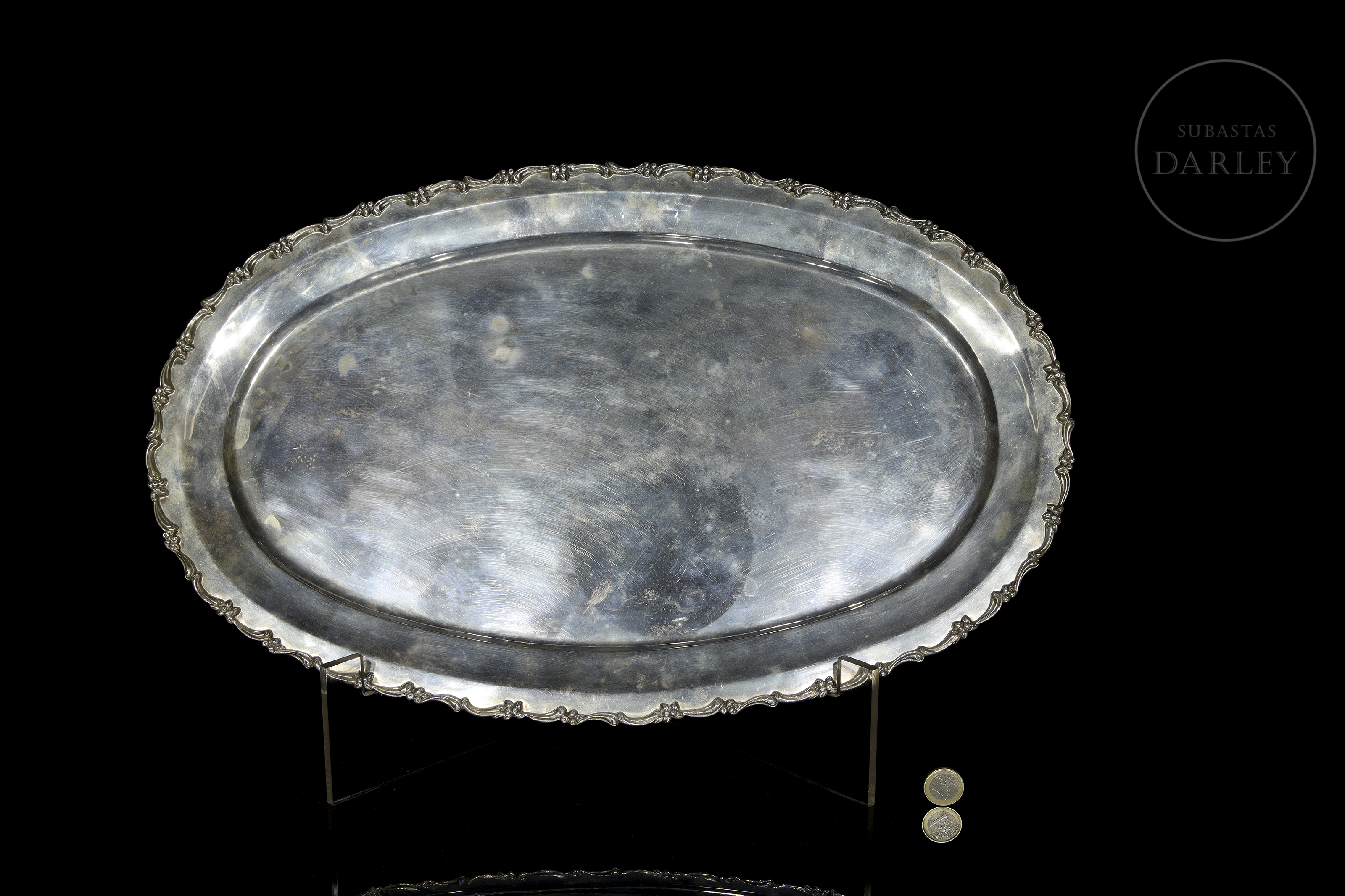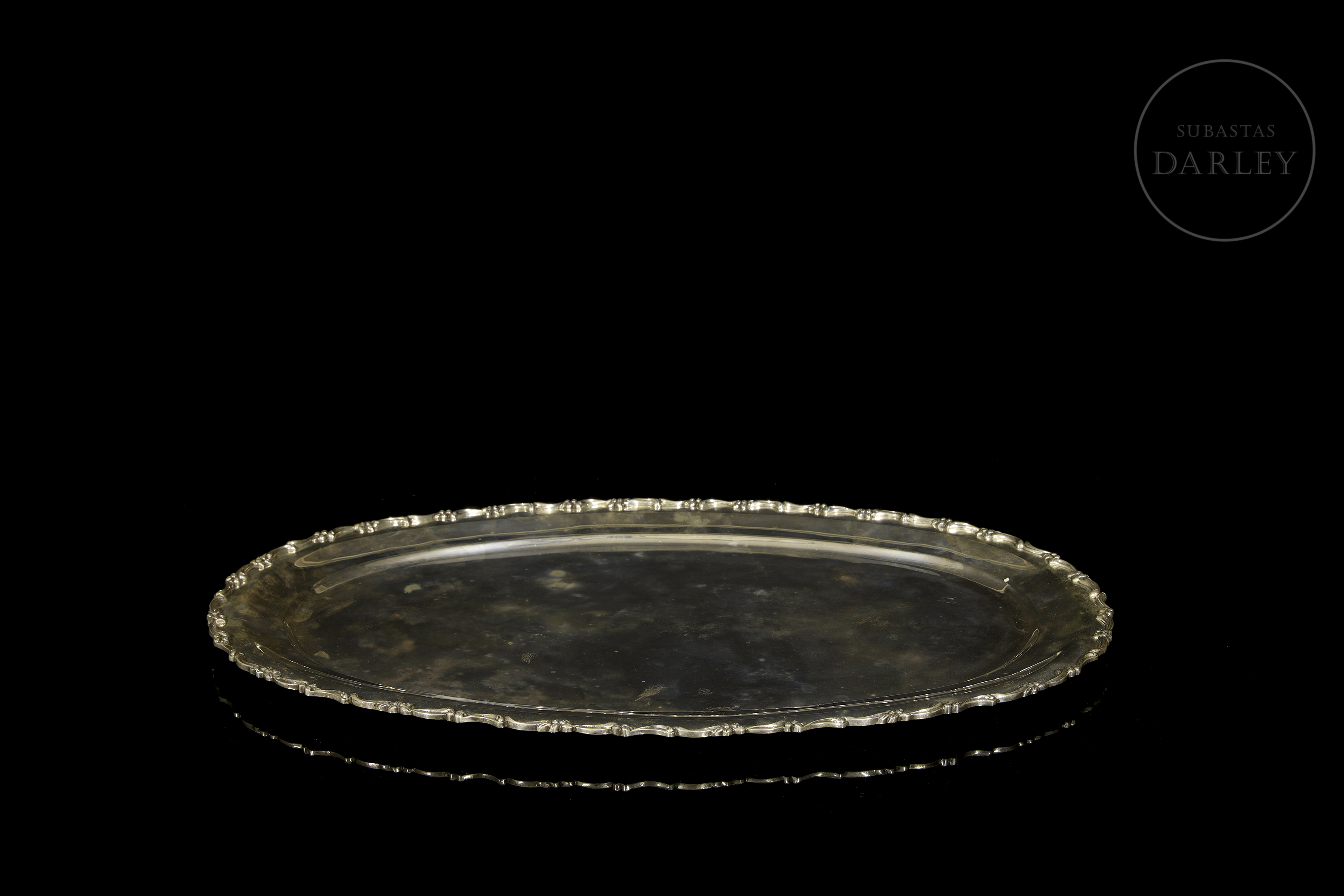 Oval silver tray with decorative embossed border featuring scrolls and small flowers.