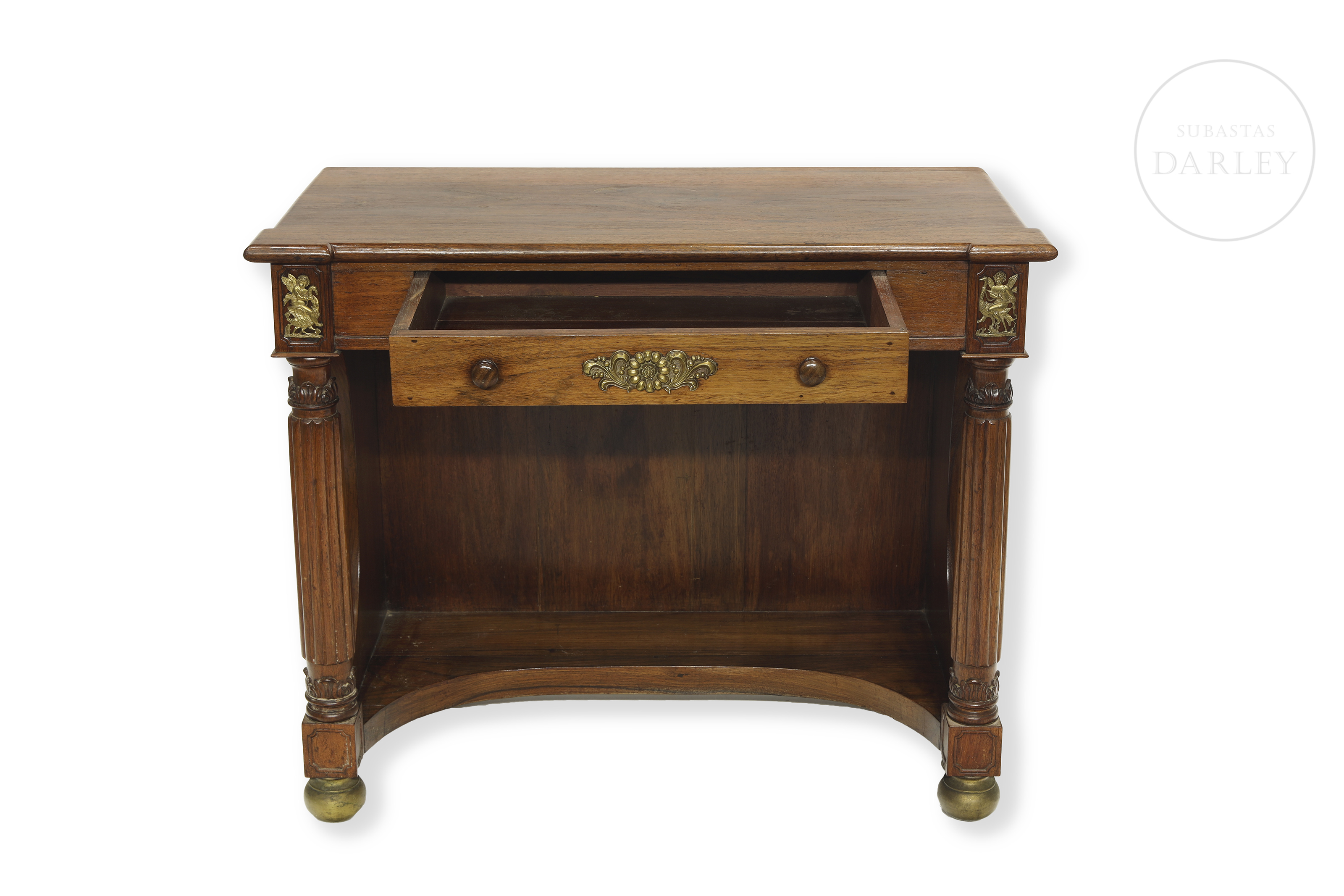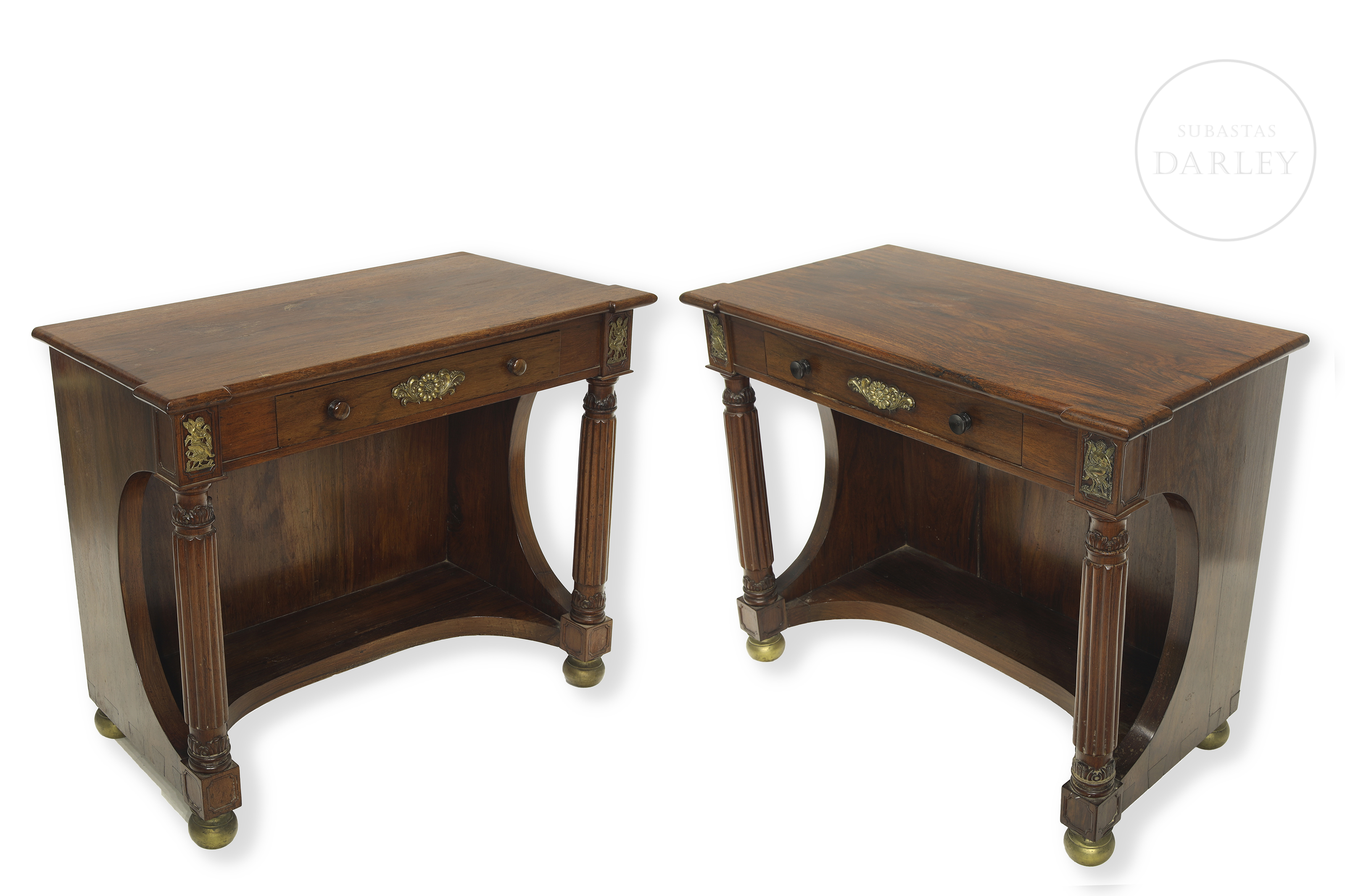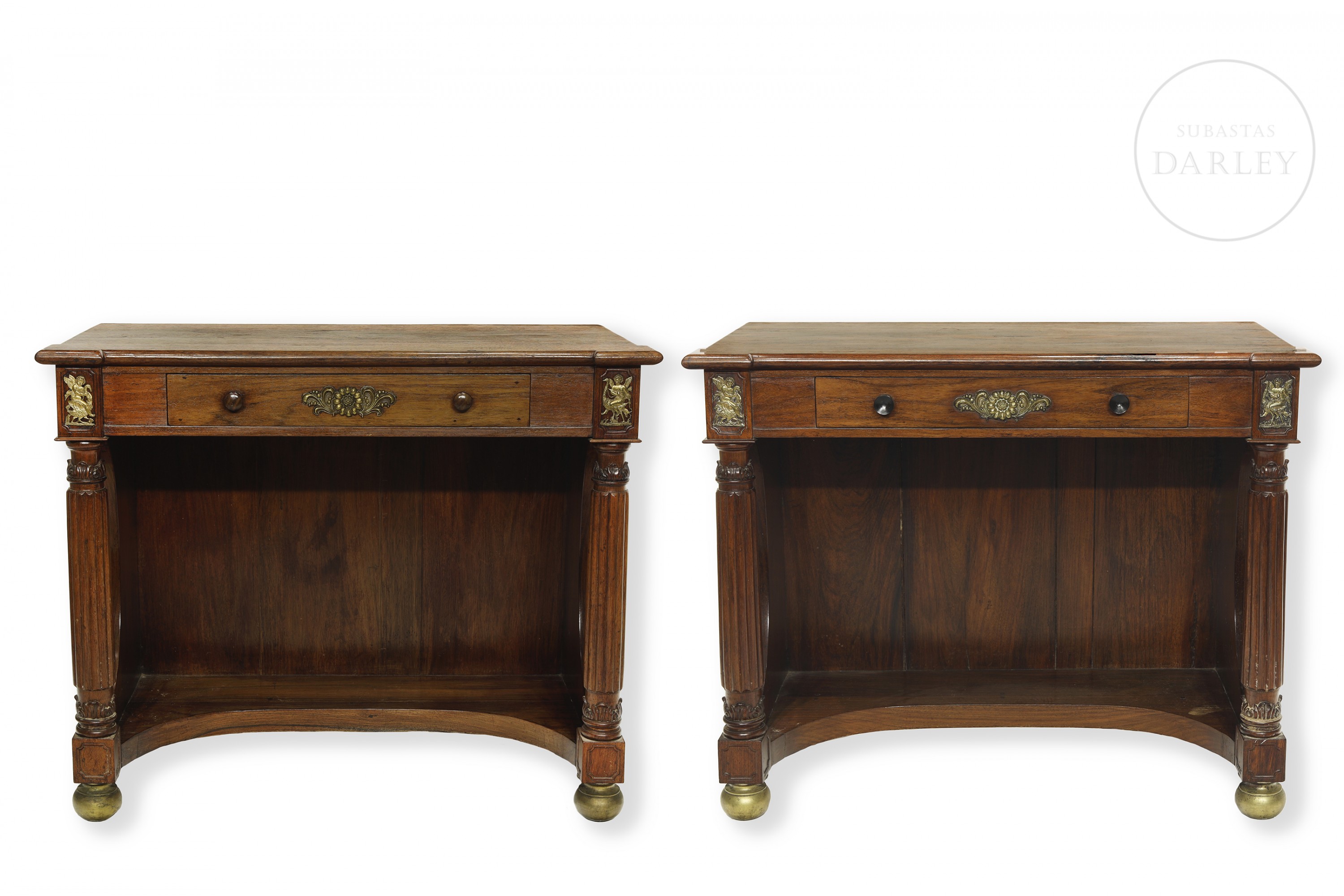 Two Empire-style wooden consoles with rectangular tops and front drawers. Decorated with gold metal appliqués and two front supports in the shape of fluted columns. No visible signature or manufacturer's mark.