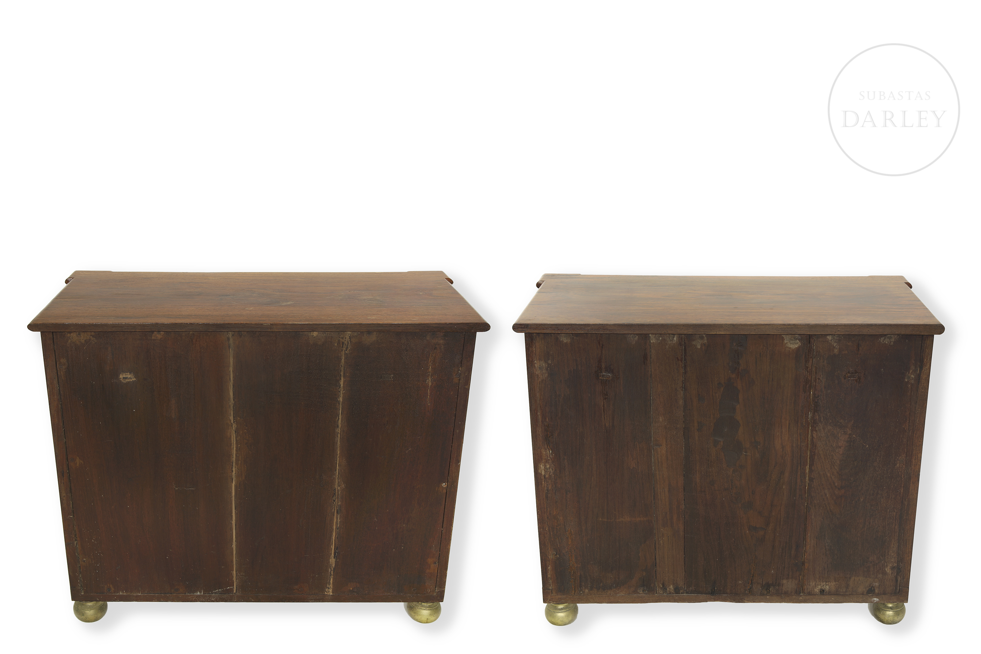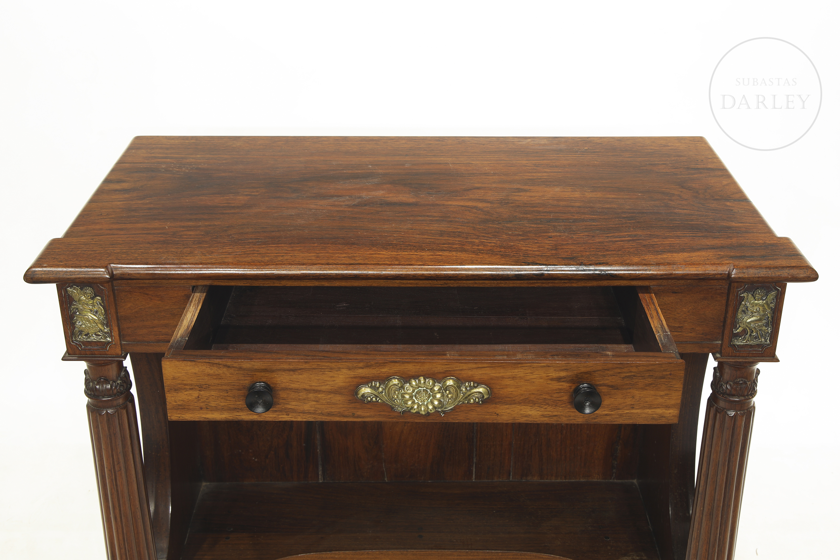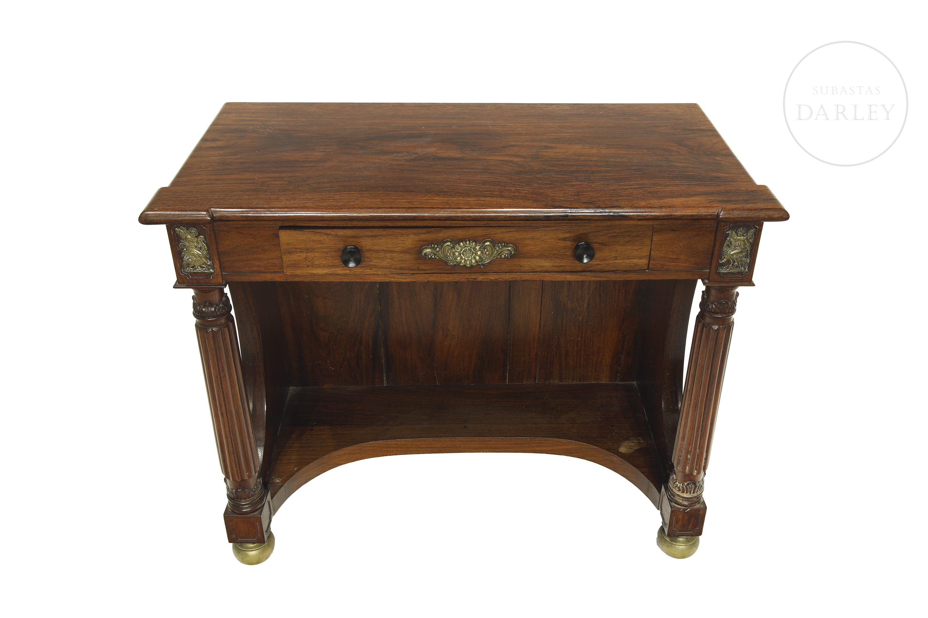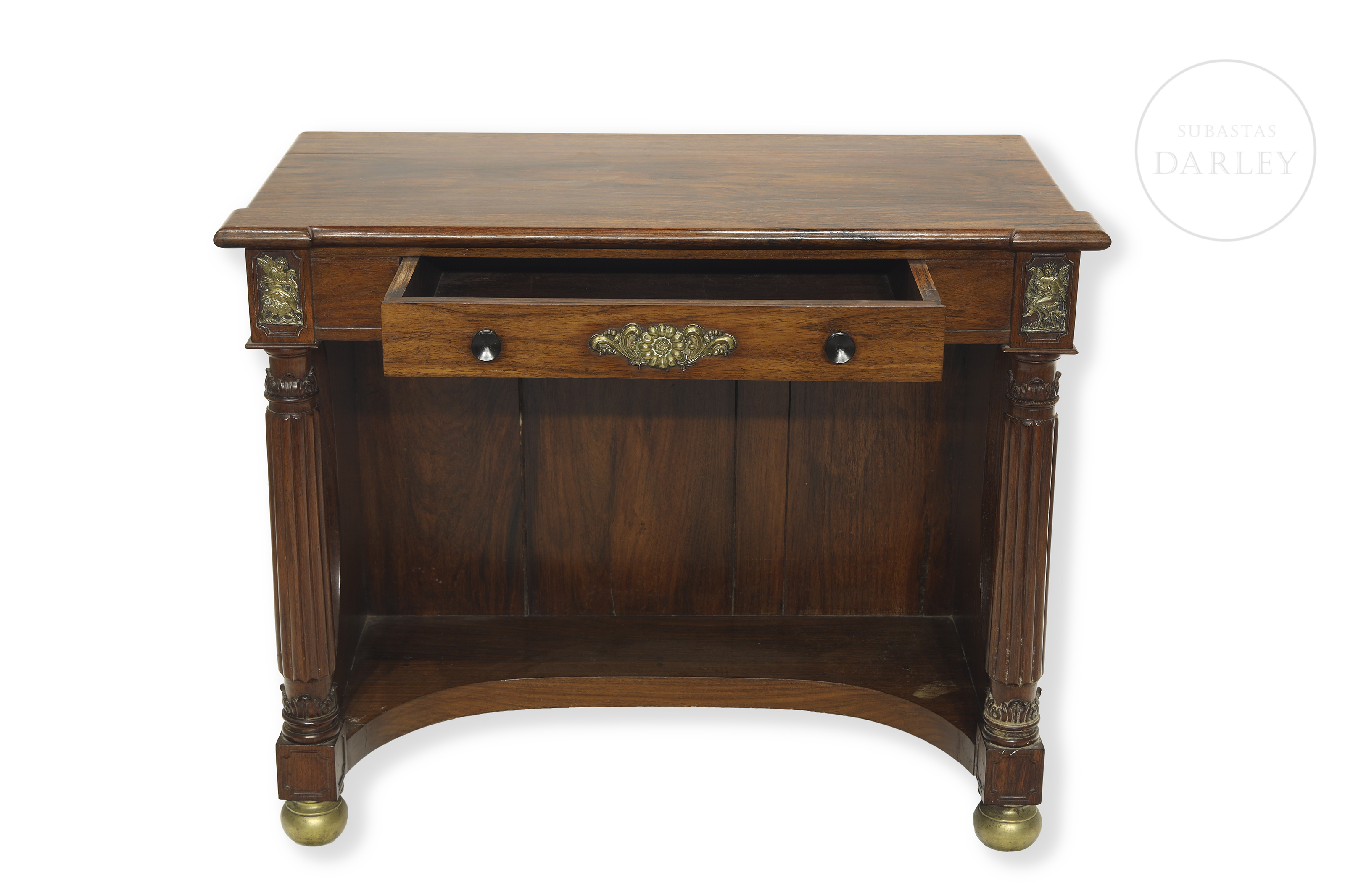 Two Empire-style wooden consoles with rectangular tops and front drawers. Decorated with gold metal appliqués and two front supports in the shape of fluted columns. No visible signature or manufacturer's mark.