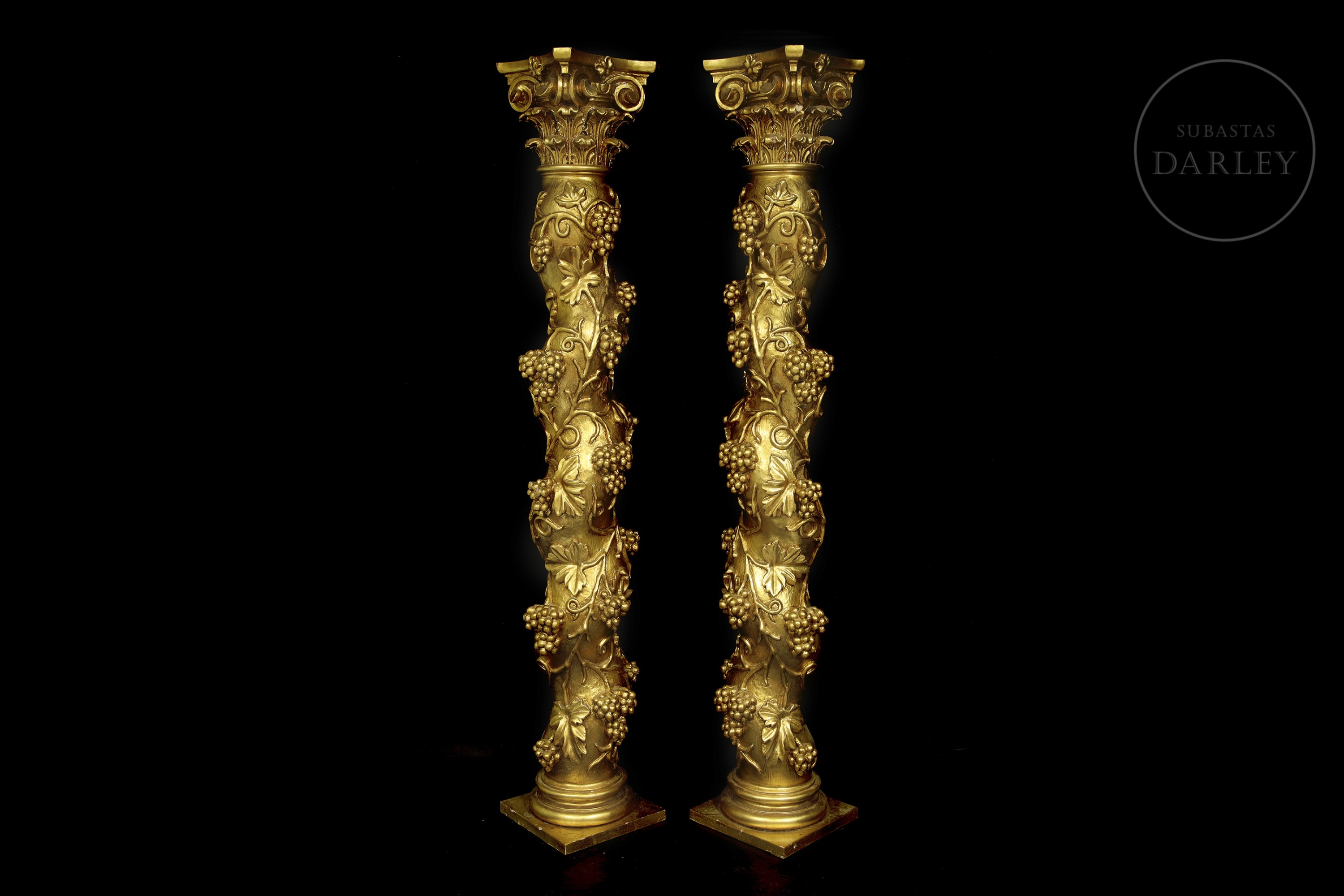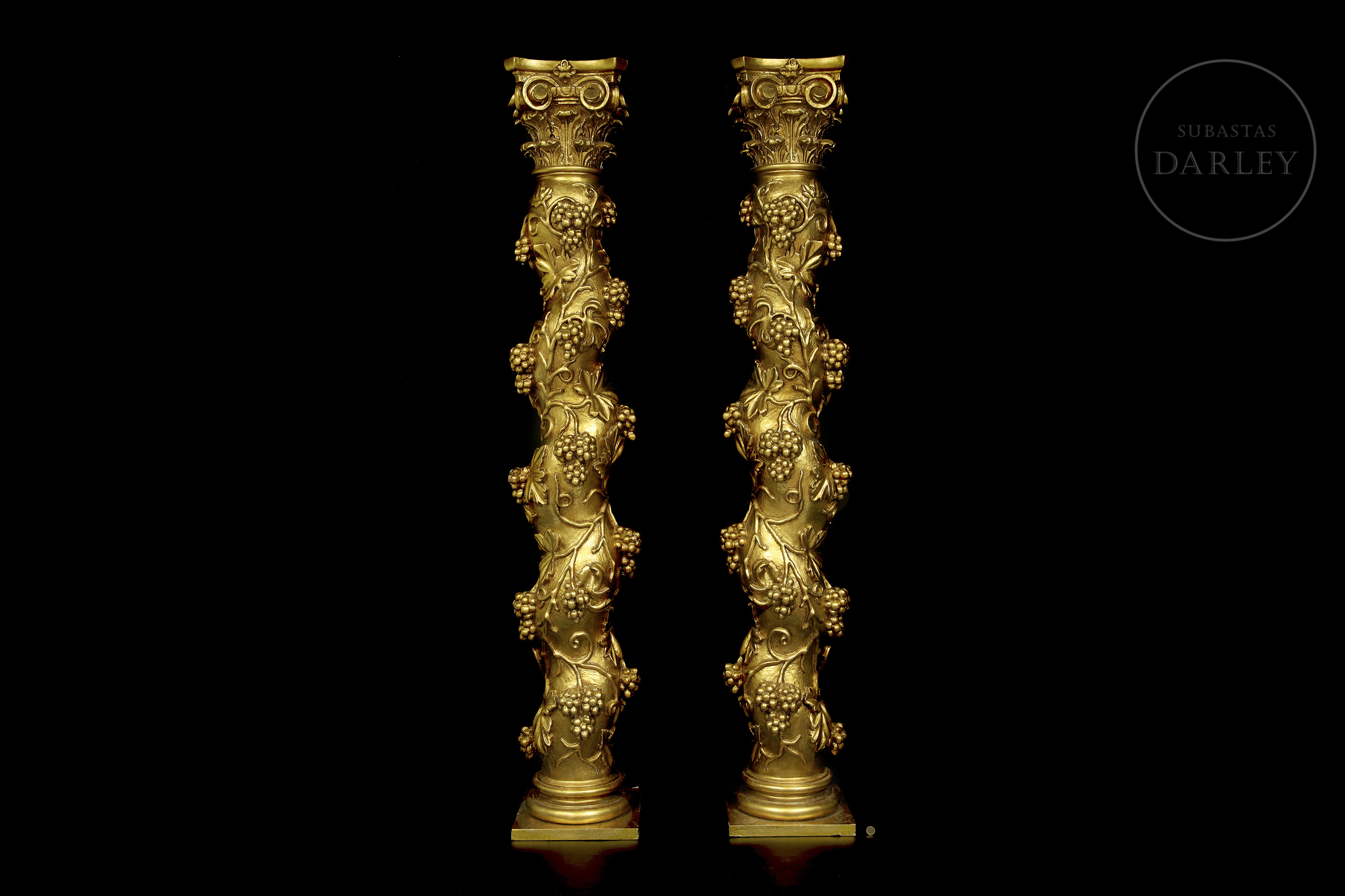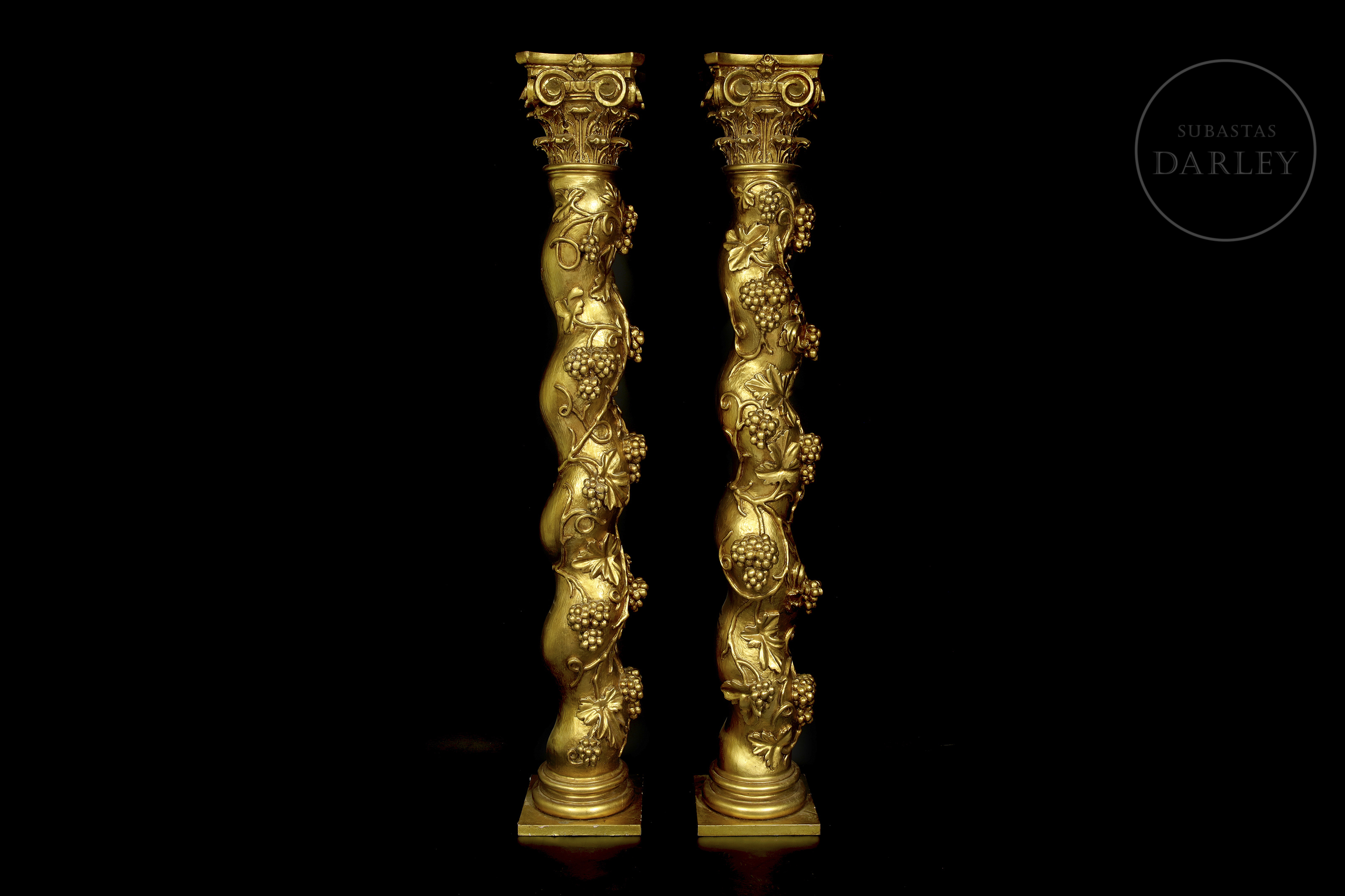 Carved and gilded wood. Pair of Solomonic columns with helical shafts, richly carved with a spiral of vine leaves and bunches of grapes in round relief. The columns are topped with gilded composite capitals and rest on square bases.