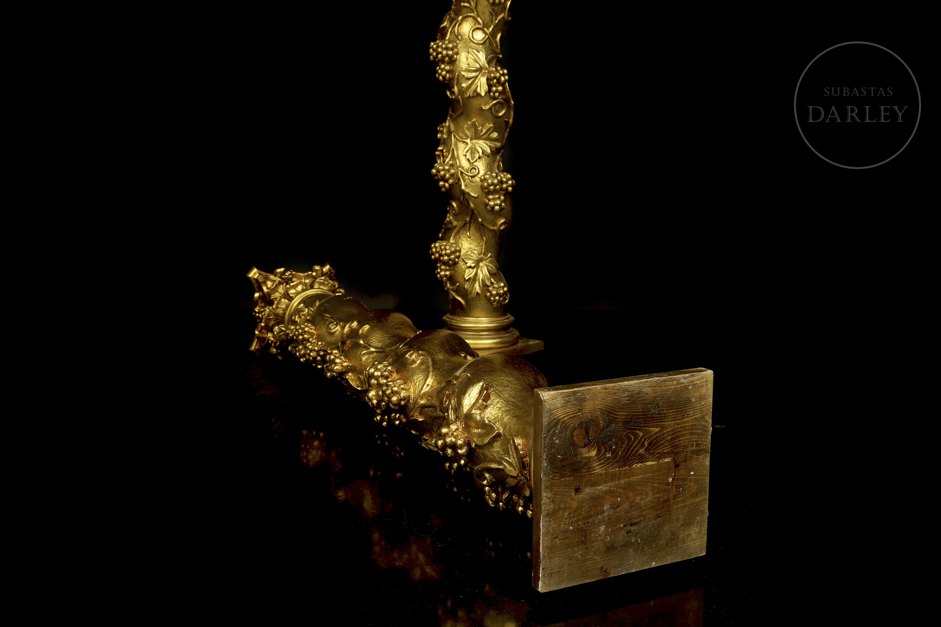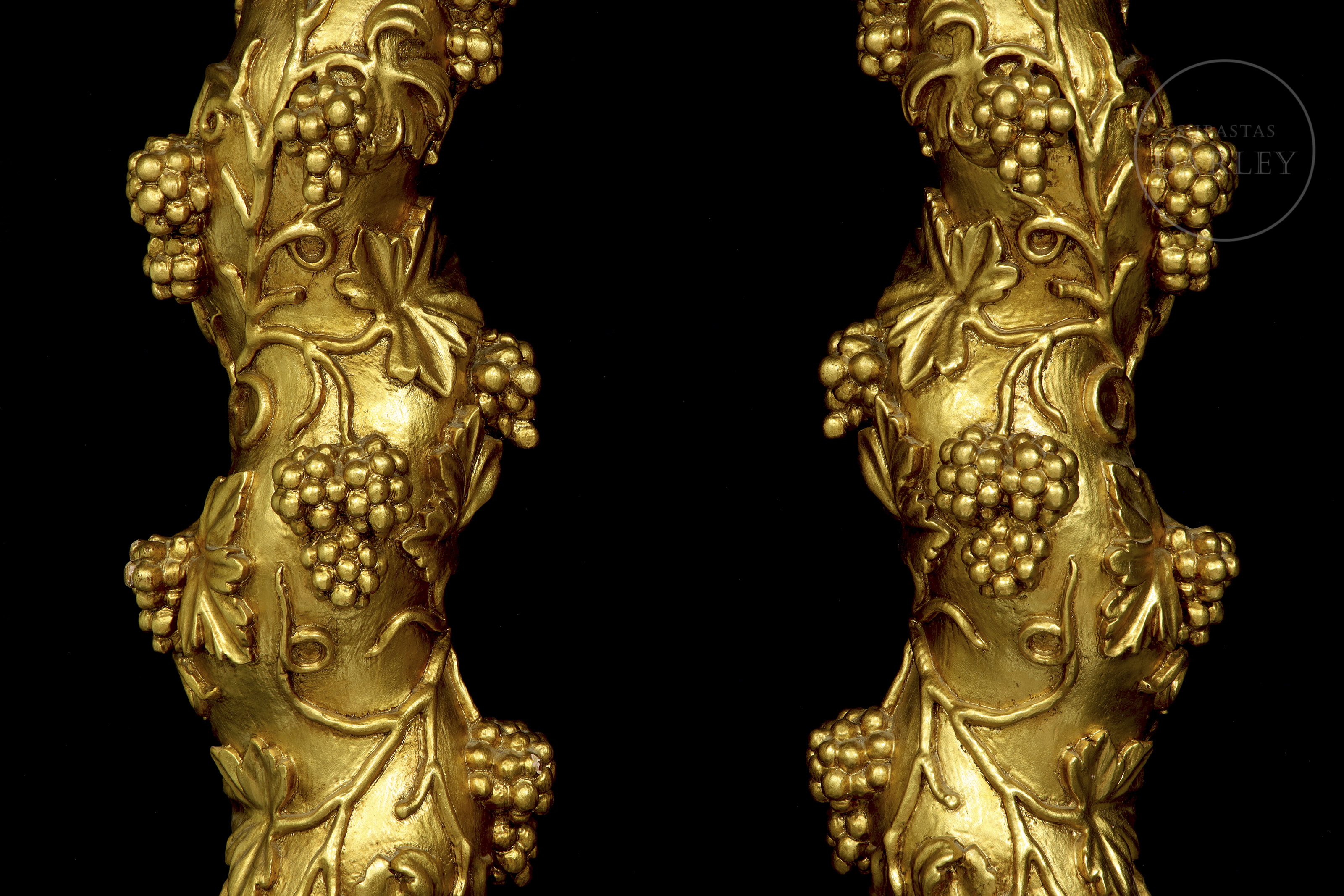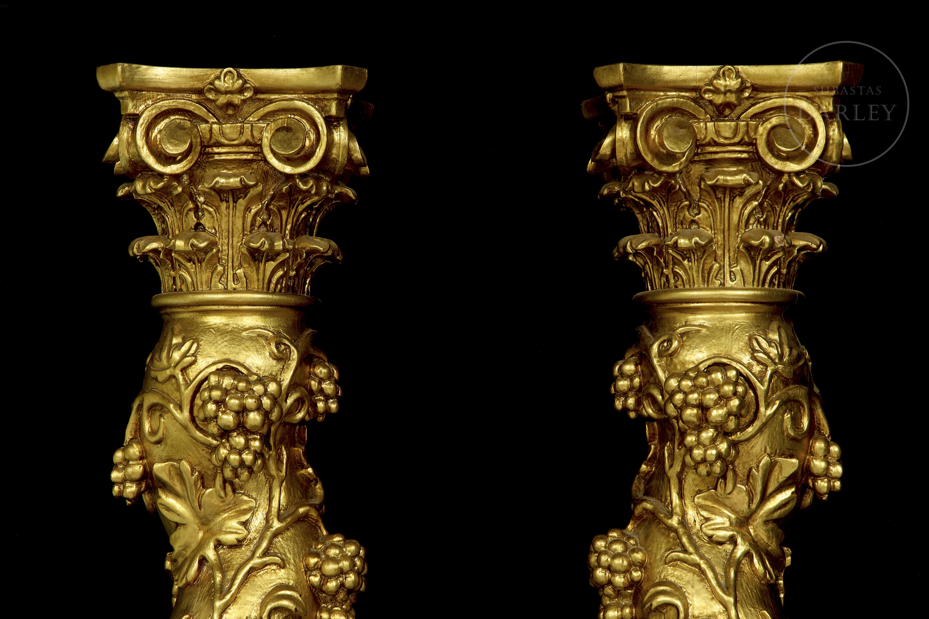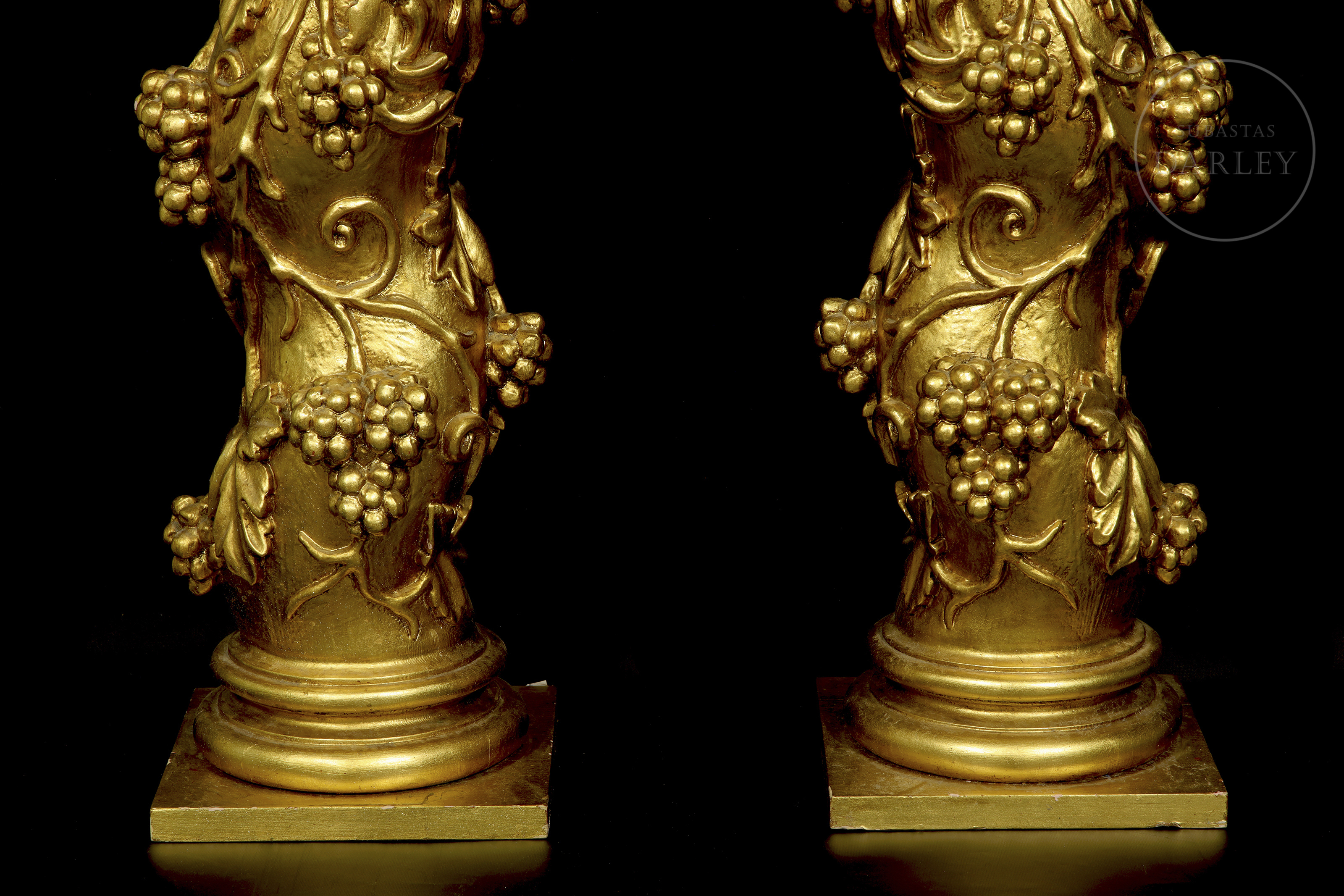 Carved and gilded wood. Pair of Solomonic columns with helical shafts, richly carved with a spiral of vine leaves and bunches of grapes in round relief. The columns are topped with gilded composite capitals and rest on square bases.