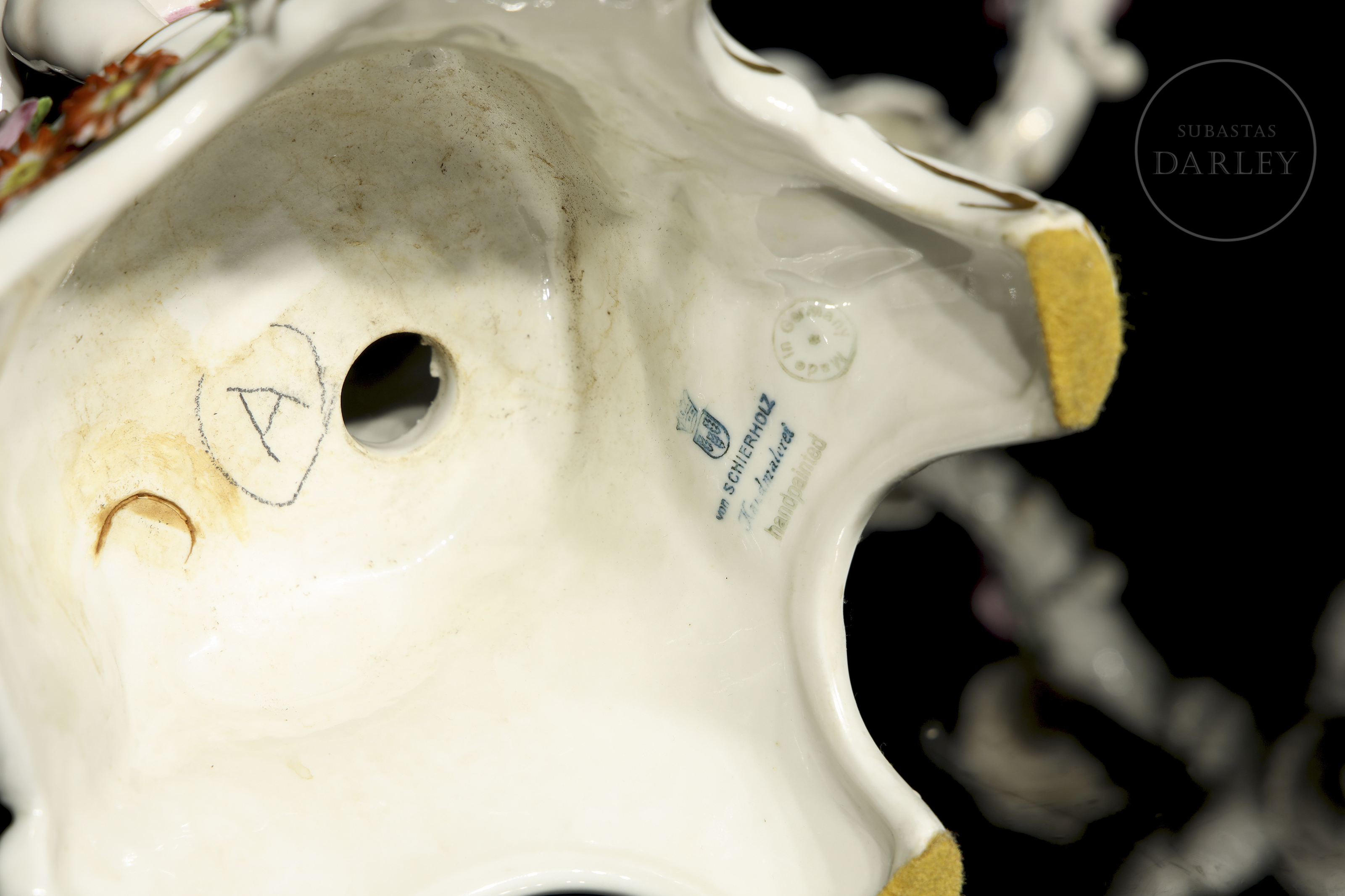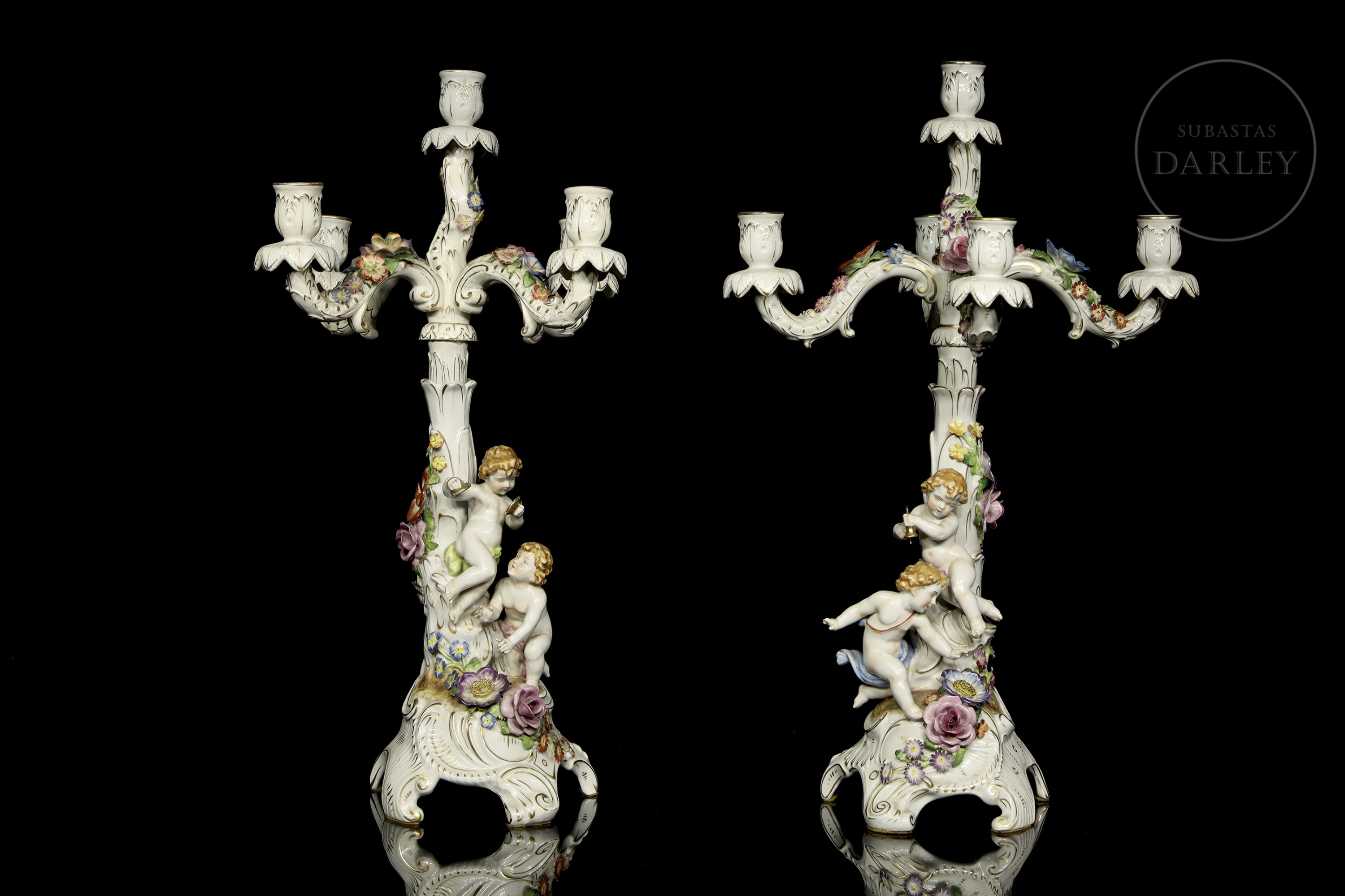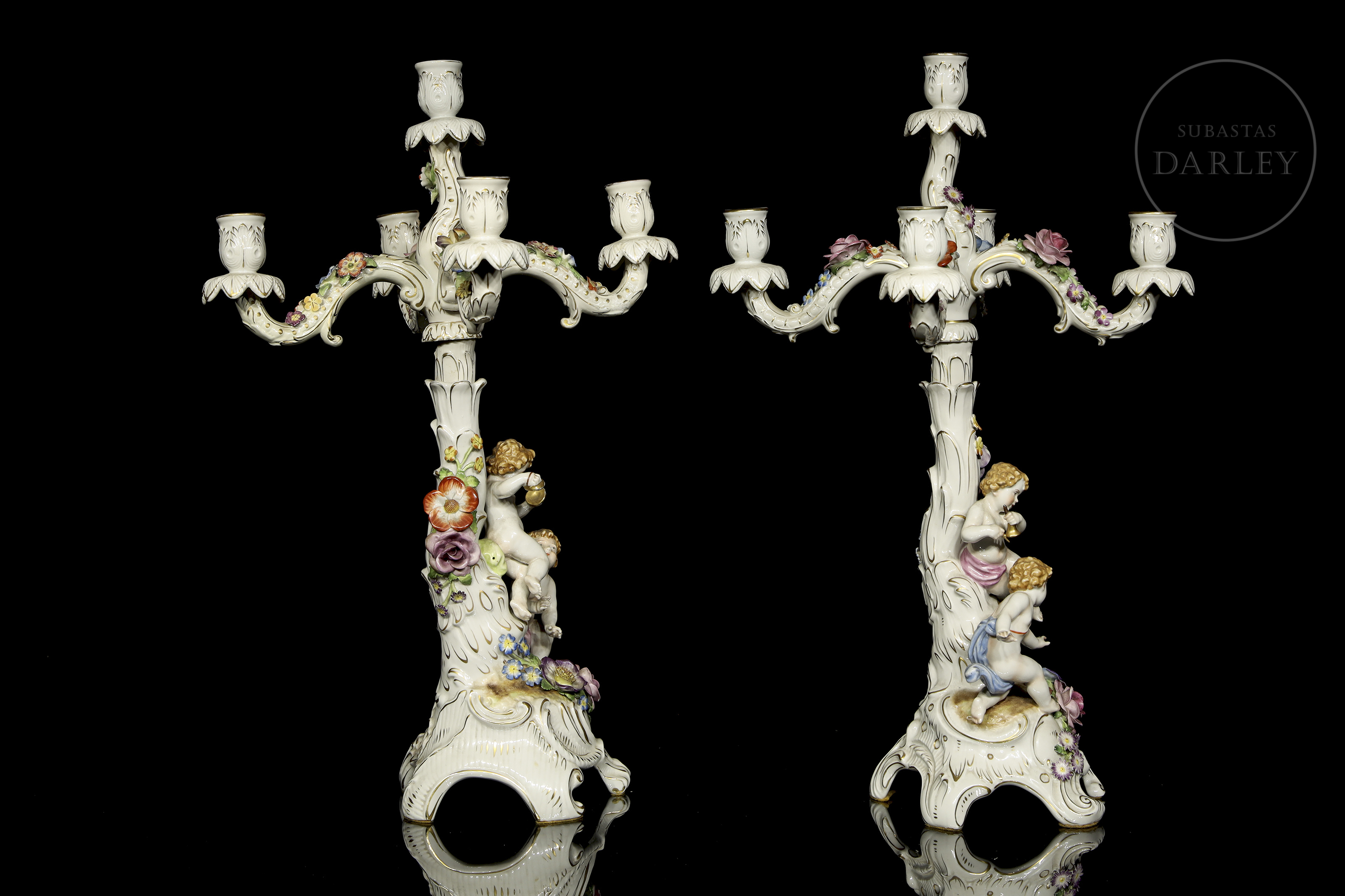 Pair of five-light candelabra, made of white porcelain with sculptural elements in the round. The base and shaft are profusely decorated with figures of Putti climbing and a large number of individually modelled and polychromed flowers. Von Schierholz Porzellan Manufaktur.