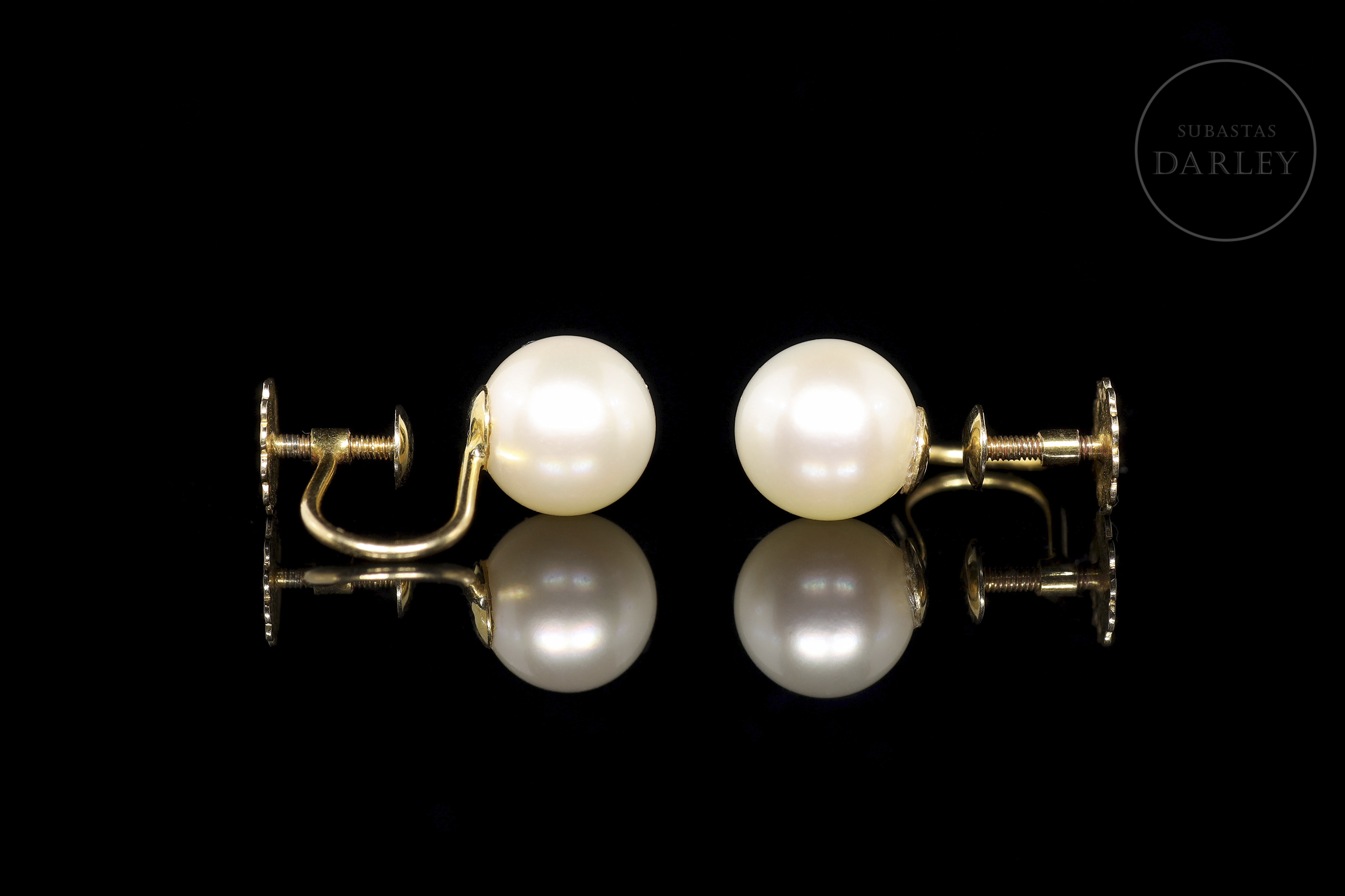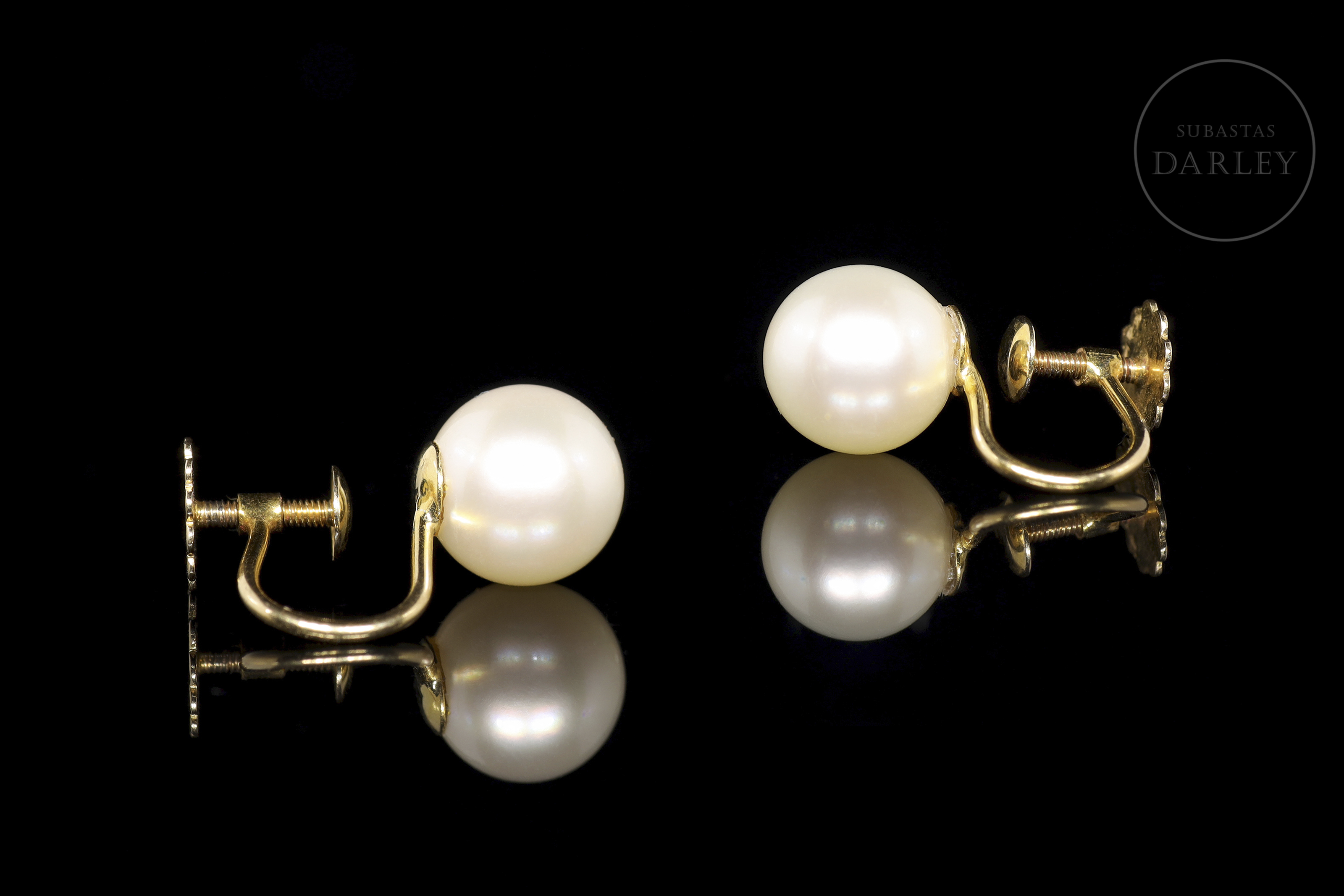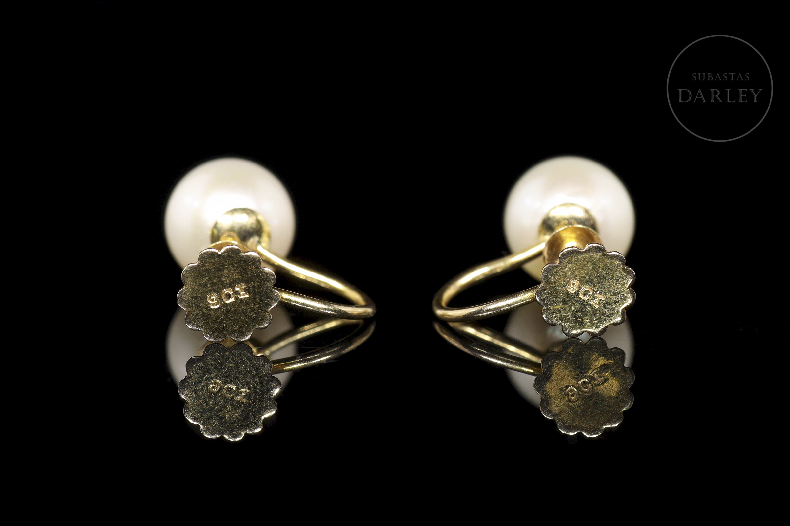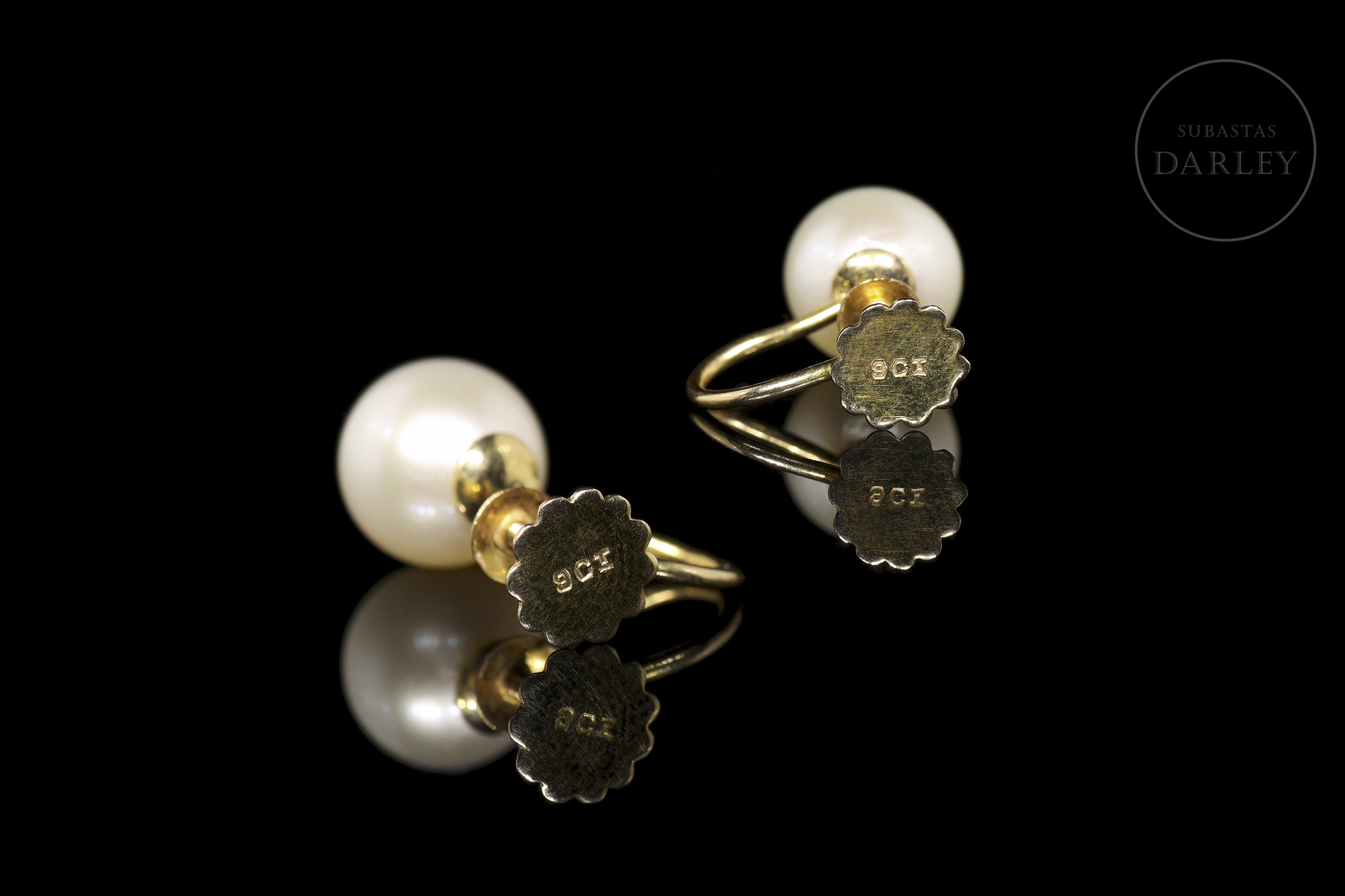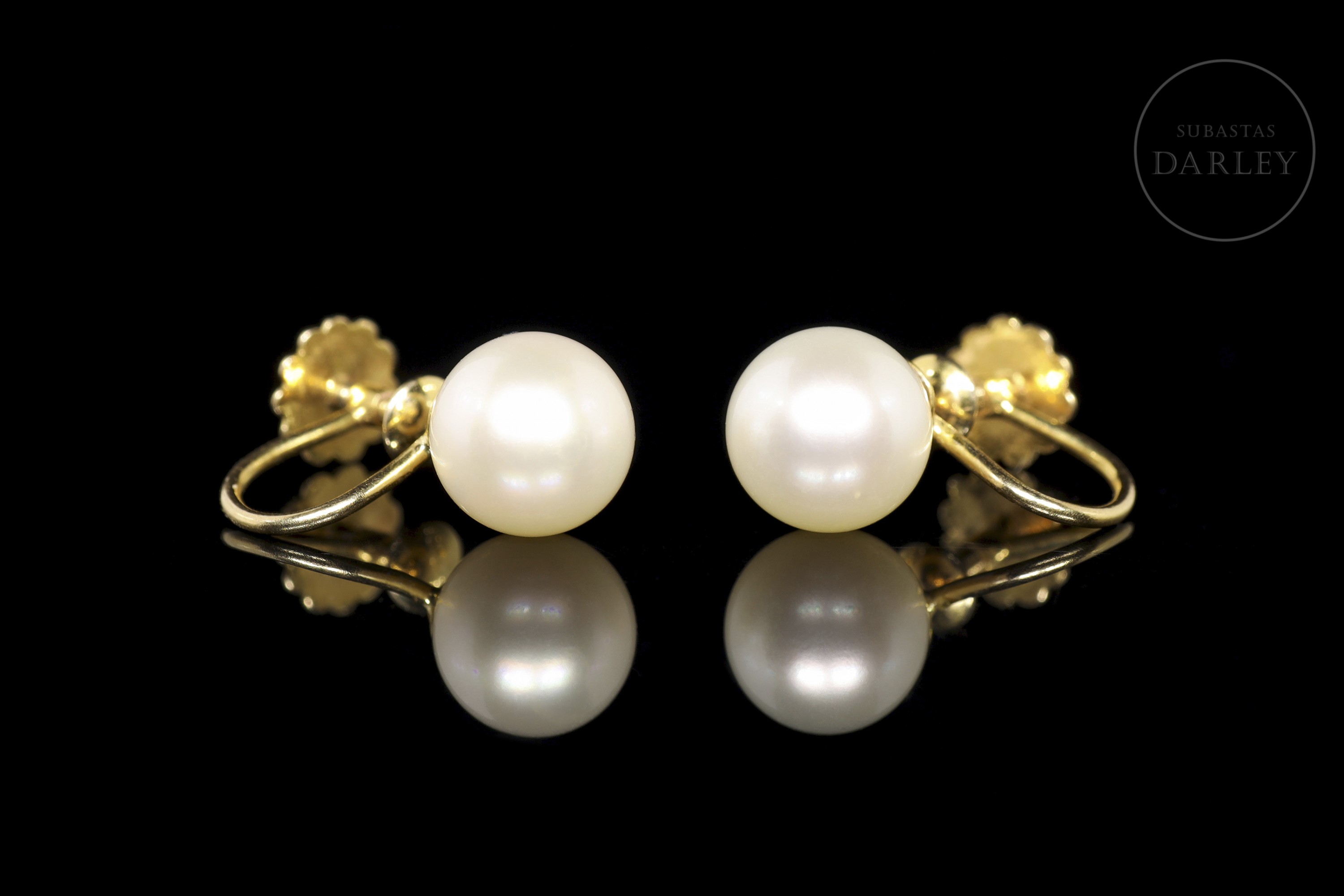 9k yellow gold earrings with a simple design, finished with a white pearl. Screw clasp.