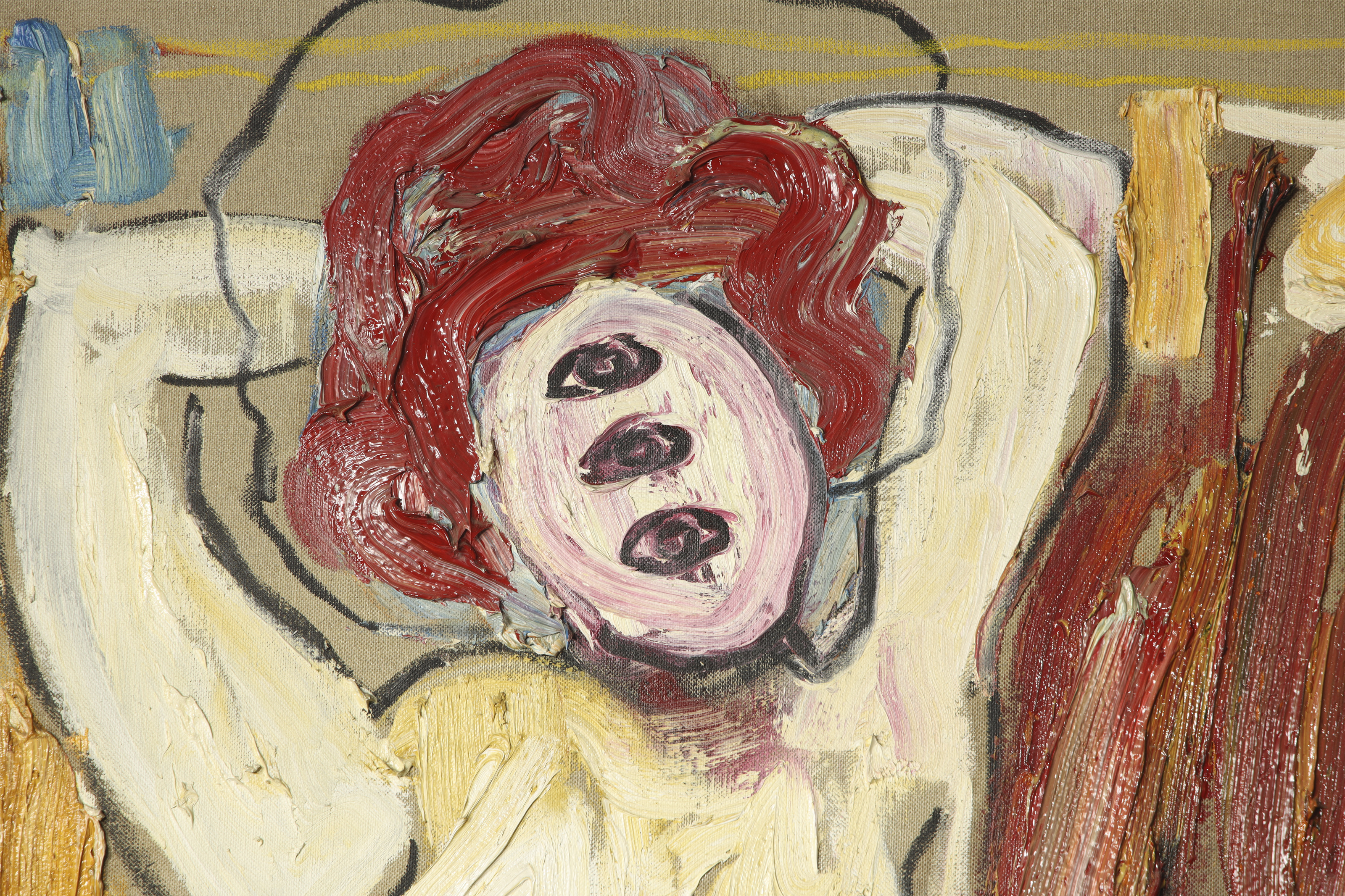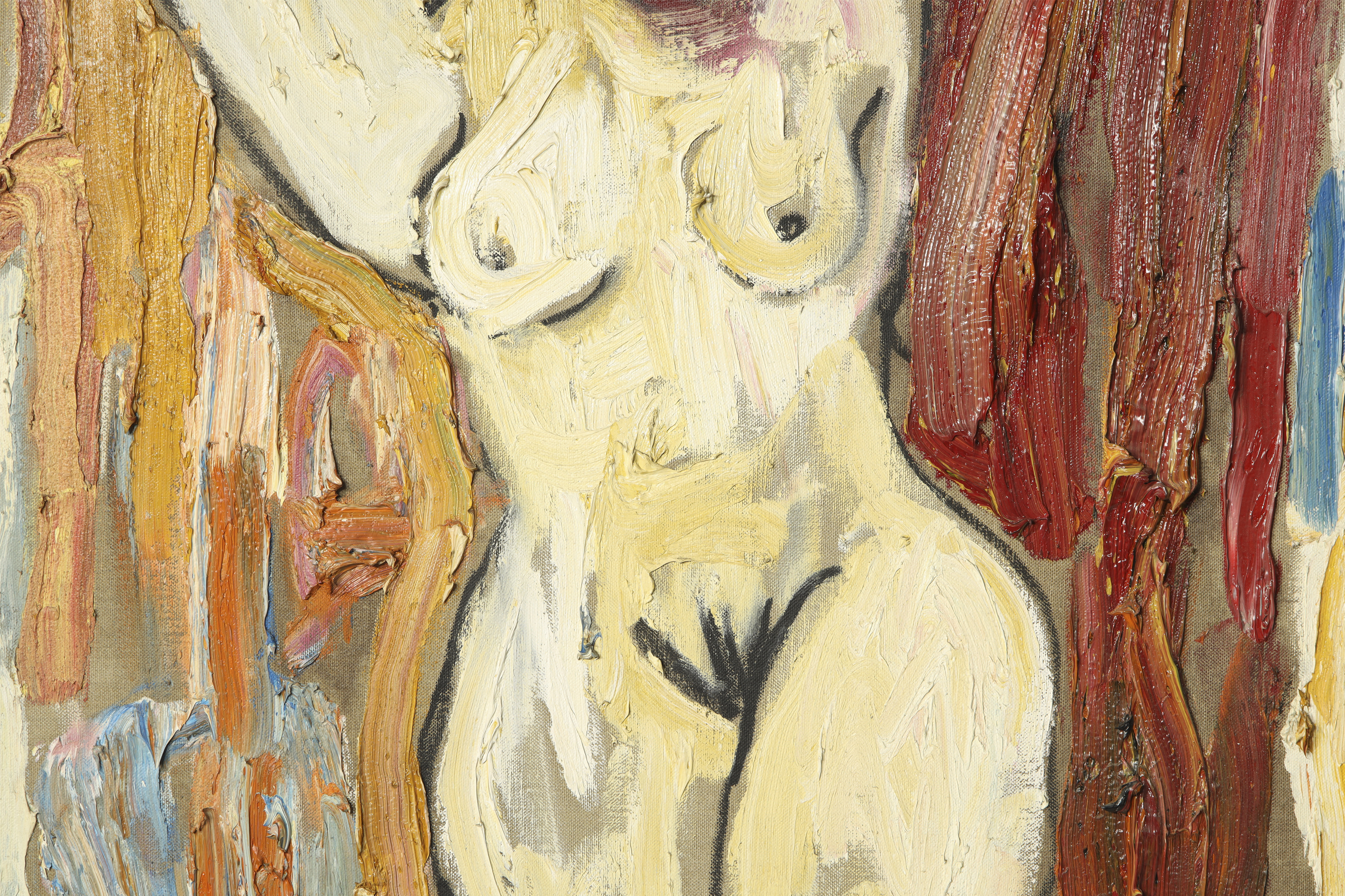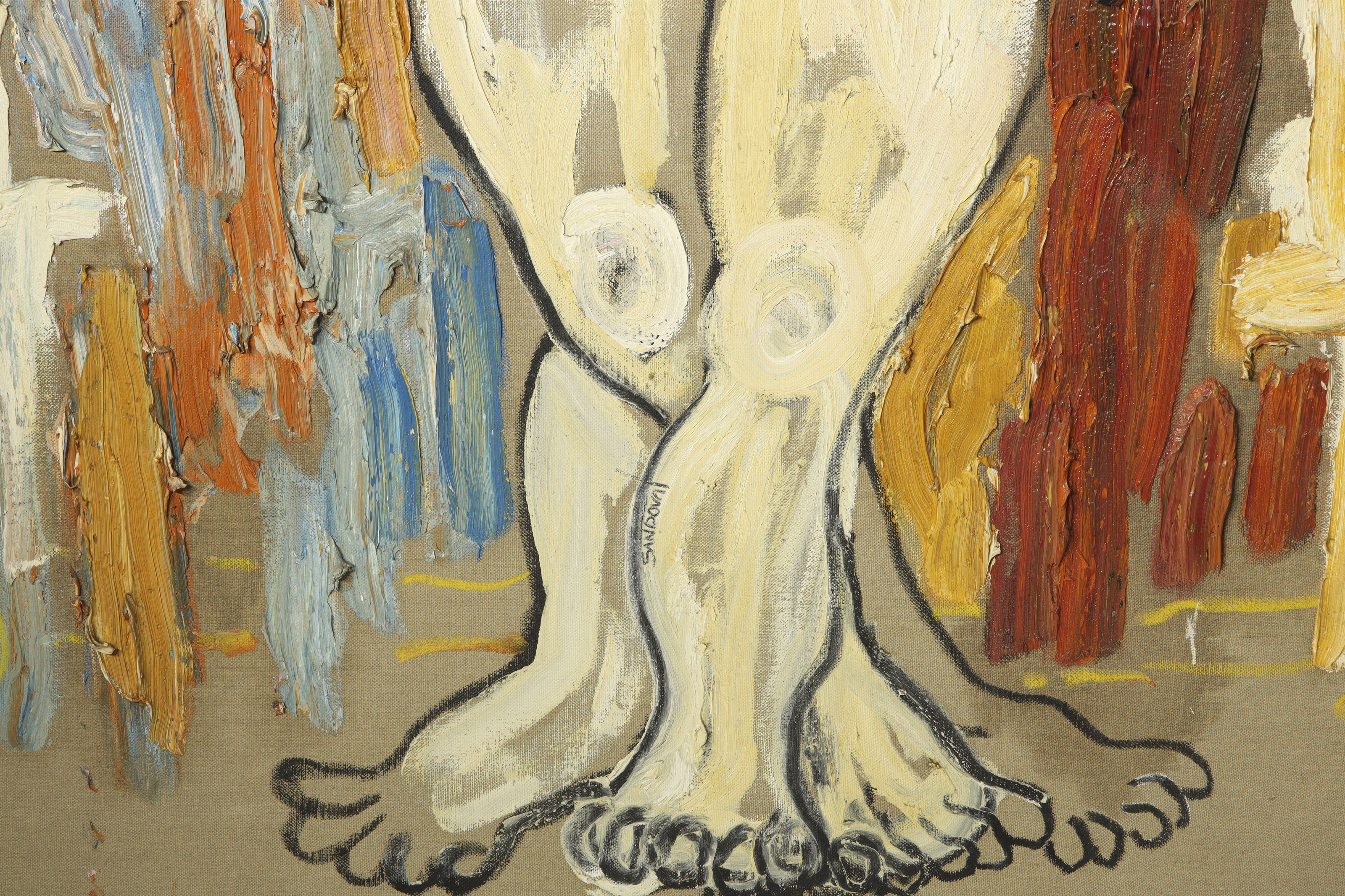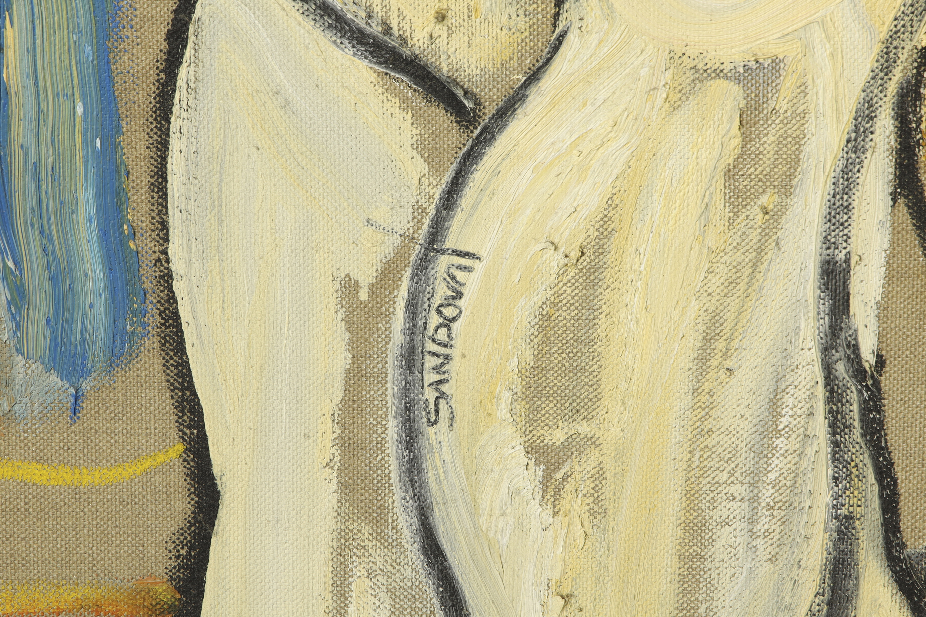 Oil on canvas. The artist's characteristic neo-expressionist style is evident in his depiction of this female figure. Signed “Sandoval” in the lower center of the work.