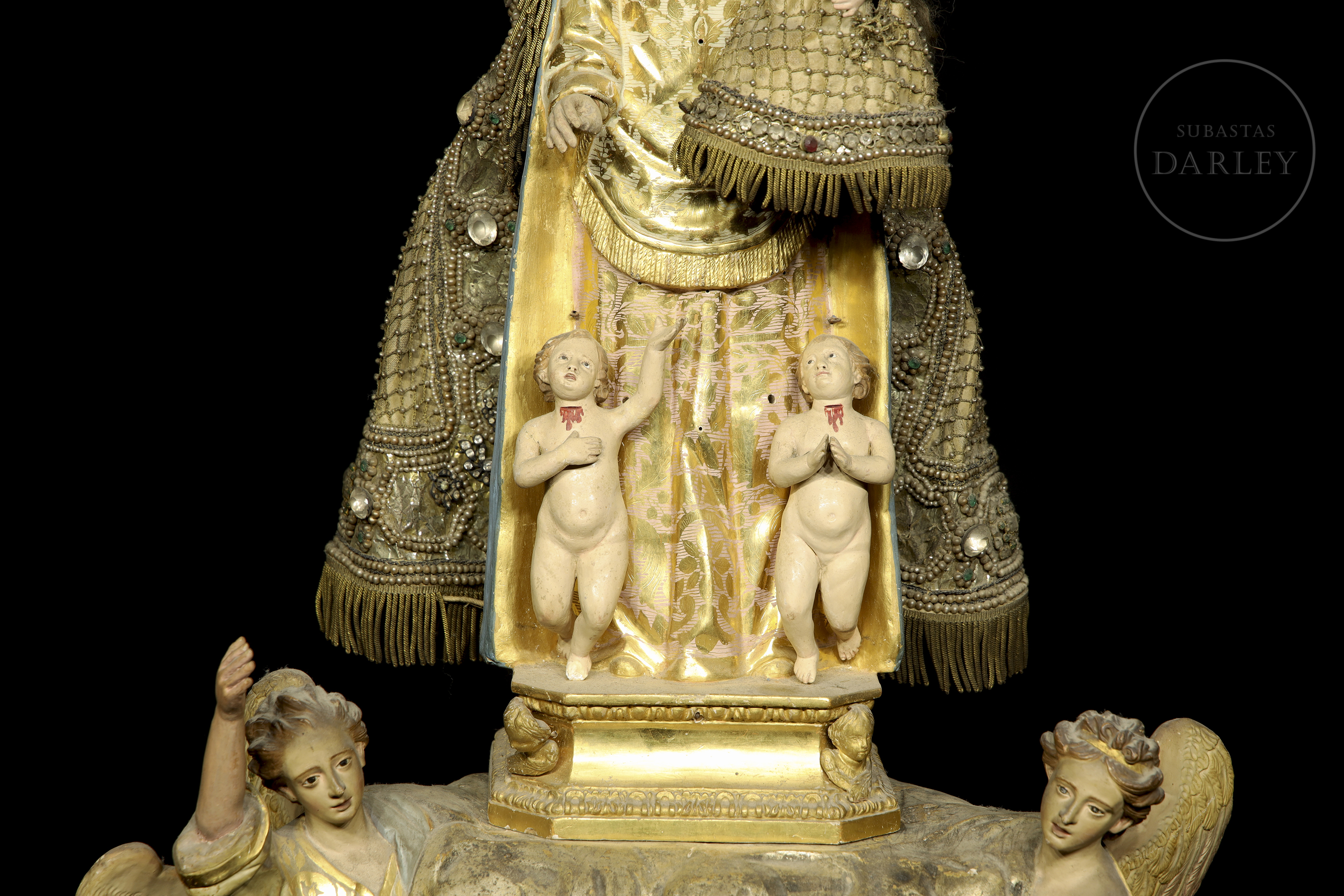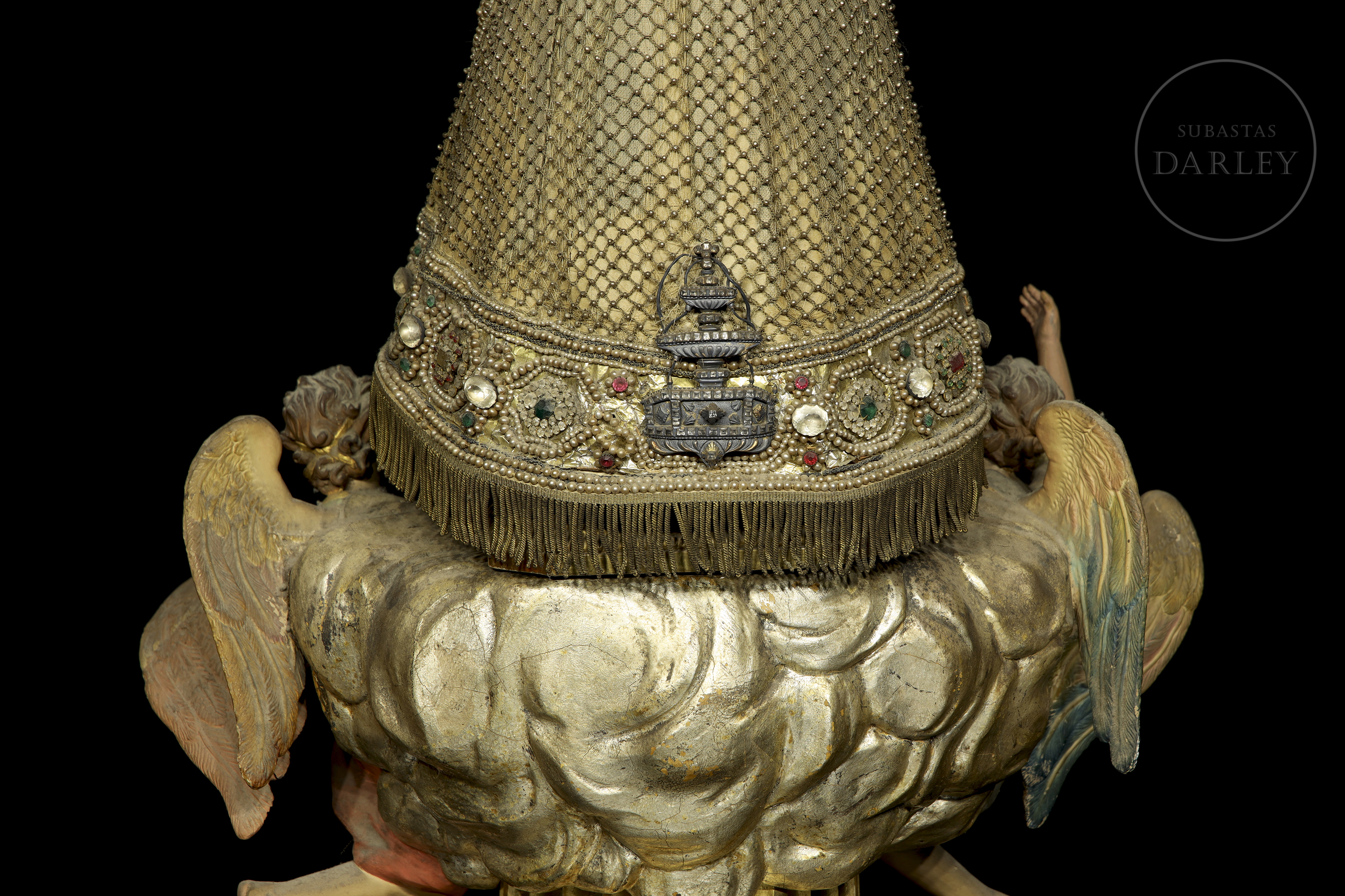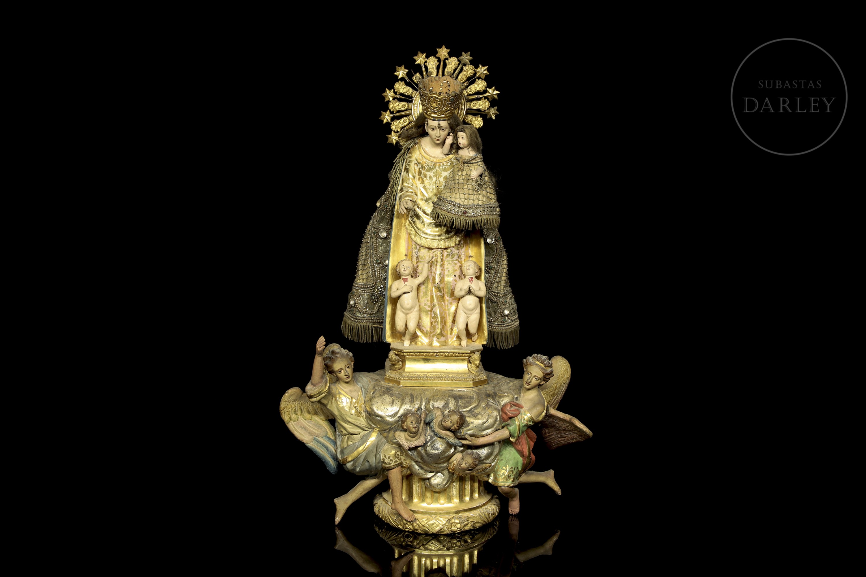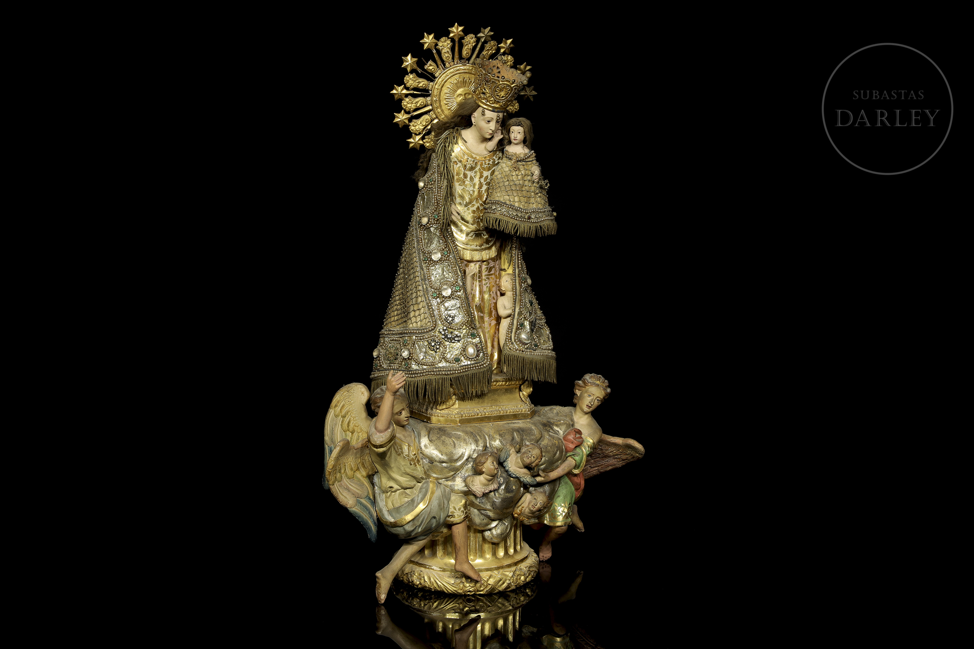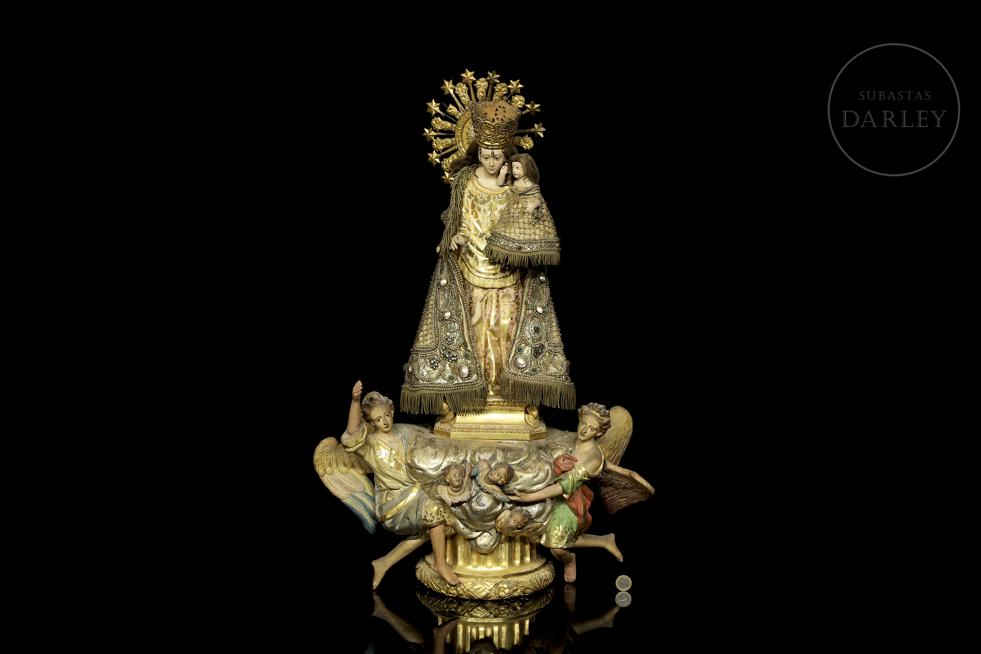 Devotional figure made of polychrome ceramic, with textile appliqués embroidered in gold and gemstones, and gilded metal elements. The Virgin, crowned and haloed by starry rays, carries the Baby Jesus on her right arm. She stands on a cloud supported by angels and cherubs, in a clear reference to traditional Valencian iconography. The meticulousness of the upholstery, the folds of the mantle, and the use of mixed materials are noteworthy, lending great visual and spiritual richness to the composition.
