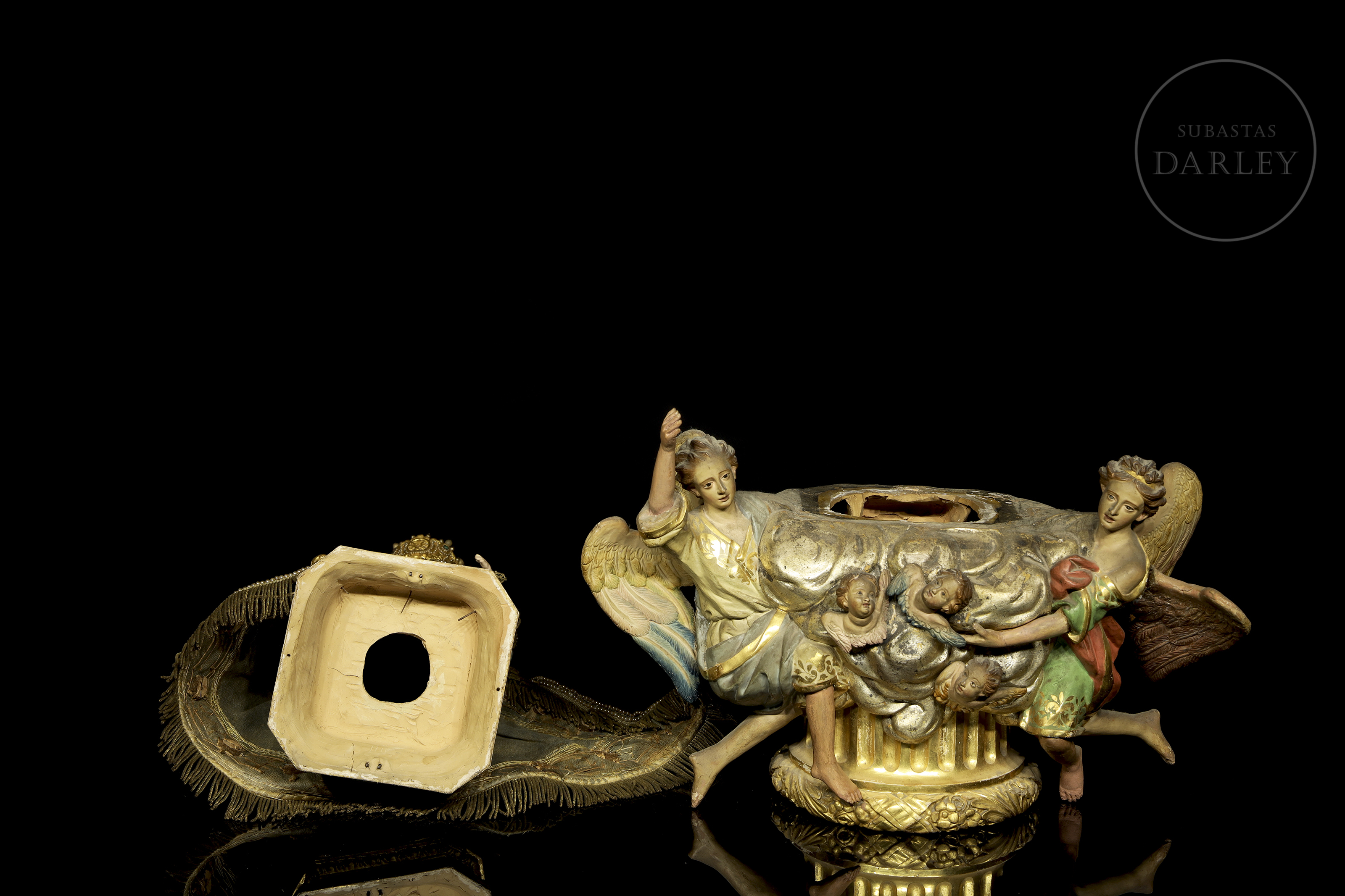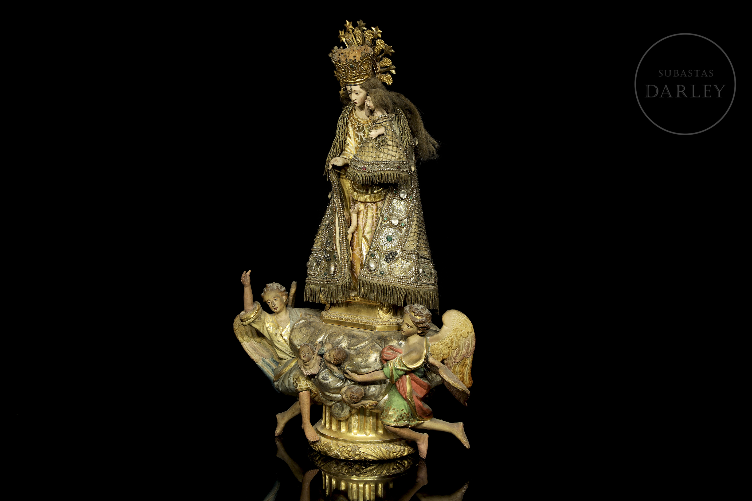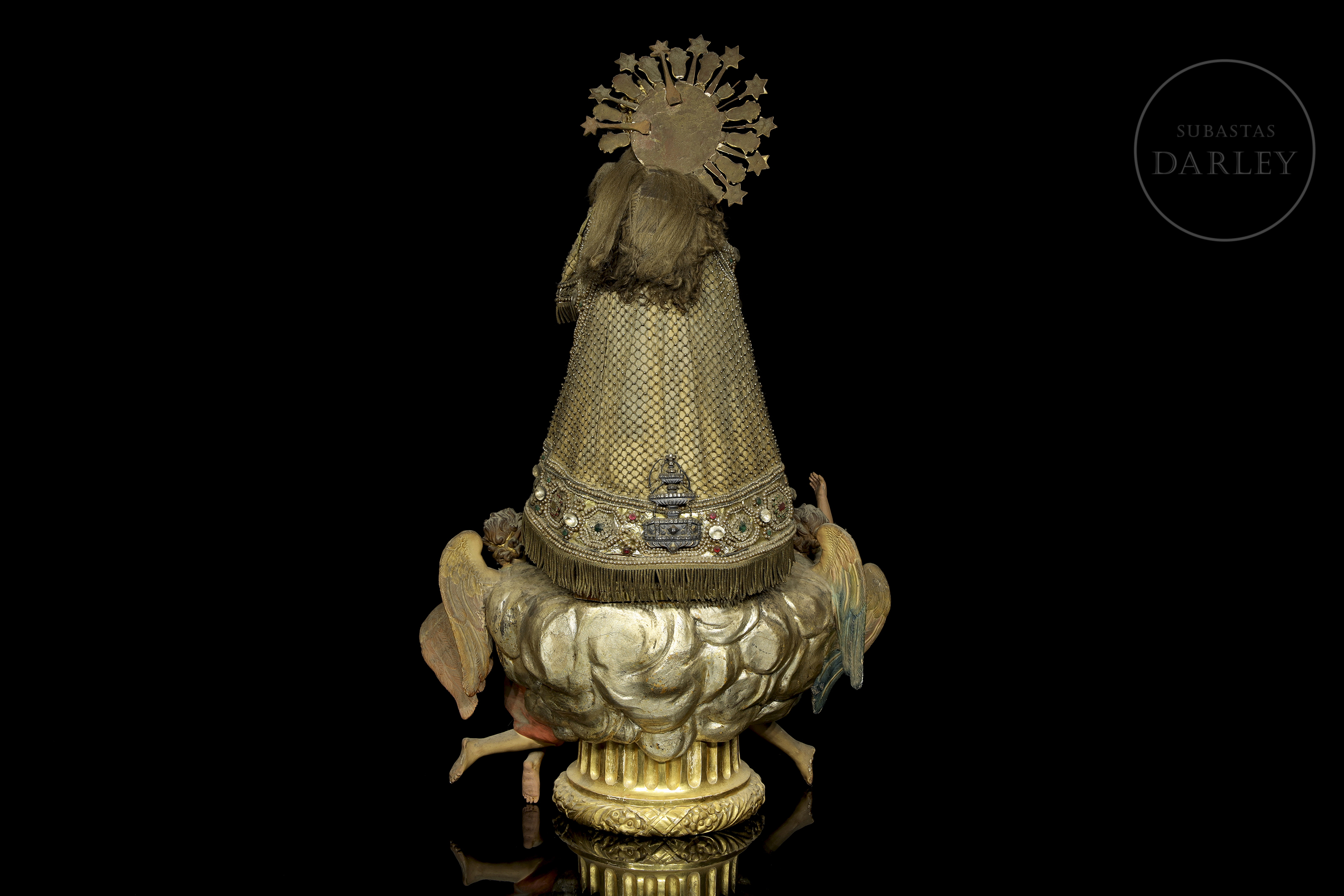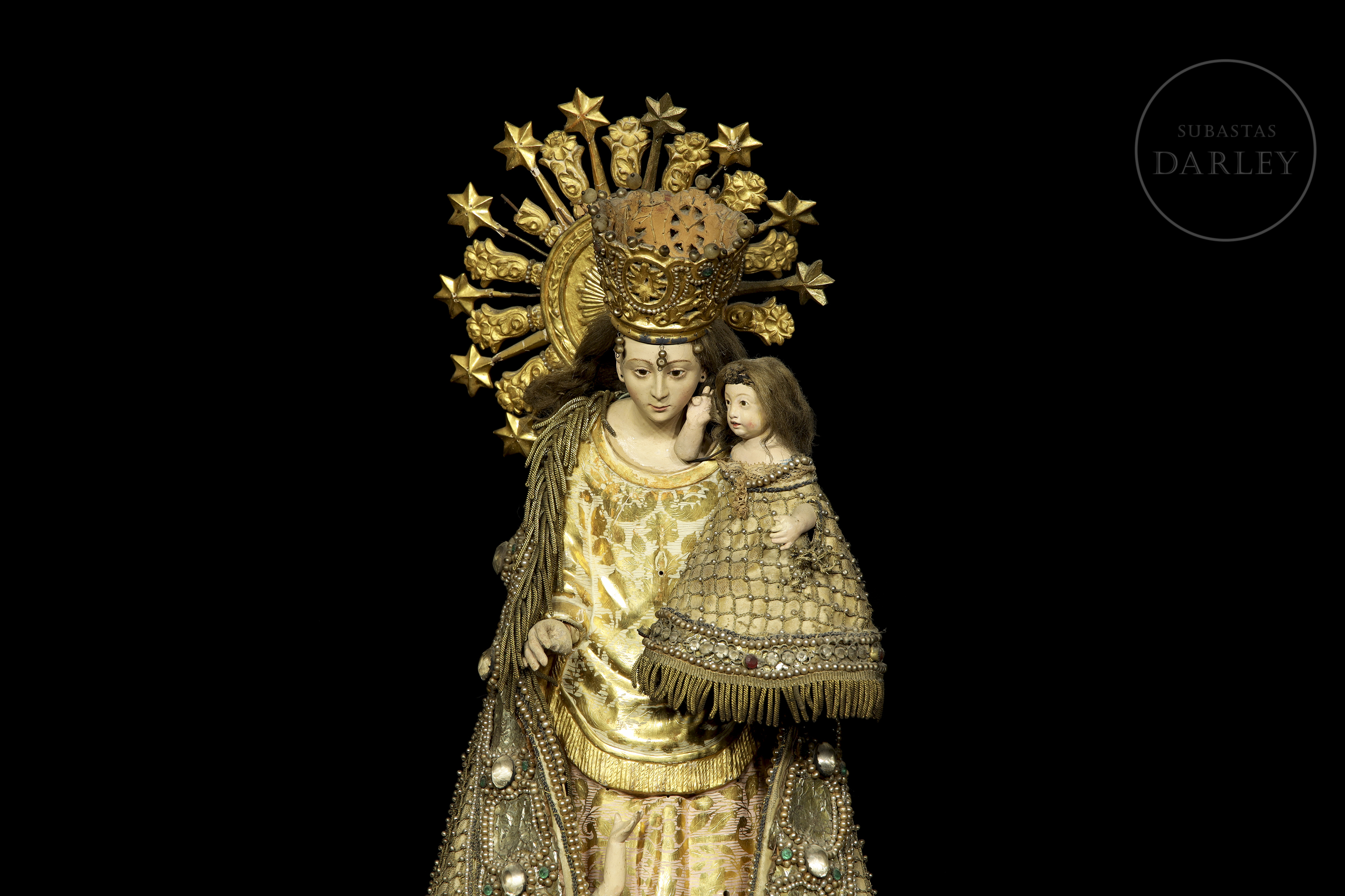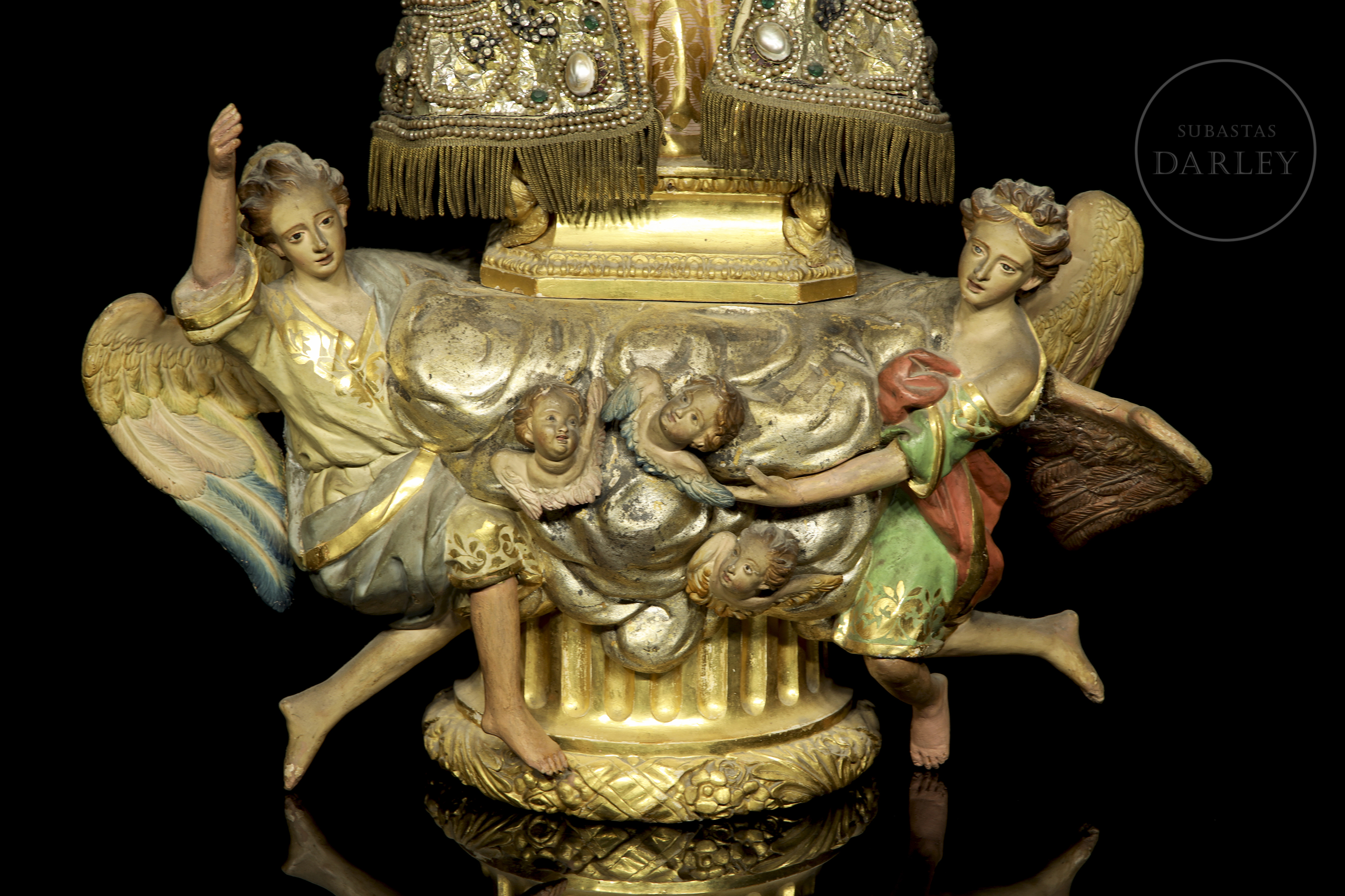 Devotional figure made of polychrome ceramic, with textile appliqués embroidered in gold and gemstones, and gilded metal elements. The Virgin, crowned and haloed by starry rays, carries the Baby Jesus on her right arm. She stands on a cloud supported by angels and cherubs, in a clear reference to traditional Valencian iconography. The meticulousness of the upholstery, the folds of the mantle, and the use of mixed materials are noteworthy, lending great visual and spiritual richness to the composition.